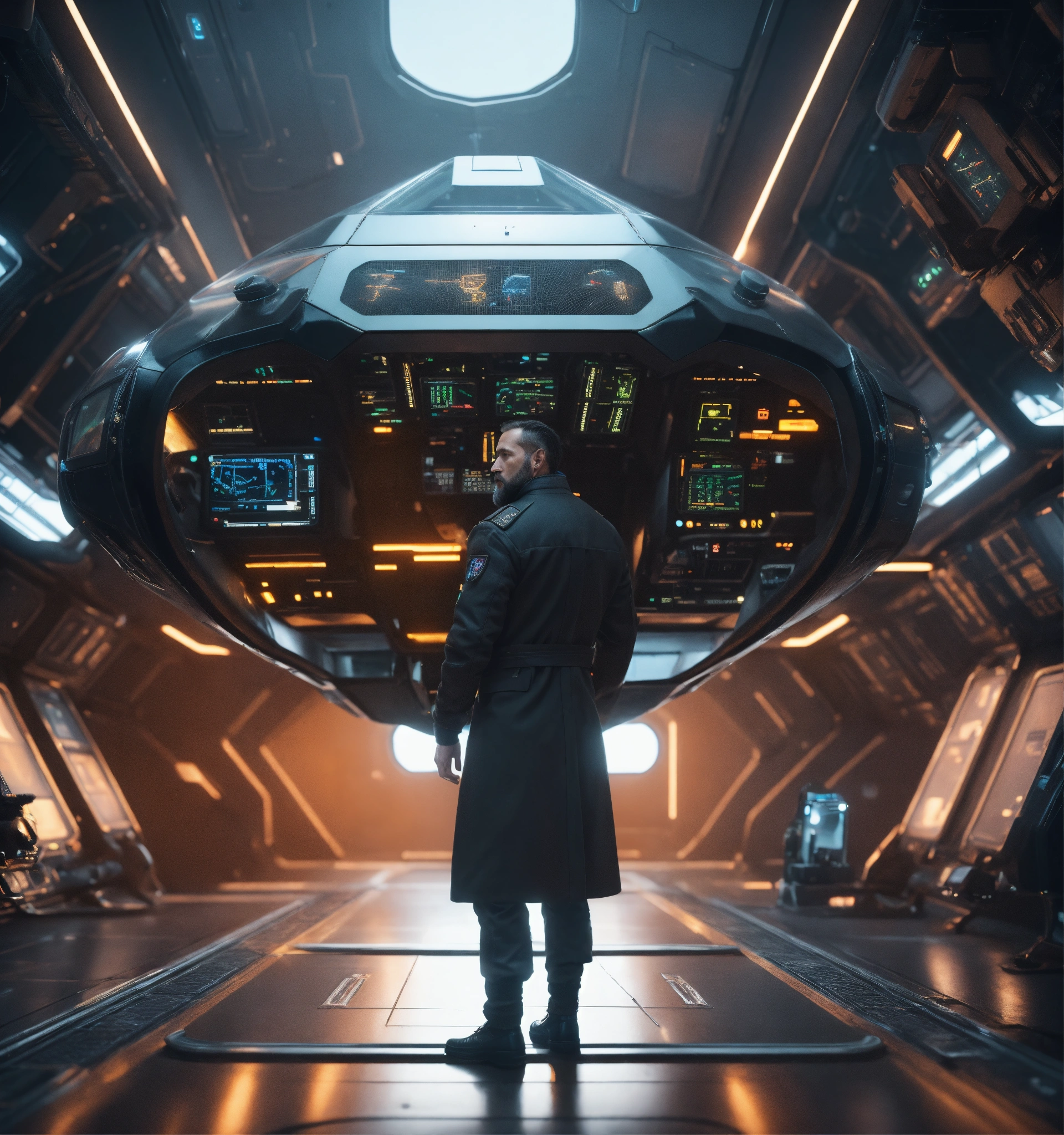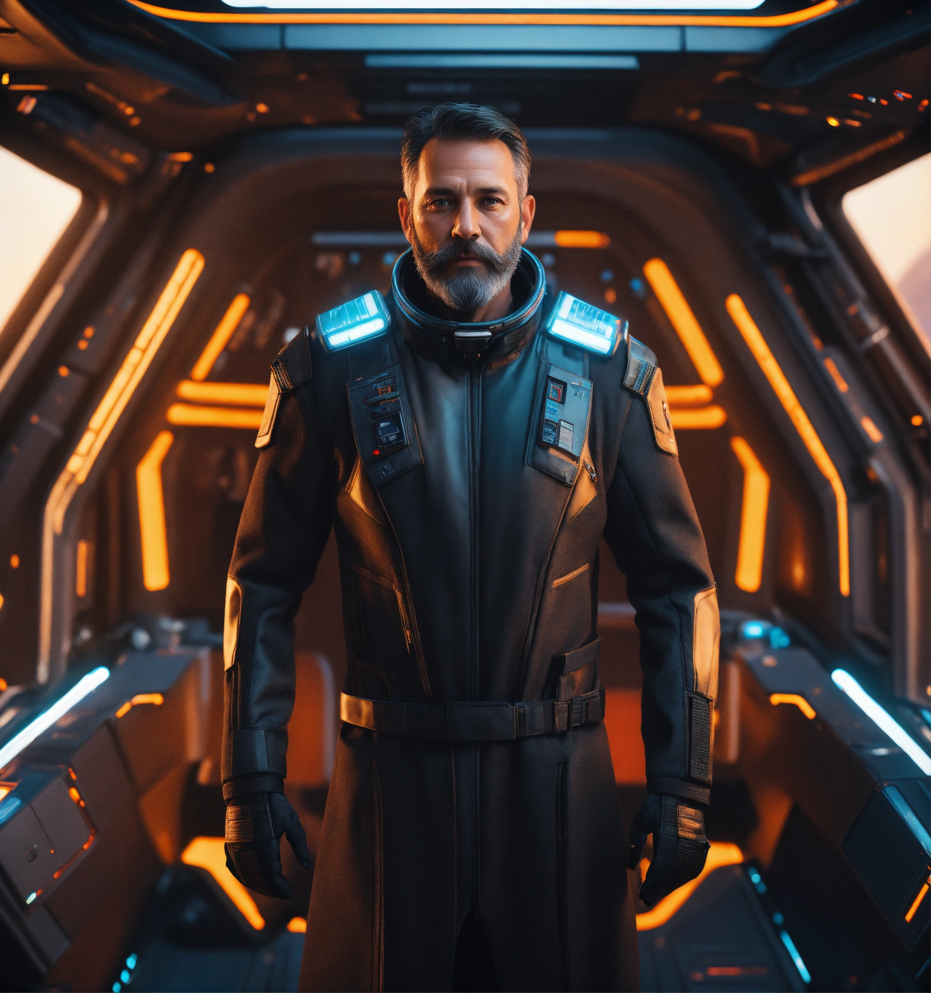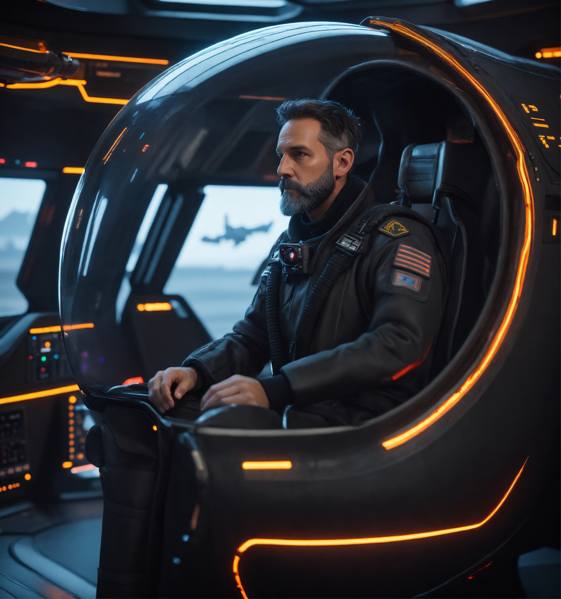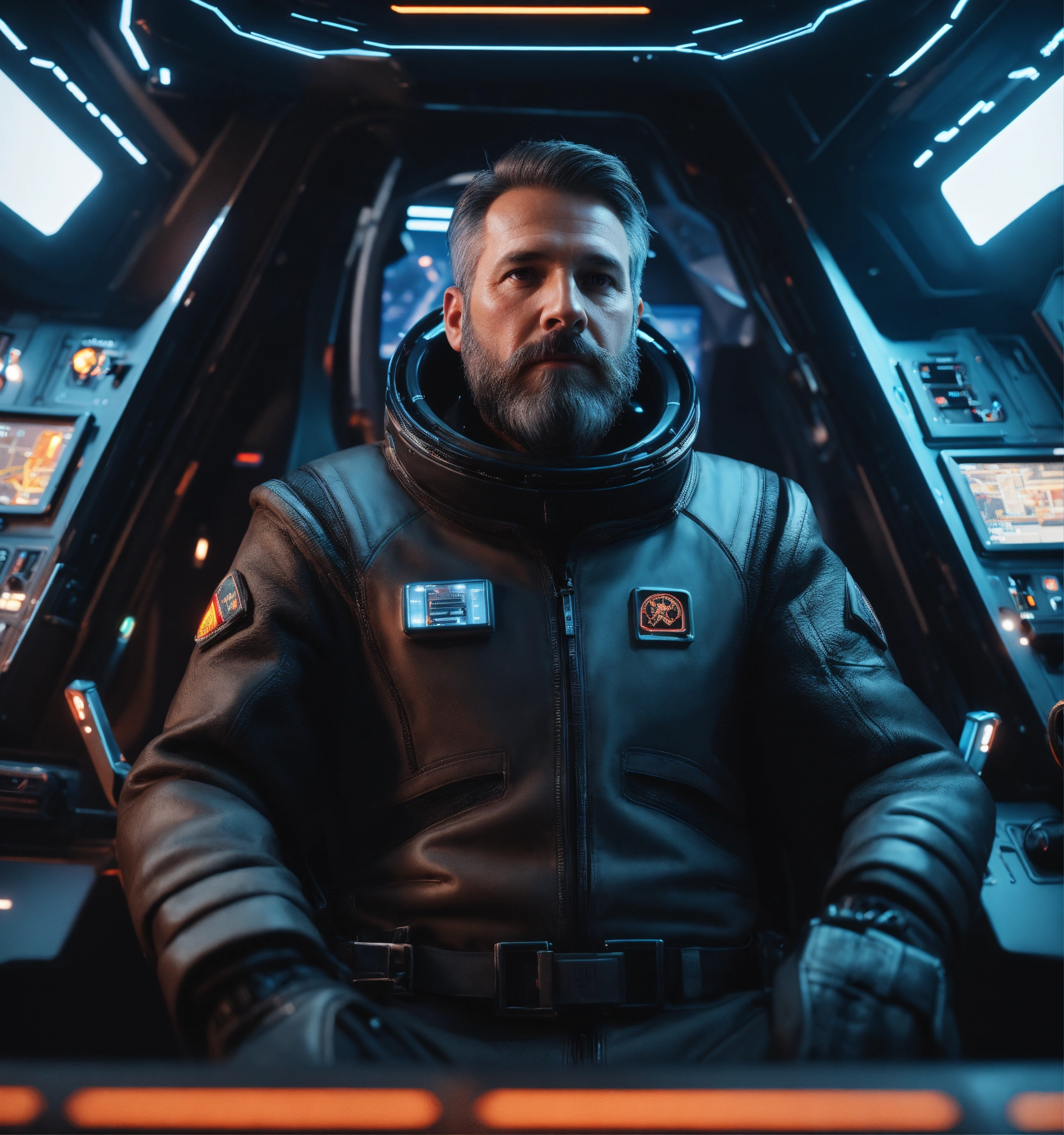 A 45 year old masculine man with trim beard in futuristic long black coat pilots a small emergency escape pod in the cockpit, realistic, futuristic, sci-fi, 8k, unreal engine, pixar