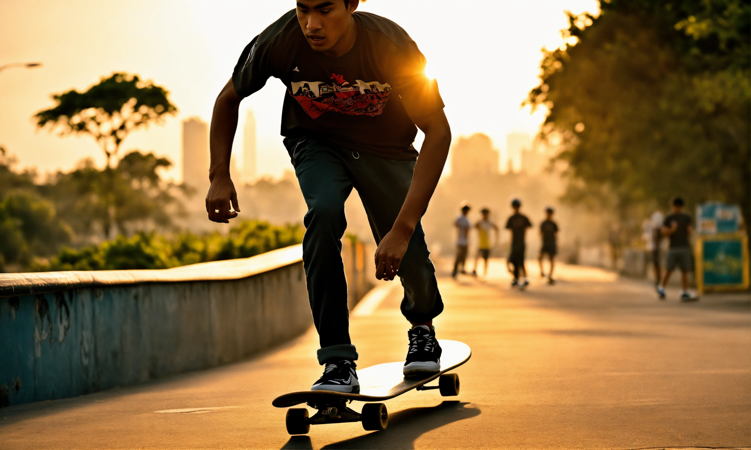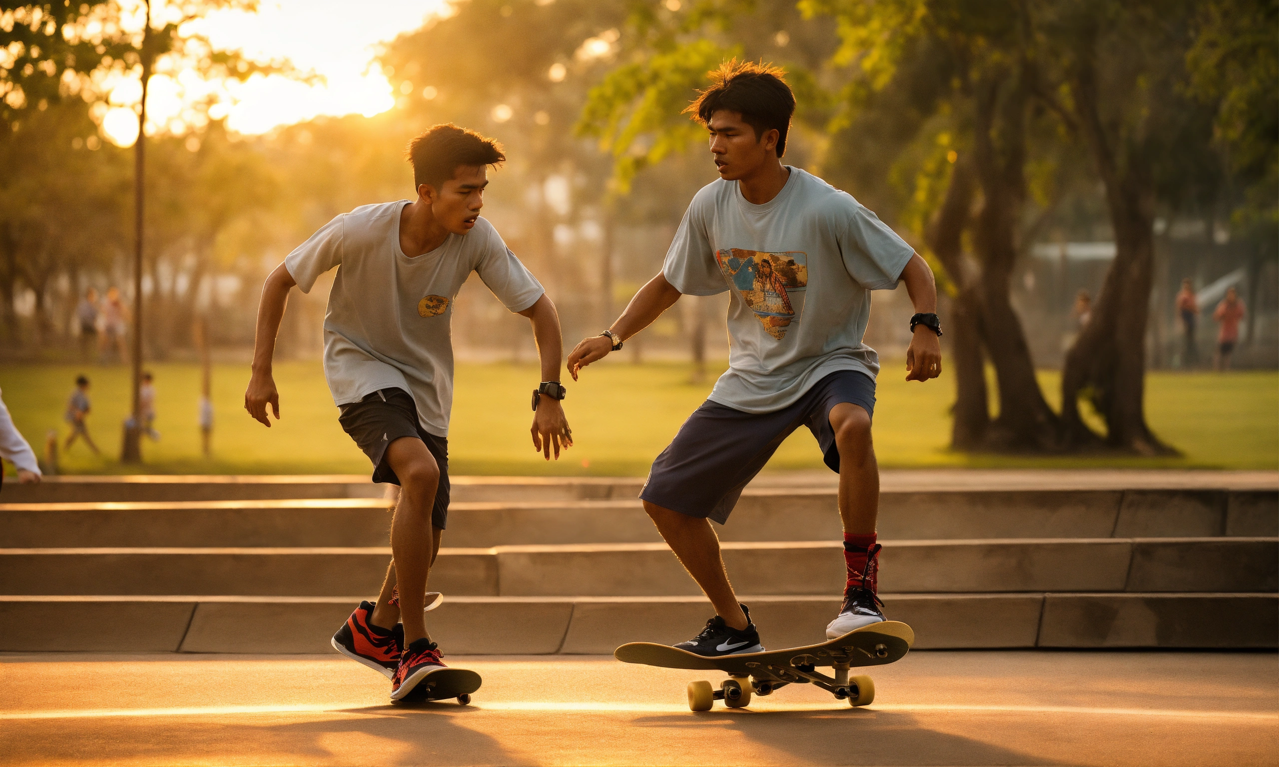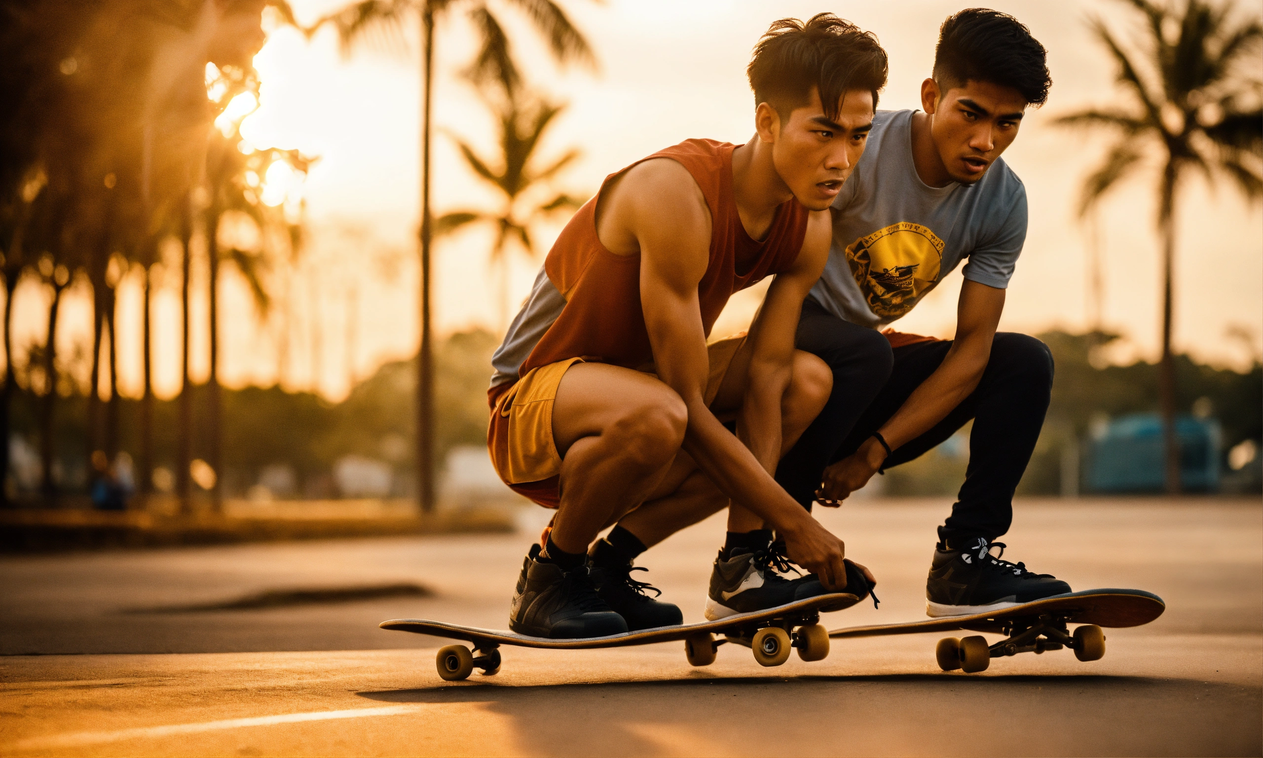 Afternoon sun, ultra-realistic photo, cinematic quality, close-up action shot, east coast park as the backdrop, main focus on two skateboarders, a malay skateboarder helping an indian to master a trick. both are intensely focused, their eyes locked in determination, sweat on their brows, muscles tensed, exuding raw passion and unyielding perseverance; clothing contemporary skateboarding attire with protective gear, a mix of t-shirts, shorts, and sneakers, expressions grit, intensity, a fierce show of camaraderie and never-give-up attitude, the mentor's hand gripping the arm of the novice themes modern nostalgia, overcoming adversity, brotherhood, dynamic lighting emphasizing the contours of their faces, deep shadows and highlighted features, captured in the heat of the moment, 50mm camera lens for sharpness and bokeh background, portra 400 film for capturing the warmth of the setting sun and rich contrasts, slight film grain to accentuate the raw energy and emotion of the scene.