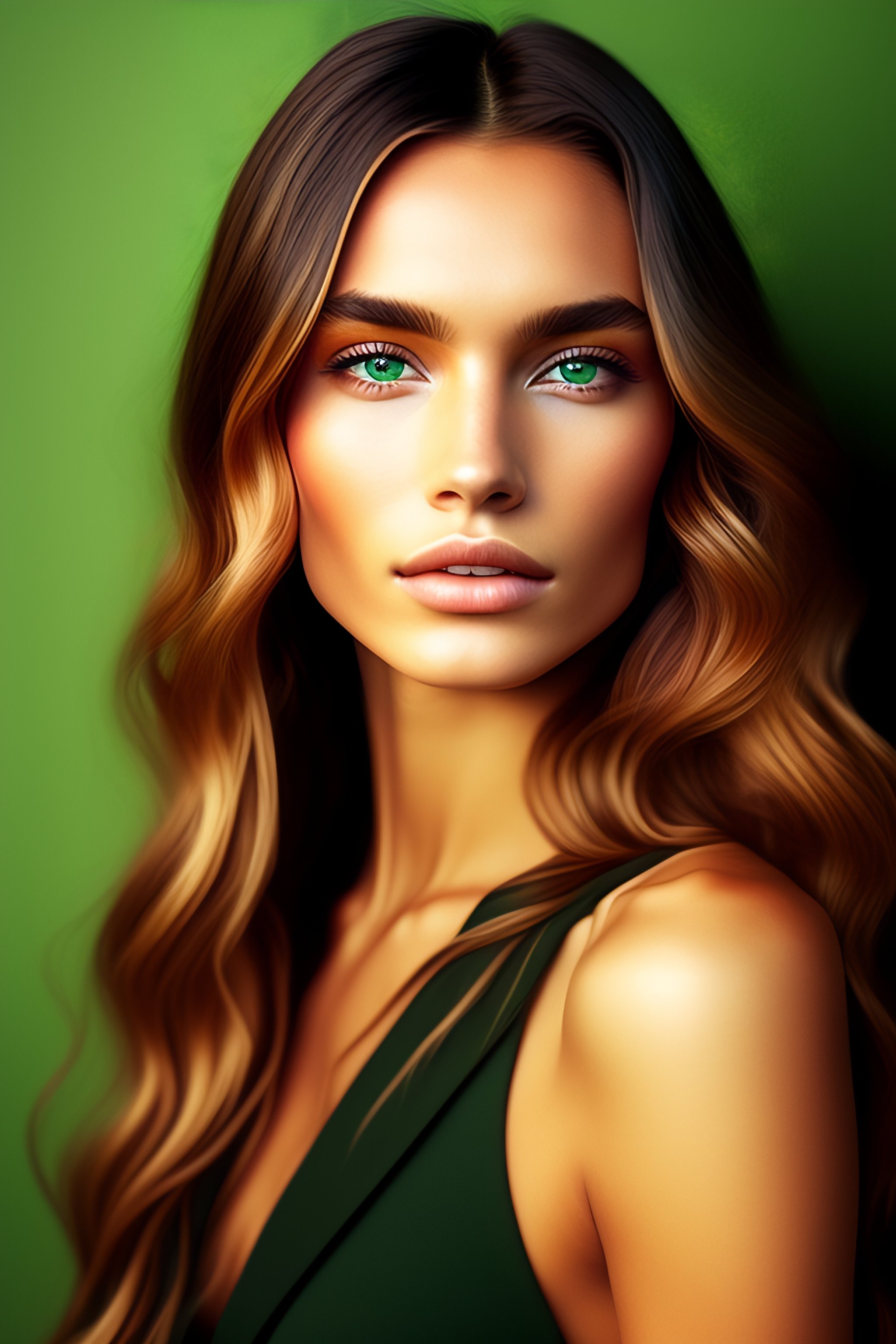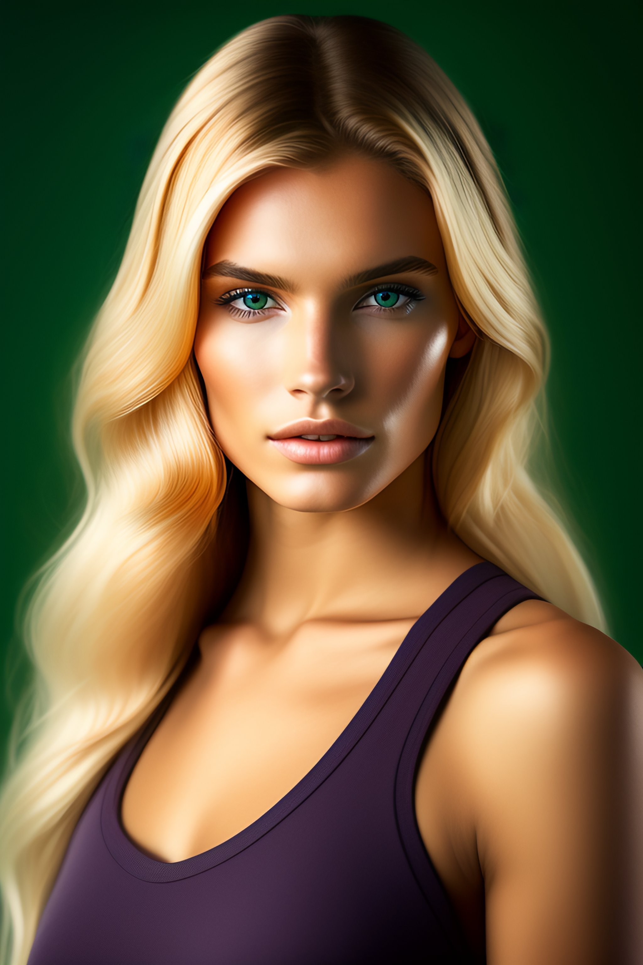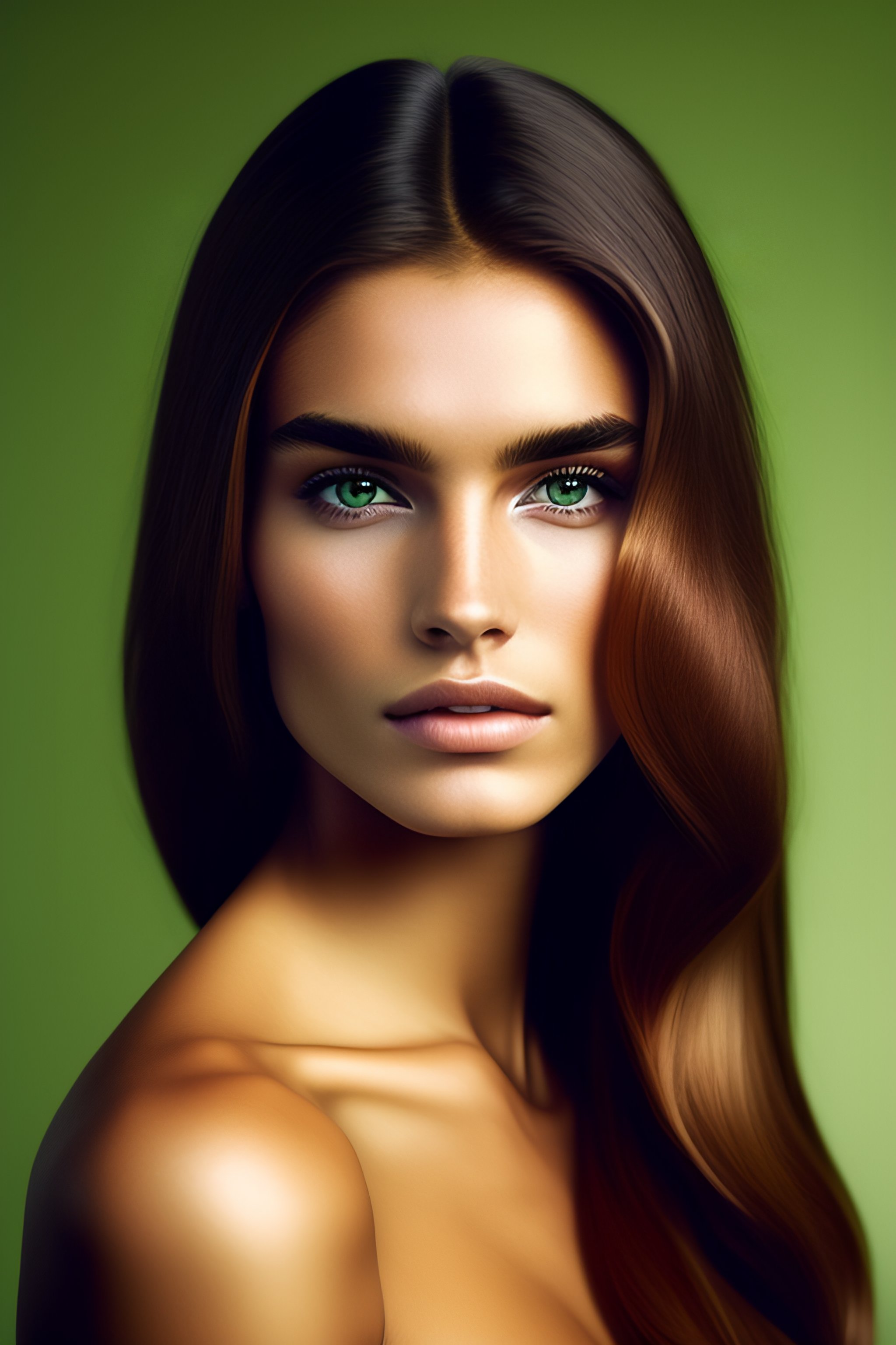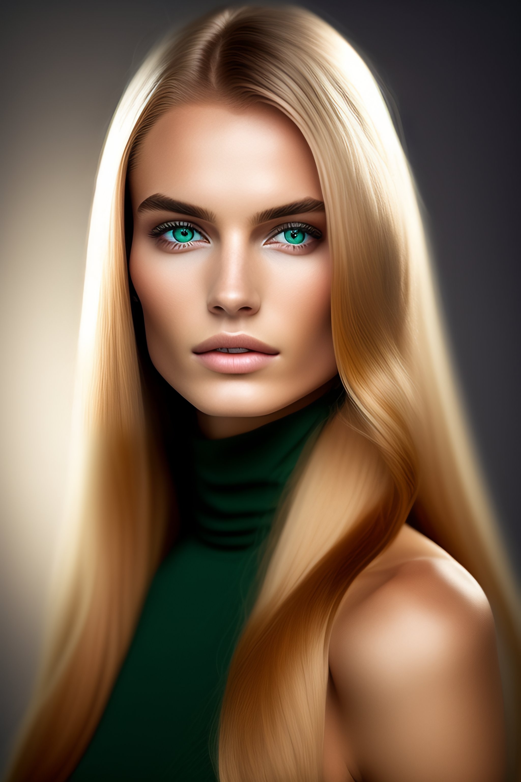 Brunette with long dyed blonde hair, 21 years old, 165 cm tall, 50% smaller nose, 30% smaller mouth, round shaped face, big forehead, lop eared, thin eyebrows, emerald eyes, darker skin, real life photograph