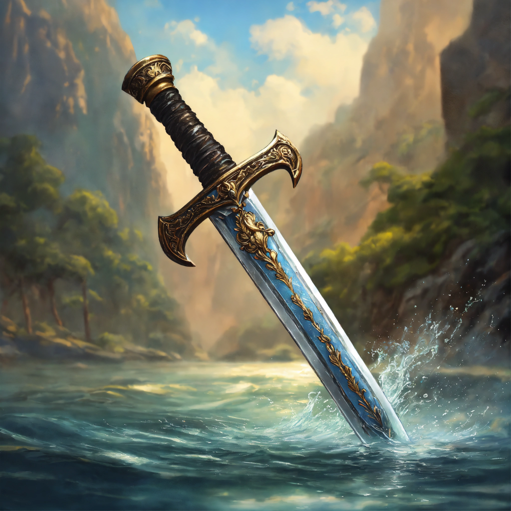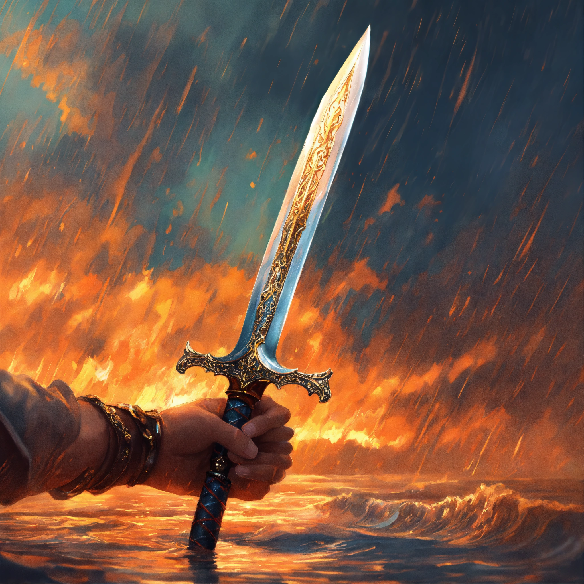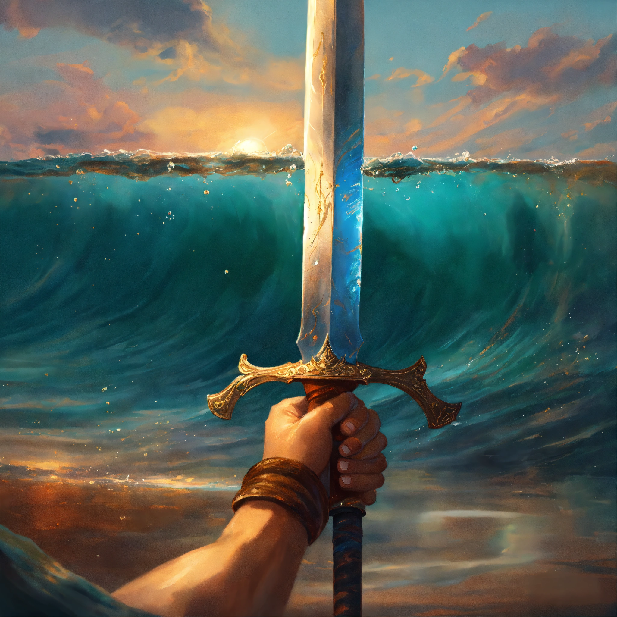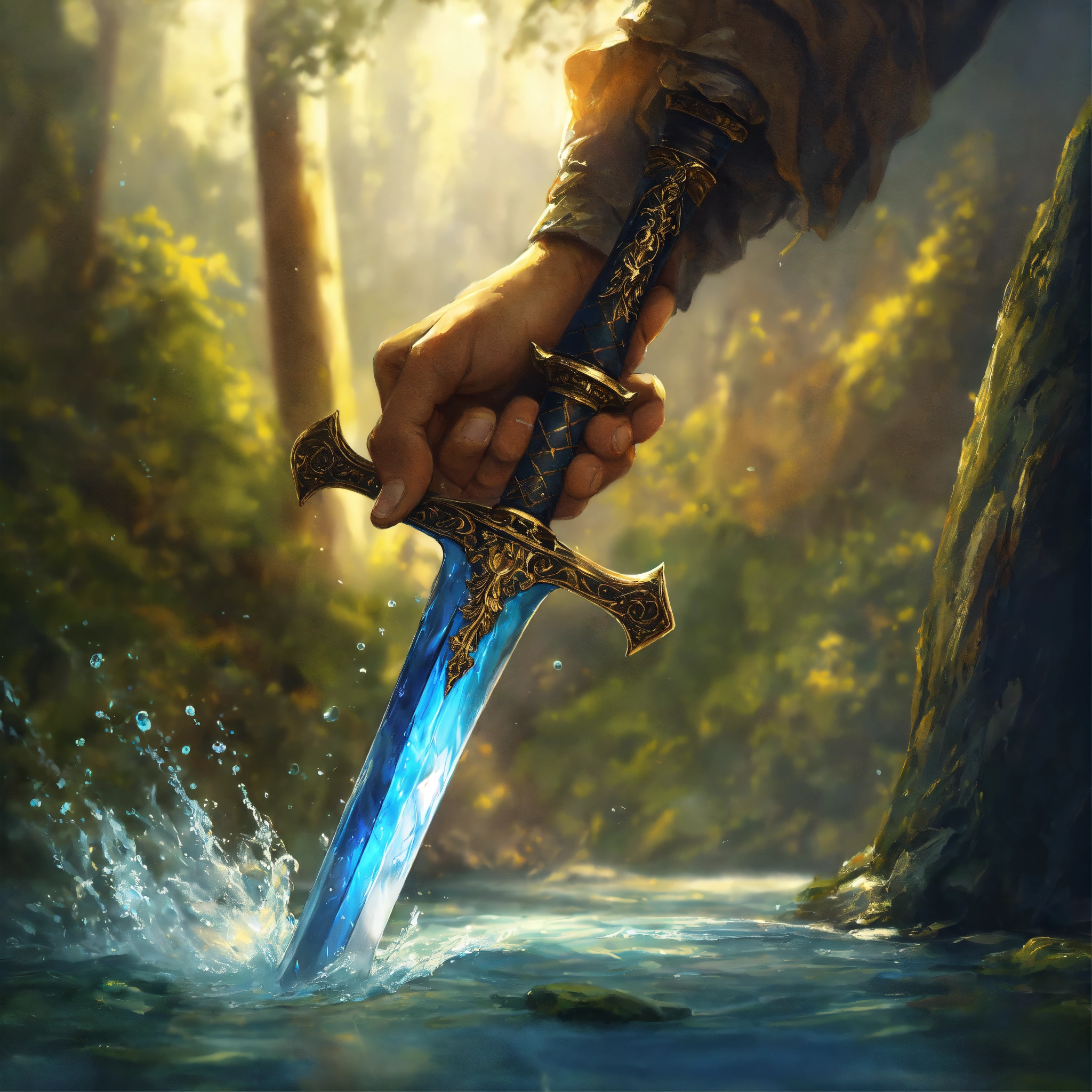 Concept art of a hand holding a sword which blade is made out of water, highly detailed, oil painting style, brush strokes, 8k
