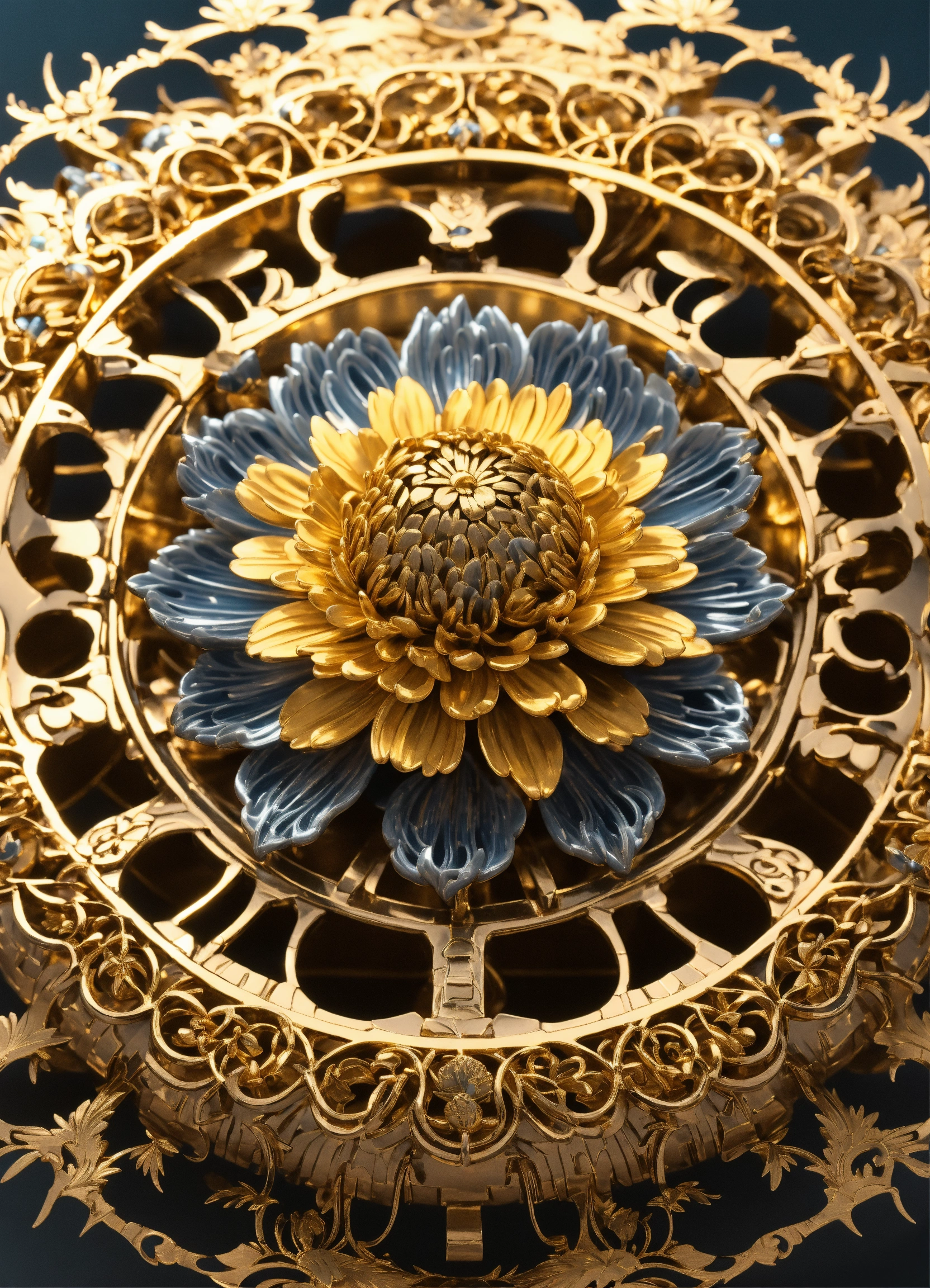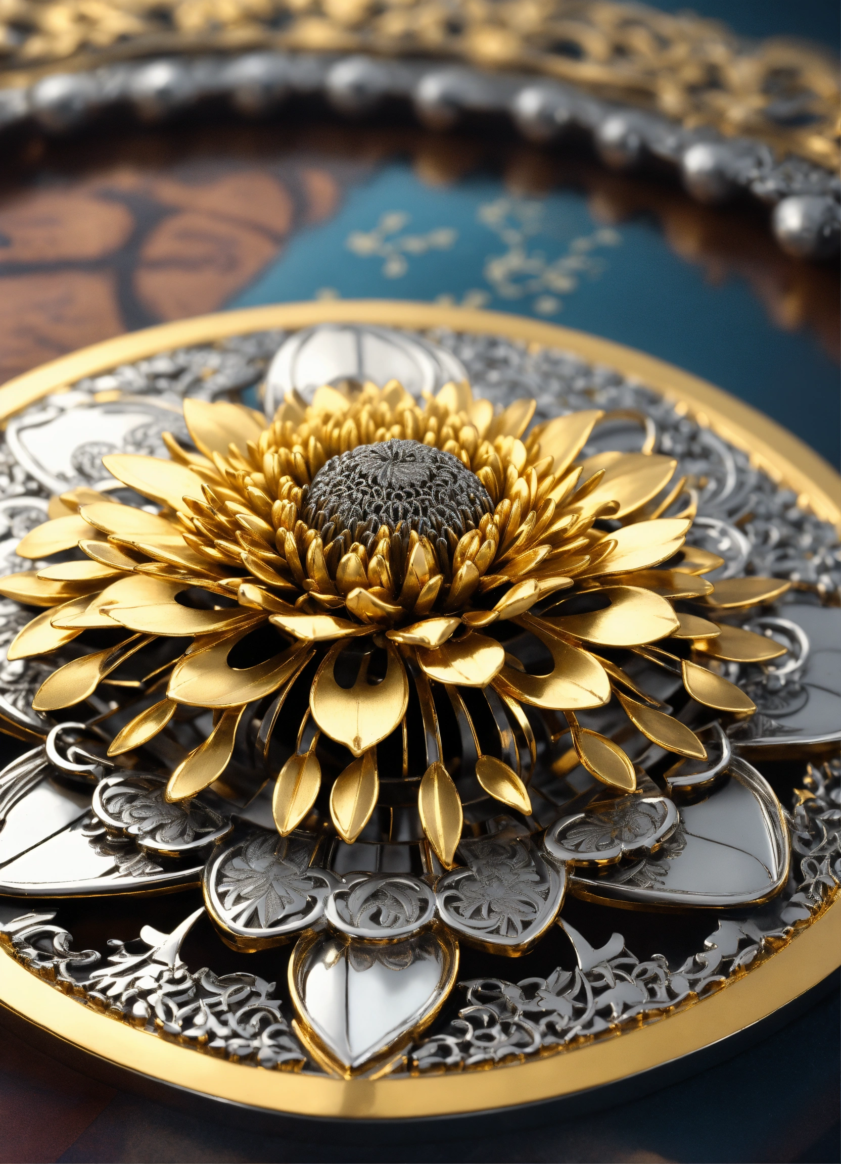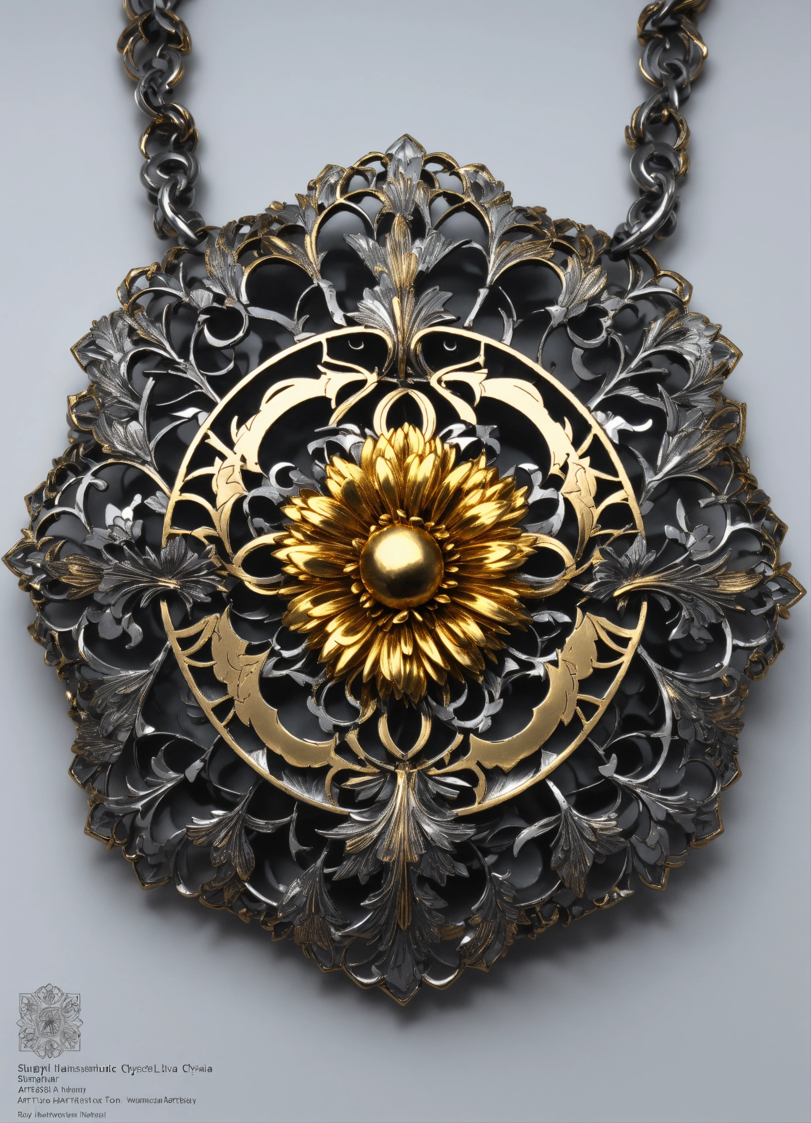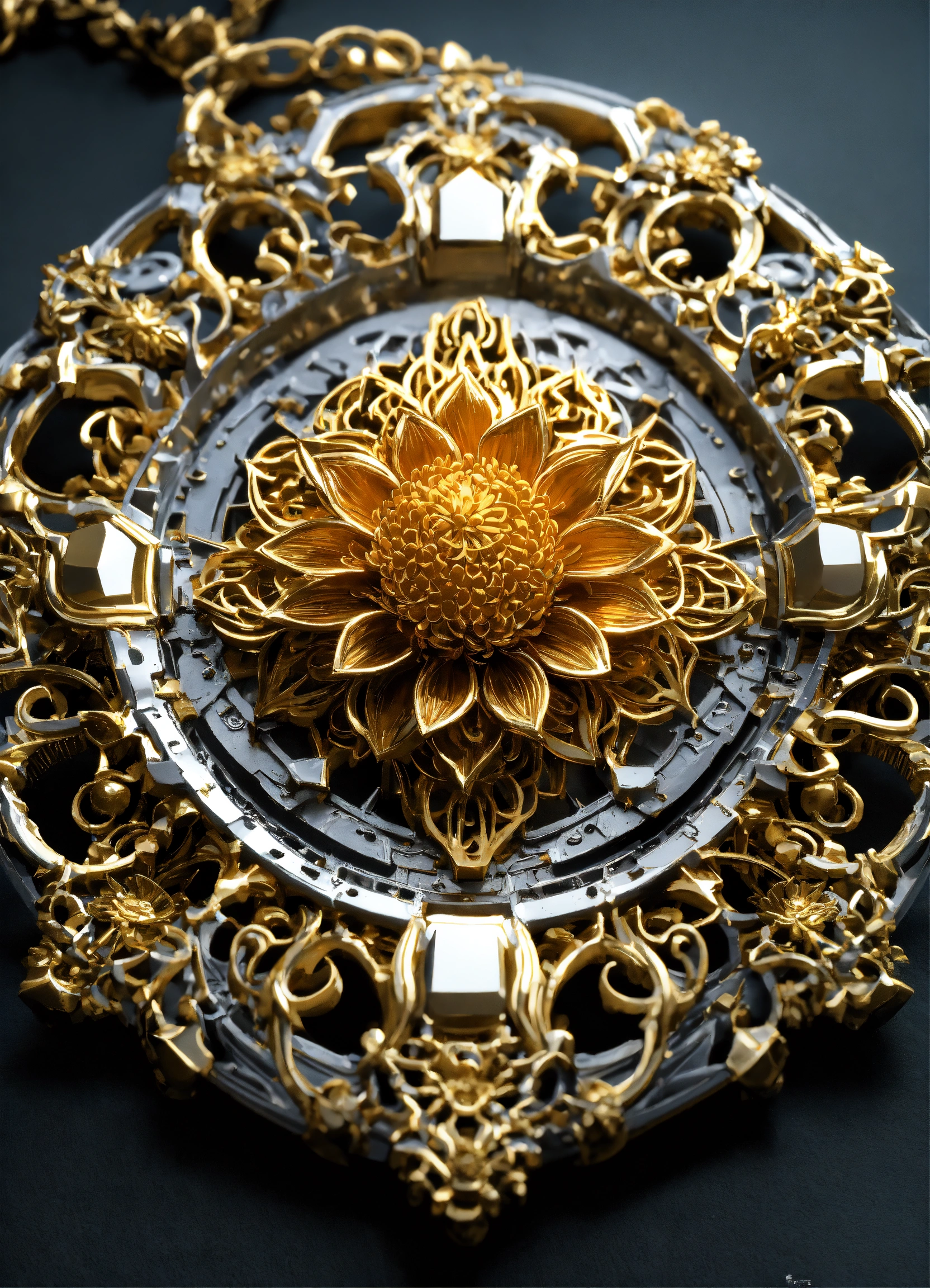 Cybernetic chrysanthemum necklace, ford hallam style, shibuichi, tsuba, iron, silver, silver material, artstation, concept art, sharp focus, intricate lines and hard edges, symmetry, hyper detailed, intricate, ornate, elegant, dramatic lighting, hypermaximalist, golden ratio, micro details, 3d sculpture, ray tracing