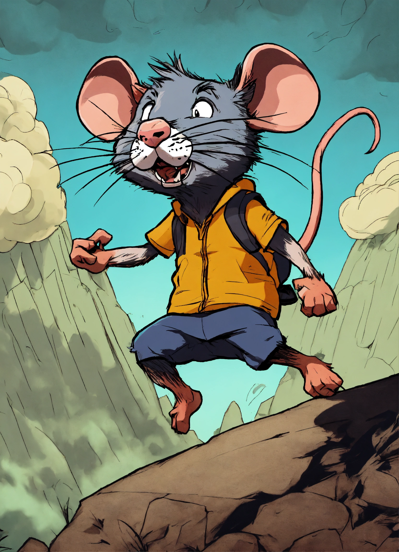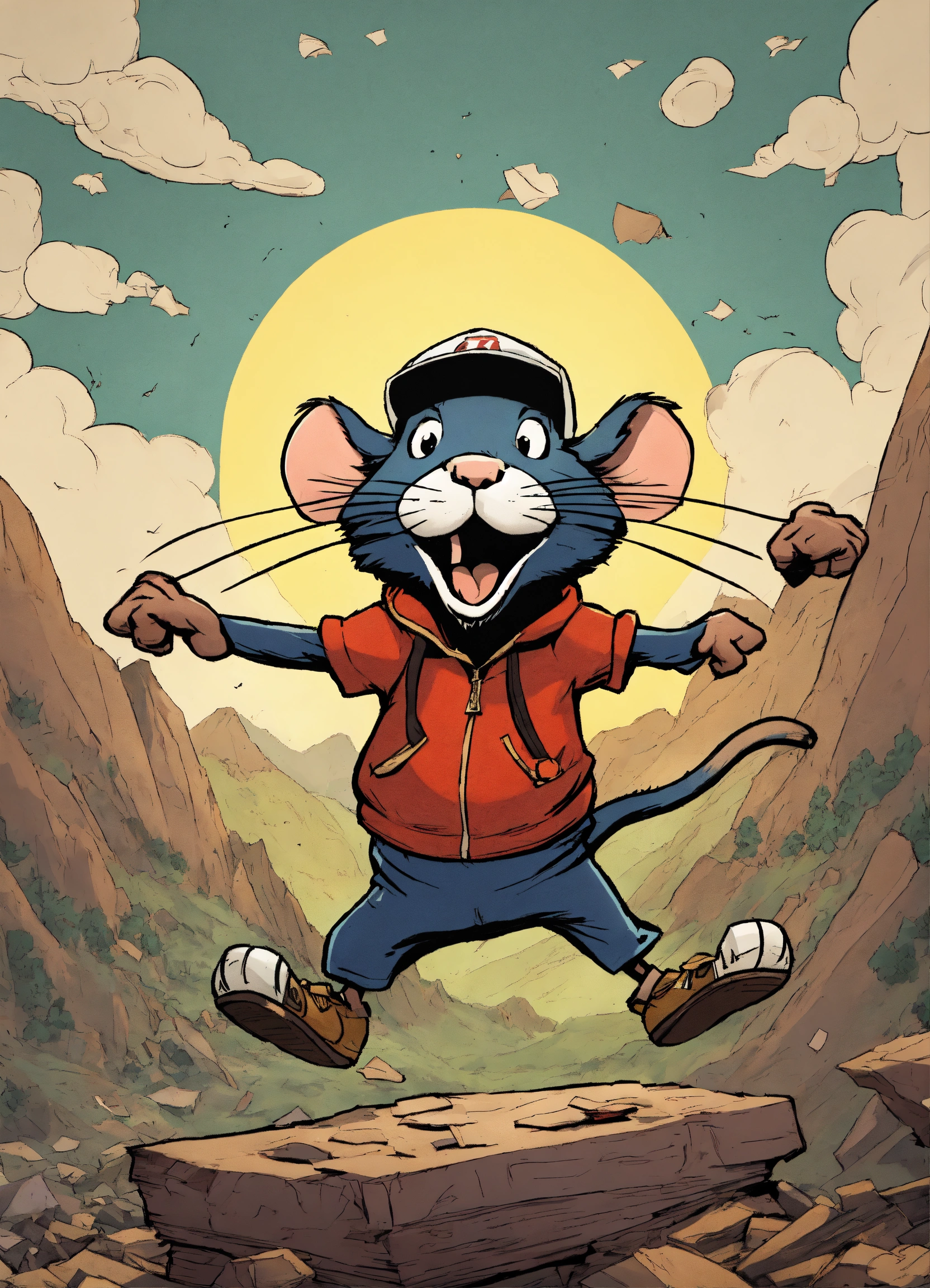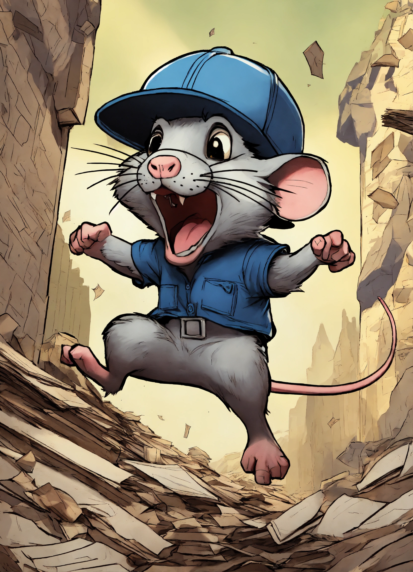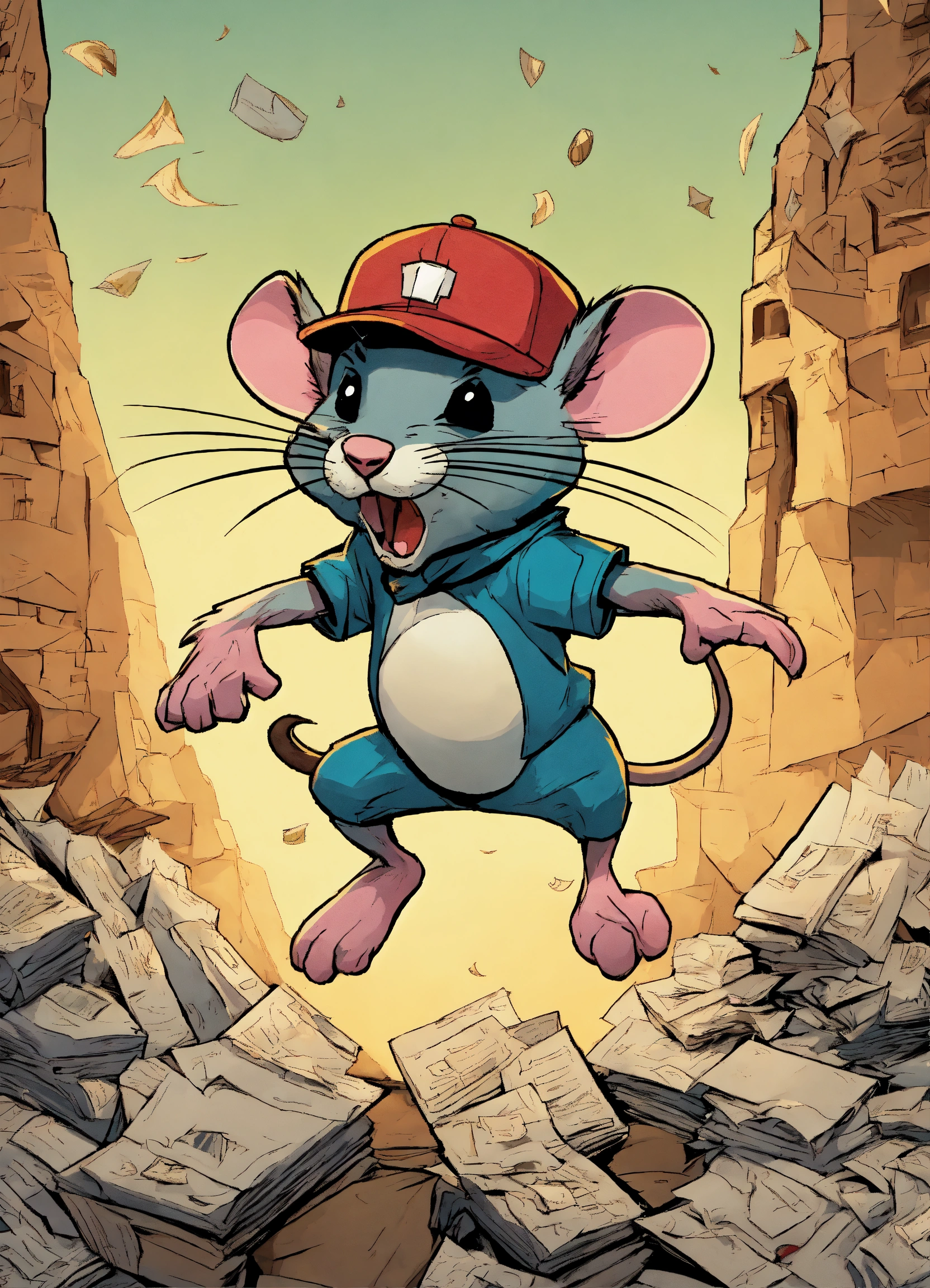 The angry rat jumps with both feet on his cap, exasperate, 8k, comics, a mountain of paper background