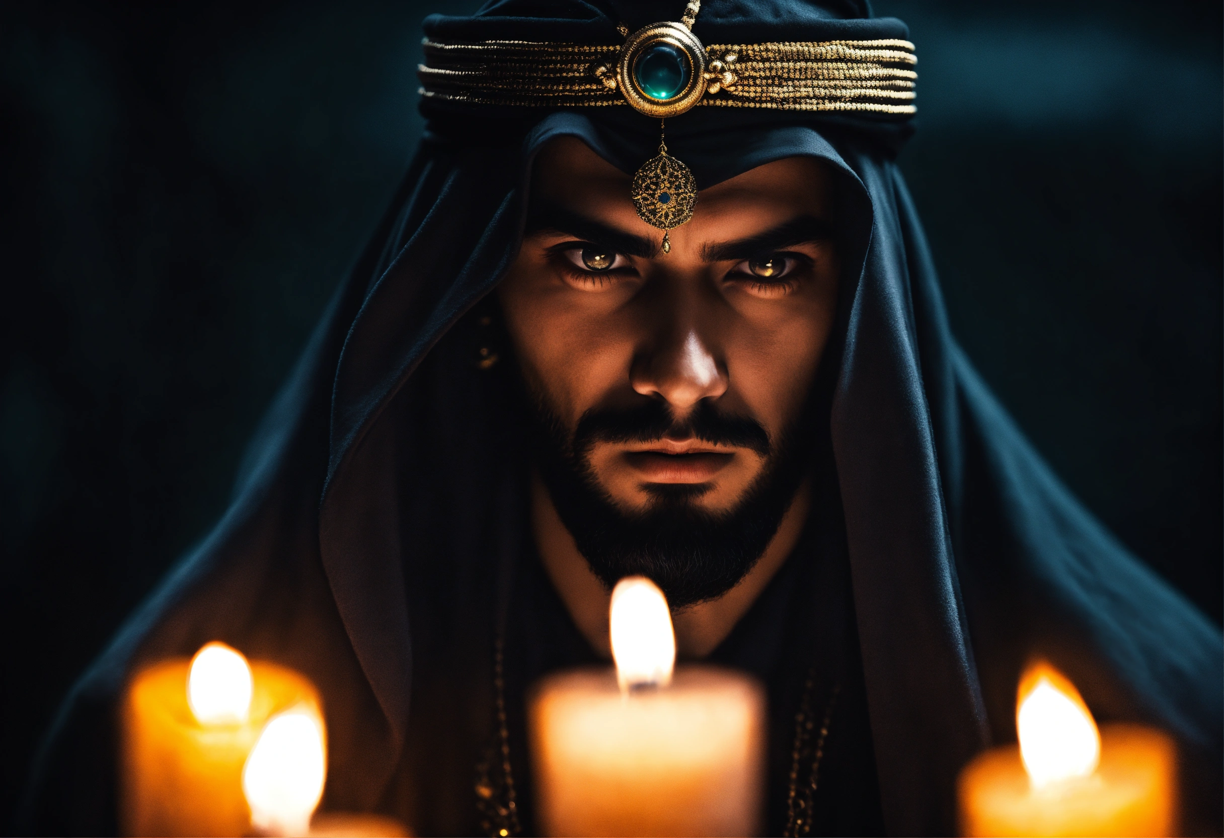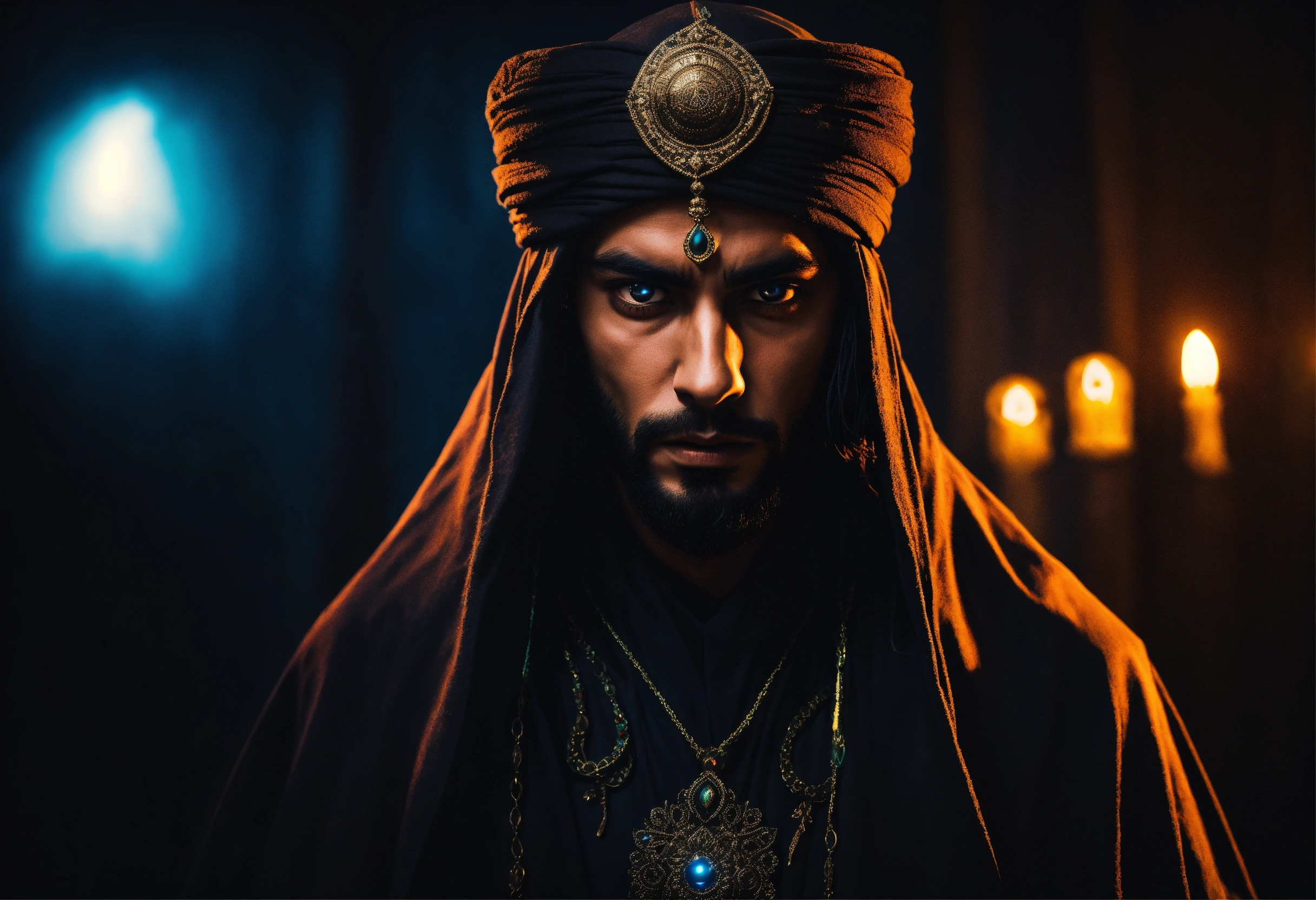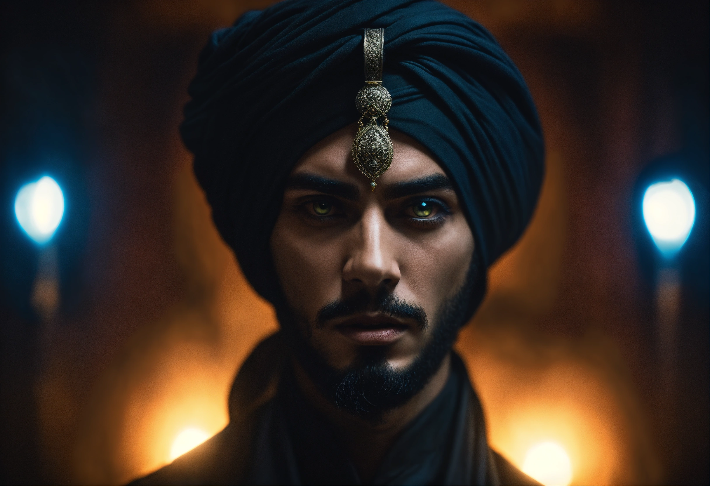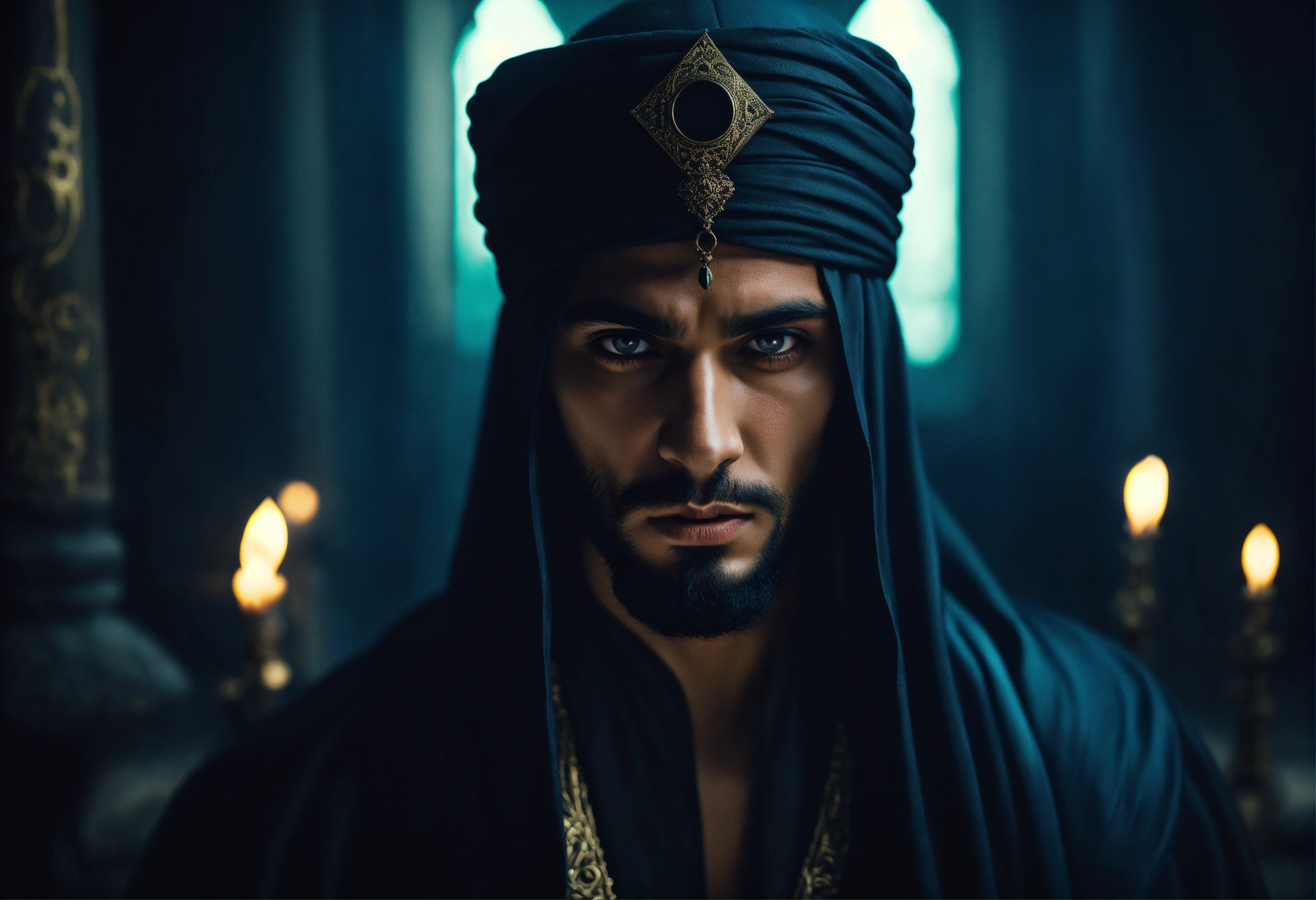 Dark, mysterious and dramatic headshot of a young handsome arabic evil sorcerer with glowing hypnotic eyes, occult powers, sinister aura, dark sinister robes, turban