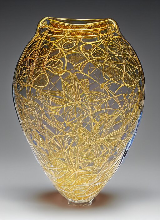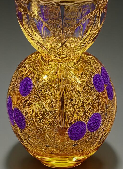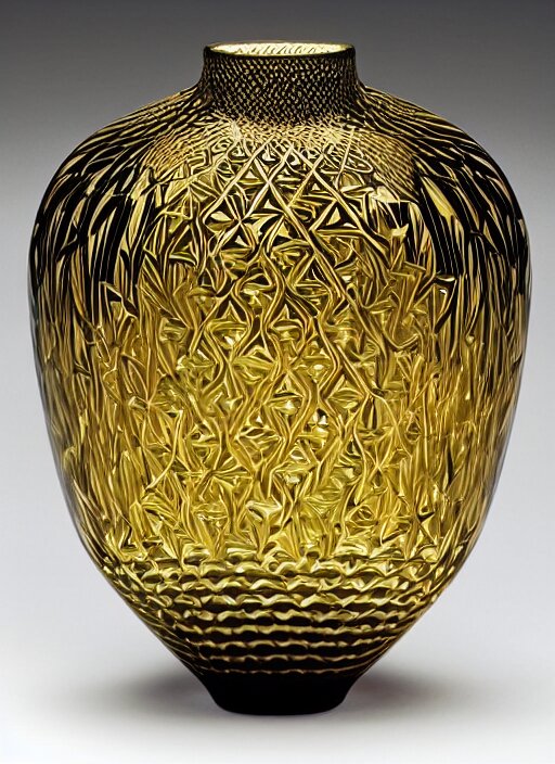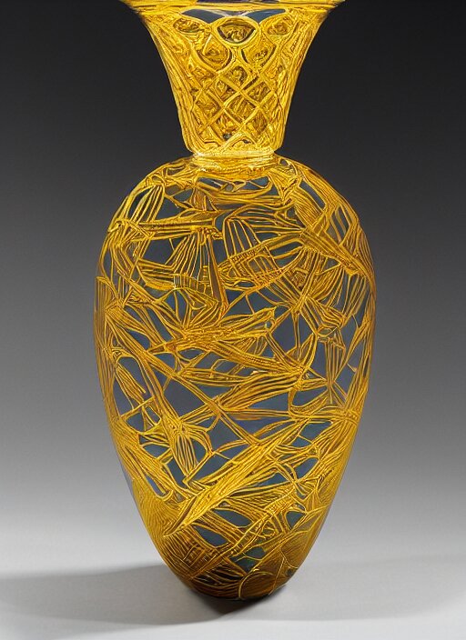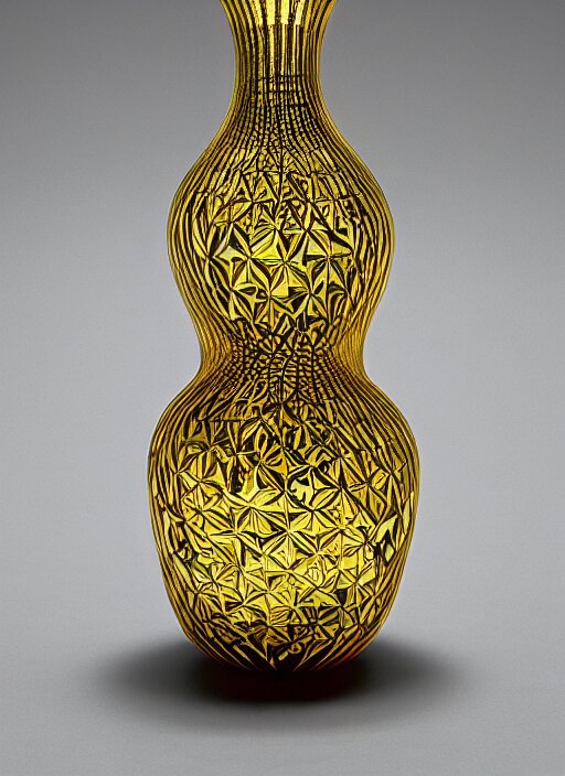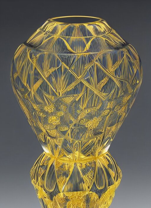 Vase in the shape of impossible geometry by escher, intricate gold threads, containing colorful flowers, designed by rene lalique