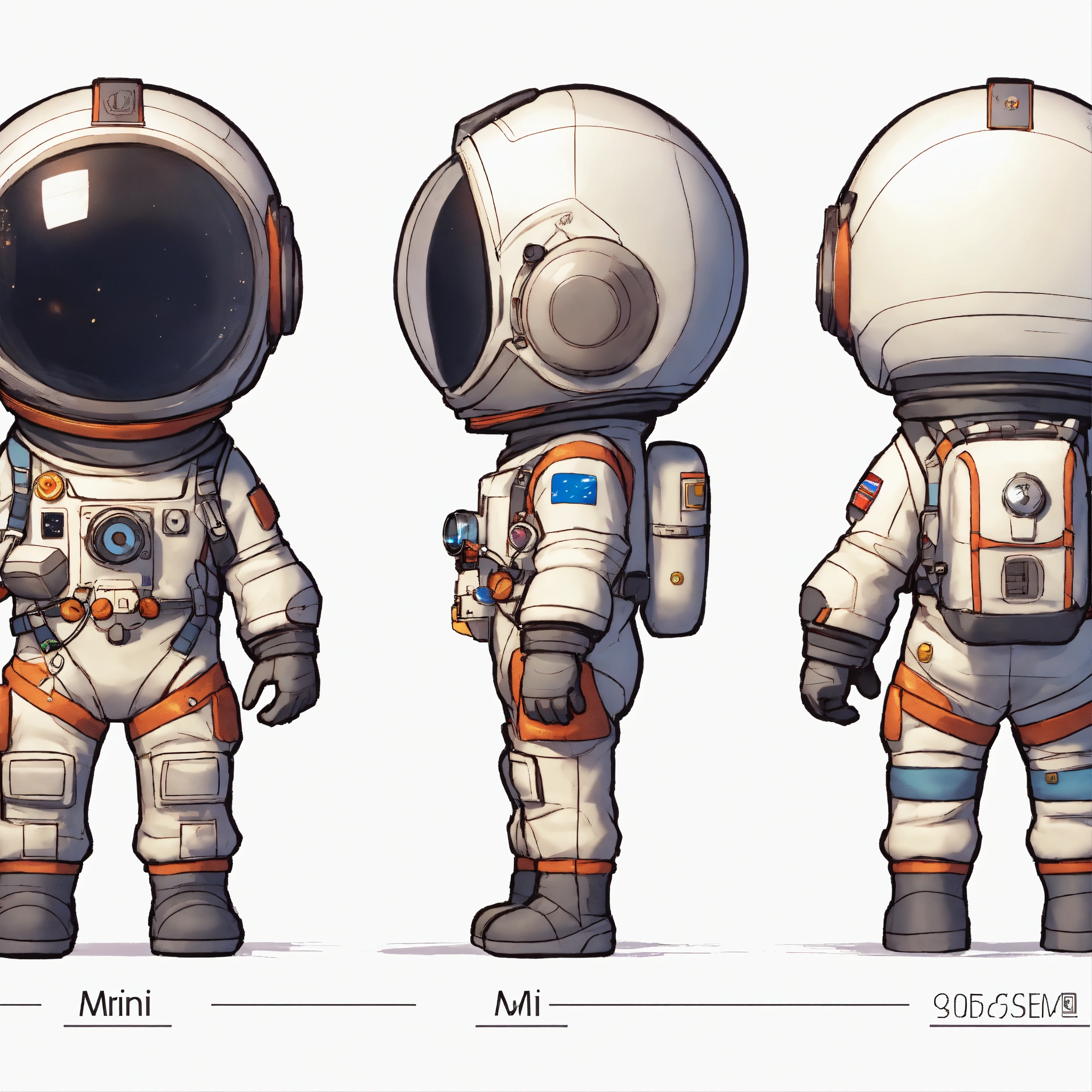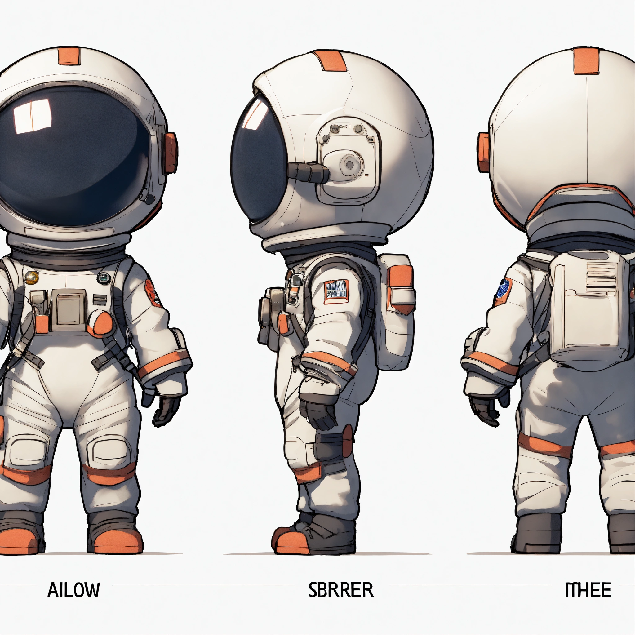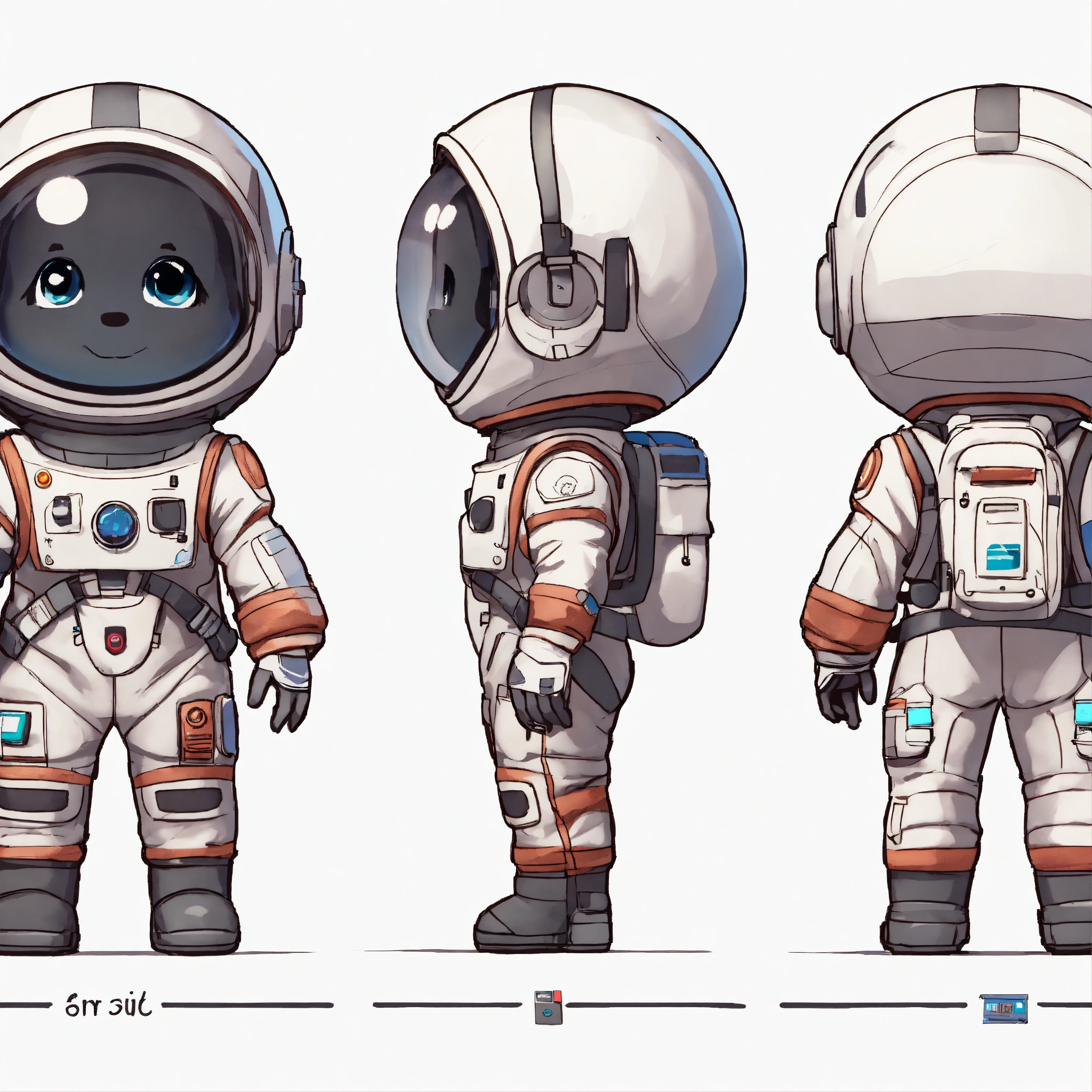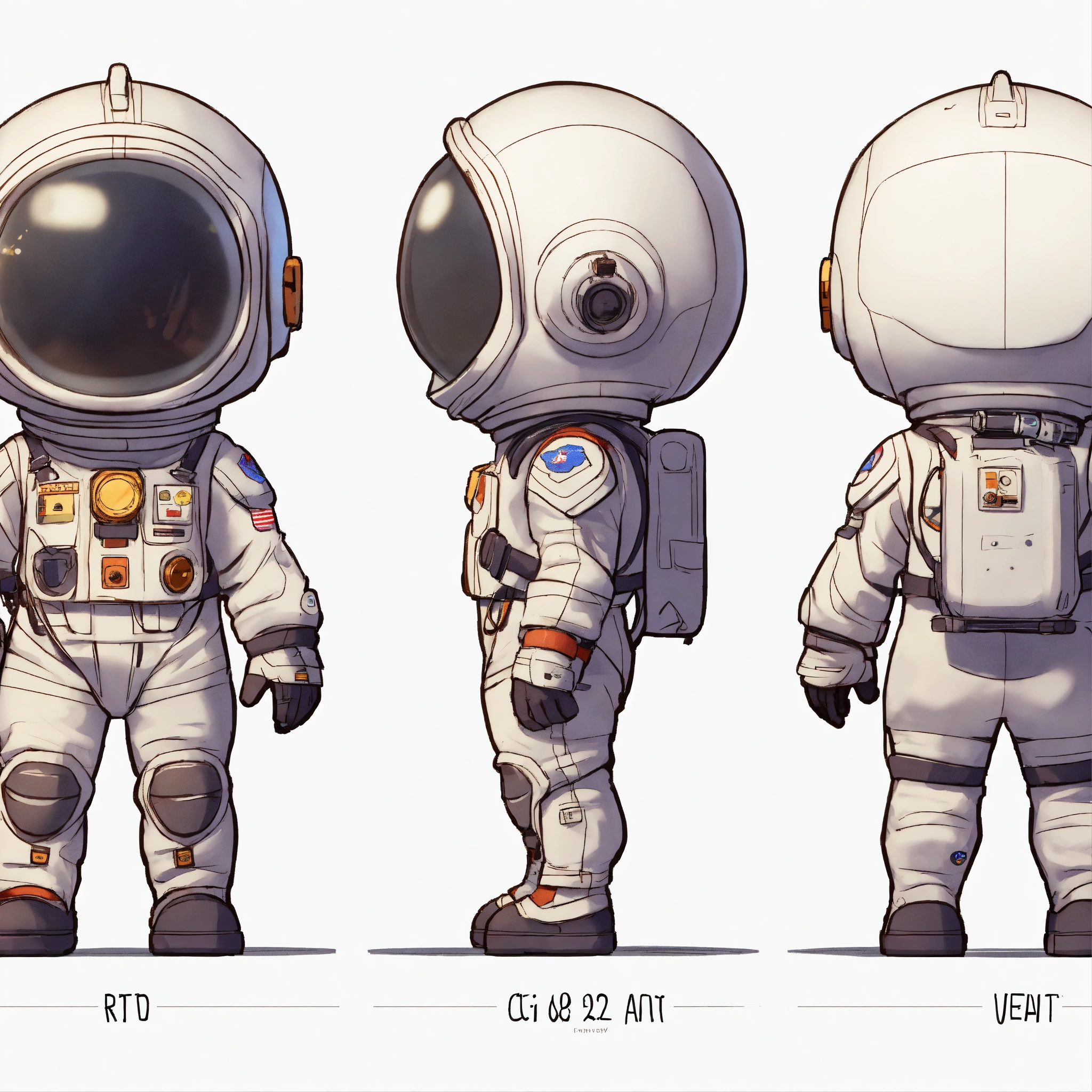 Mini astronaut, cute, 2d, character sheet, full body, reference sheet, character model, front view, side view, back view