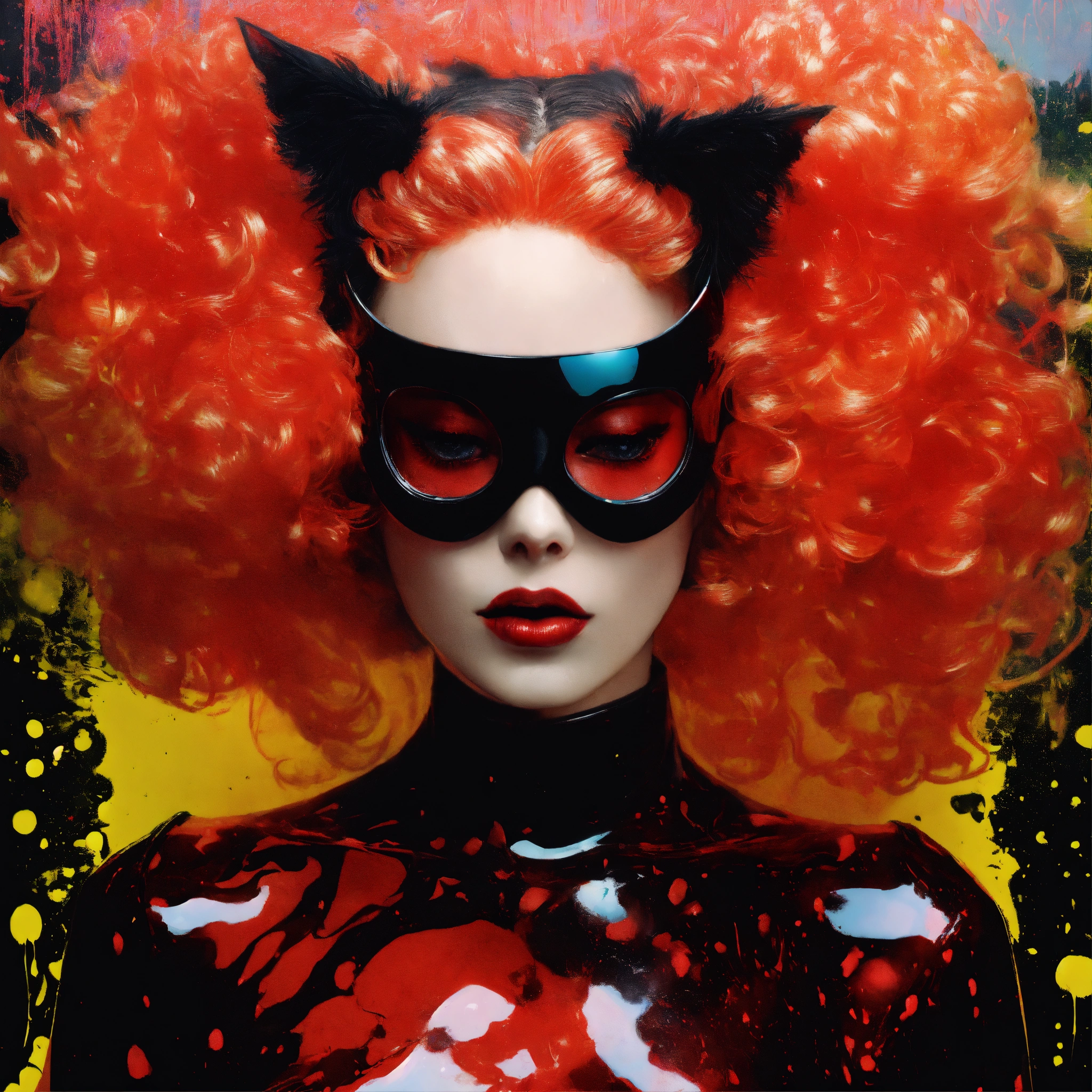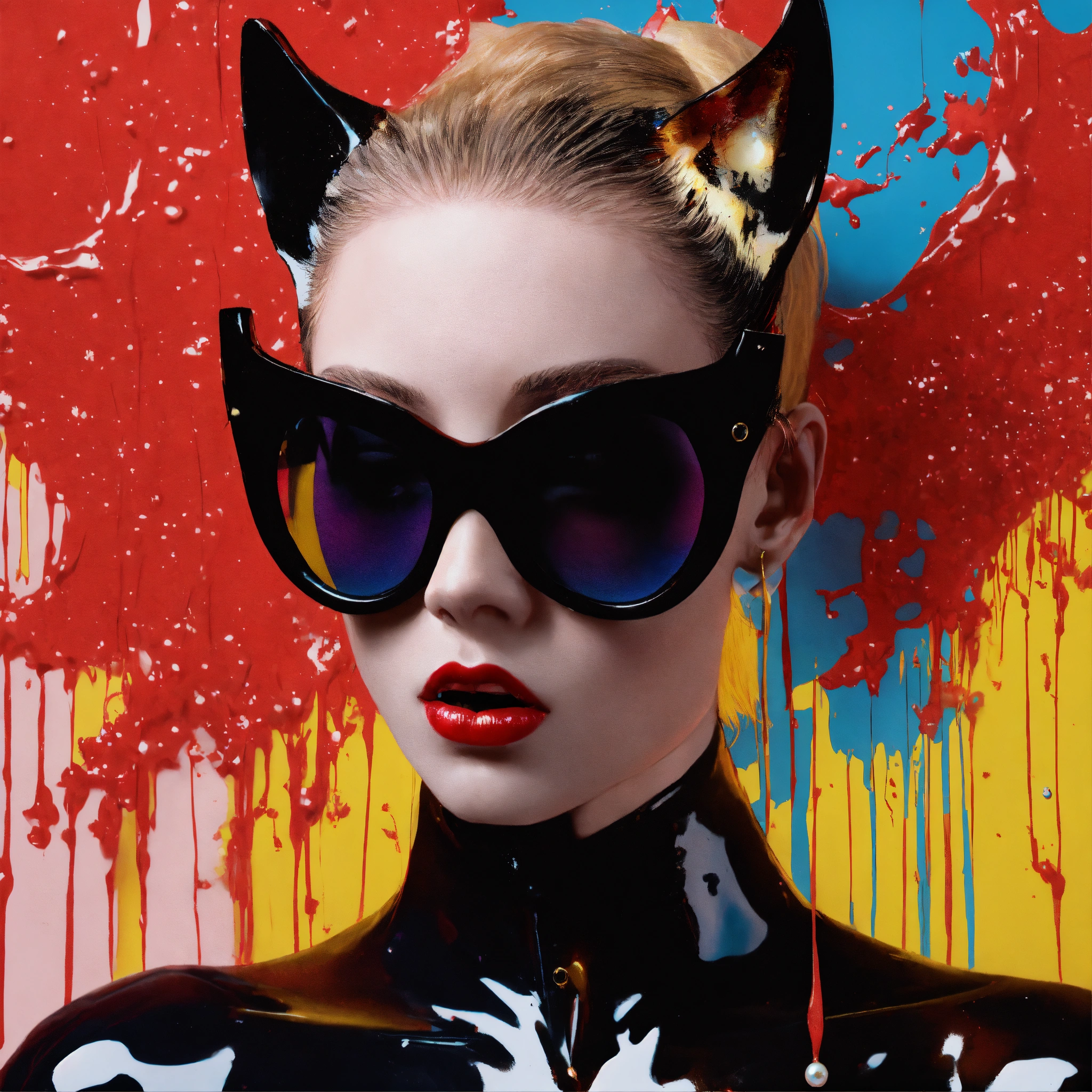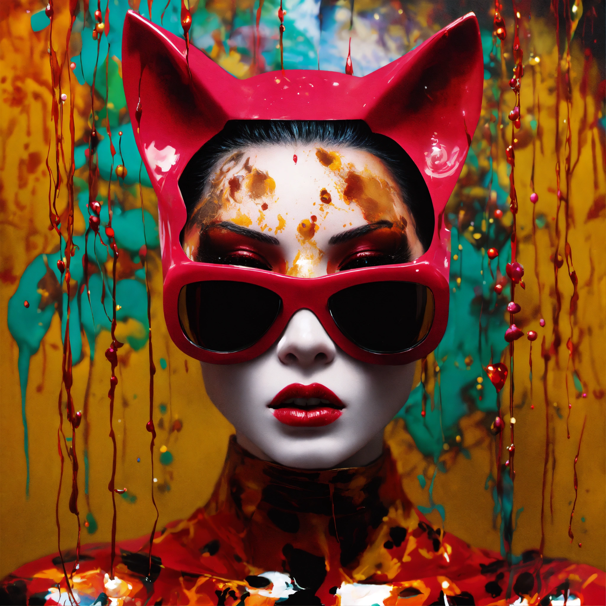 Pearl vibrant cd and color front portrait photography, a woman's face in an asian american cat woman mask with sunglasses, emerges from black ink splatters, an attractive plexiglass body, 80 degree view, art by sergio lopez, natalie shau, james jean and salvador dali