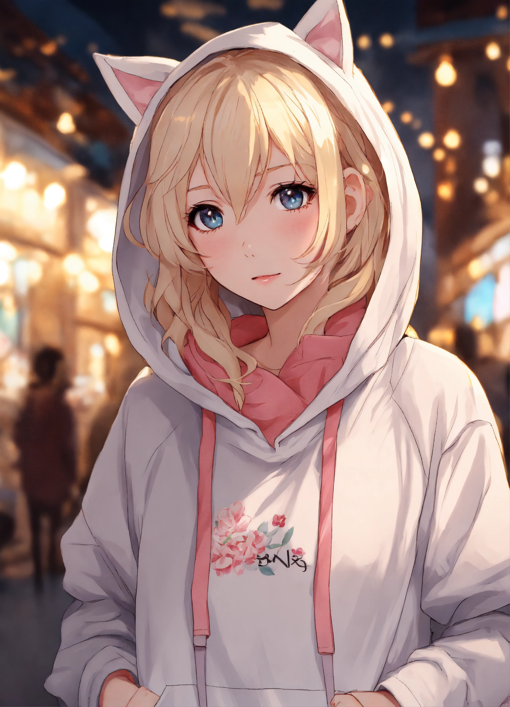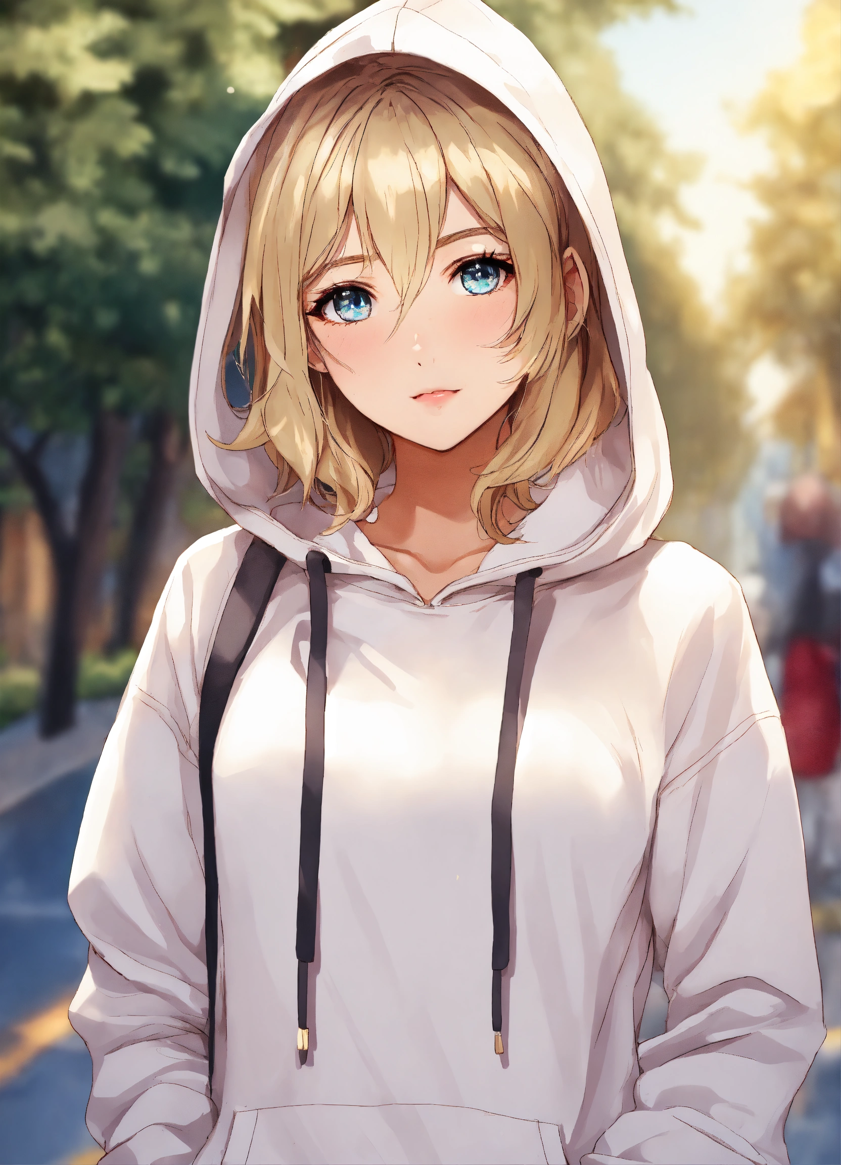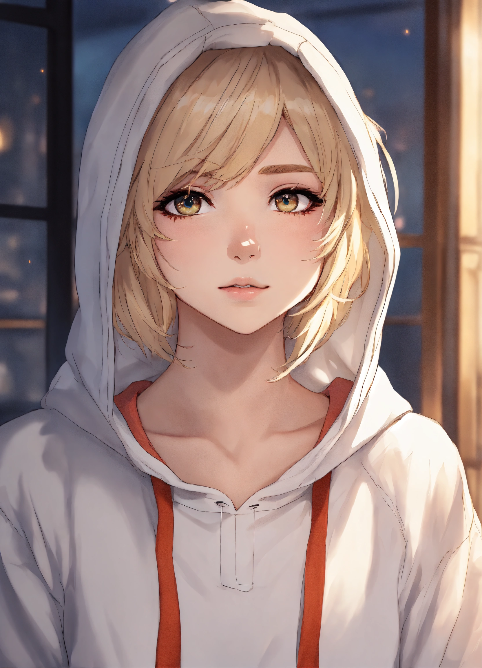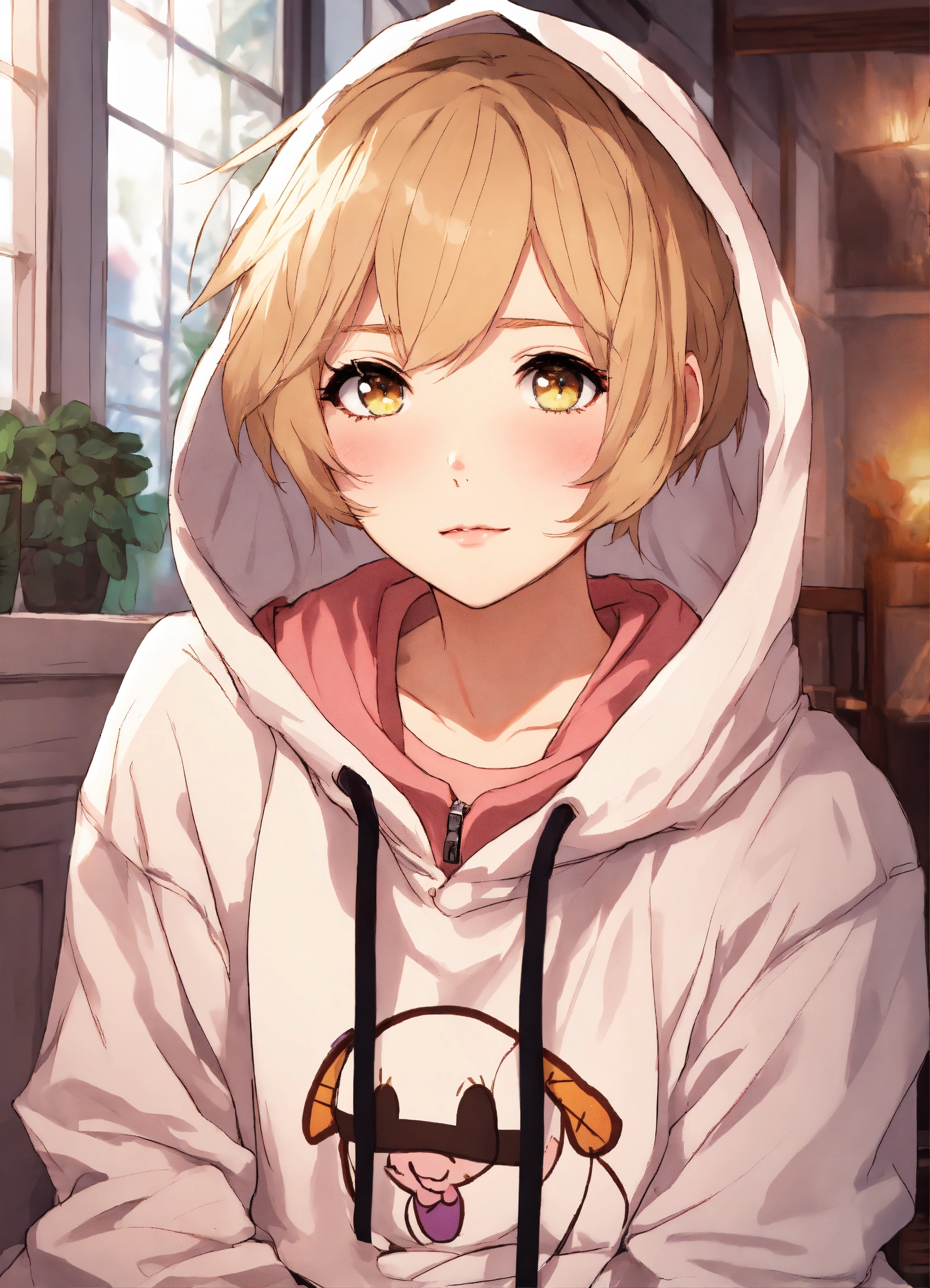 Short white female, short dirty blonde hair, beautiful eyes, rosy cheeks, eyeliner, white hoodie, pj pants, anime