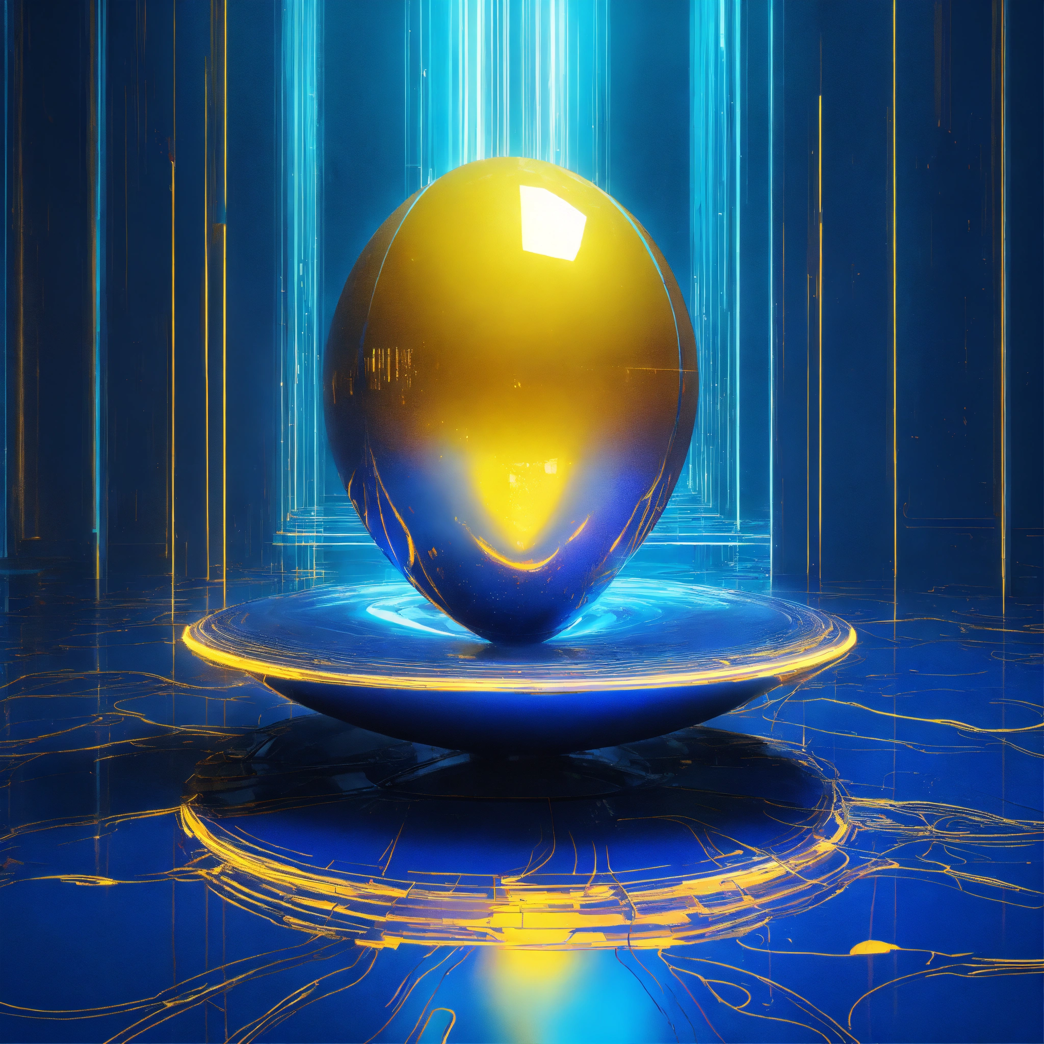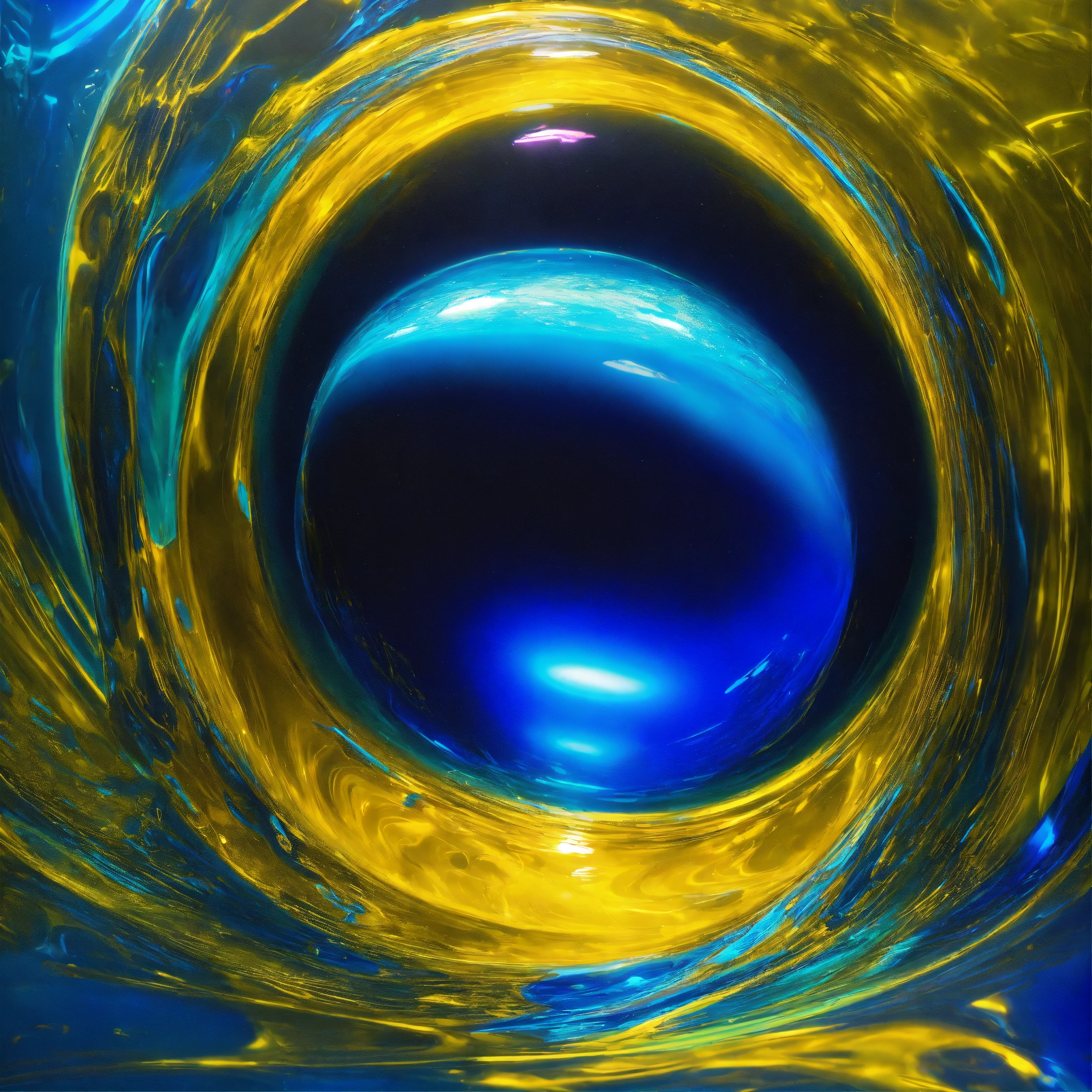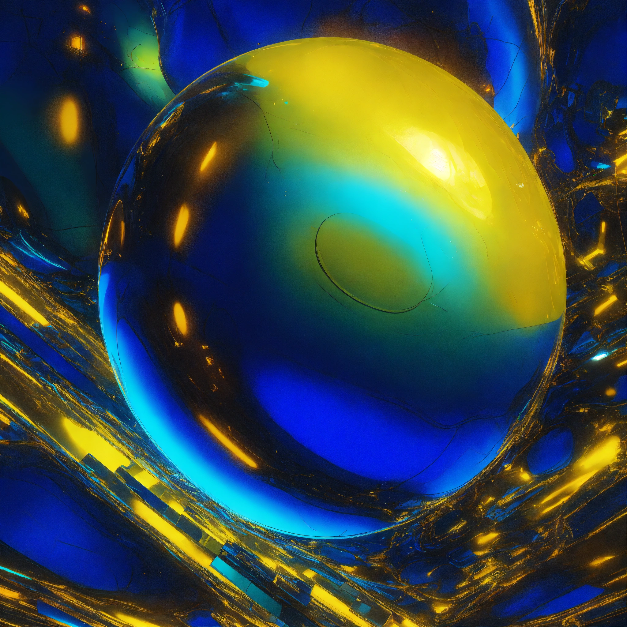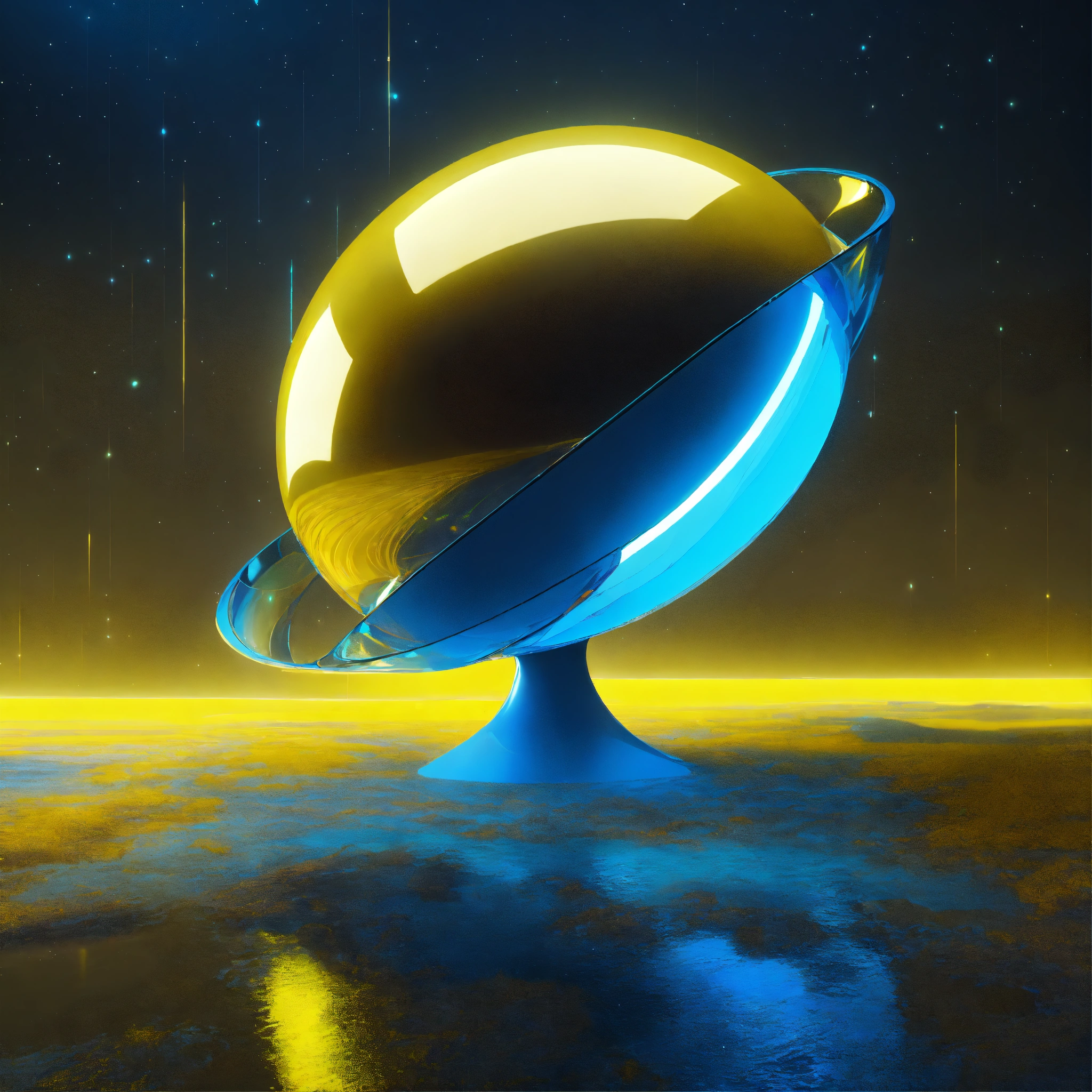 Metallic and reflective and clearly surface, vivid tones of blue and yellow, surreal futuristic object, ethereal glow and hazy neon light, an enormous mass that defies perception. one abstract representative object floating --ar 169 --s 1000 --c 15