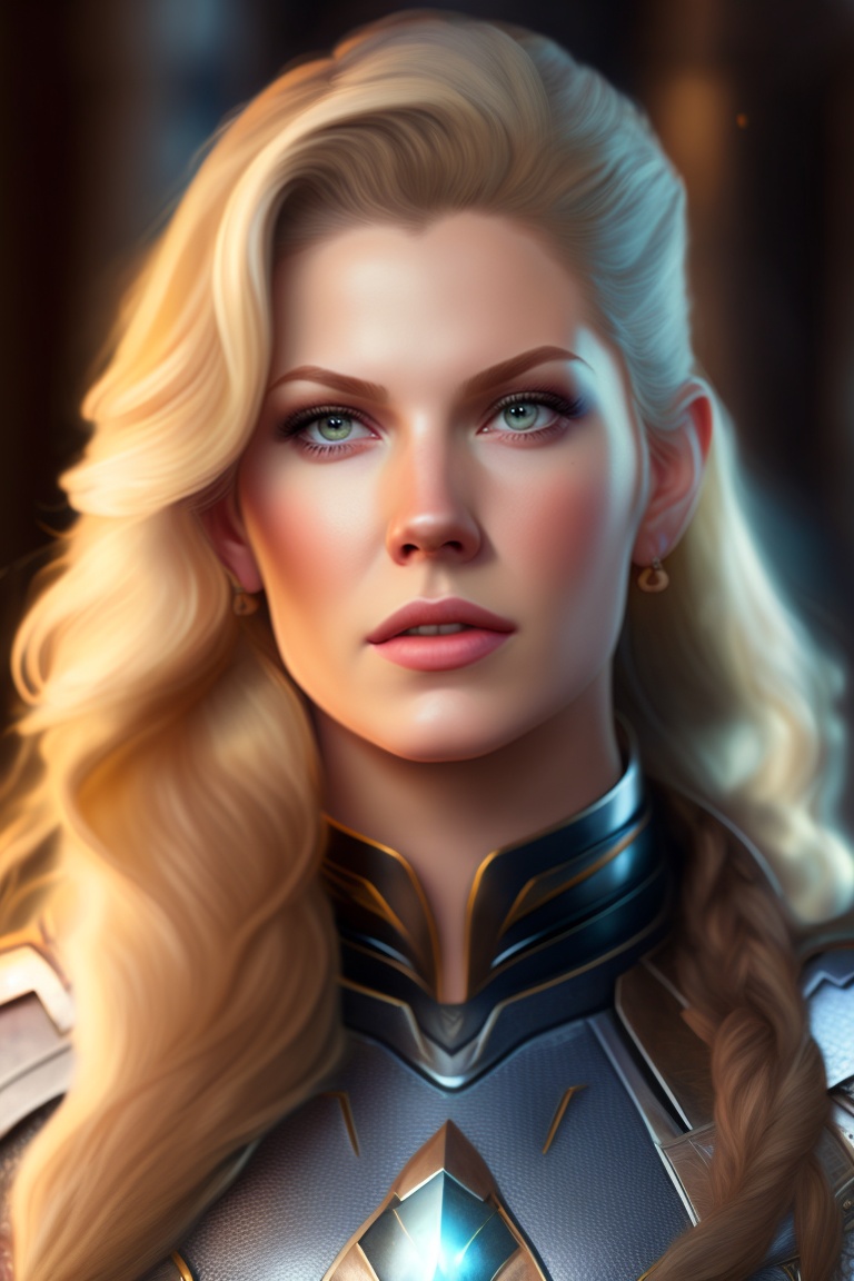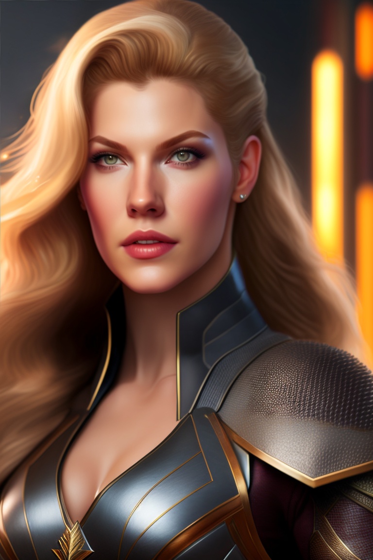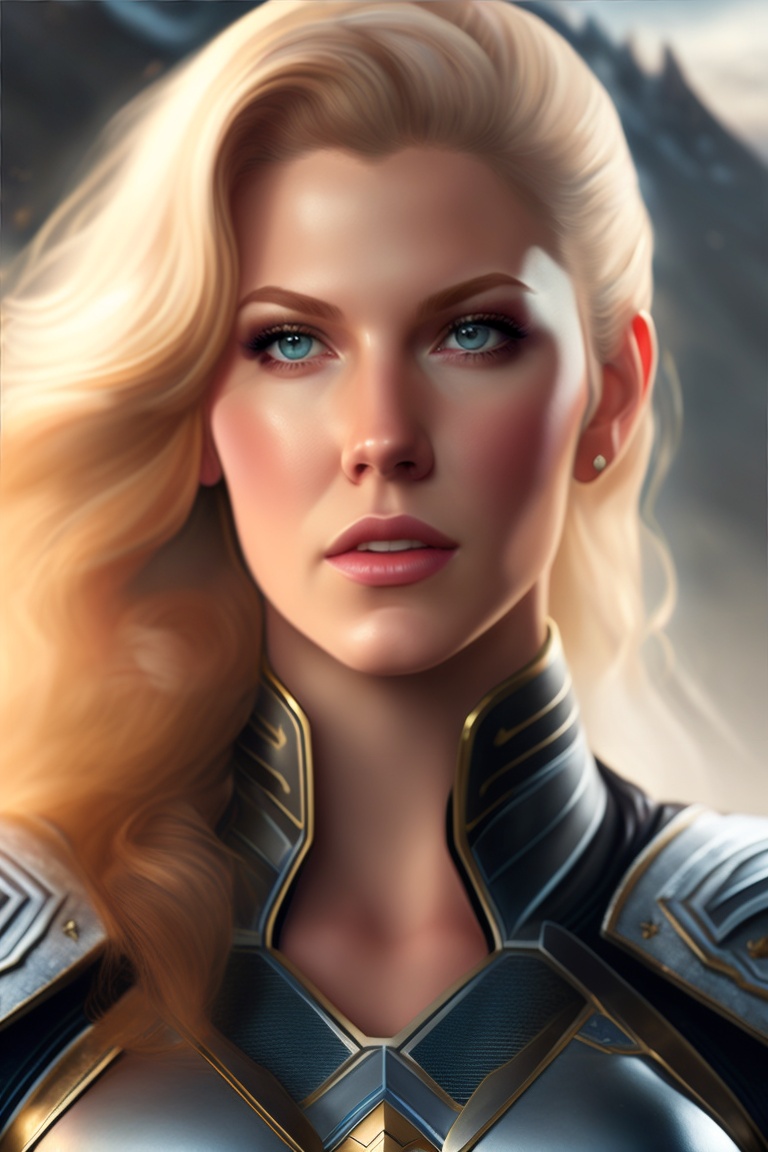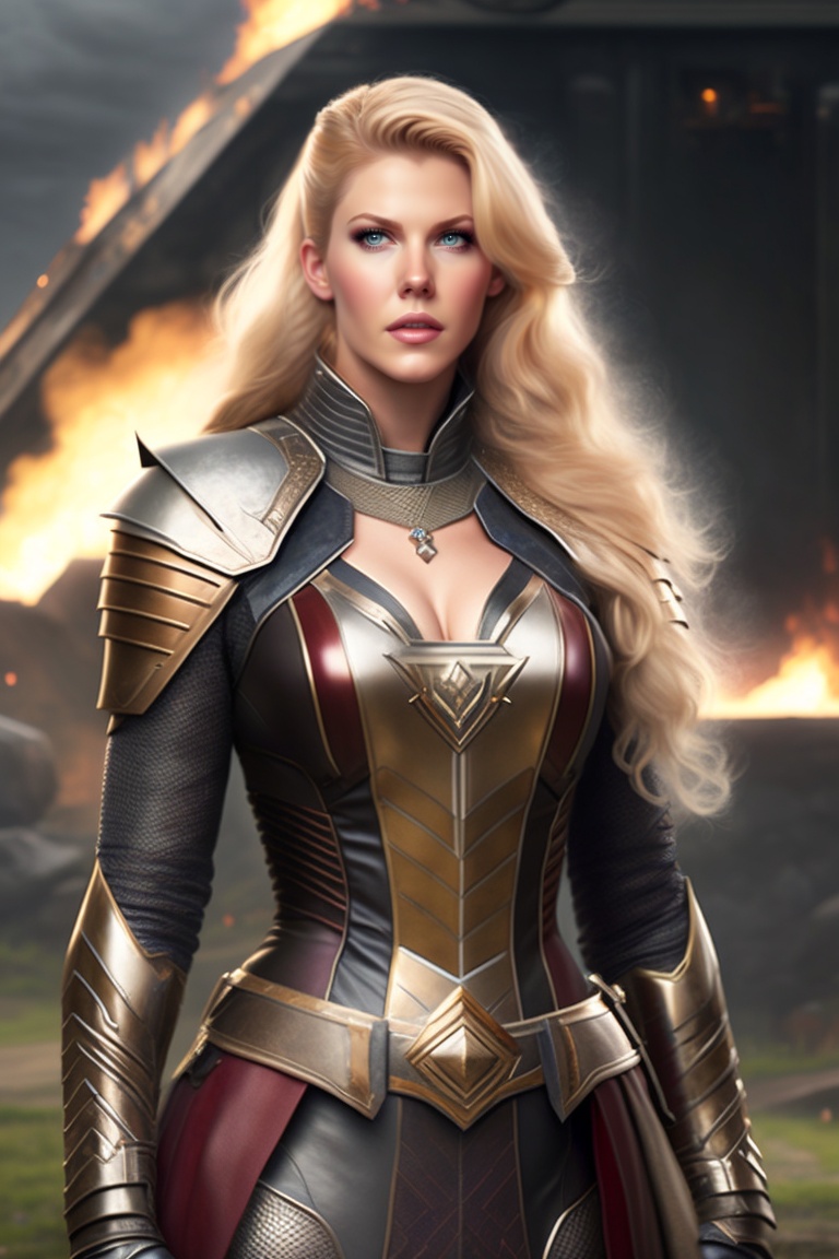 Katheryn winnick as a valkiria, her gaze intense and her expression fierce, rendered in a highly detailed, mid-distance photo, full body, relistic
