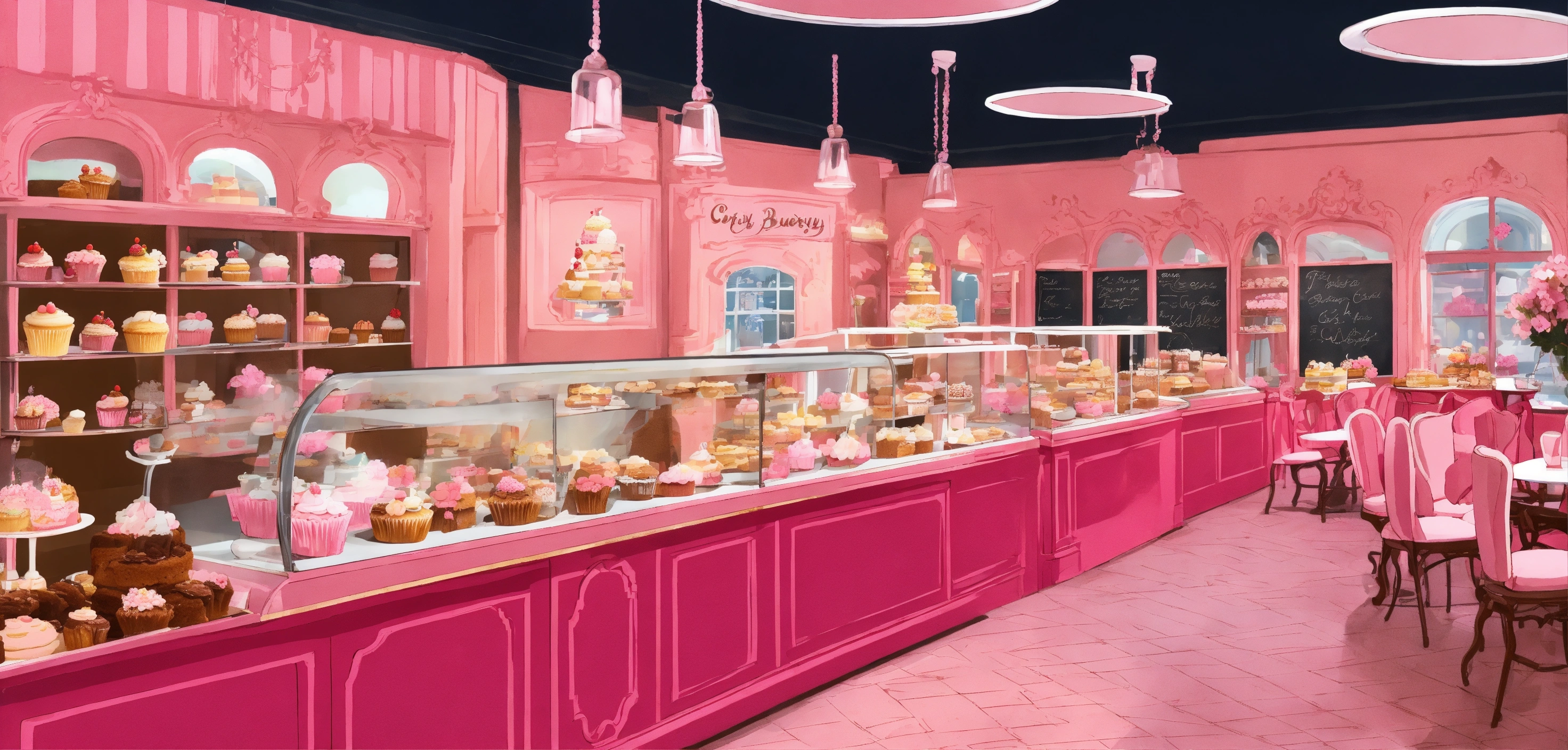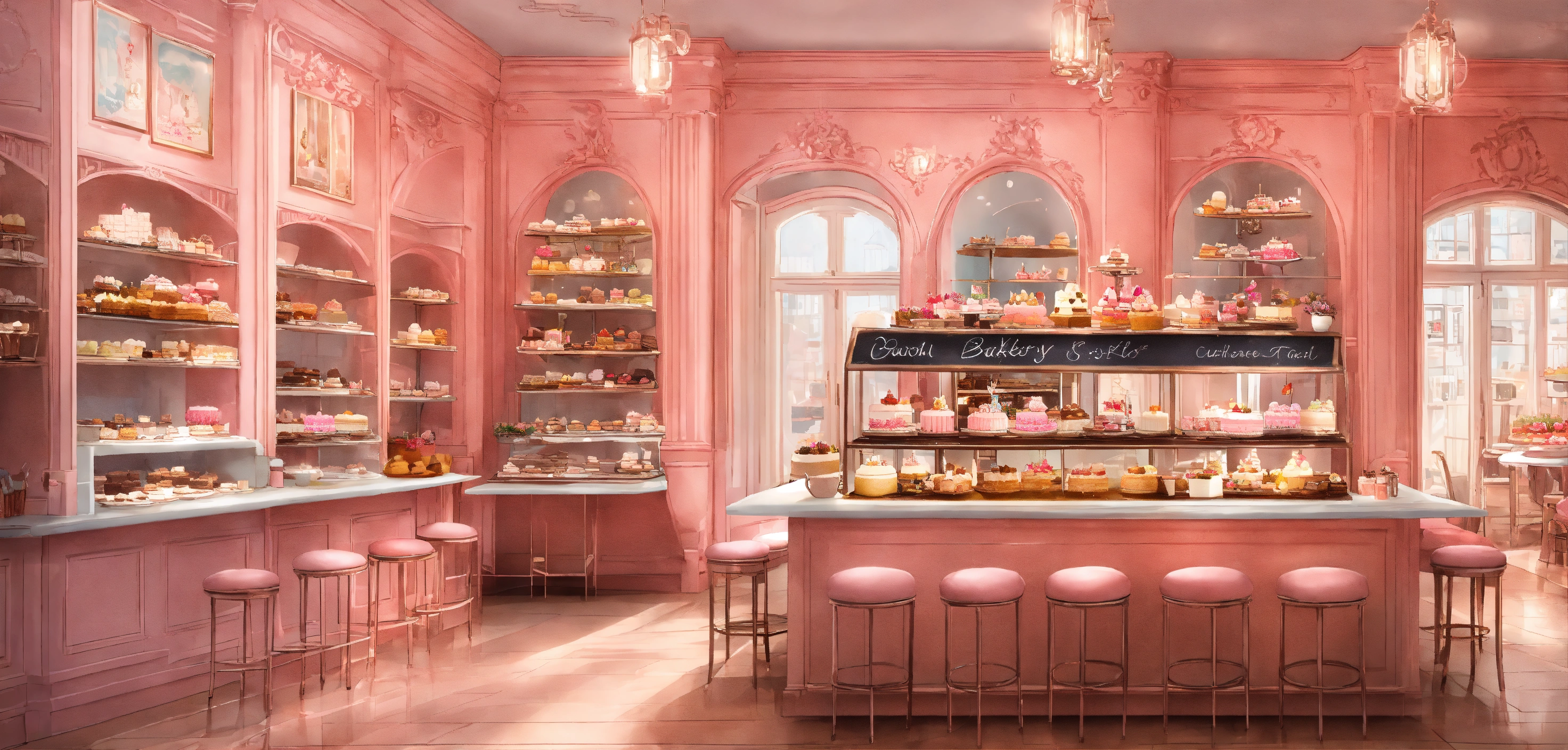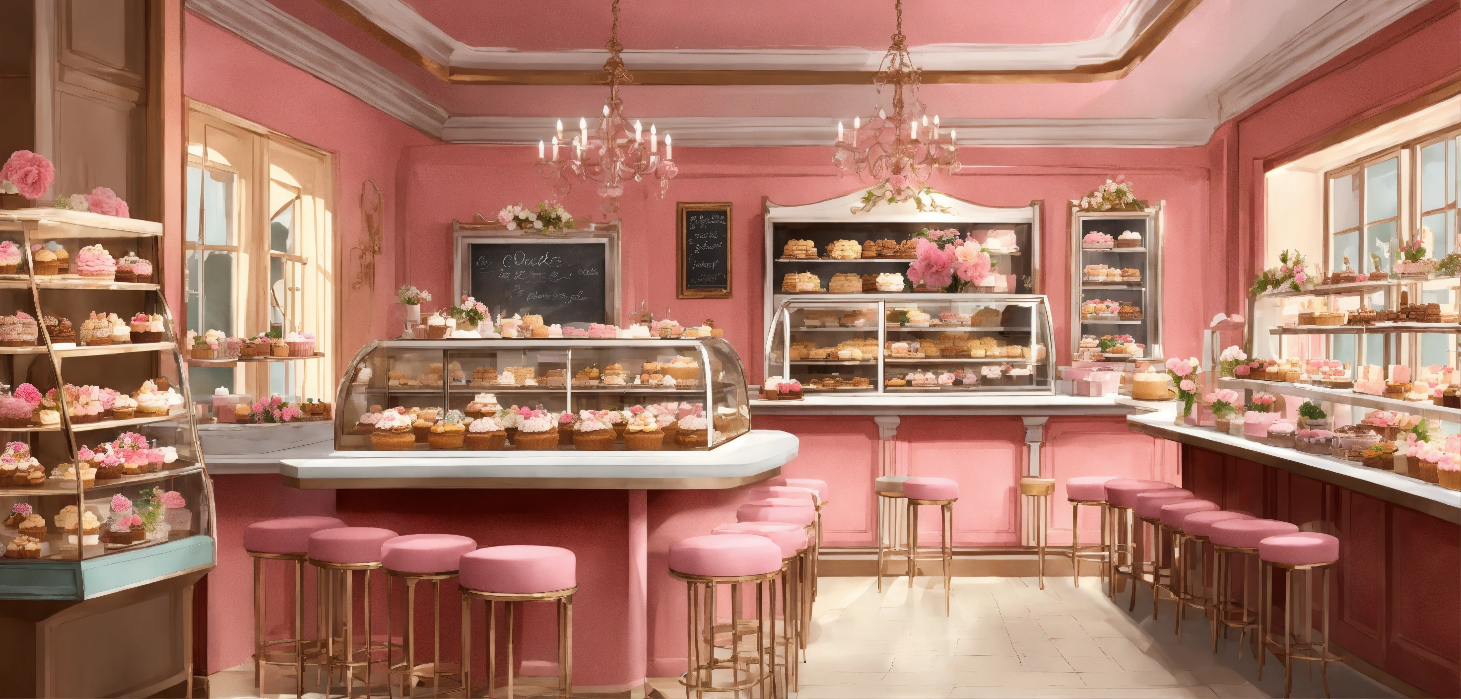 Concept art of beautiful bakery, girly, cute, indoors, interior design, pink, cakes, cupcakes, brownies, shop, feminine, white design delicate chairs and tables, coffee, pastry shop, intricate, detailed, chalkboard signs, elegant, huge, realistic, potted flower vases