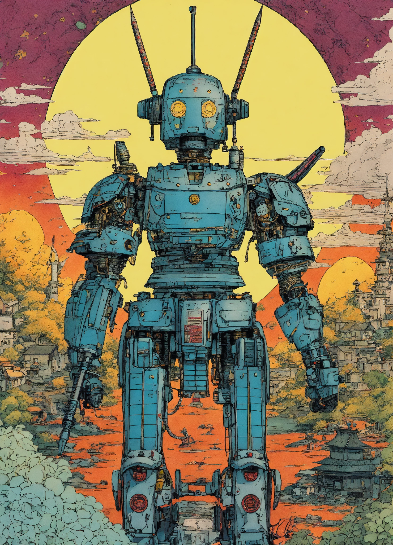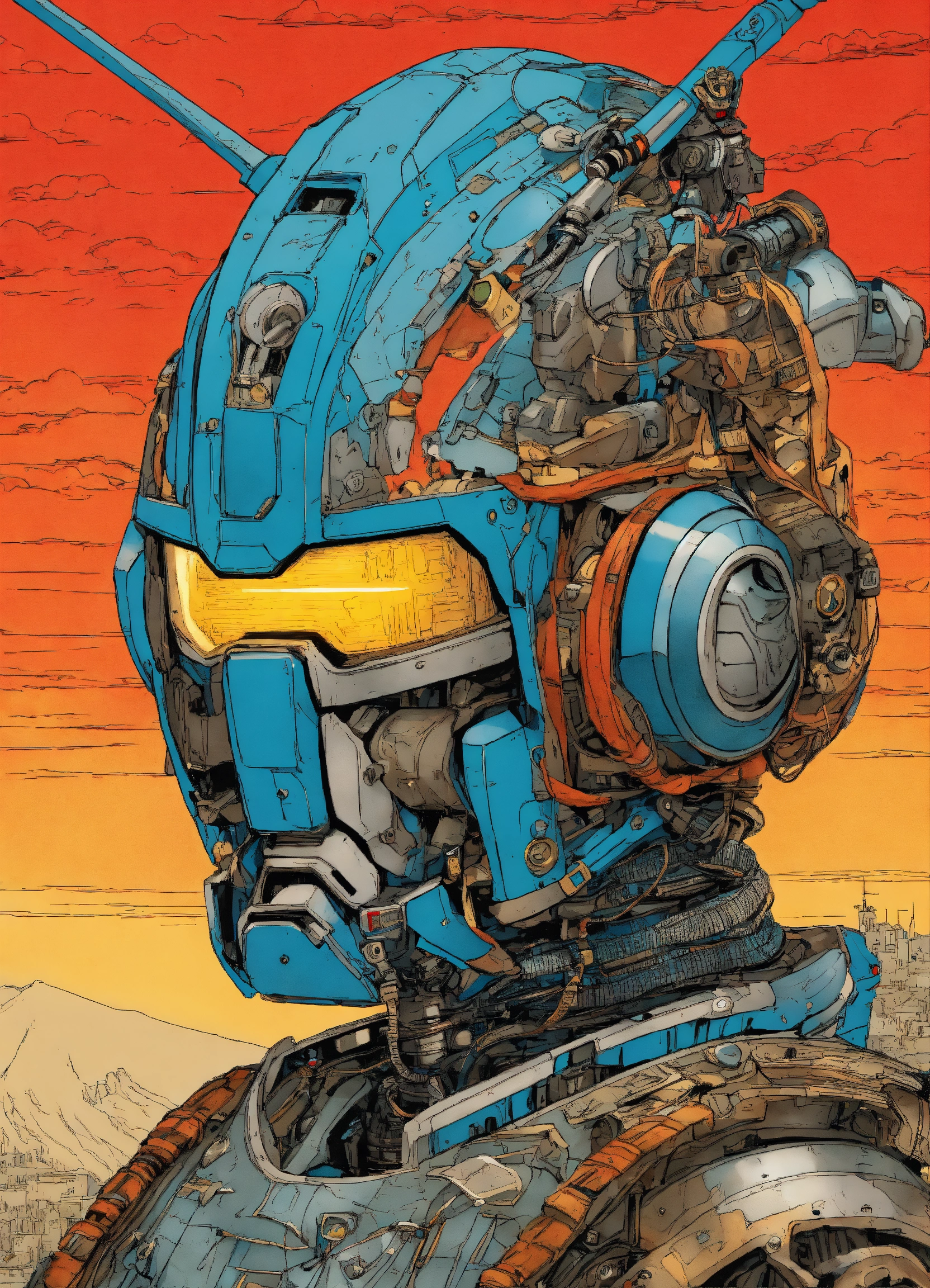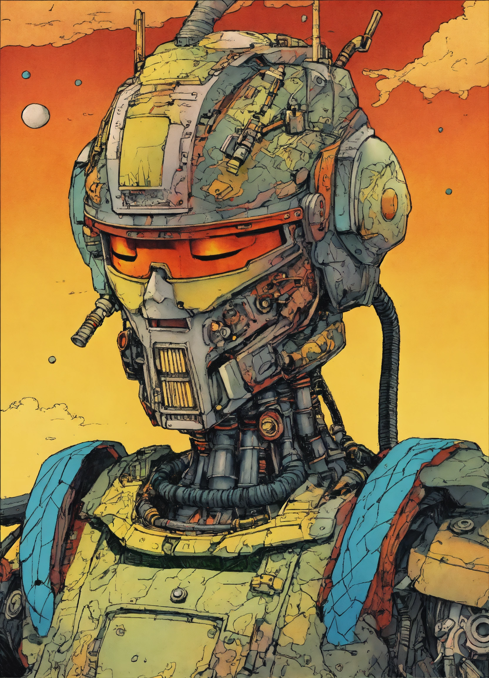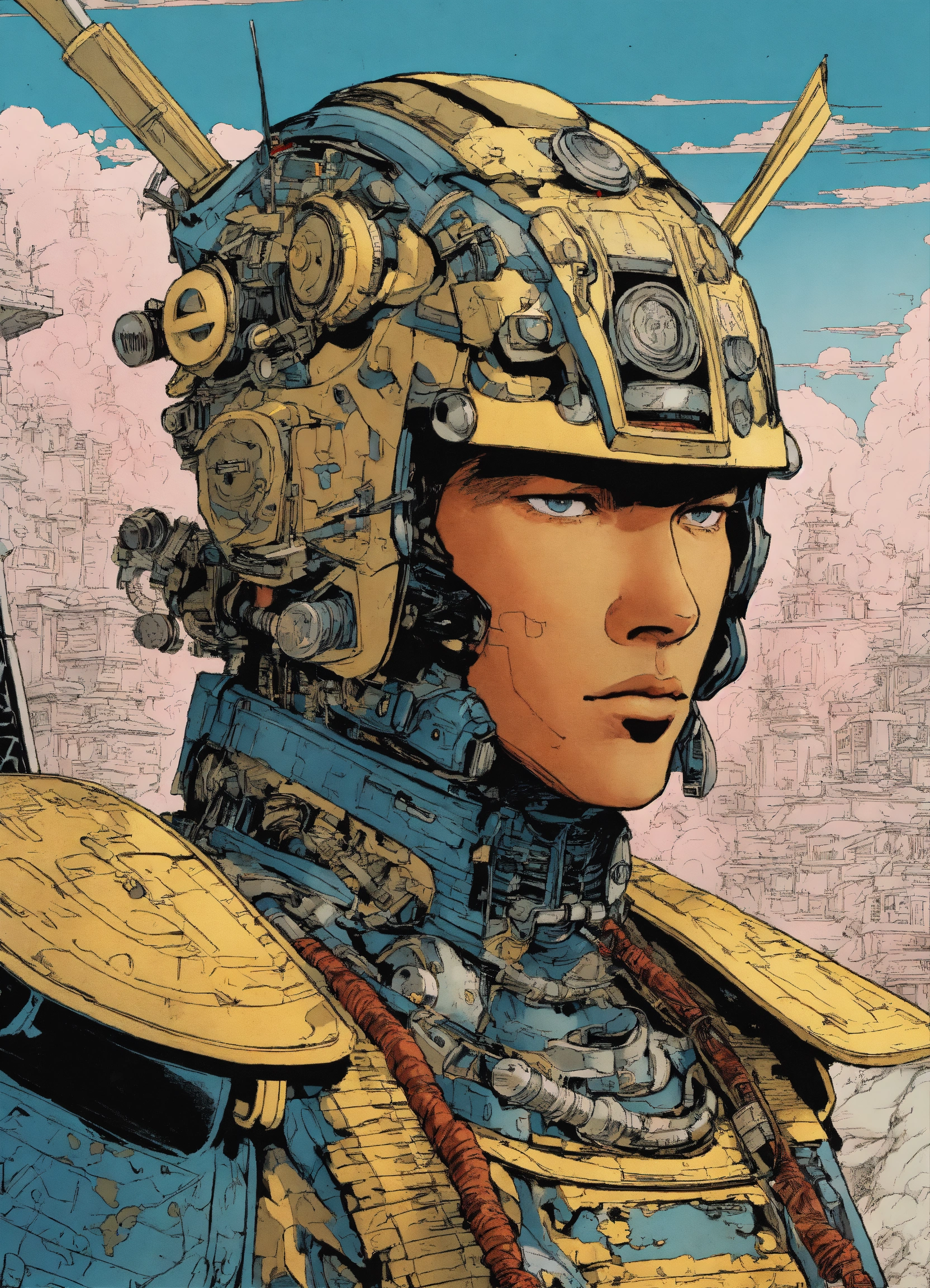 Detailed pen and ink illustration of a samurai robot cyborg, head only, detailed anthropology, futuristic background, by herge, in the style of tin-tin comics, colorful, detailed, high quality, sweet