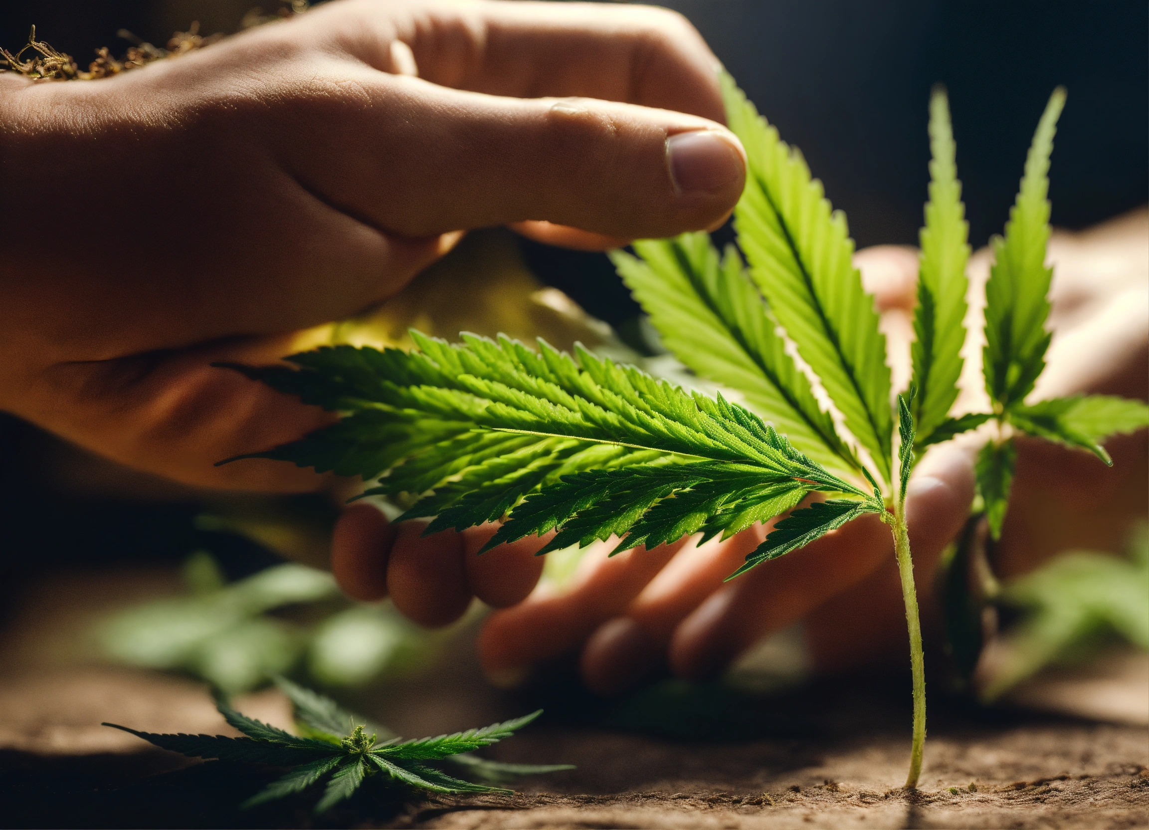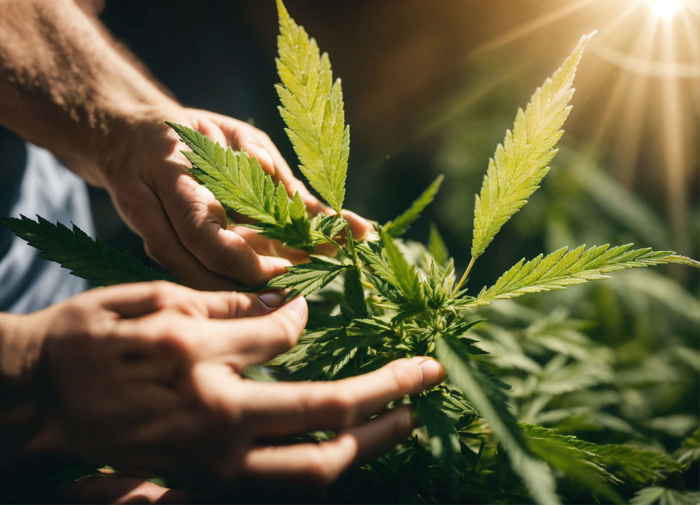 Create a photo realistic image of two hands remove leaves from cannabis. the picture is very light and a sunbeam shins directly on it. photography, dslr with macro lens to capture the intricate details in a super-realistic photography hr image.resolution 300dpi