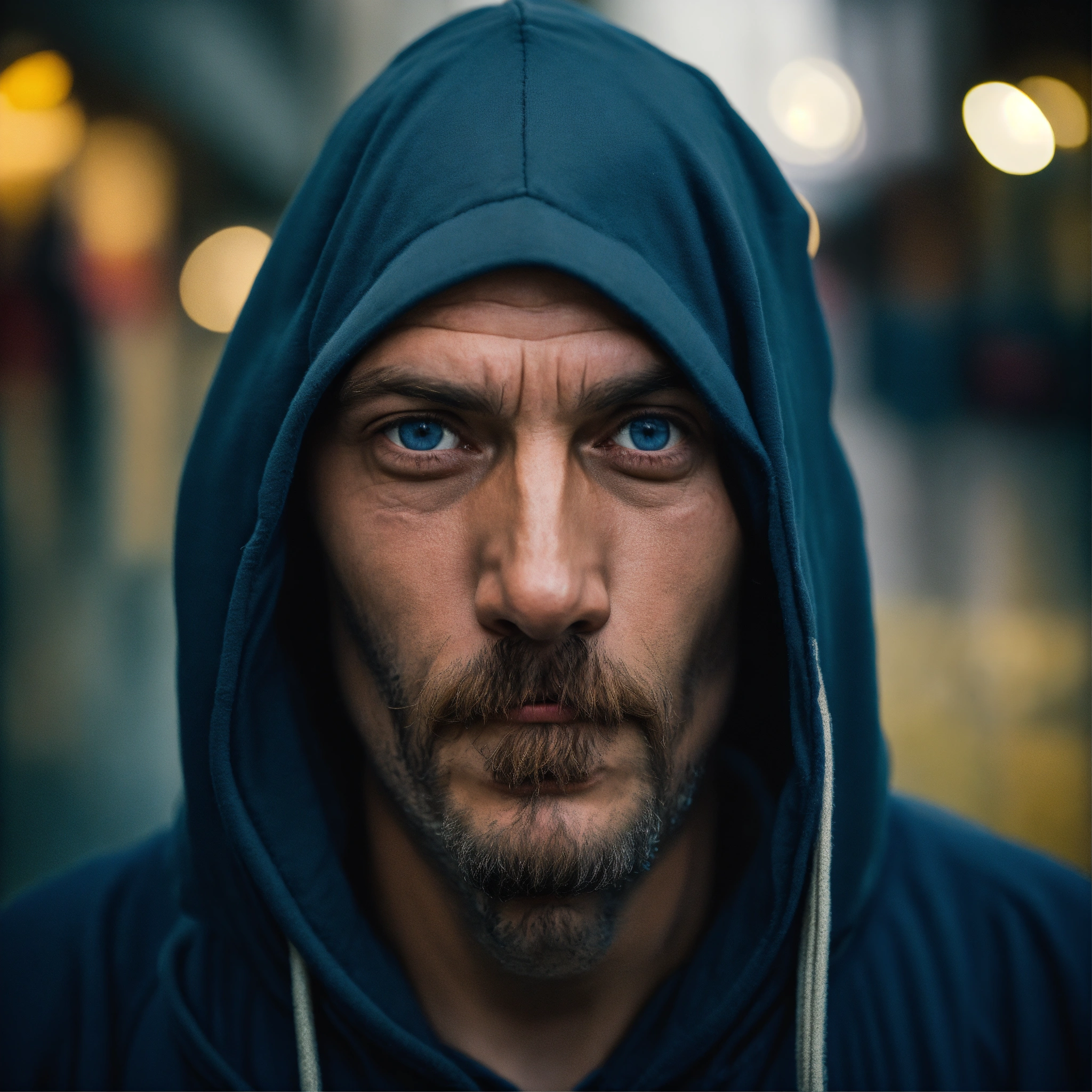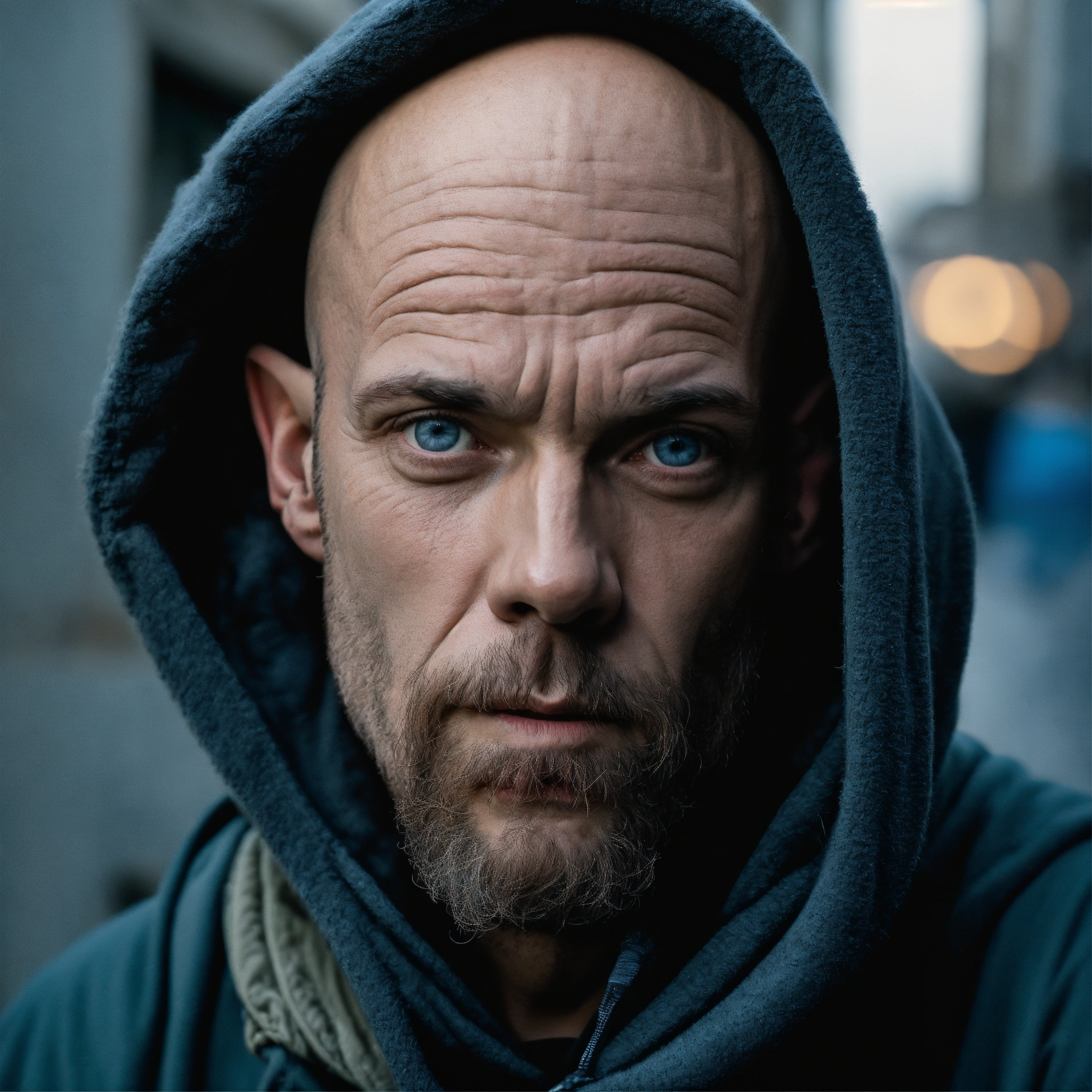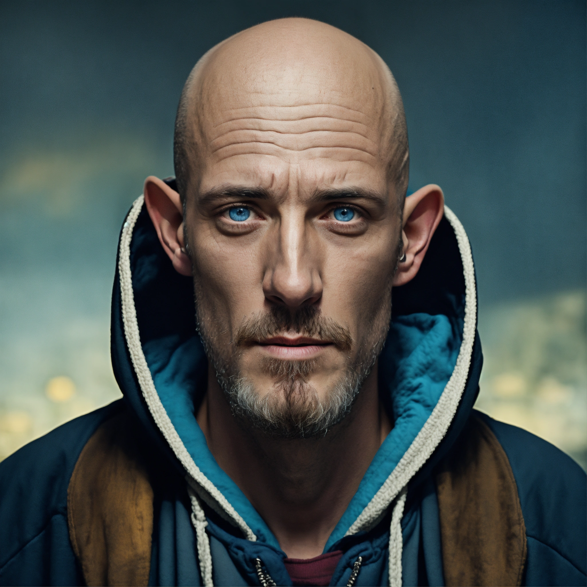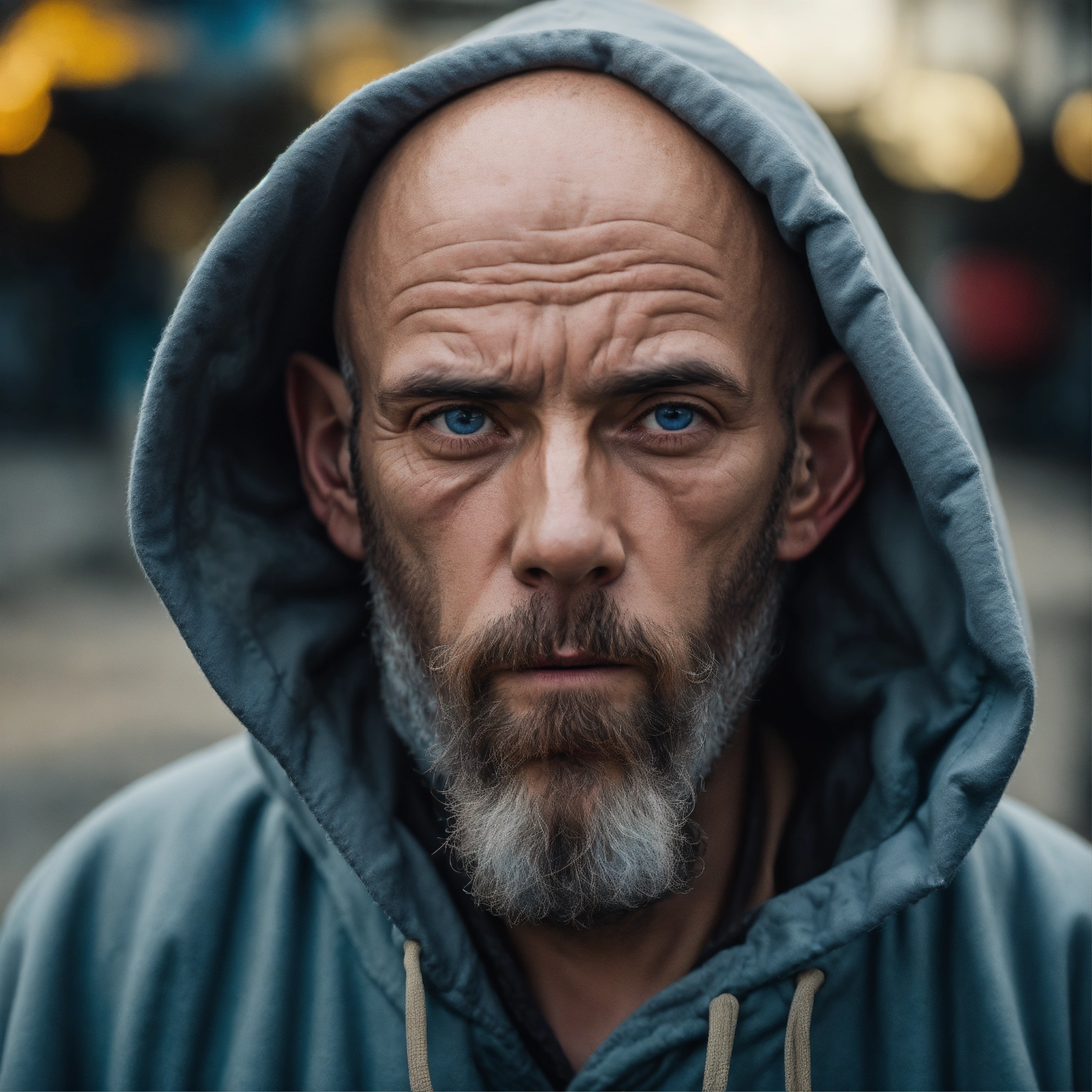 A huge homeless man with a huge lumpy bald head, a horizontal fold of skin between the eyes, a tiny goatee, protruding forehead, sunken silvery-blue eyes, crooked mouth, large ears, wearing a hoodie up over his head