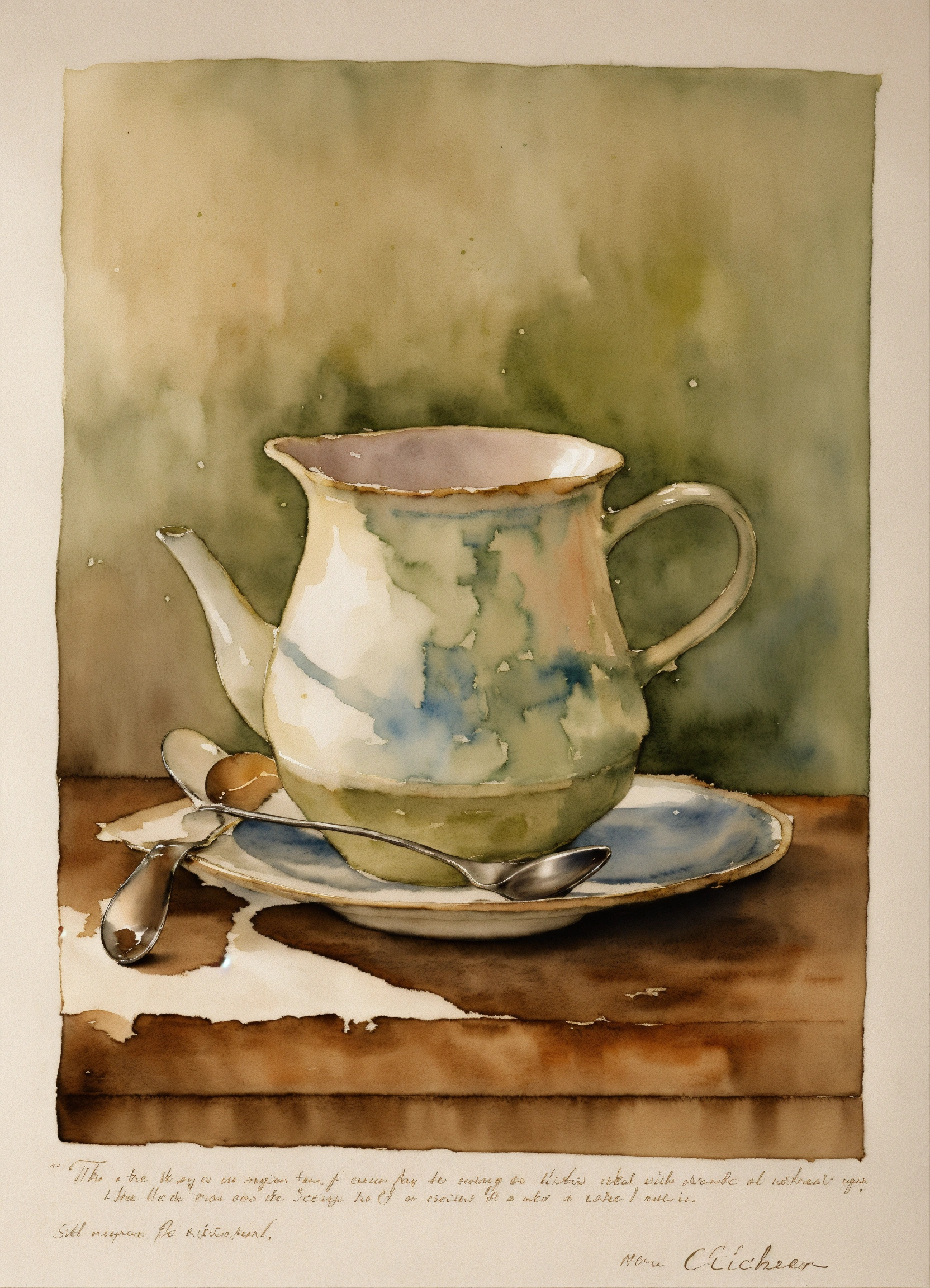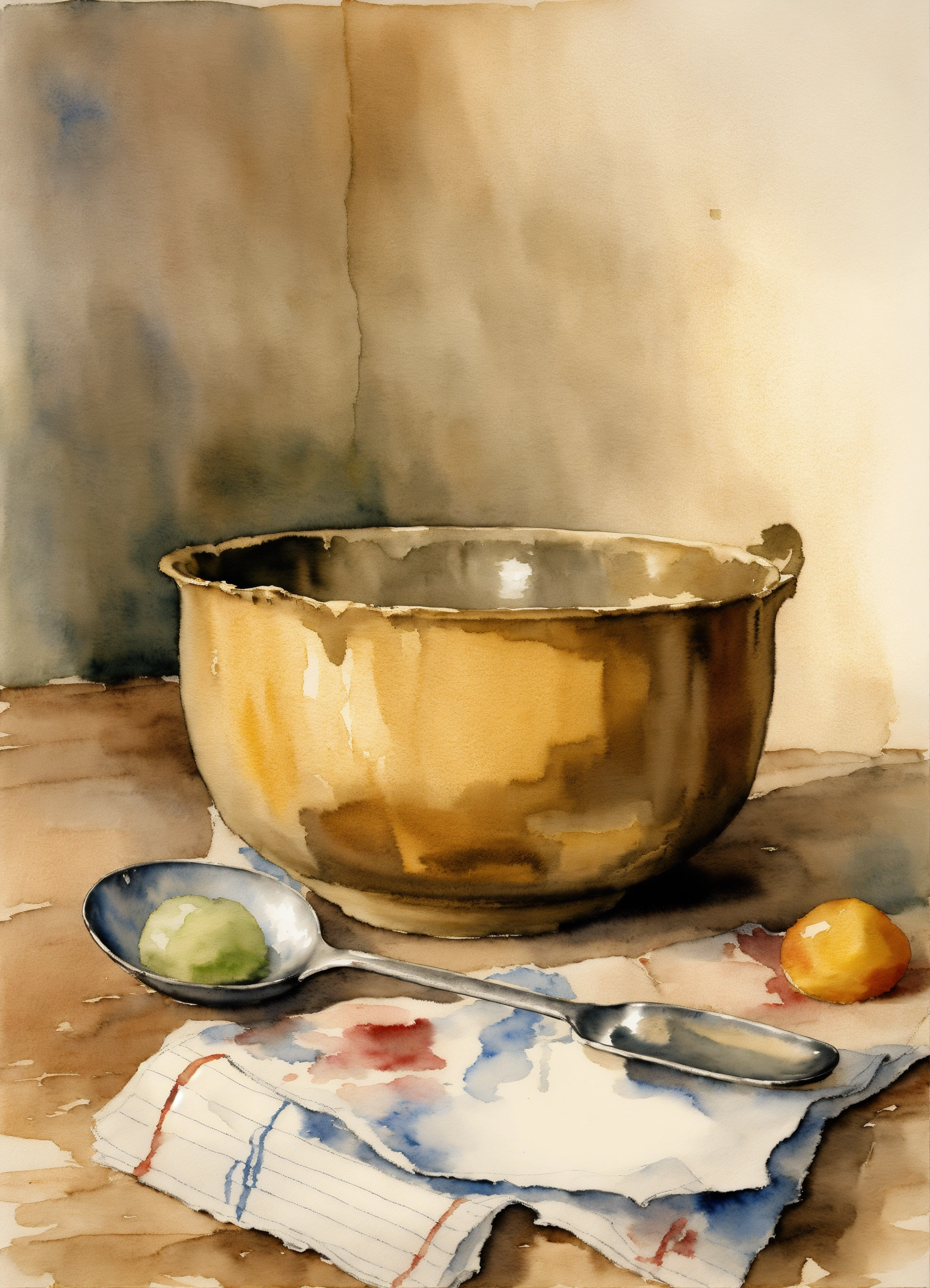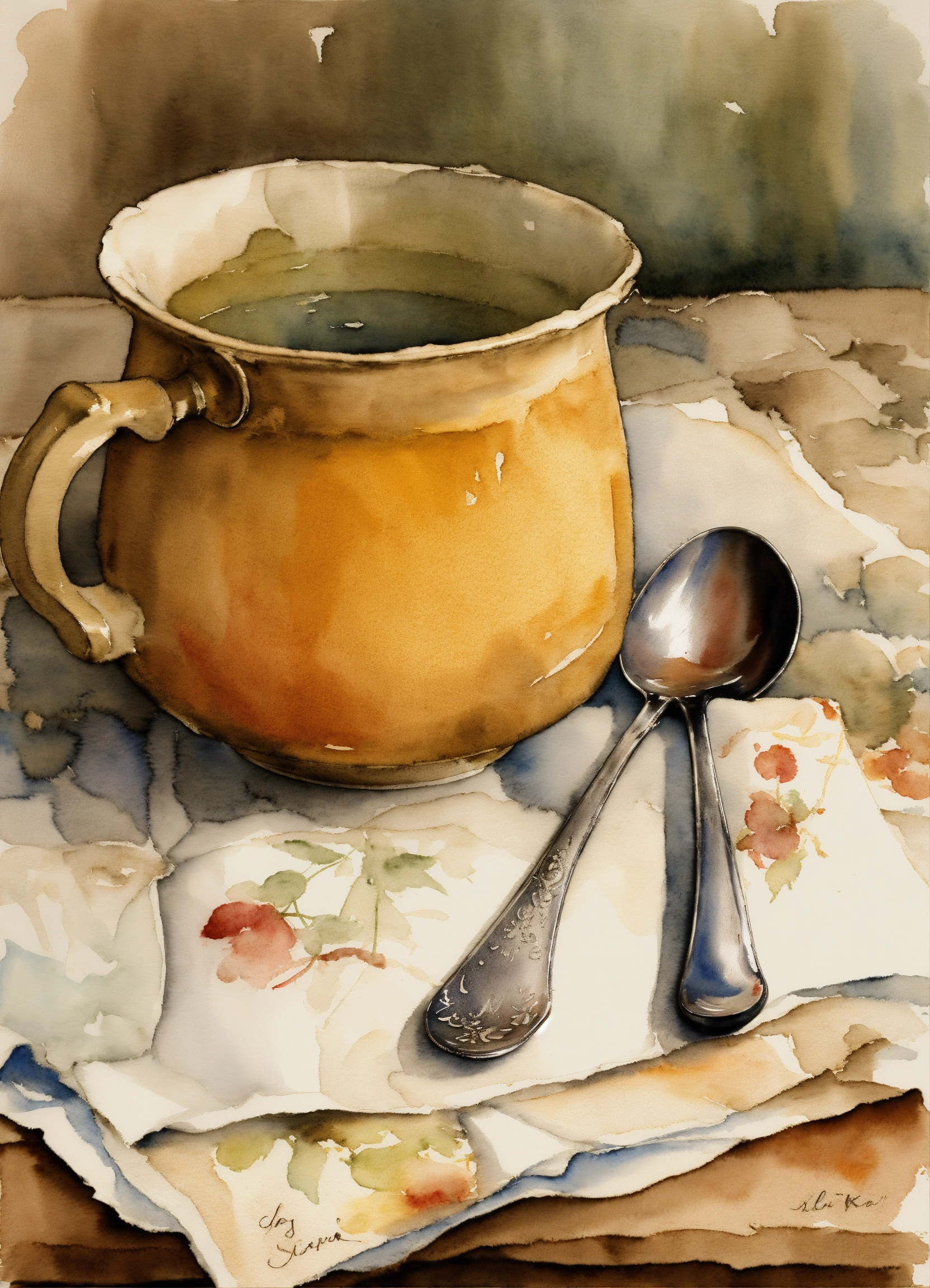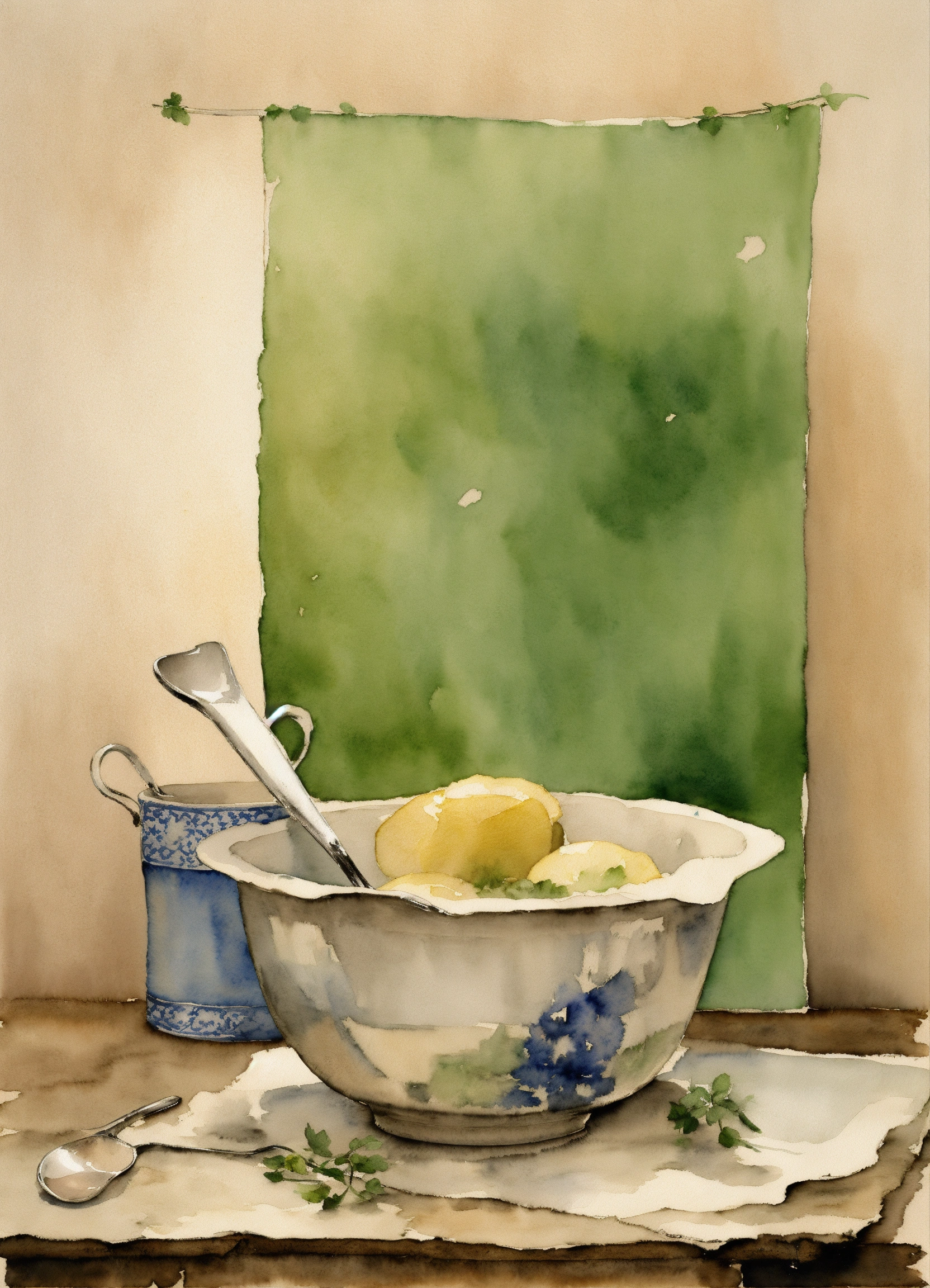Square, a kitchen recipe, in the form of a scrappage, watercolour painting with muted tones, a place for notes, torn edge, very minimalist, with a tea towel, on the bottom of the page, a spoon with a bow tied around it. by cicely mary barker