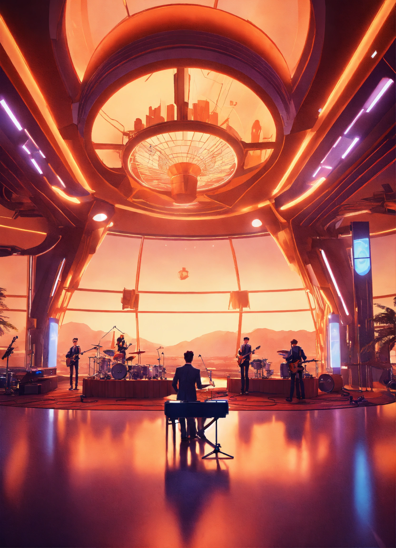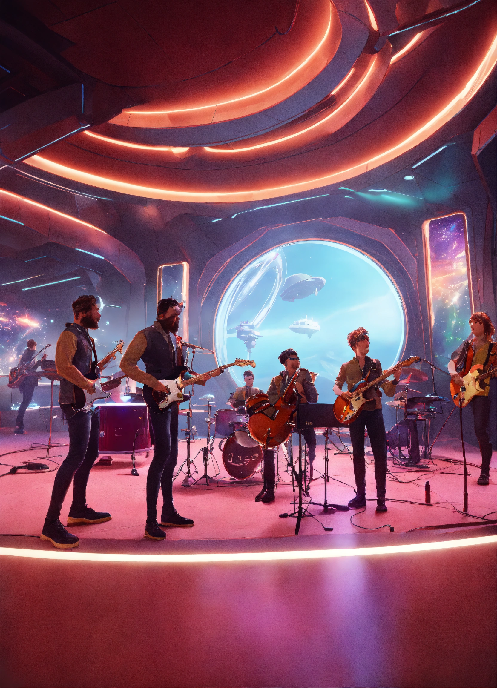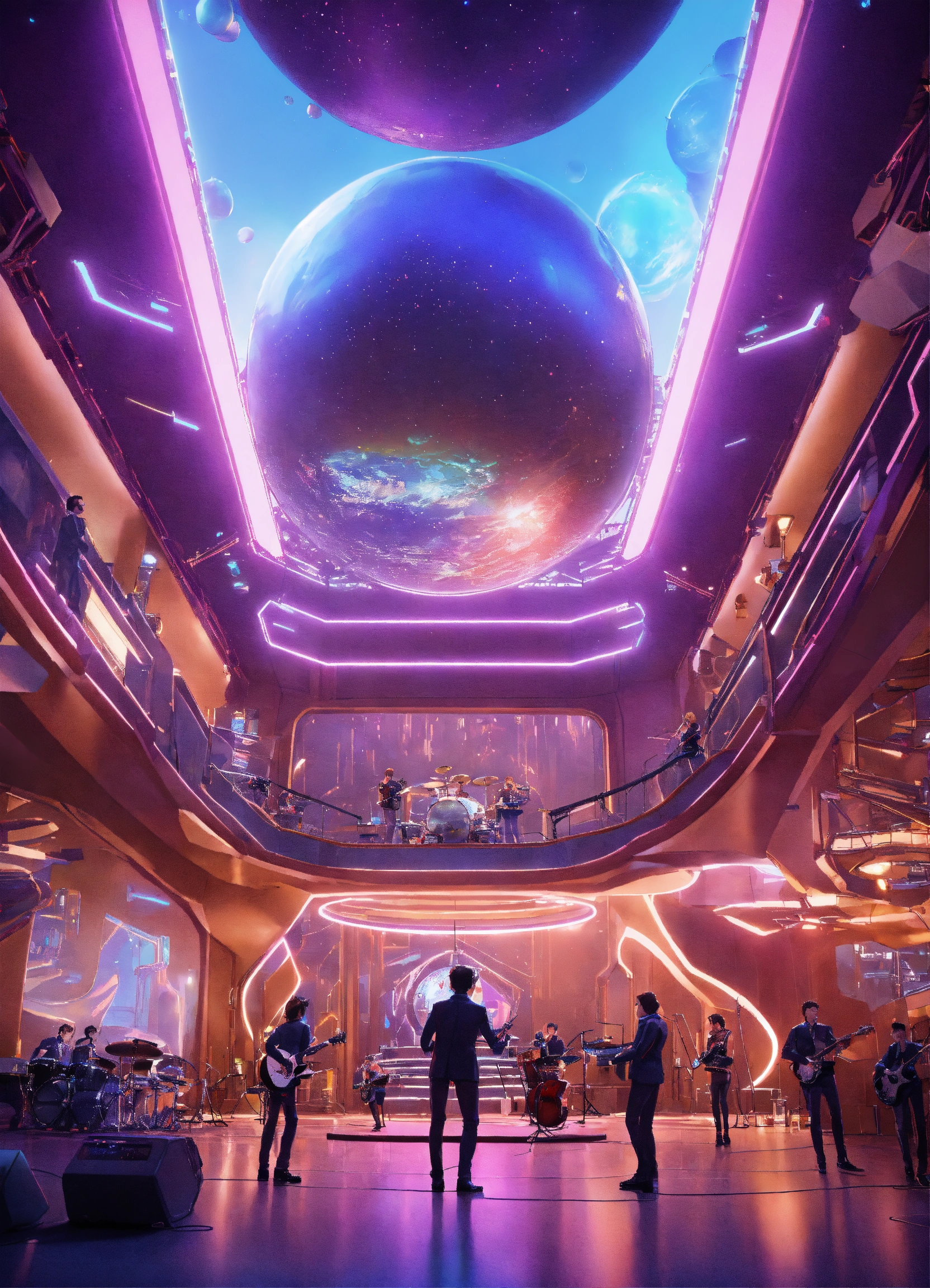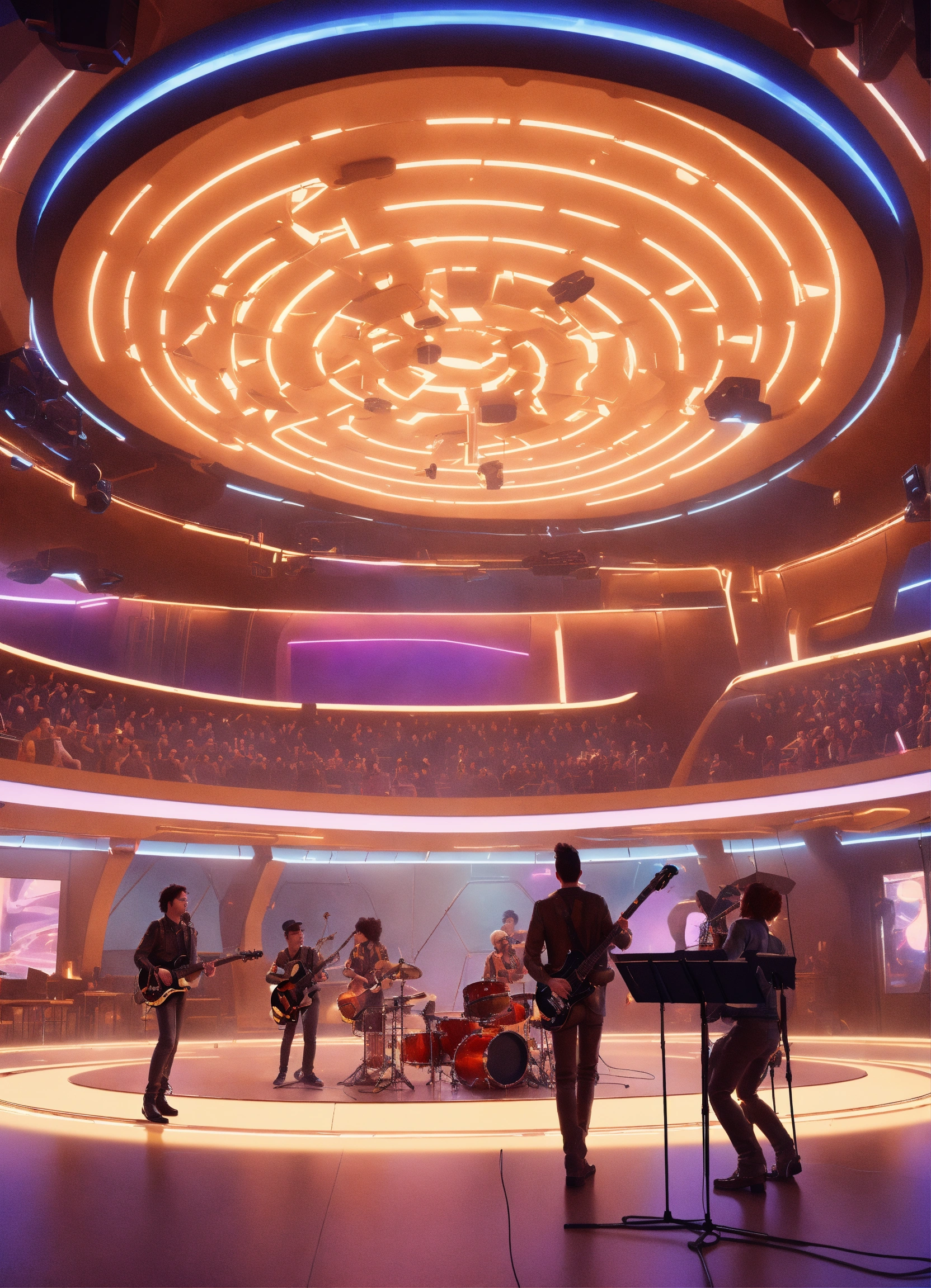 A band plays at a futuristic ballroom on a spaceport, realistic, futuristic, sci fi, 8k, unreal engine, analog controls, cartoon, pixar, disney