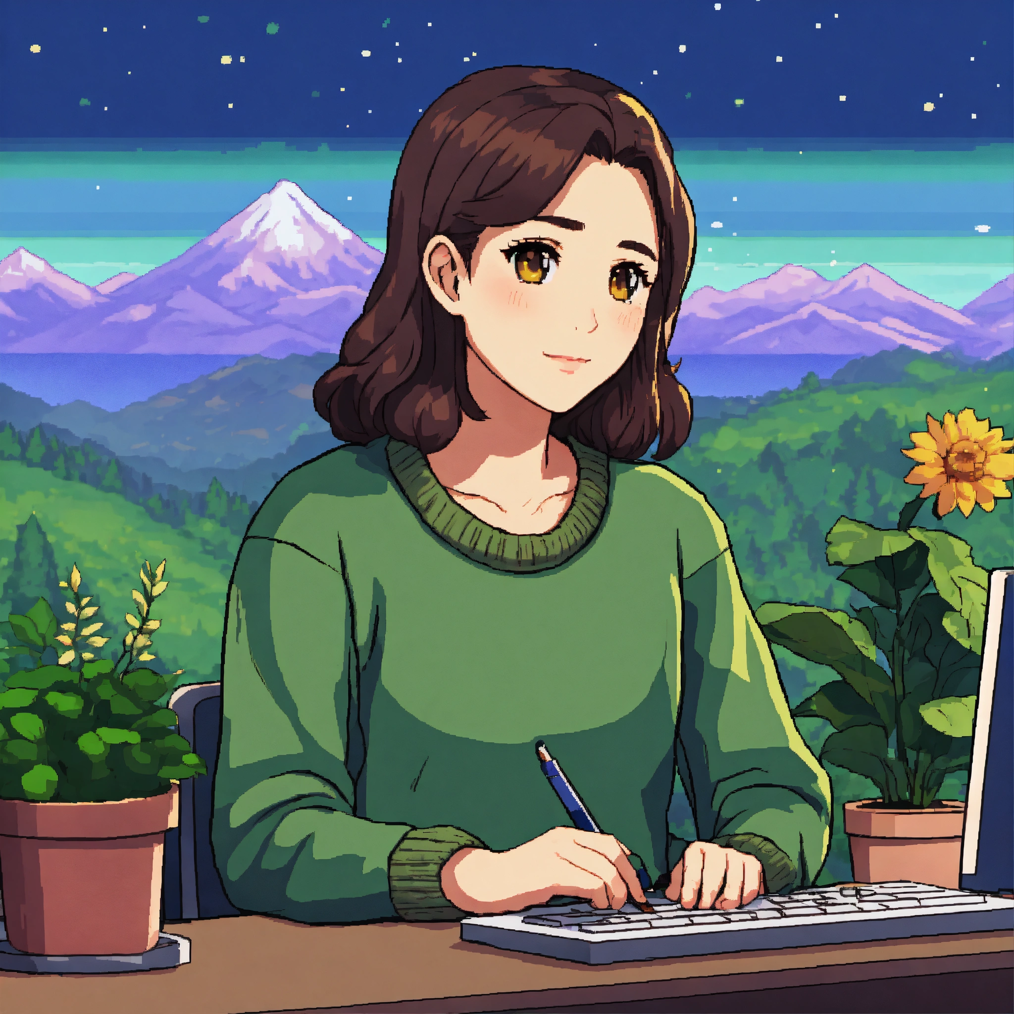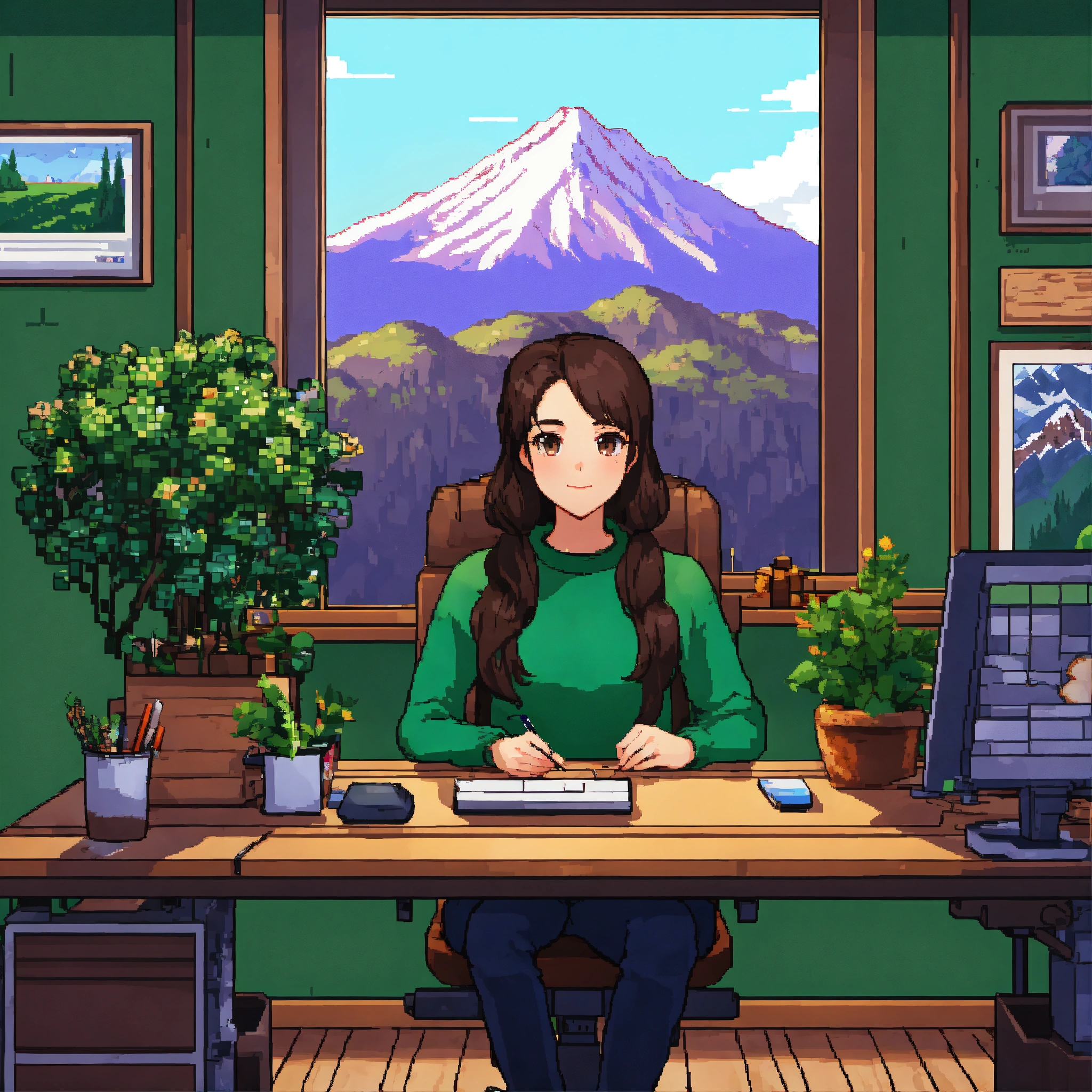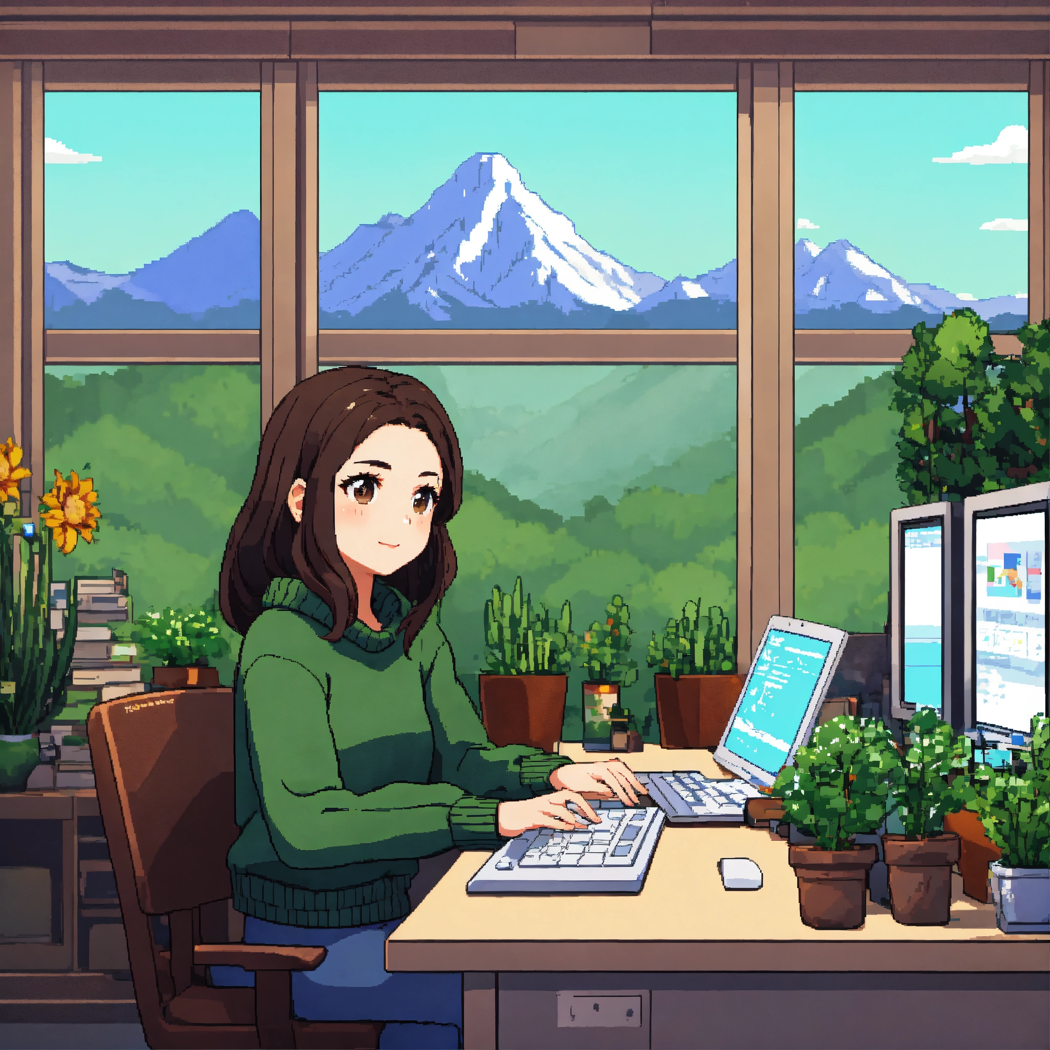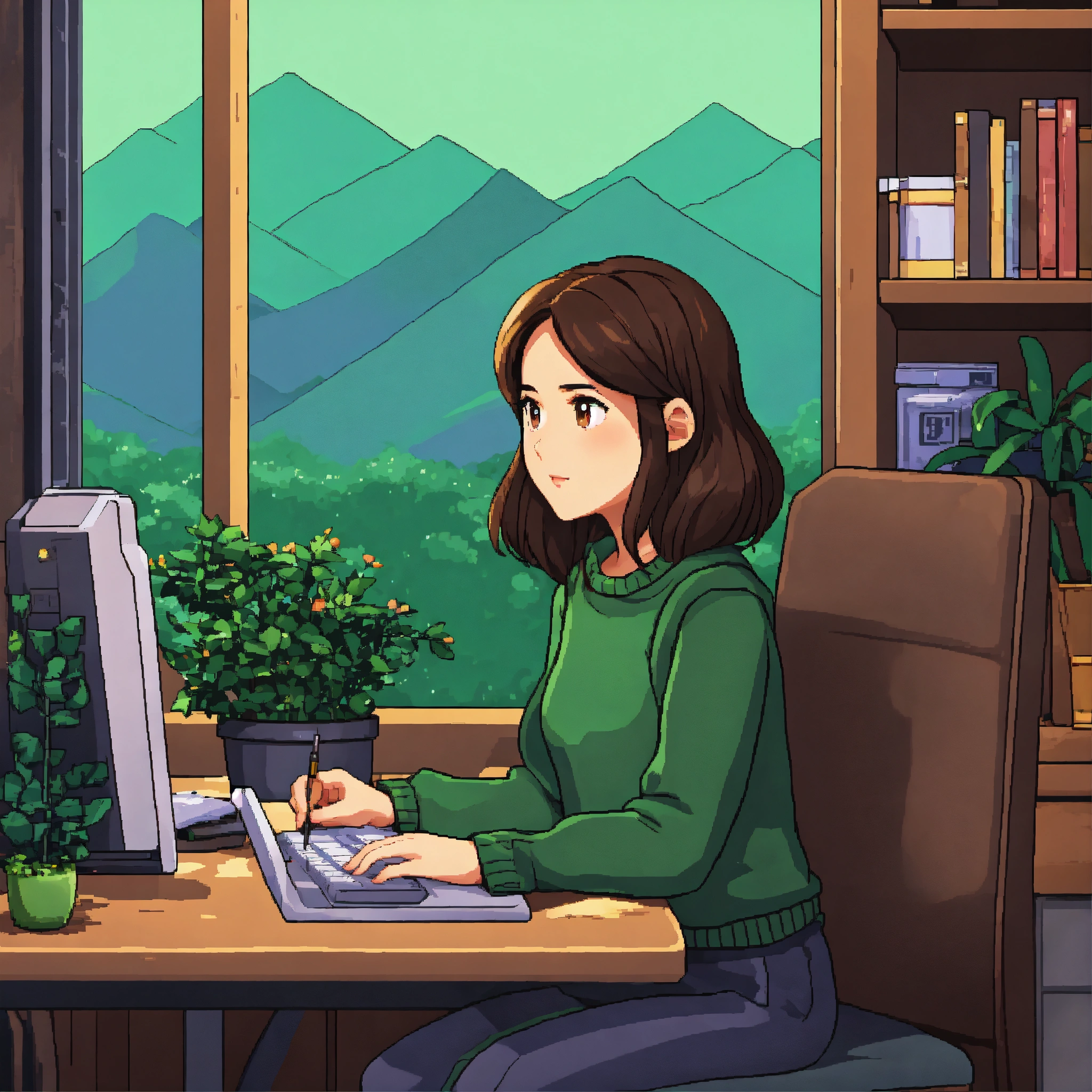 Asian girl with dark brown hair and hazel eyes wearing green sweater, working at desk, desk has plants, pixel art 64 bit, stardew valley style, mountains in the backround