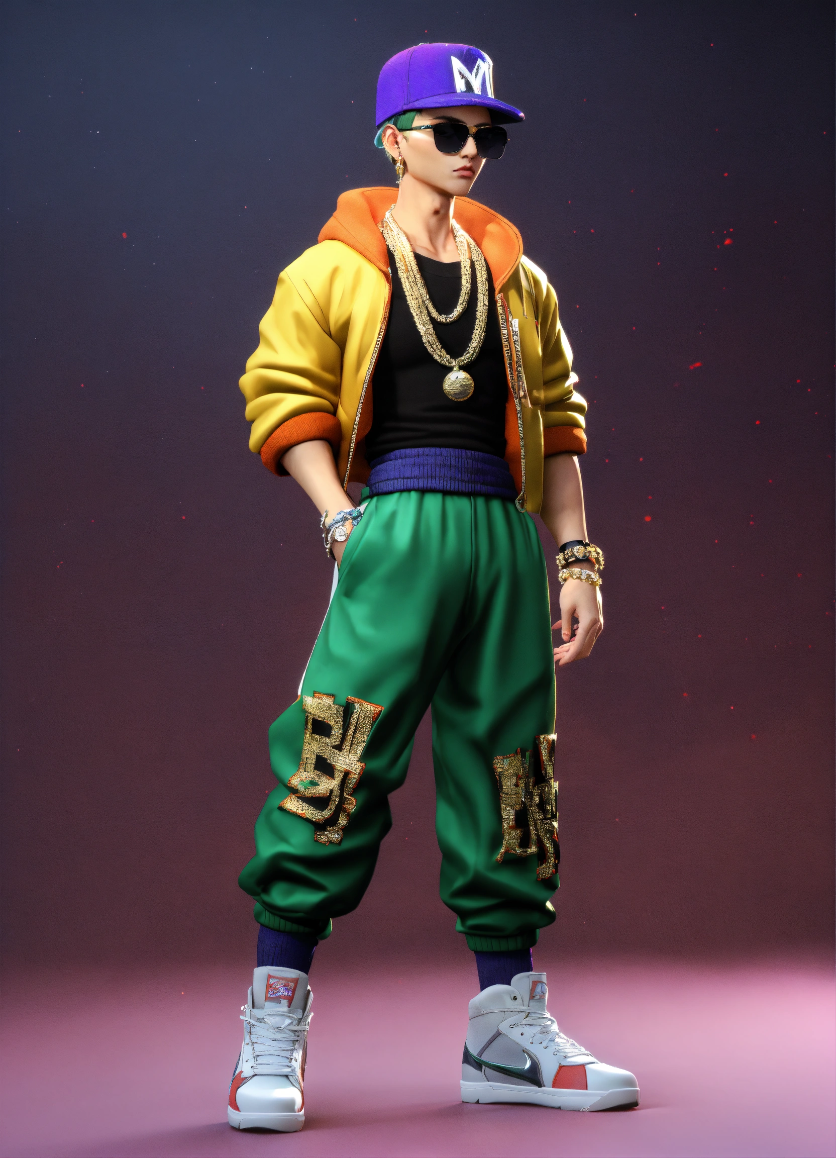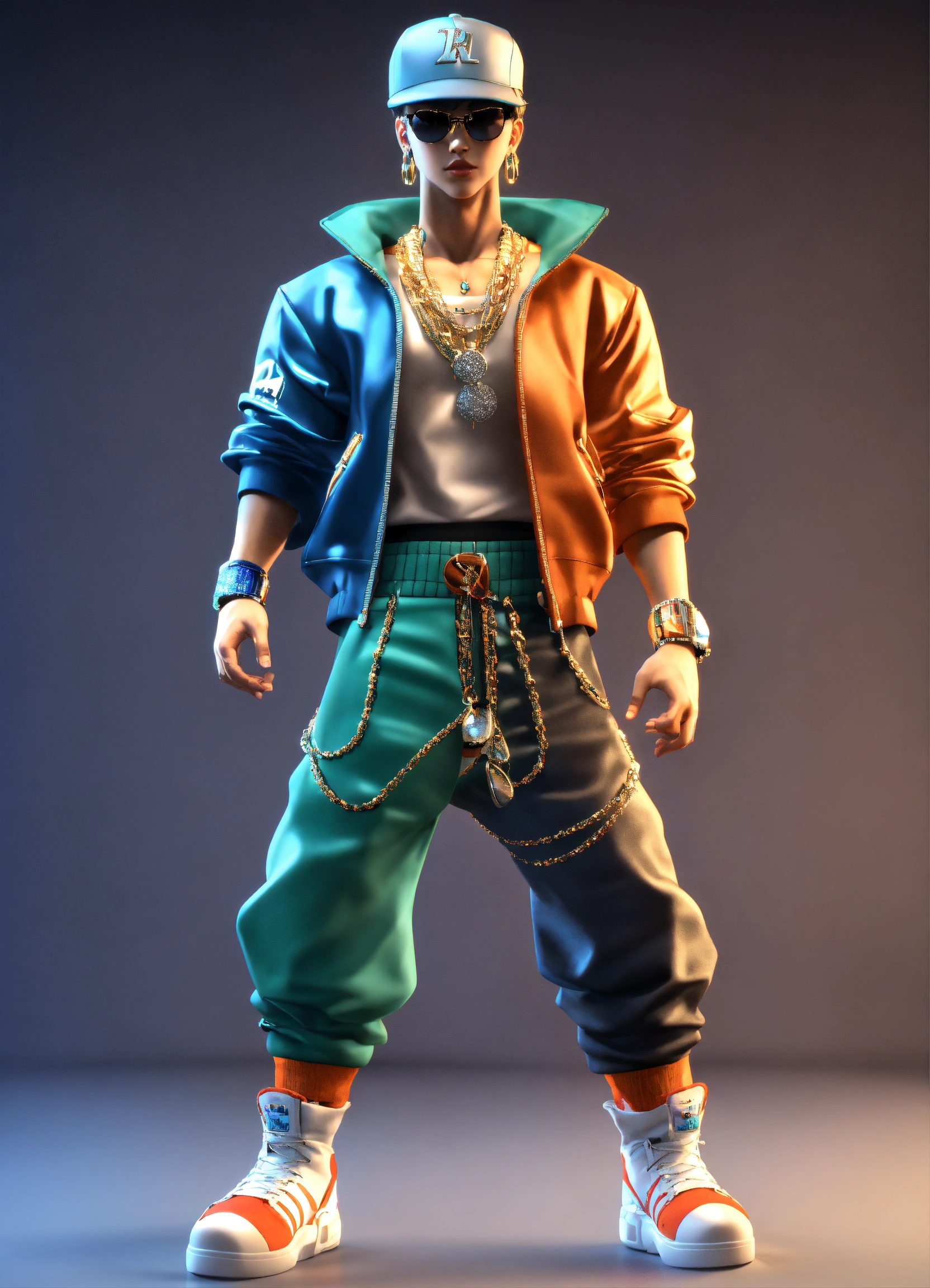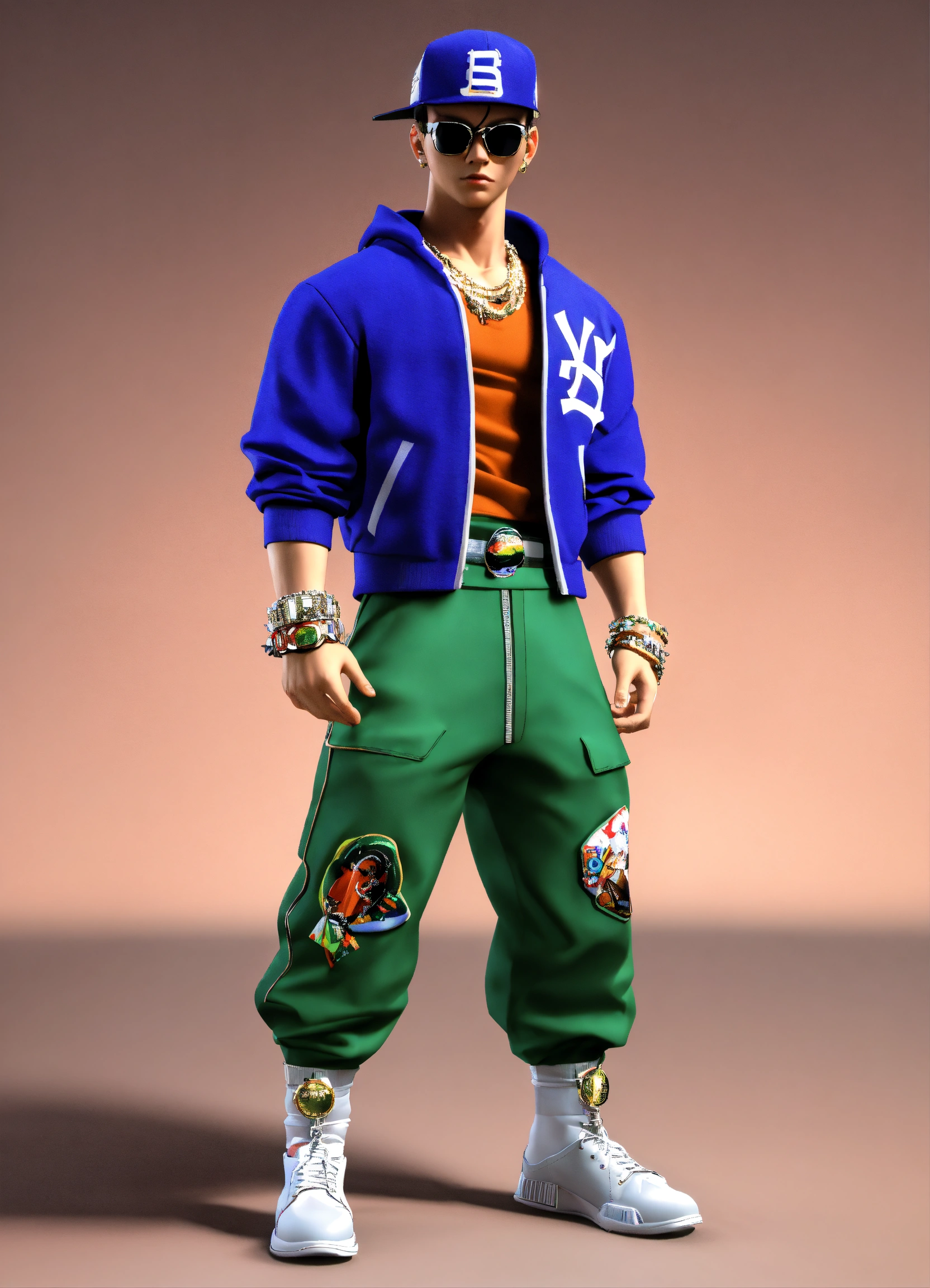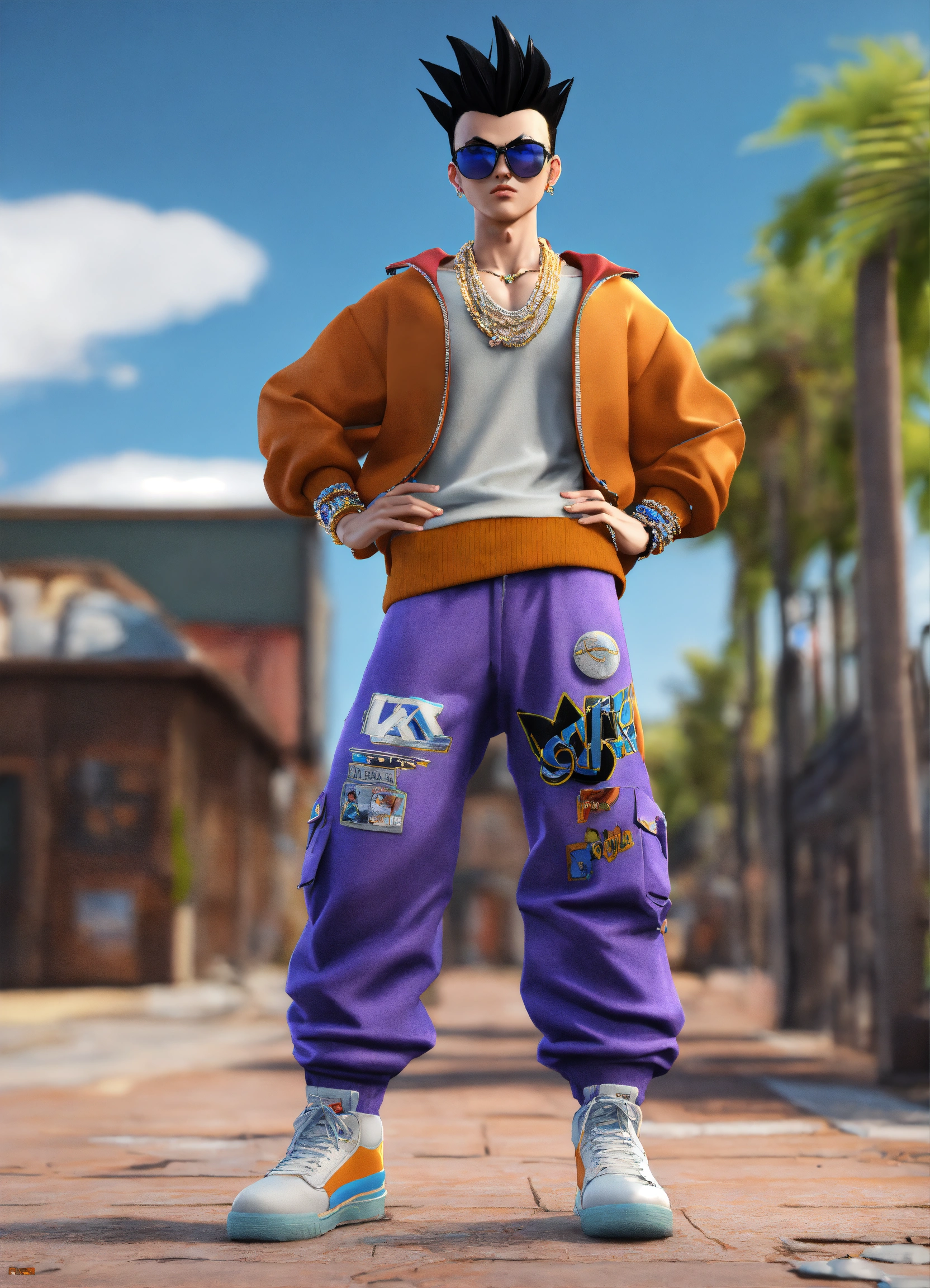 3d model, gohan dressed in trendy hip-hop attire, complete with baggy pants, a baseball cap, and bling jewelry, sunglasses, 8k, hd
