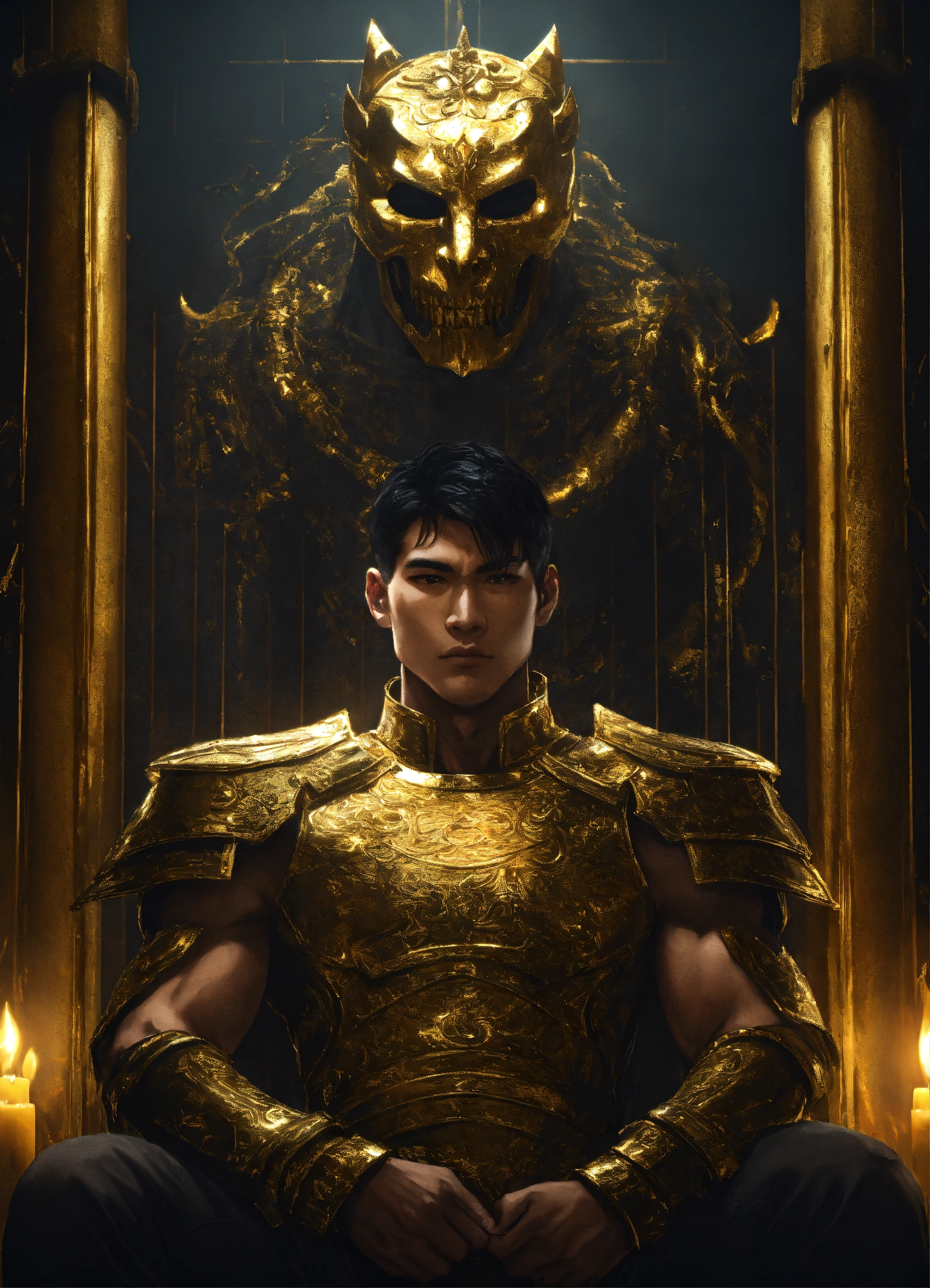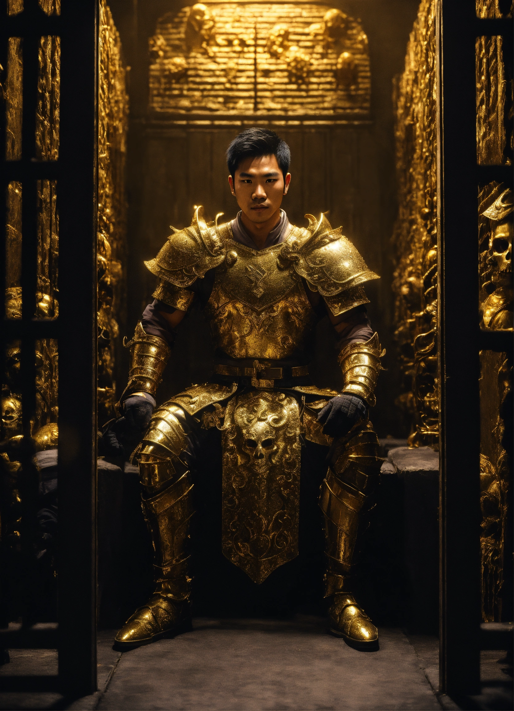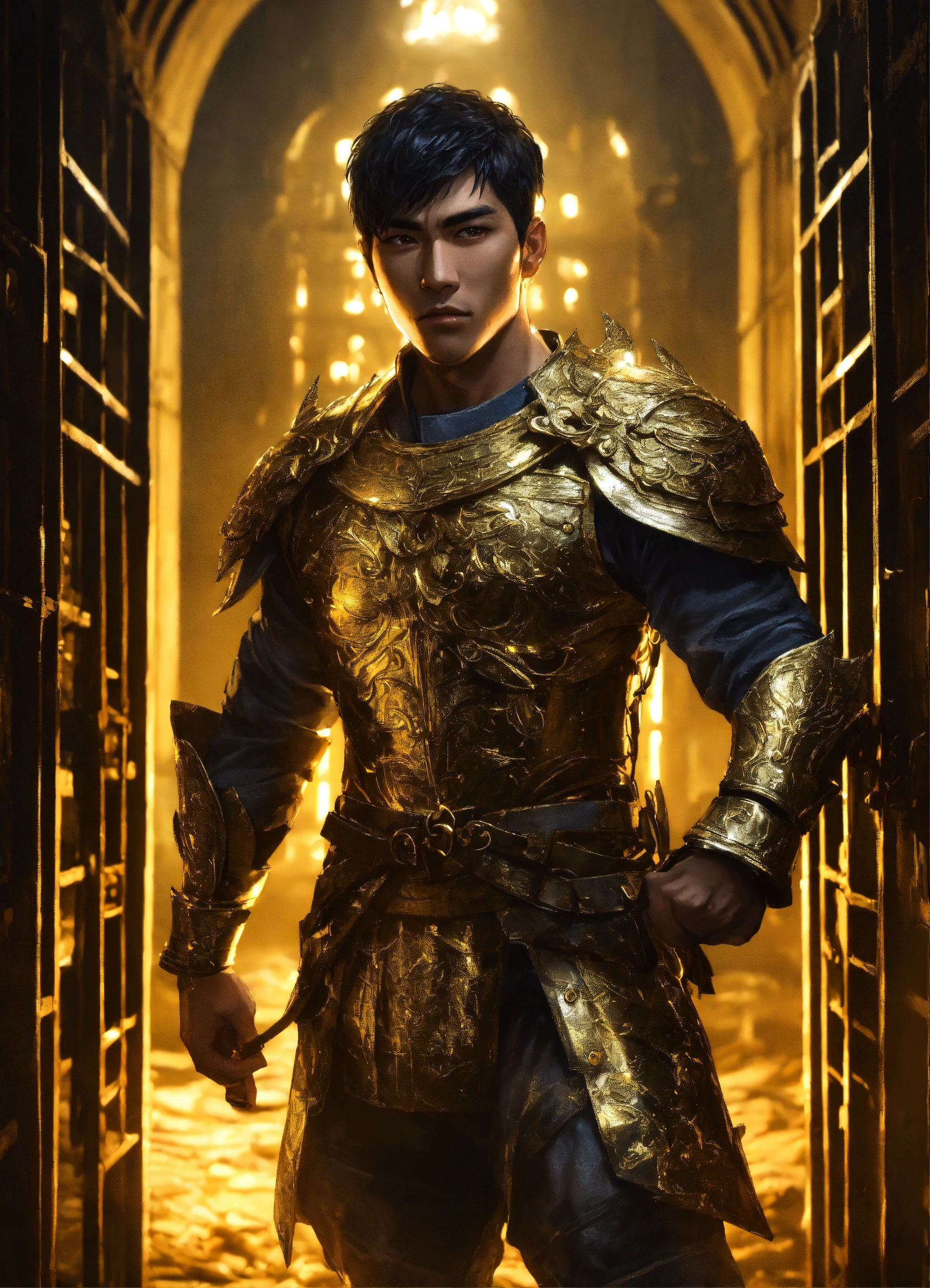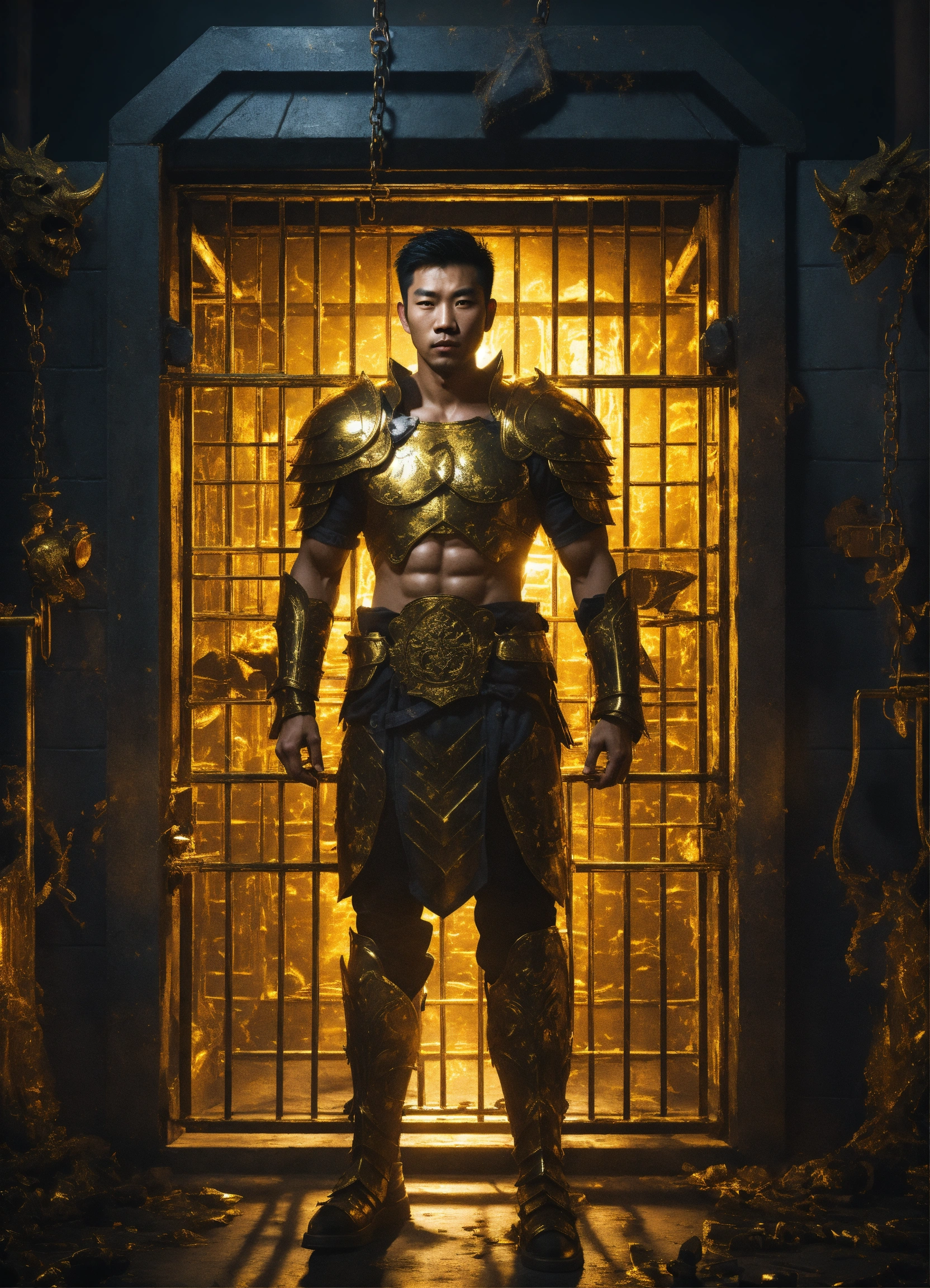 Handcuffed, a handsome asian male god, a strong prisoner with short dark hair, wearing the remains of gold armor, held captive in a spooky dark cell with monstrous guards in the backgroundl, resolution 8k, insanely detailed