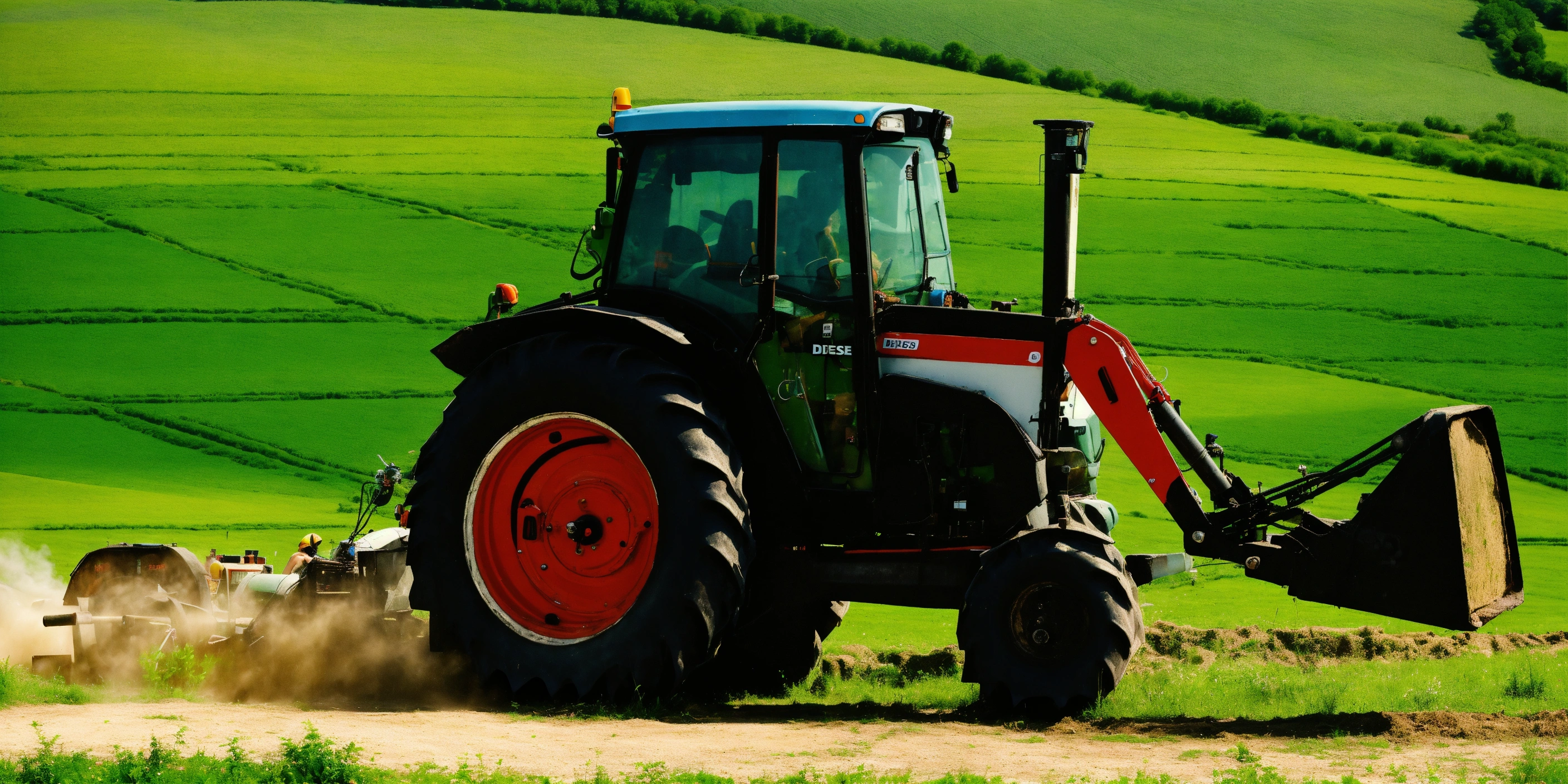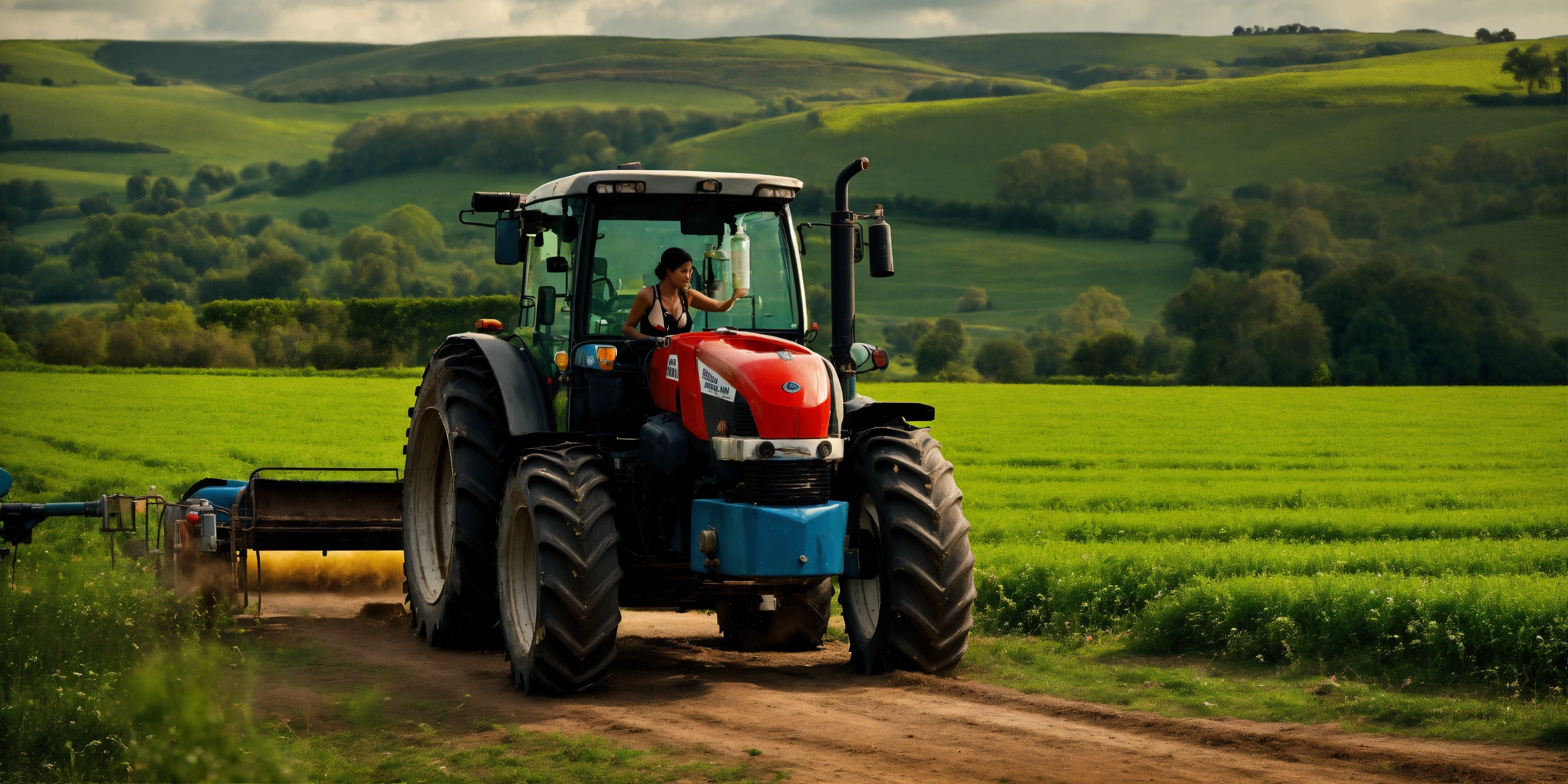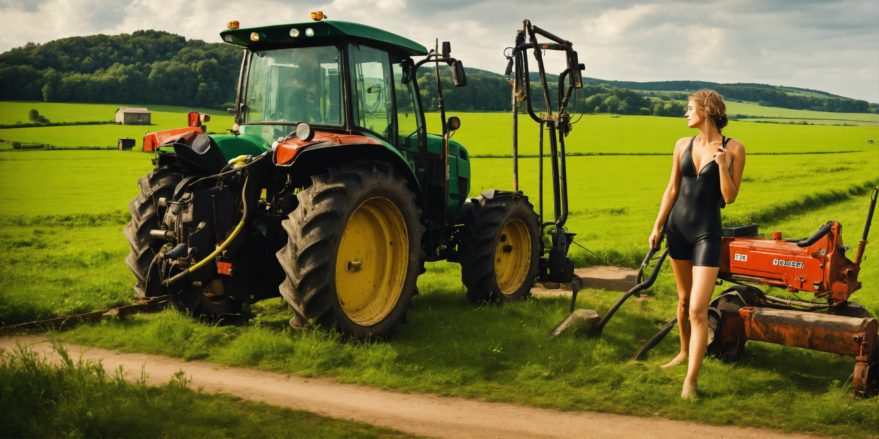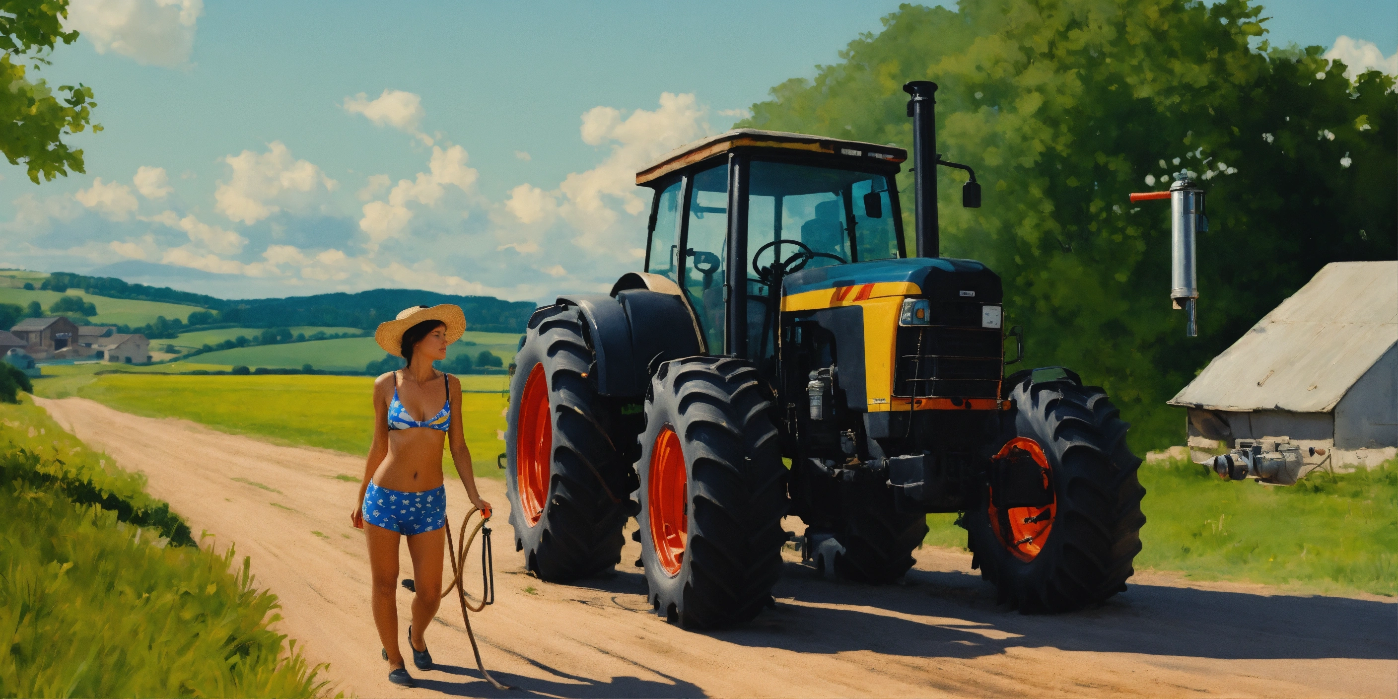 Depict a woman in a black swimsuit discreetly extracting diesel from a tractor’s tank in the countryside