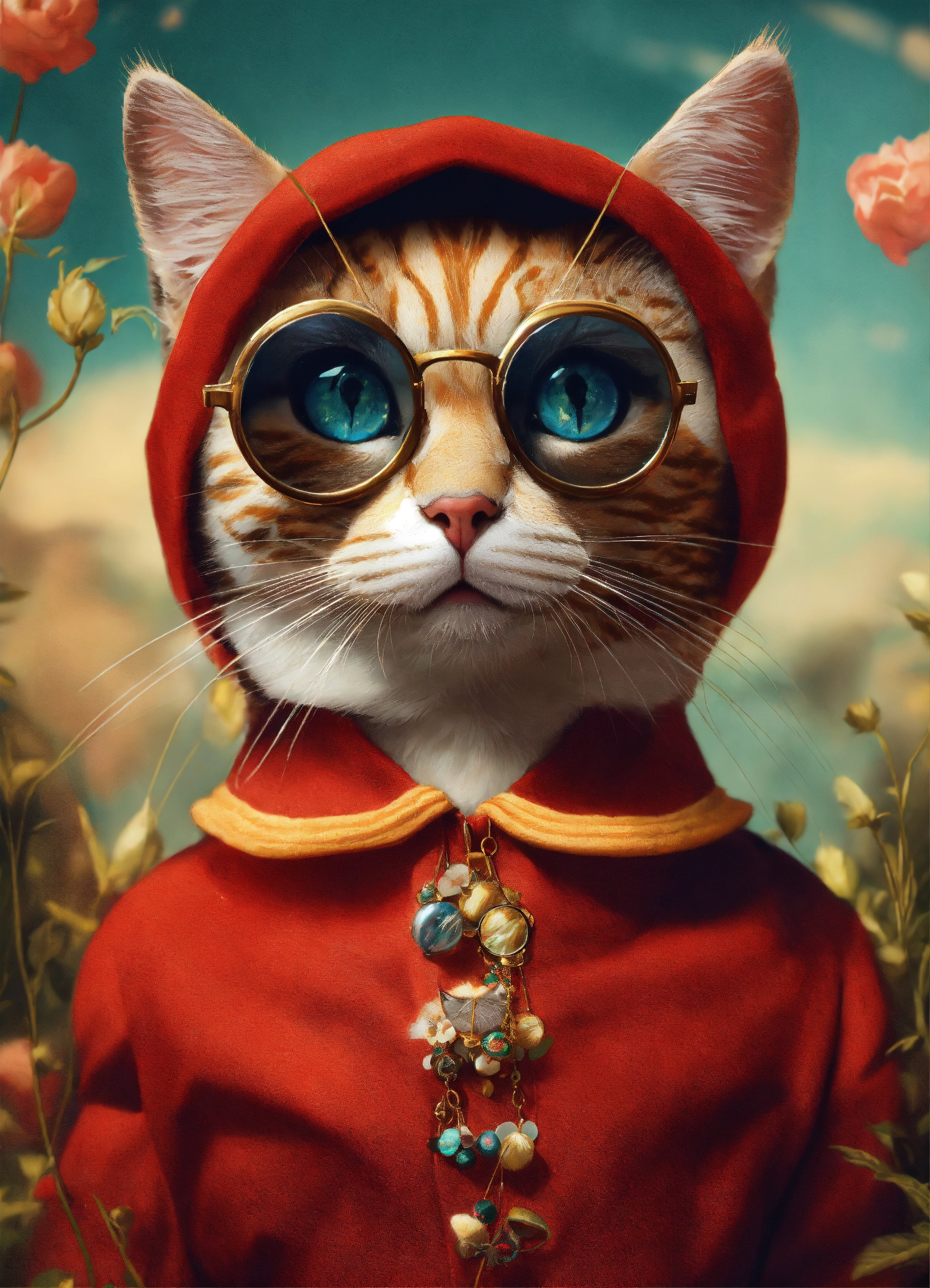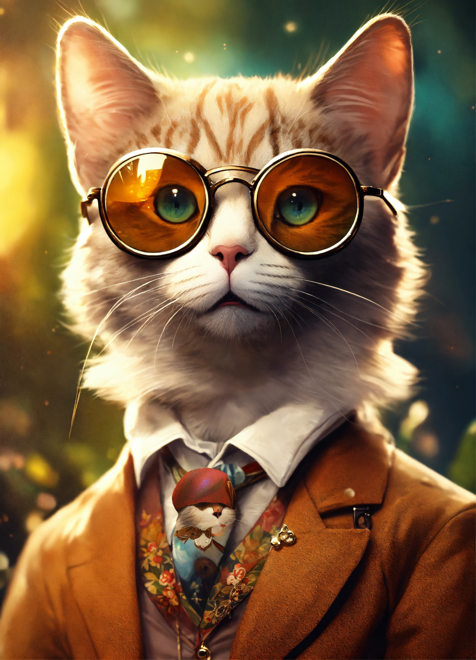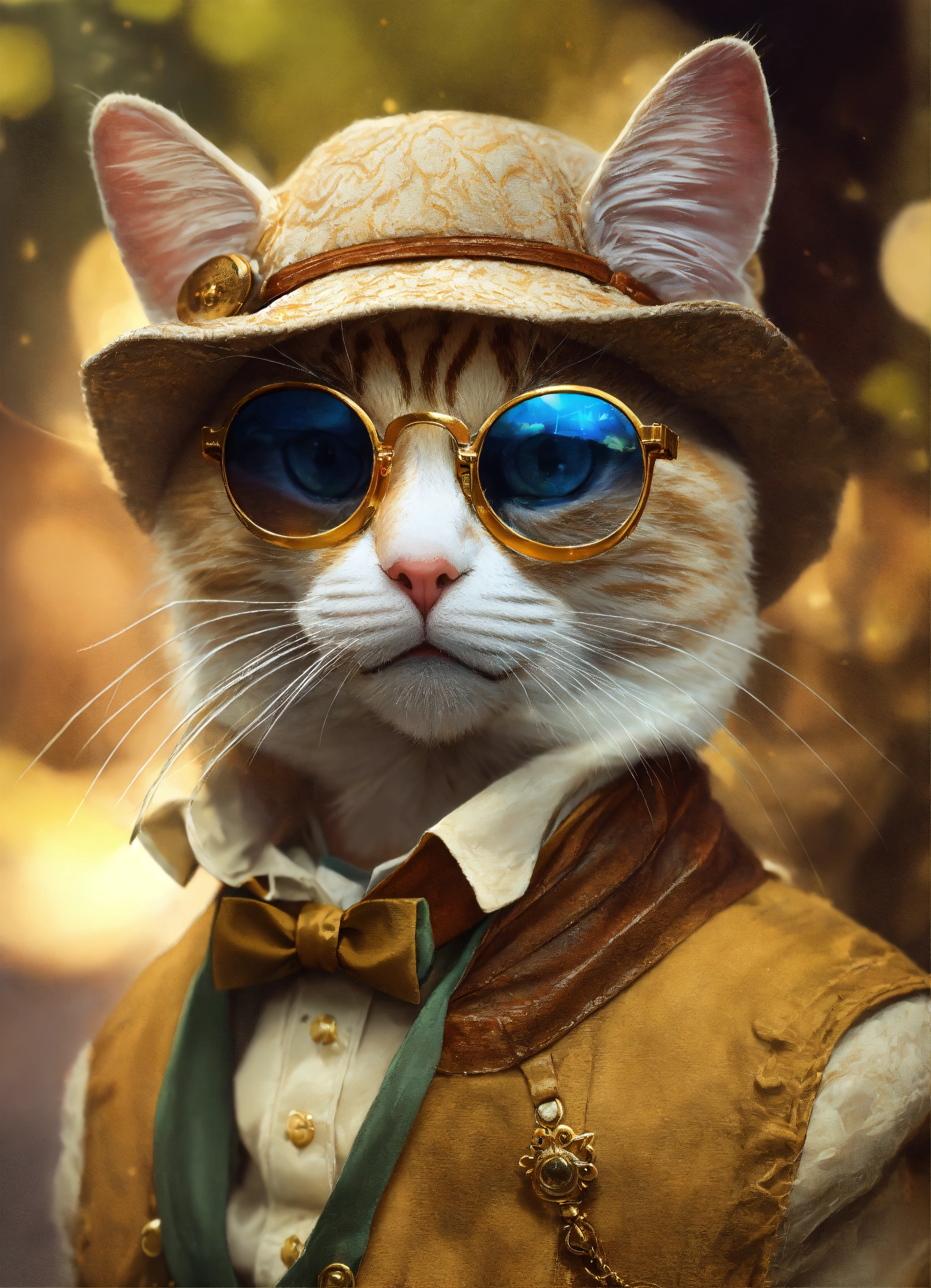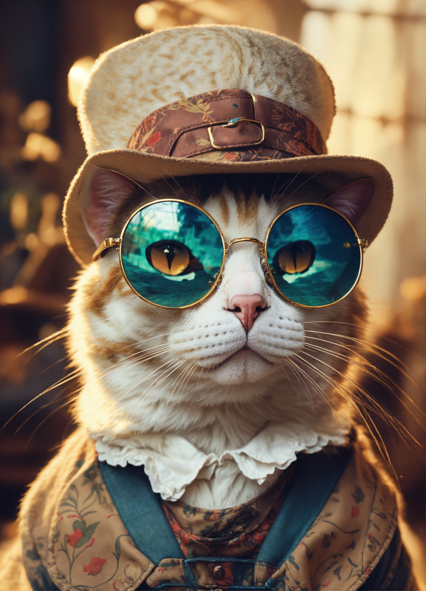 Full-bodied portrait, cute and adorable cat wearing vintage clothes sunglasses, fantasy, dreamlike, surrealism, super cute, trending on artstation, high definition