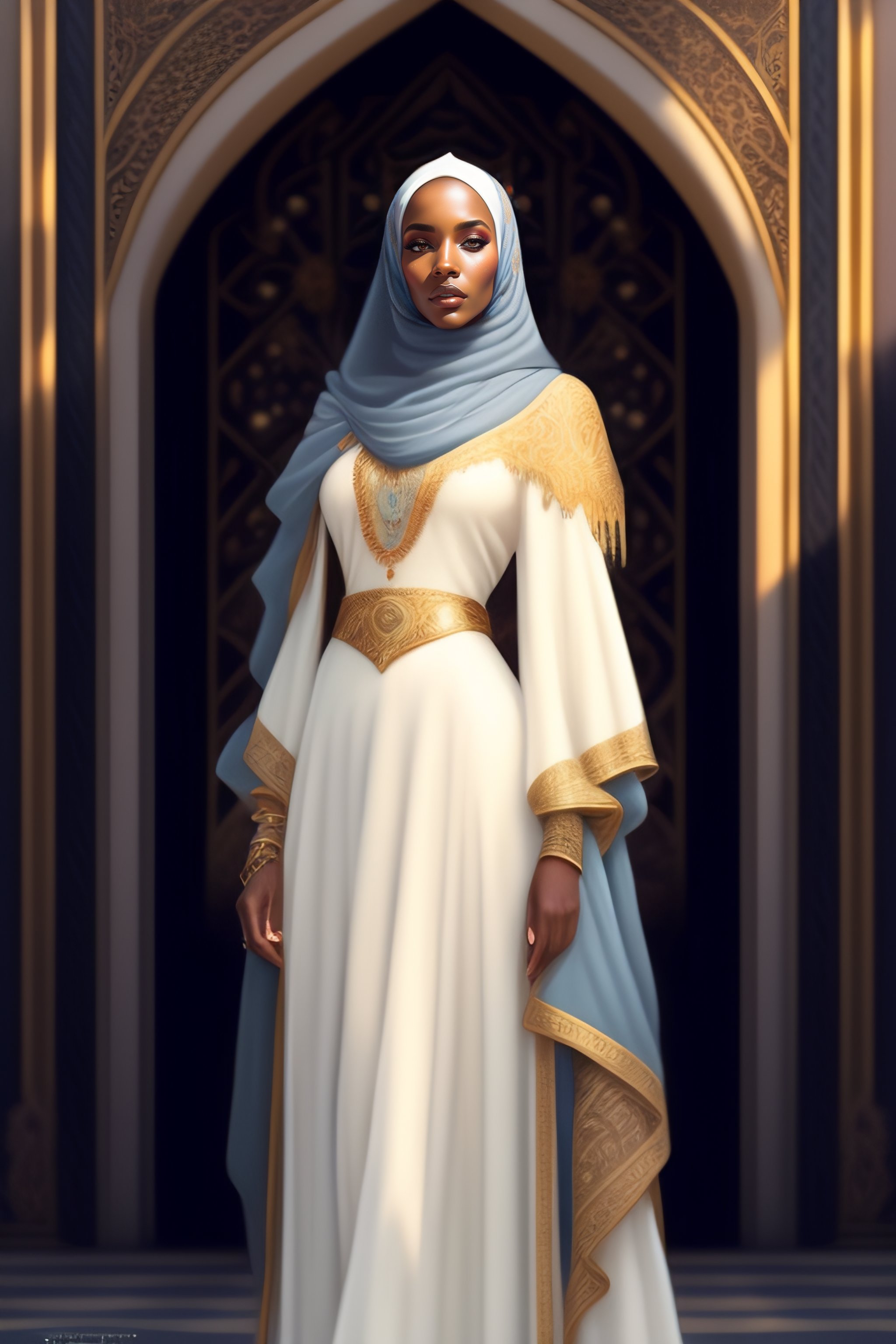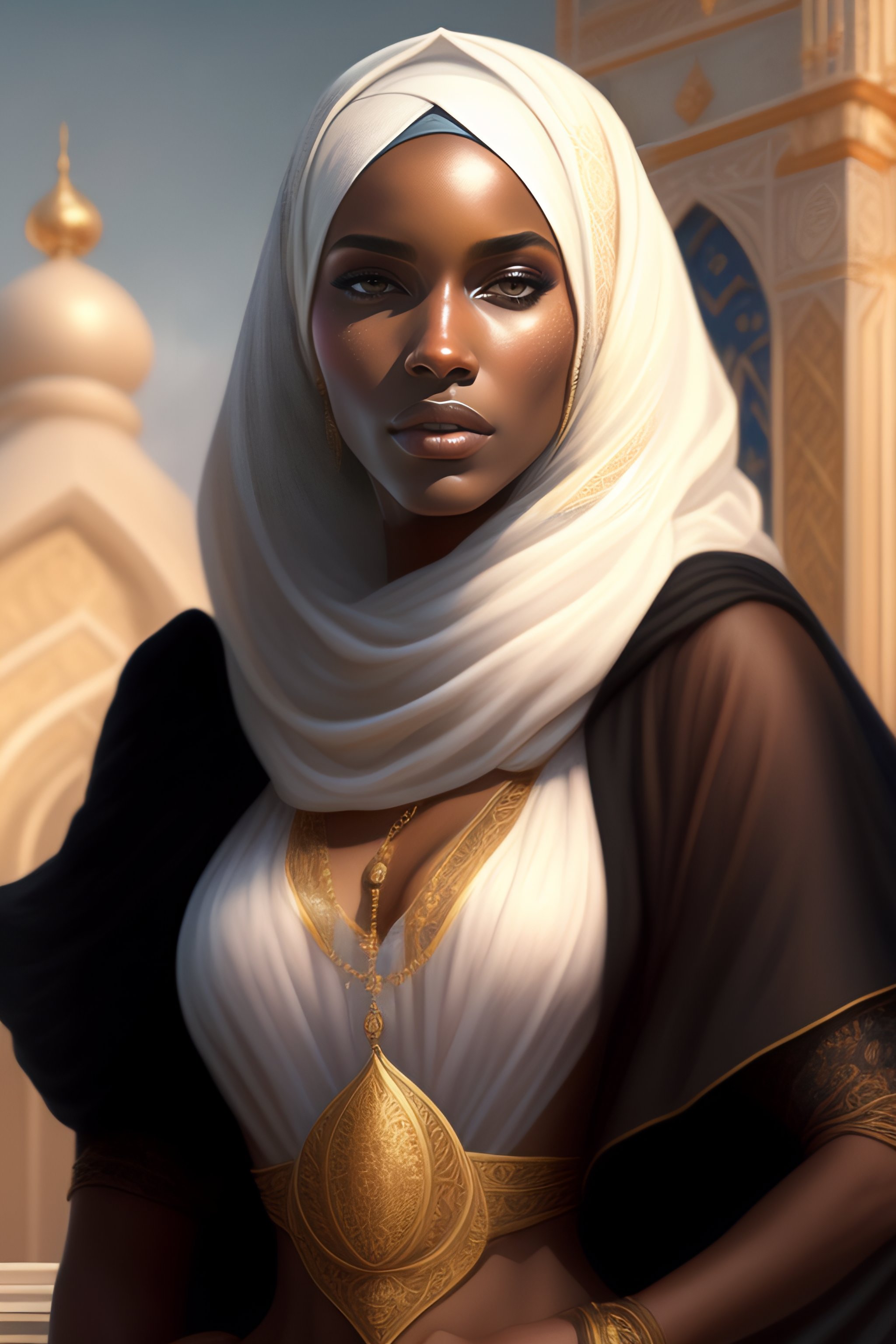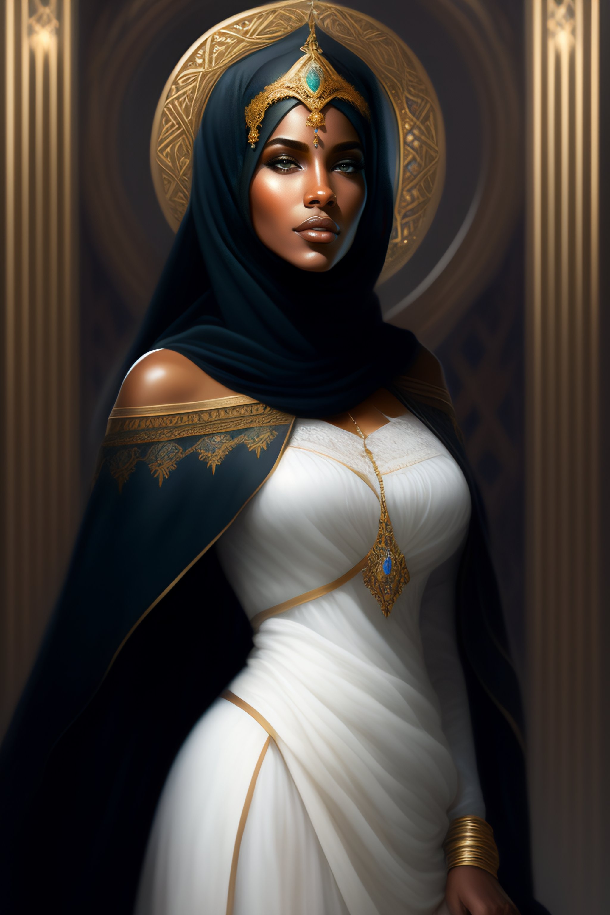 A full body portrait of the angella white wearing hijab on a hot day, gothic, highly detailed, digital painting, crown of skulls, artstation, smooth, sharp focus, illustration, art by artgerm and greg rutkowski and alphonse mucha and william - adolphe bouguereau
