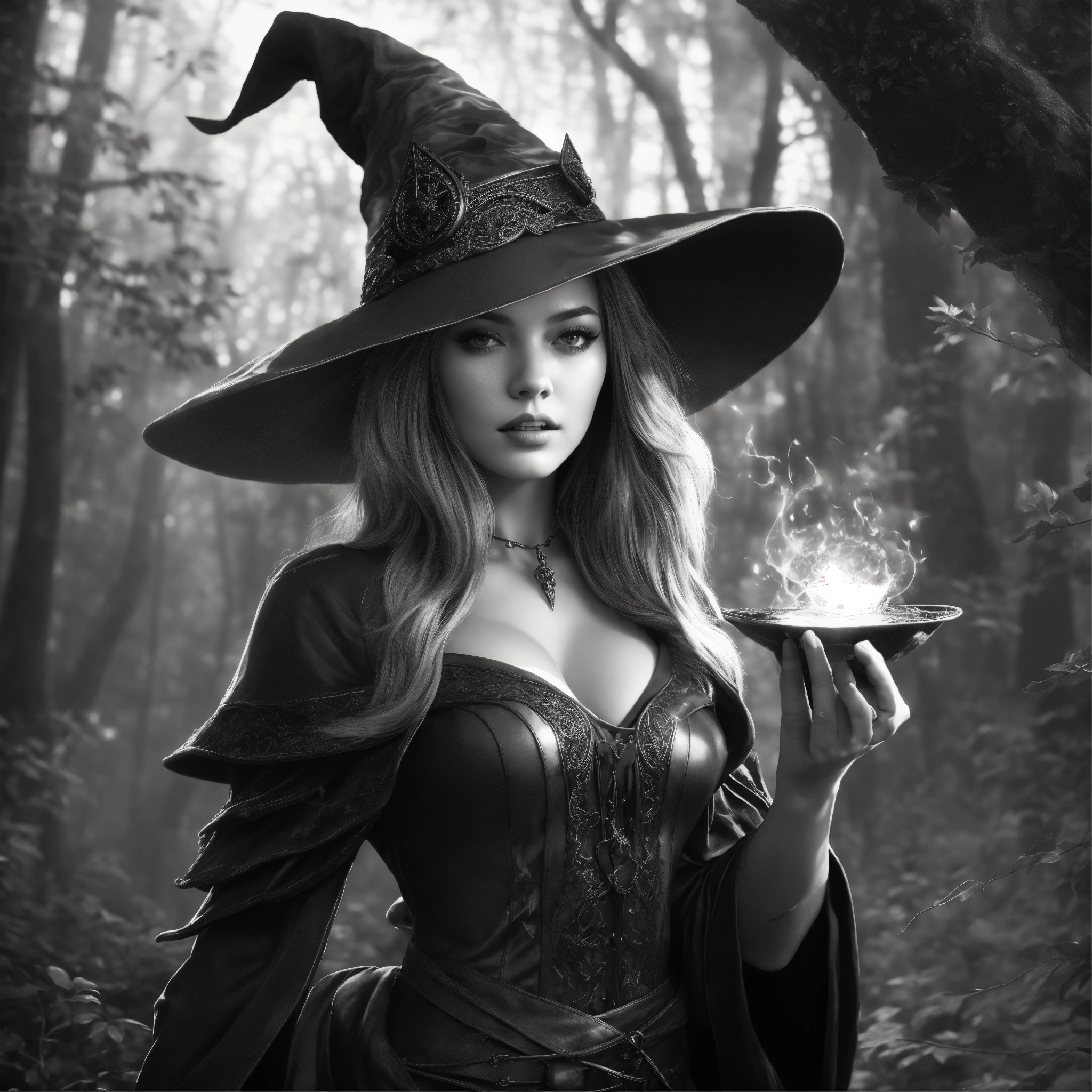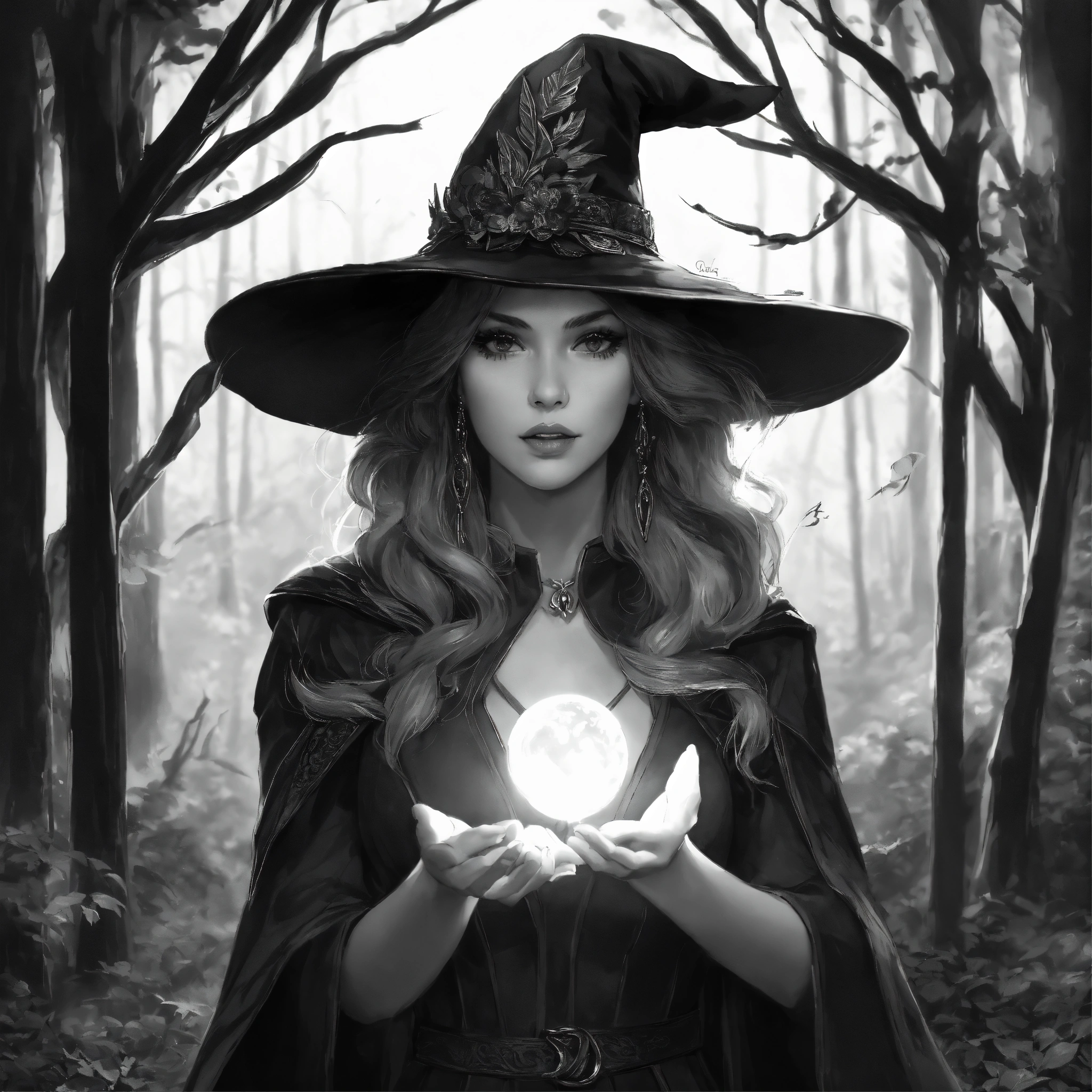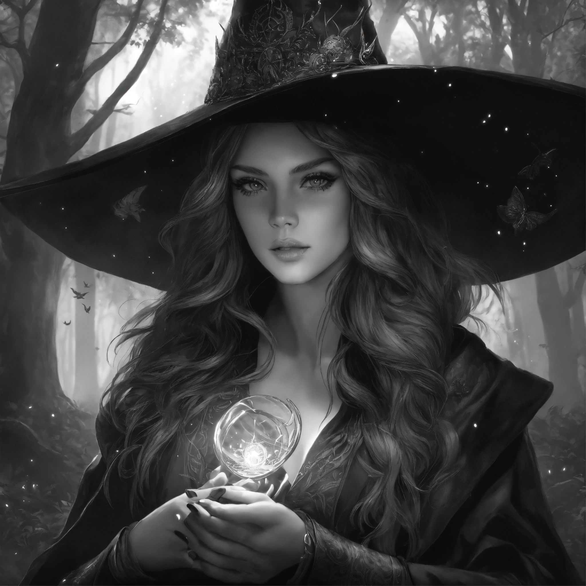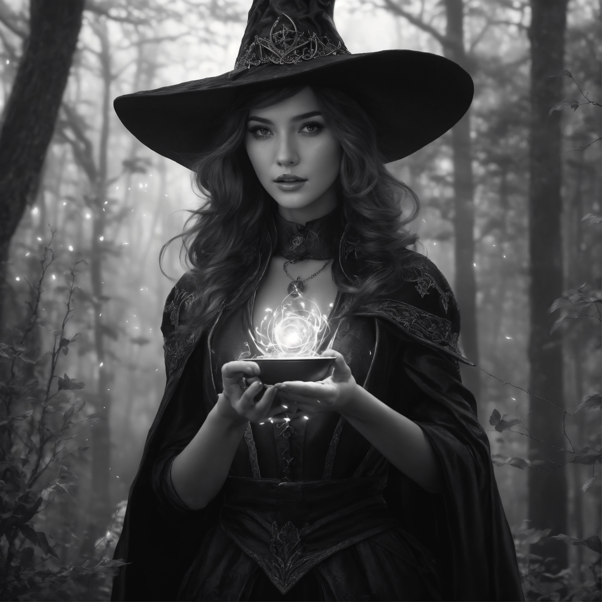 Blackandwhite artgerm, young beautiful witch with a peaky witch hat, doing magic with her hands, wizzarding, fantasy, echanted forest, intricate details, 8k, q2