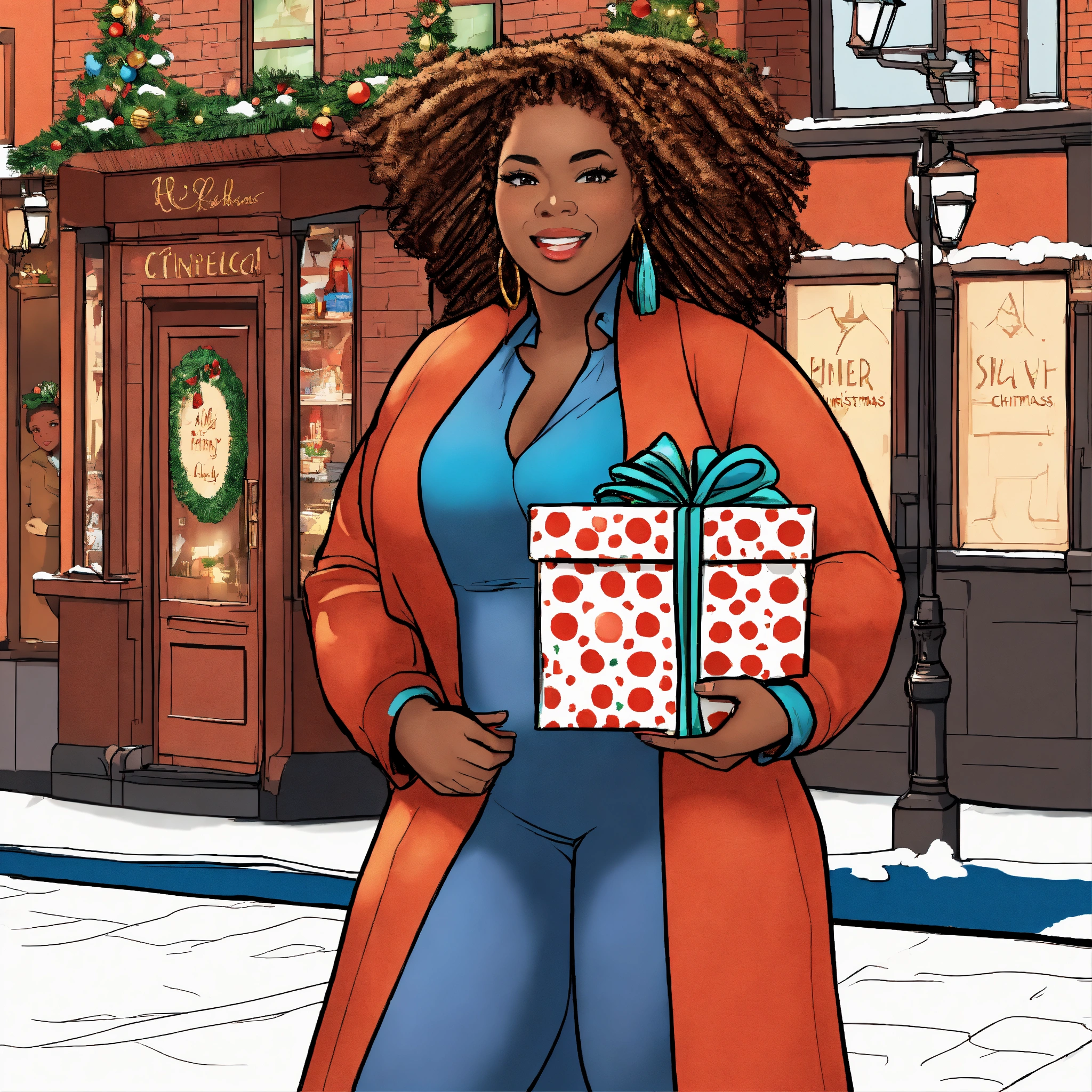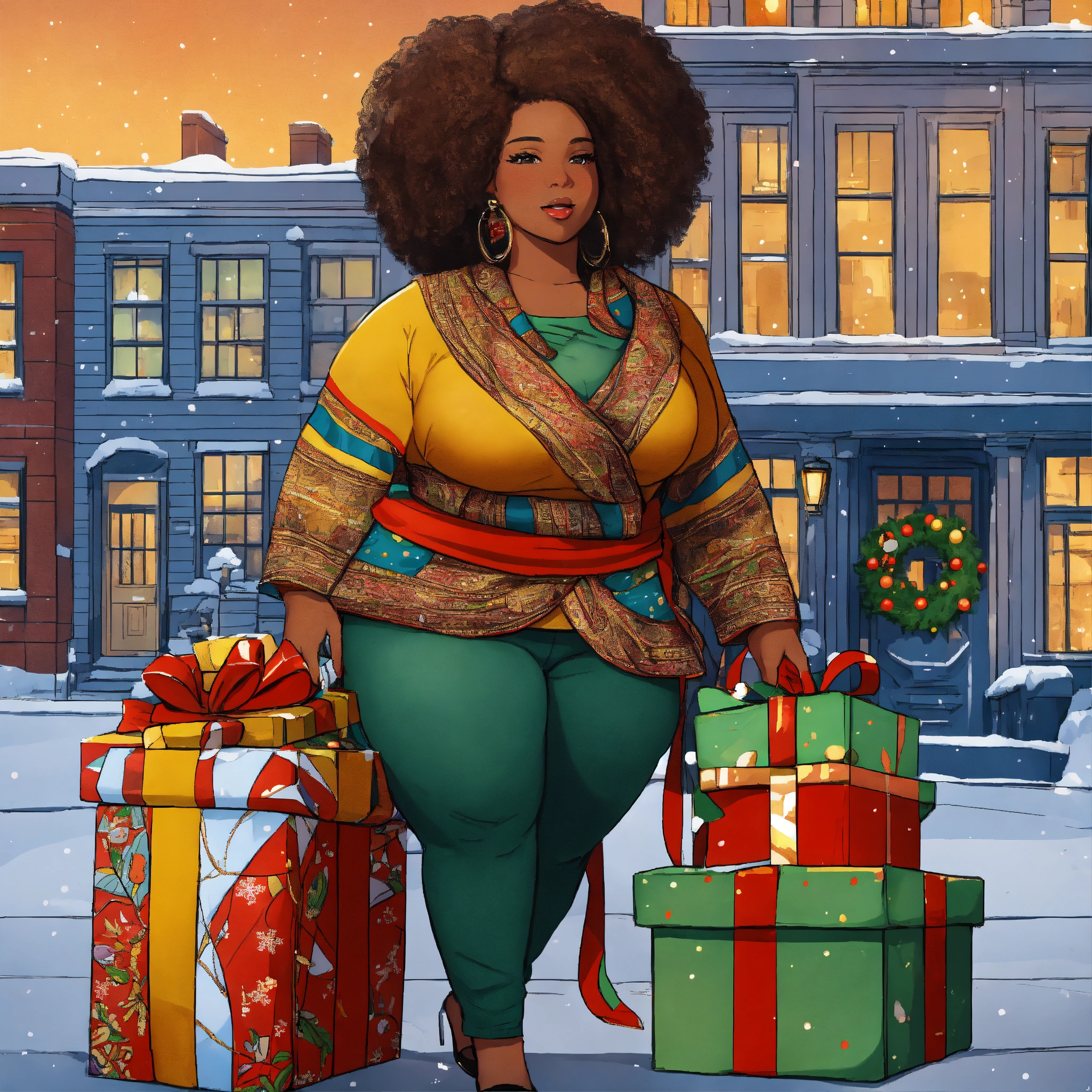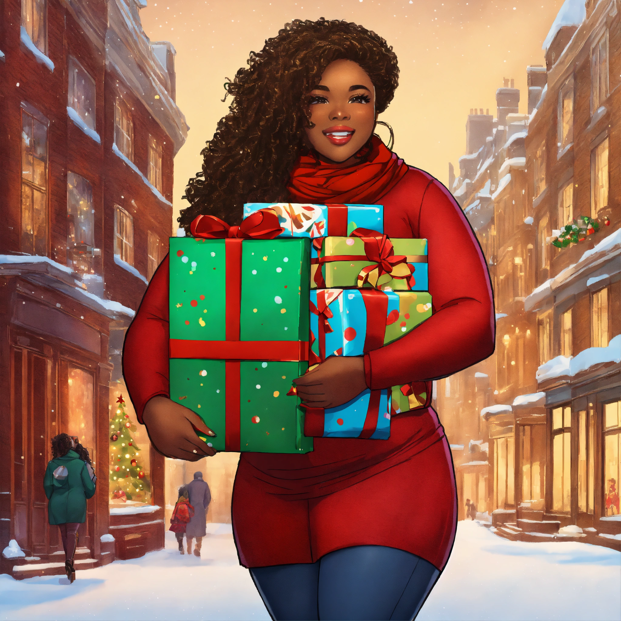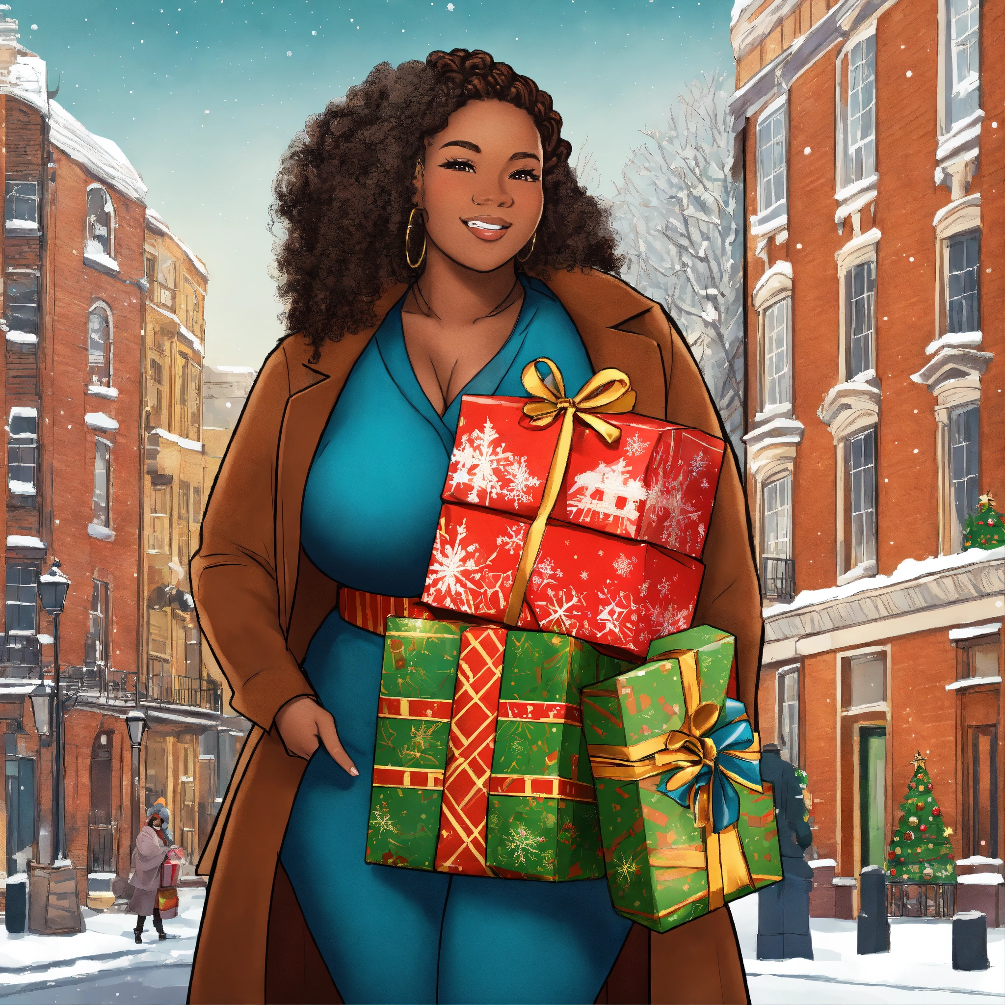 African american west african features fully clothed well proportioned full figured woman carrying a stack of wrapped presents, realistic healthy glossy well defined loc’d hair texture, full body shot, london piccadilly winter christmas scene theme rule of thirds centered subject placement, storybook, cartoon, intricate detail line drawing, coloring book style, v3, 5