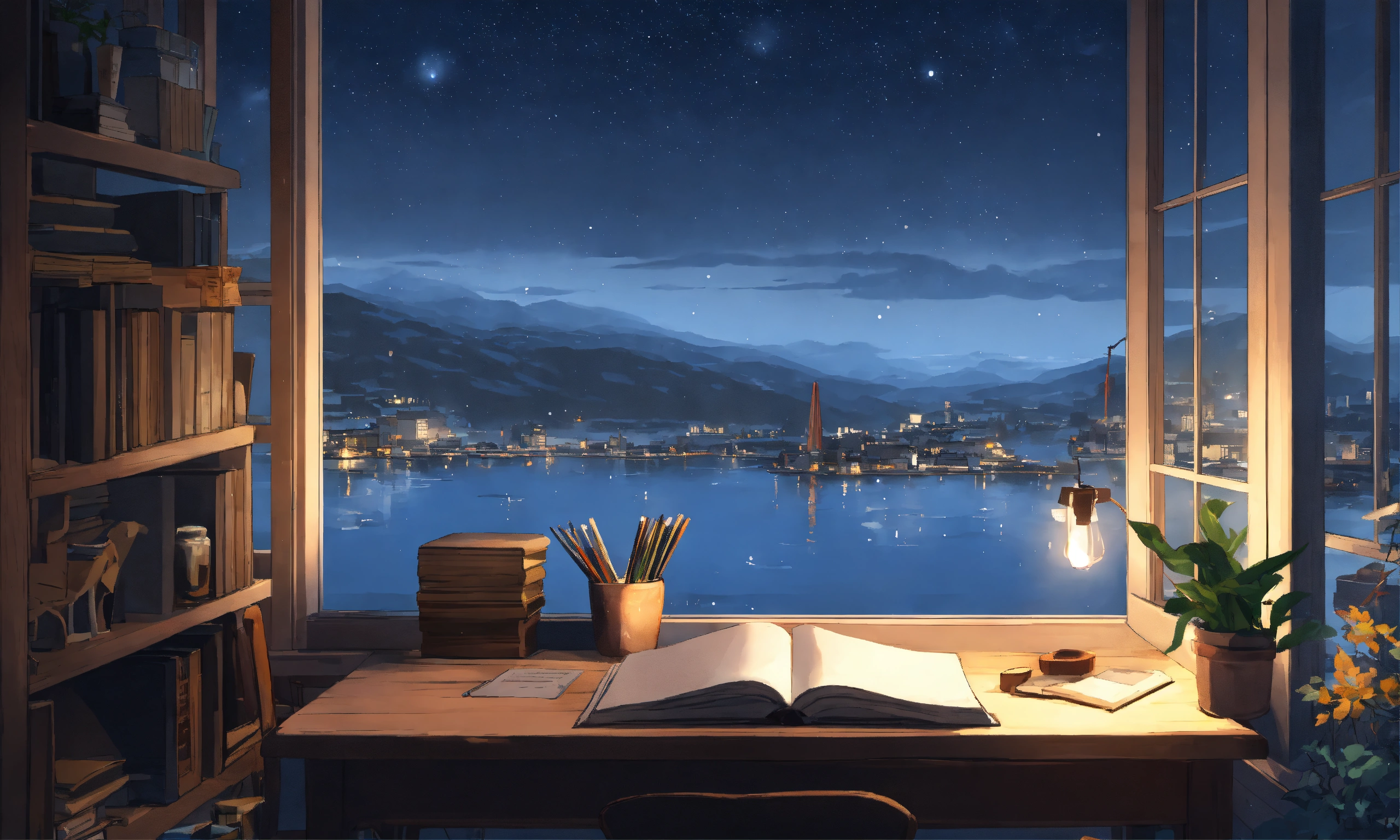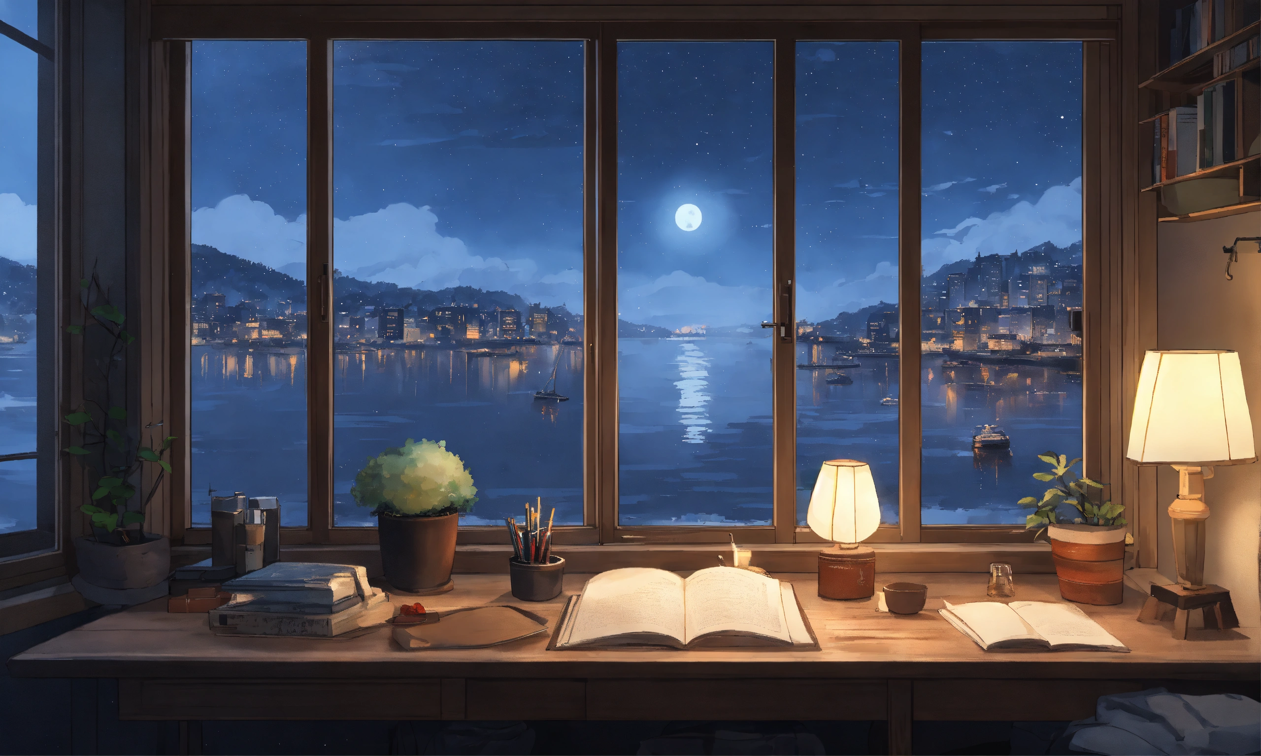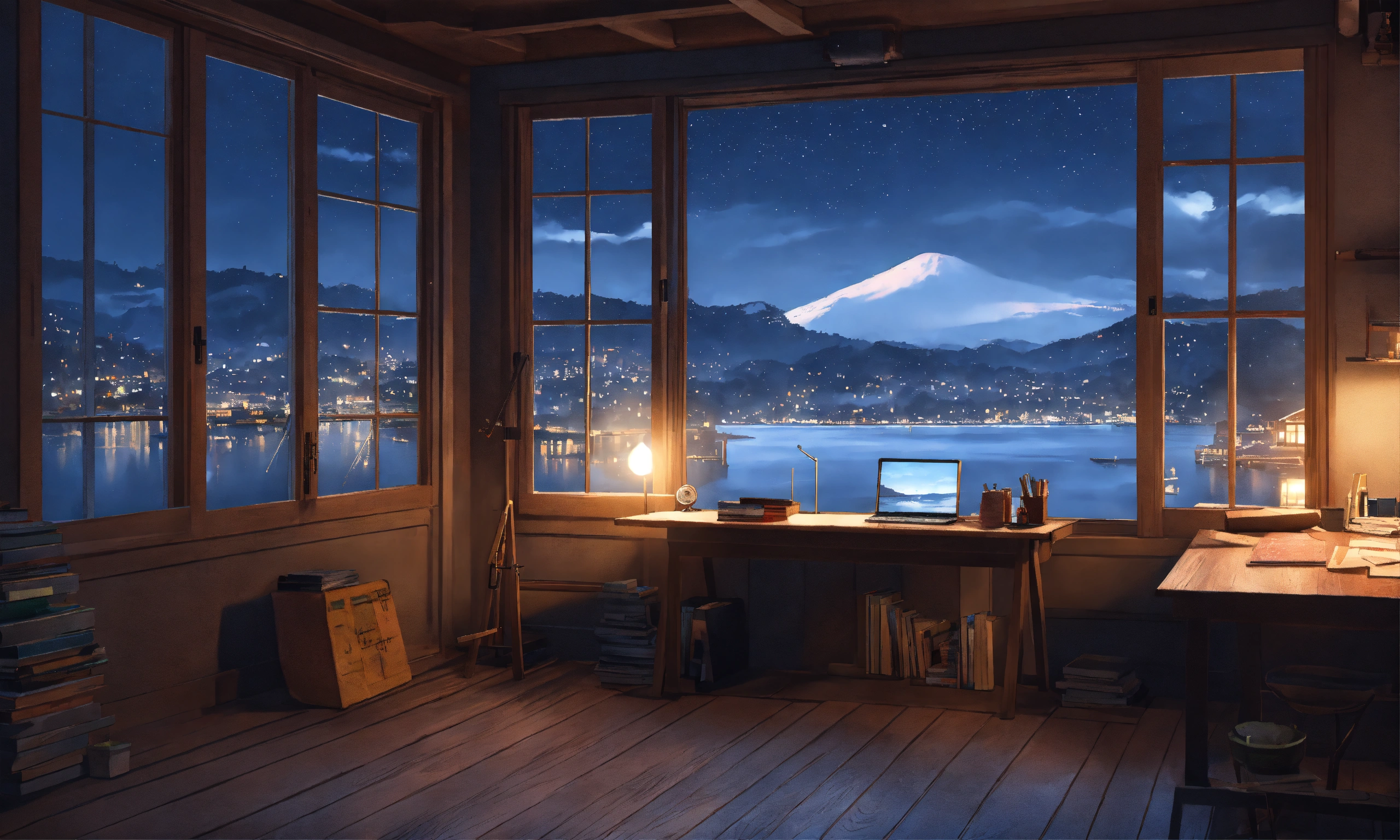 Cozy study room, studio ghibli, minimalistic, grey washed wooden colors, night sky, big centered window with view of harbour and lake with city buildings, snowing outside, winter night, anime/lofi style, minimalistic design
