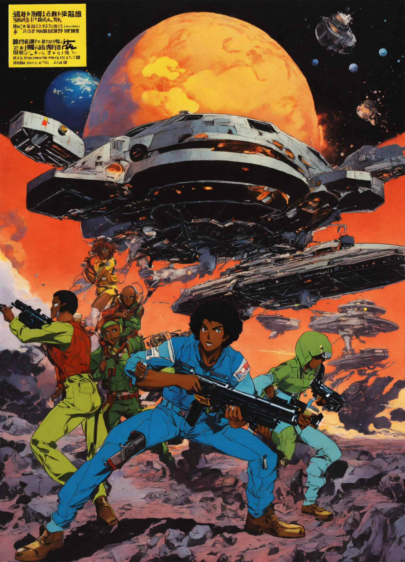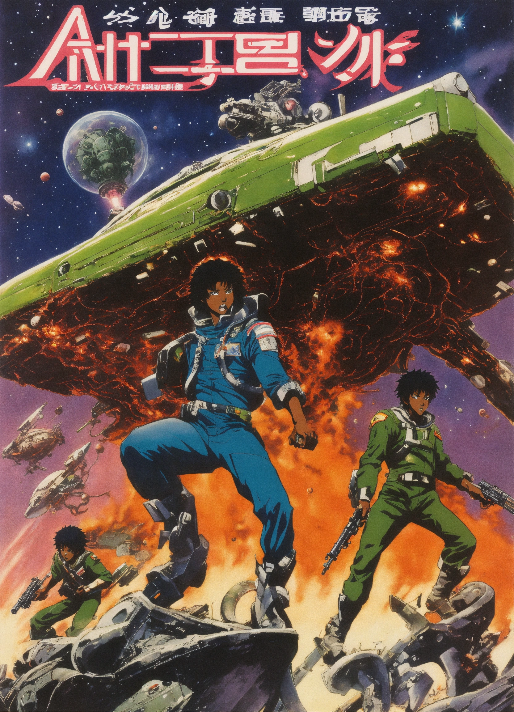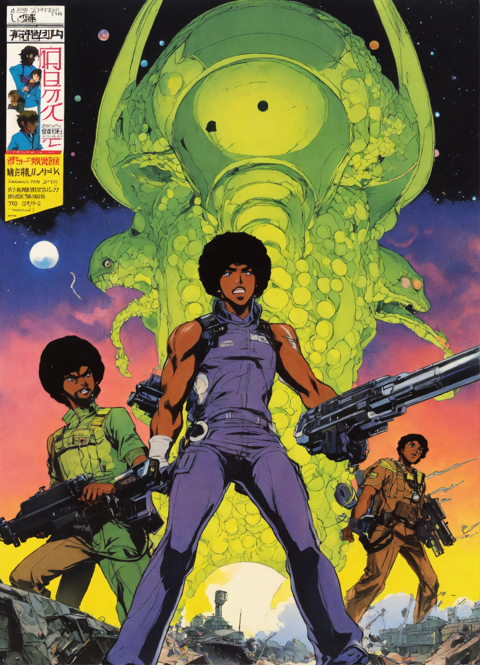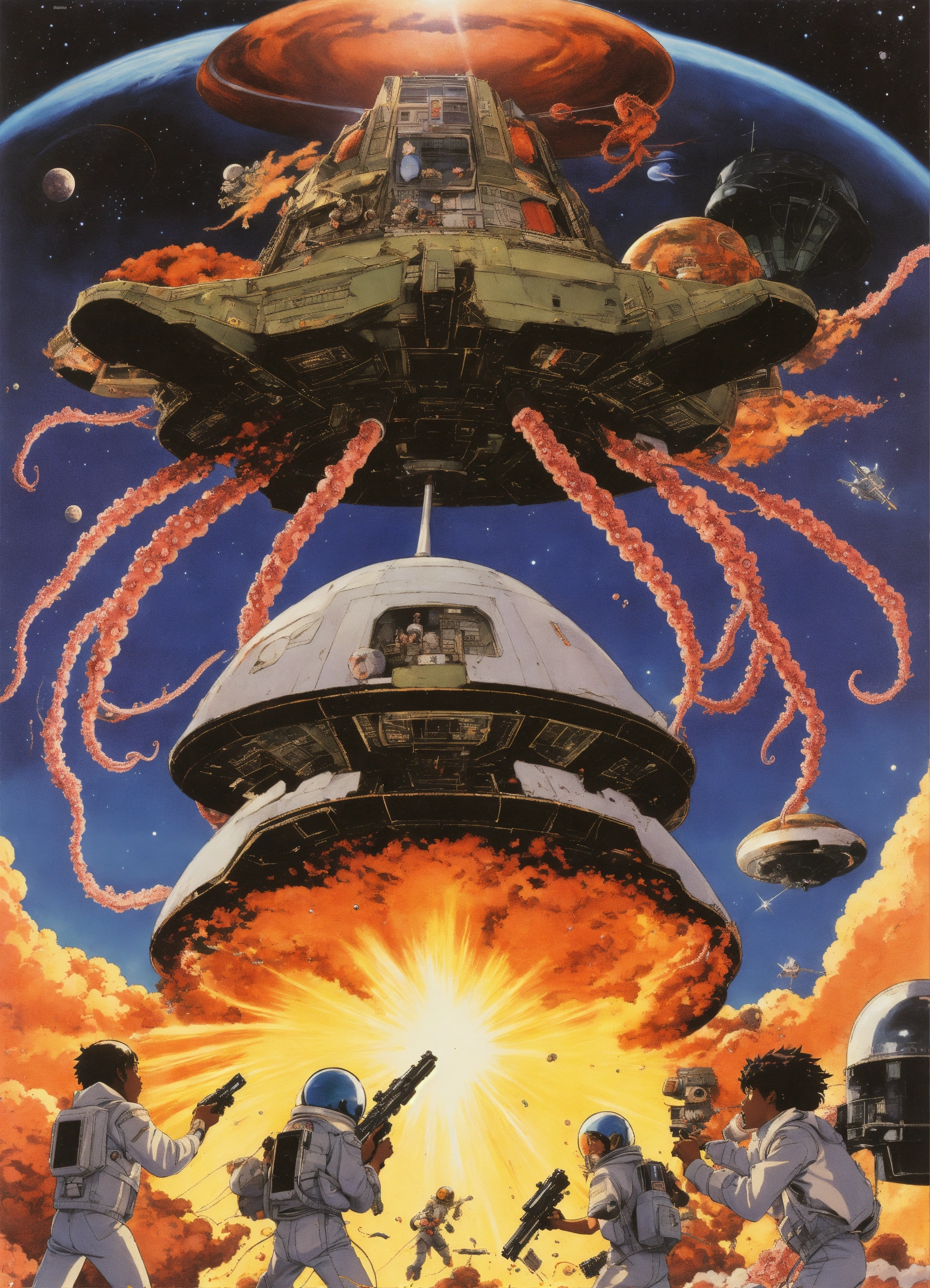 70s anime black characters fighting tentacled aliens with space guns on a damaged mothership manga cover