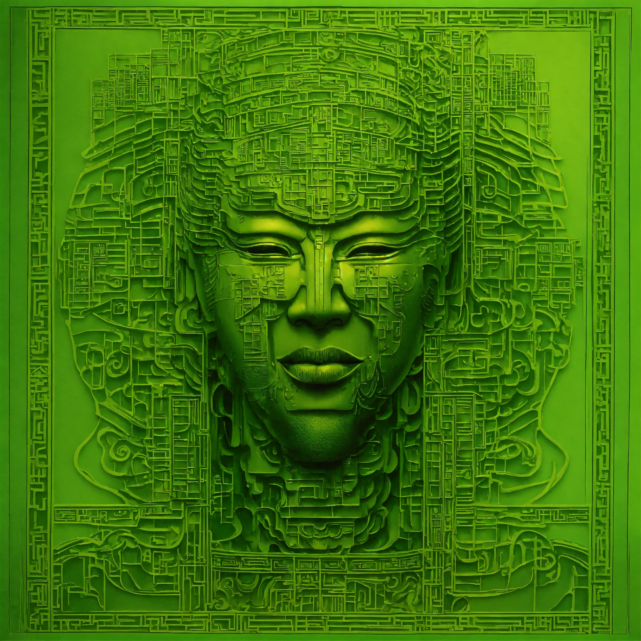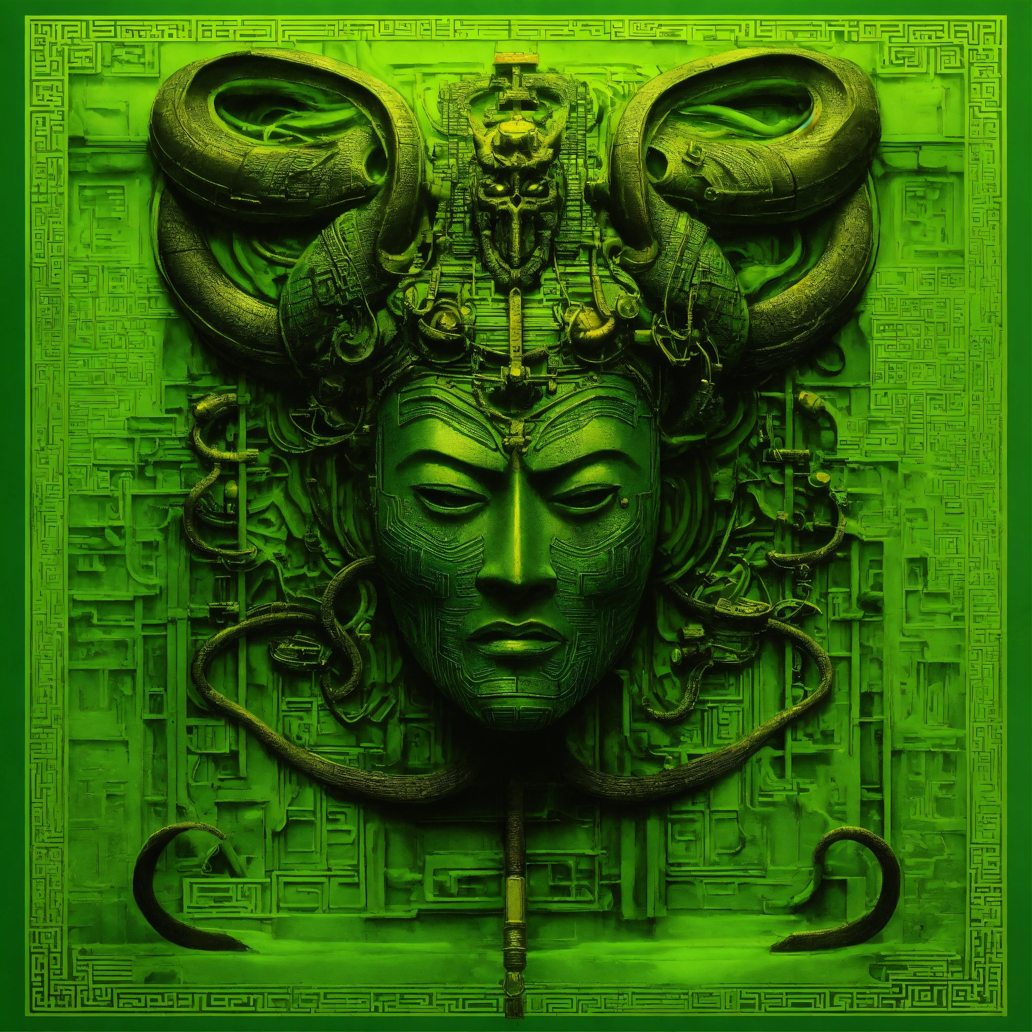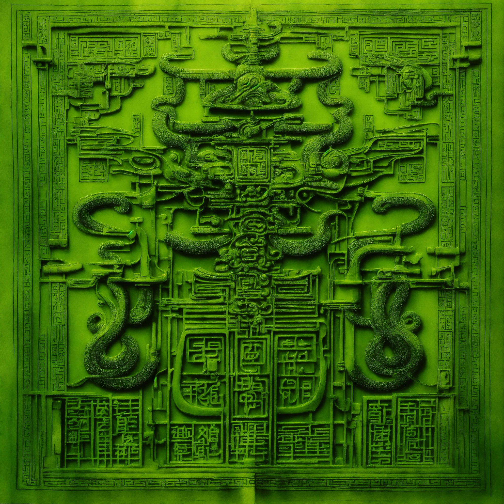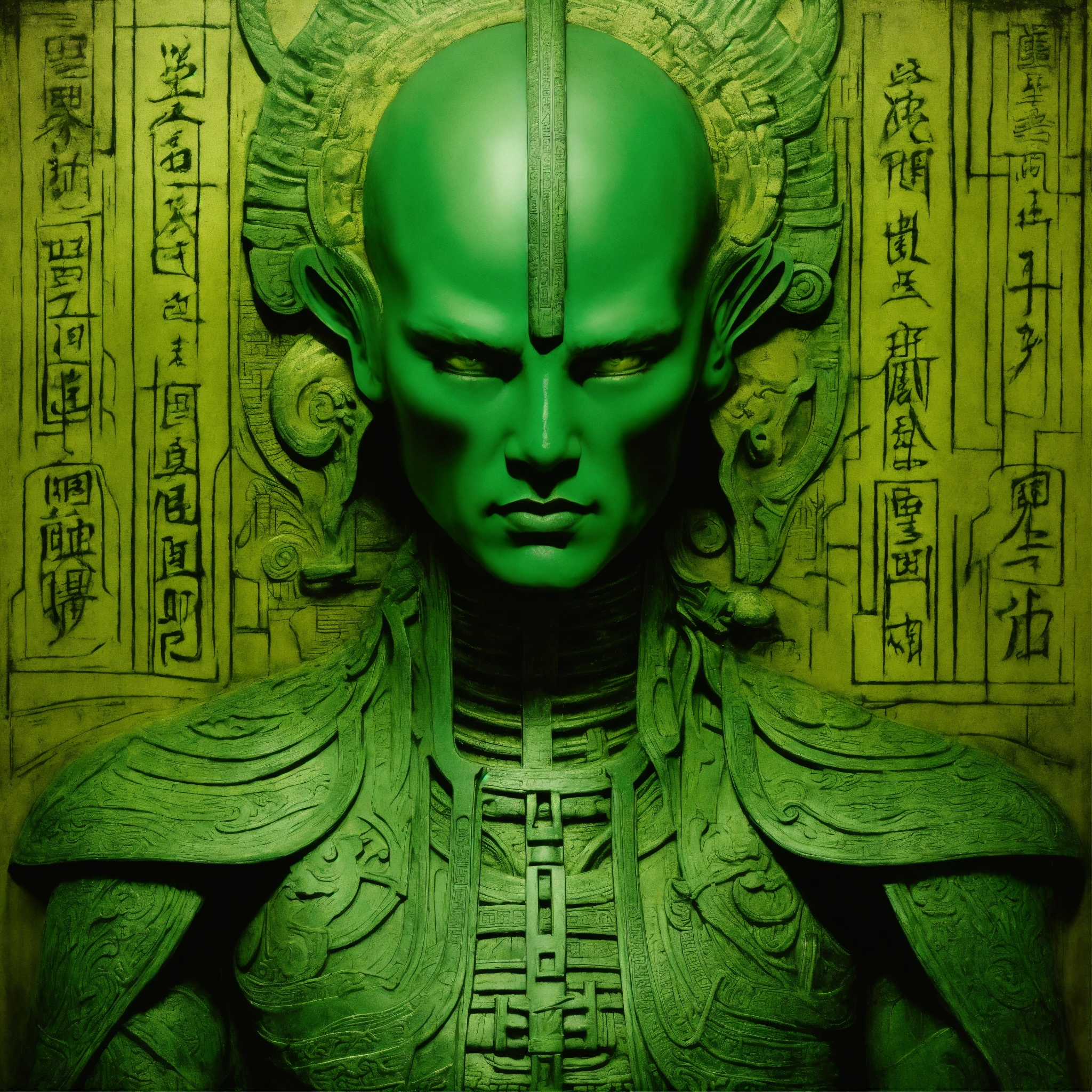 Background chinese calligraphy, dibuja una representación simbólica de los arquetipos de los hombres en una fotografía de cuerpo entero frontal y centrada, estilo giger, trazo artístico hugo pratt, con verde y negro.