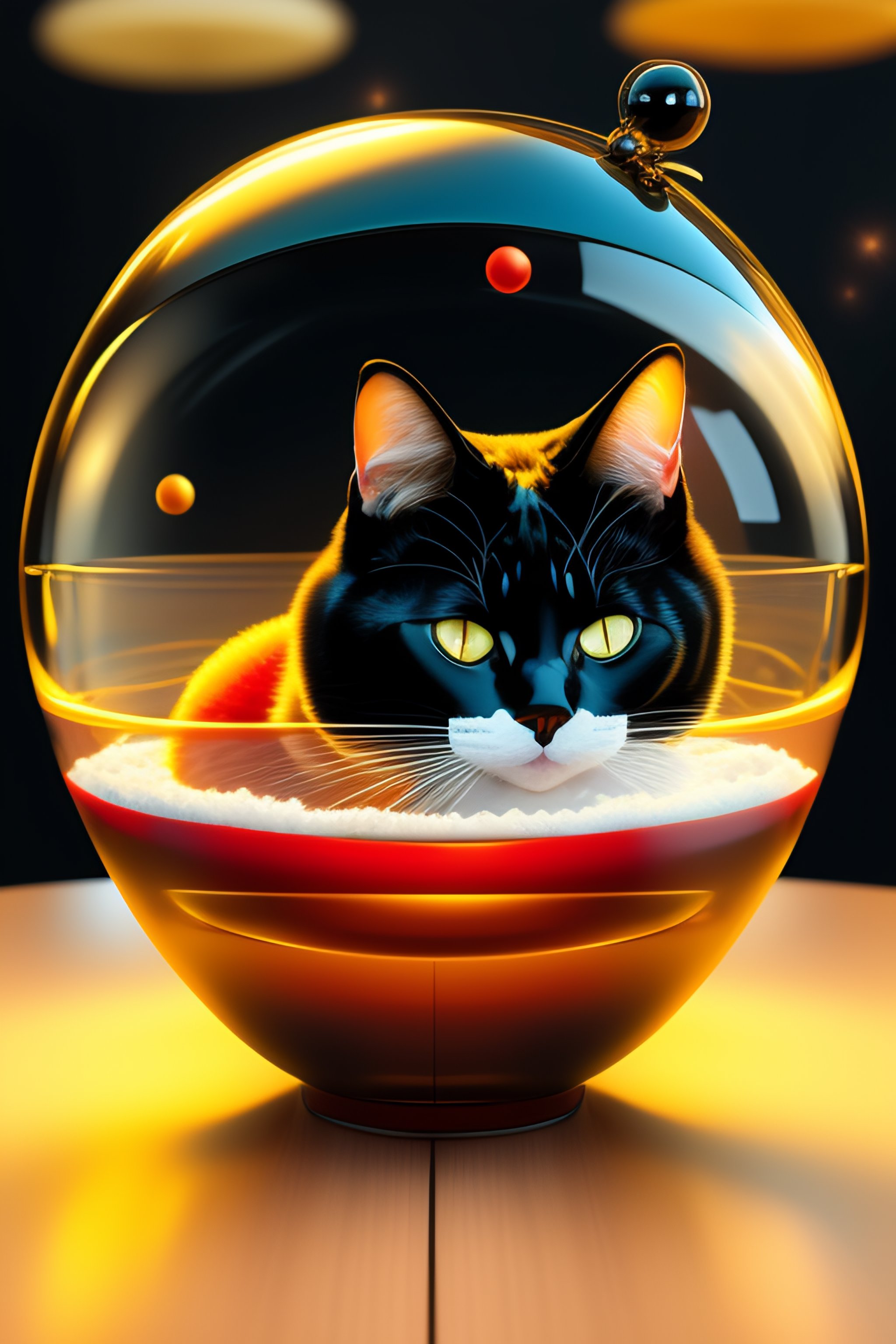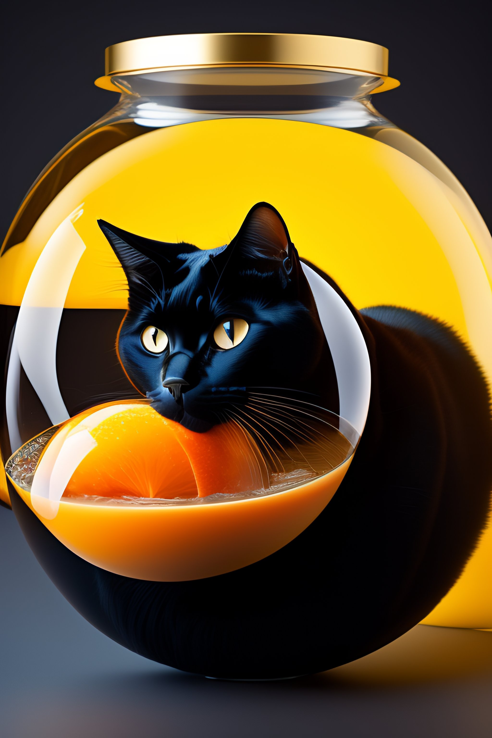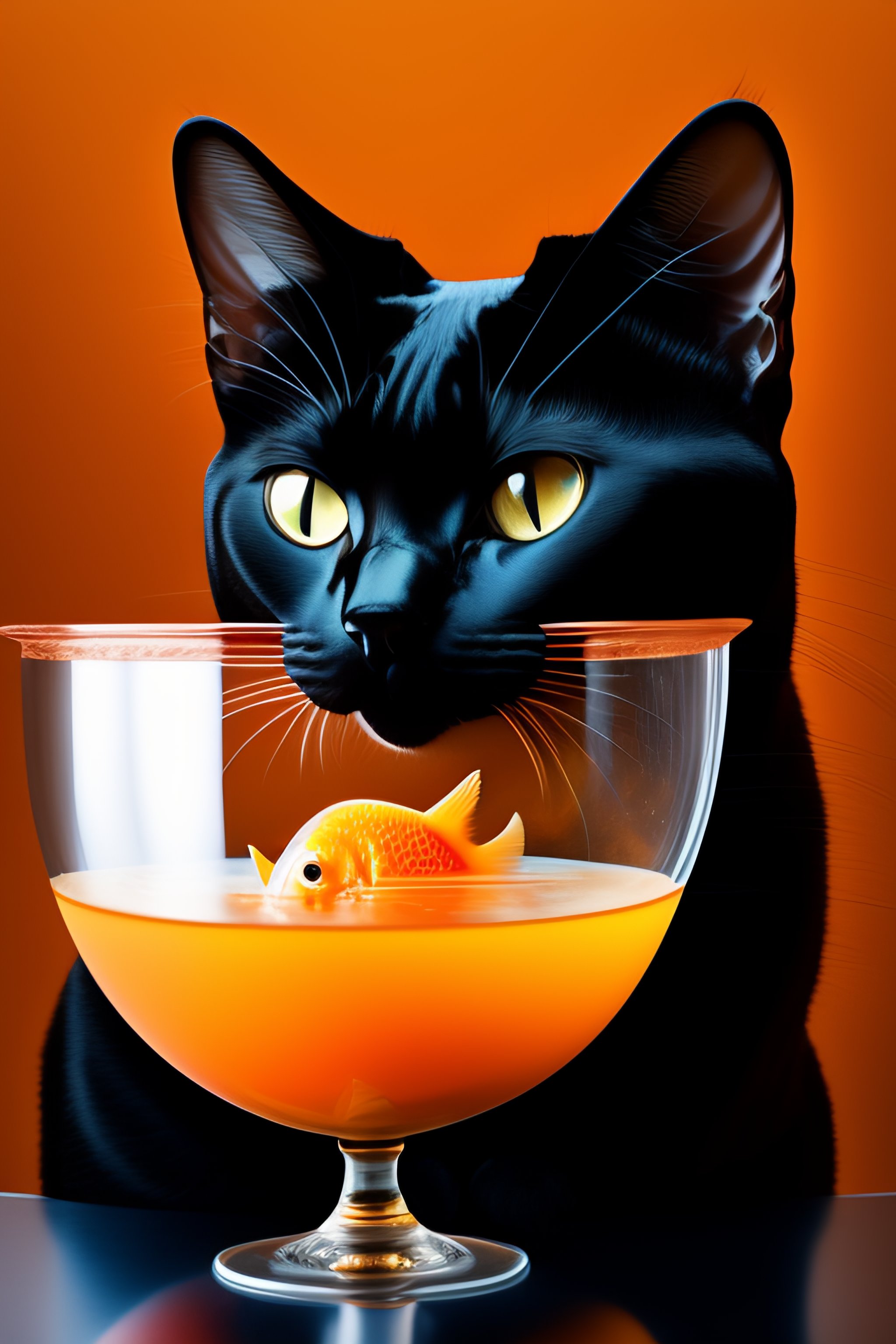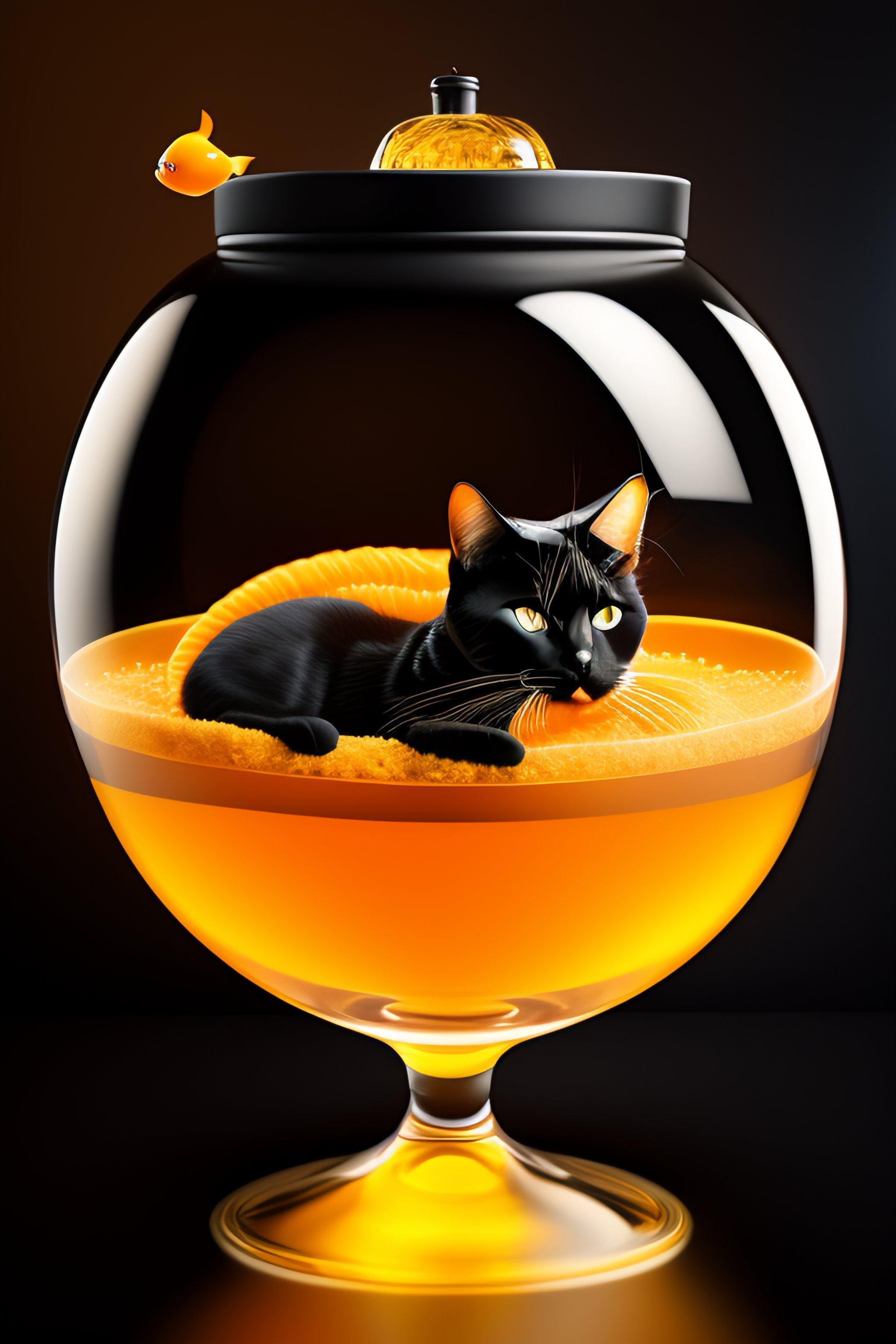 Black cat wearing a fish bowl as space helmet with a goldfish inside