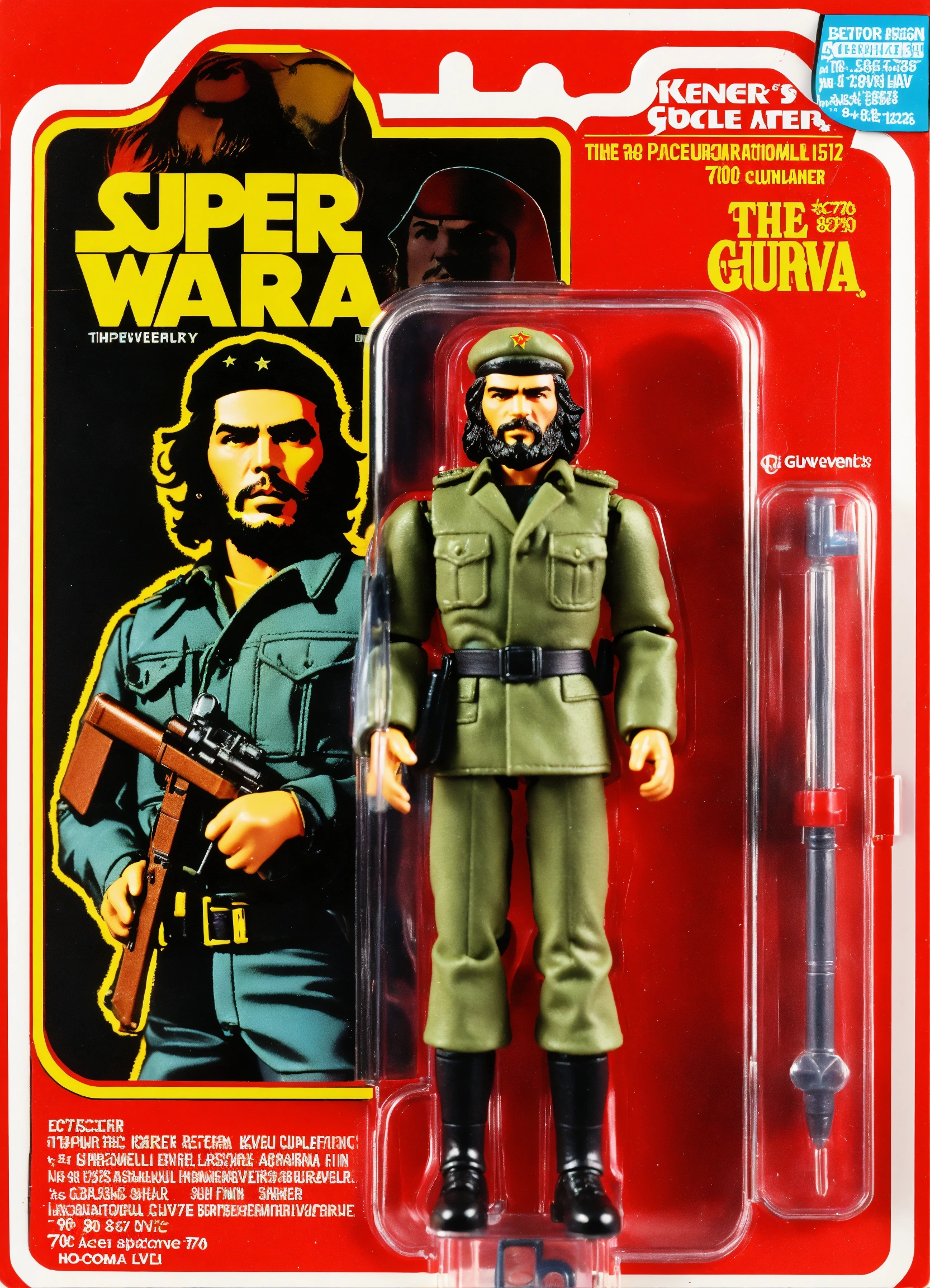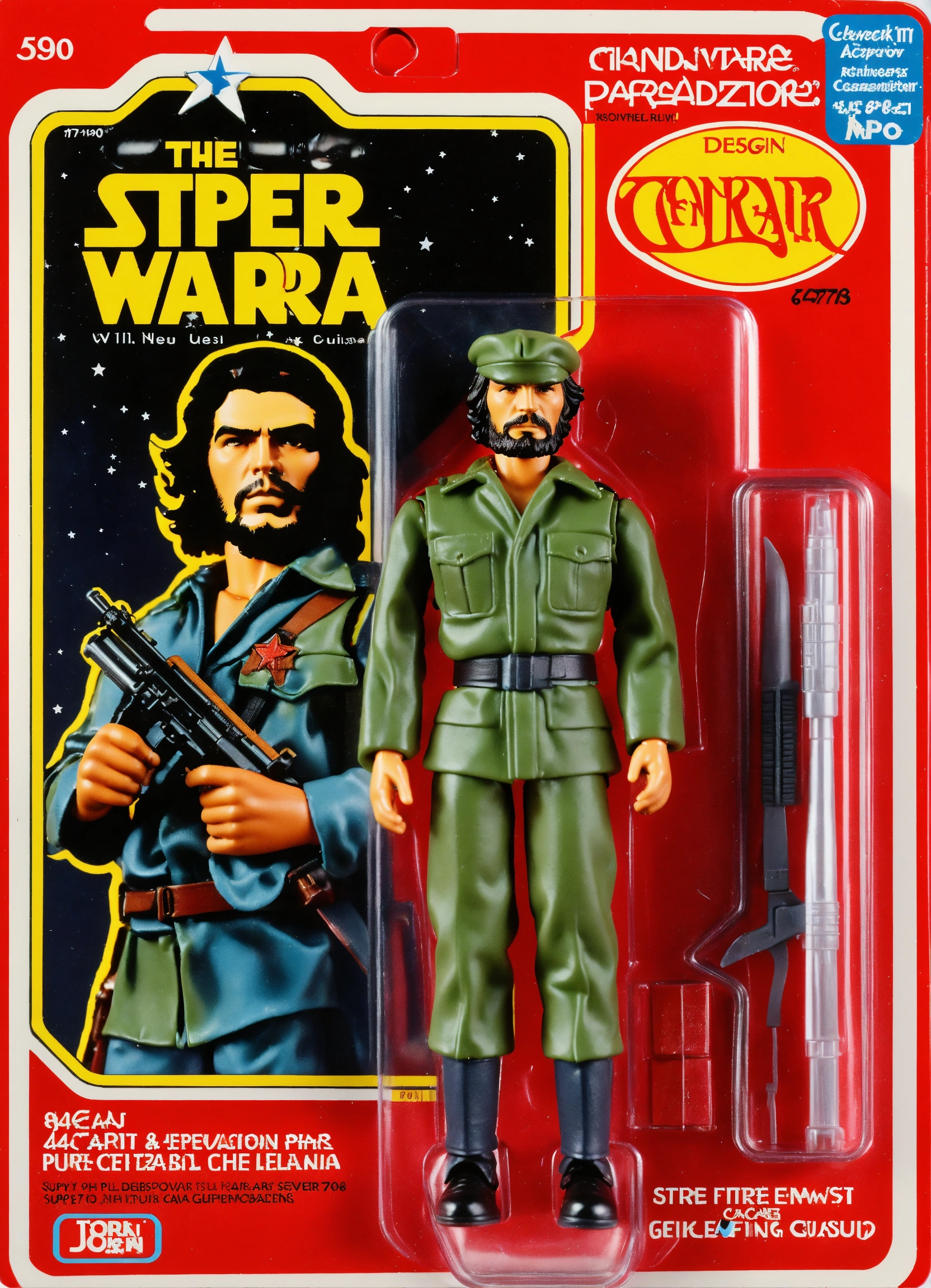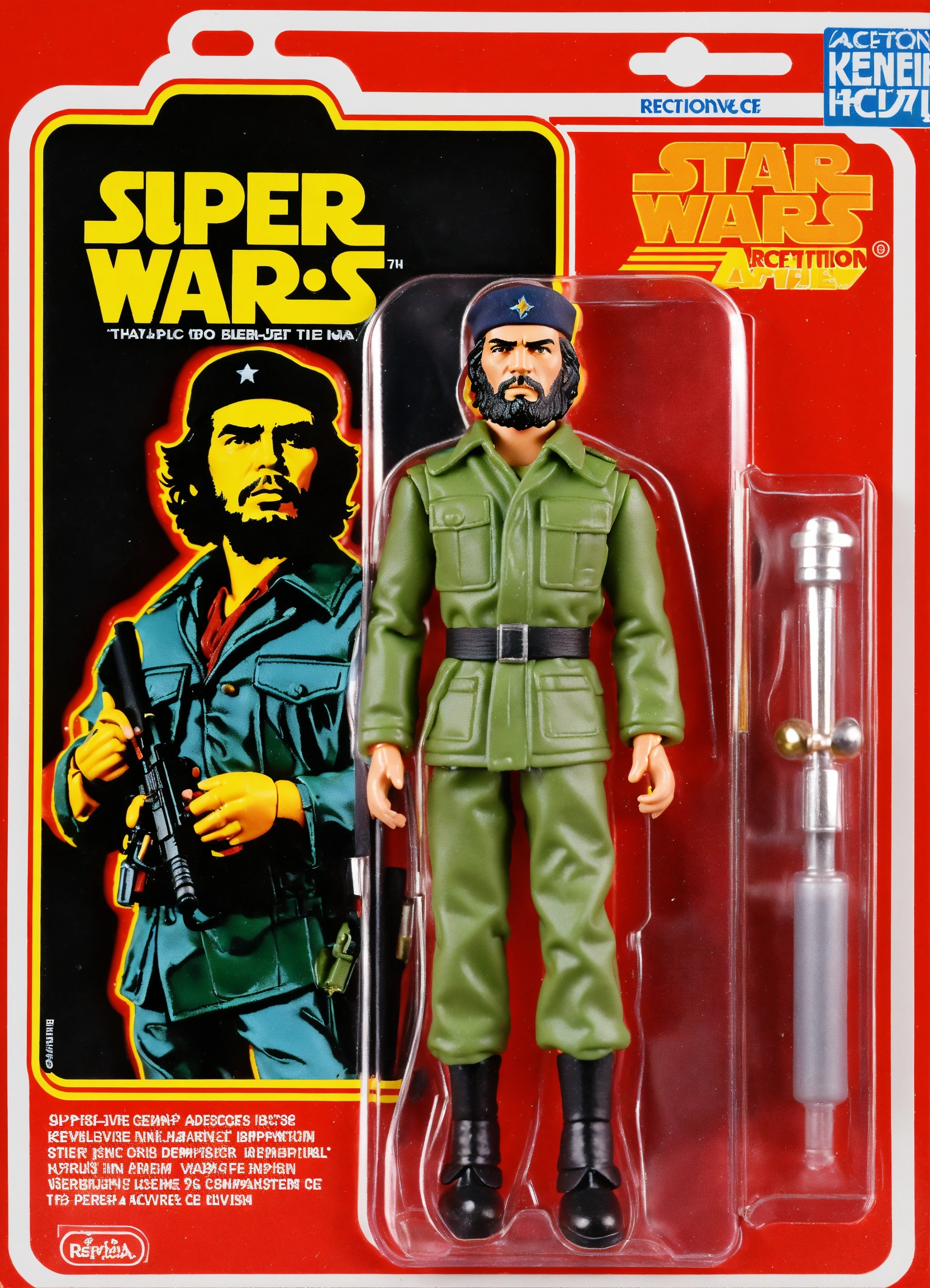 Design a kenner action figure toy or a super 7 reaction figure toy of the iconic revolutionary leader che guevara. the toy should embody the retro aesthetic reminiscent of classic '70s and '80s action figures made by kenner. incorporate fine details such as his iconic beret with a red star, beard, and determined gaze, staying true to the kenner action figures made in the 70's and 80's approach of high-quality craftsmanship and attention to detail. also with the classic packaging made by kenner company or super 7 reaction packaging