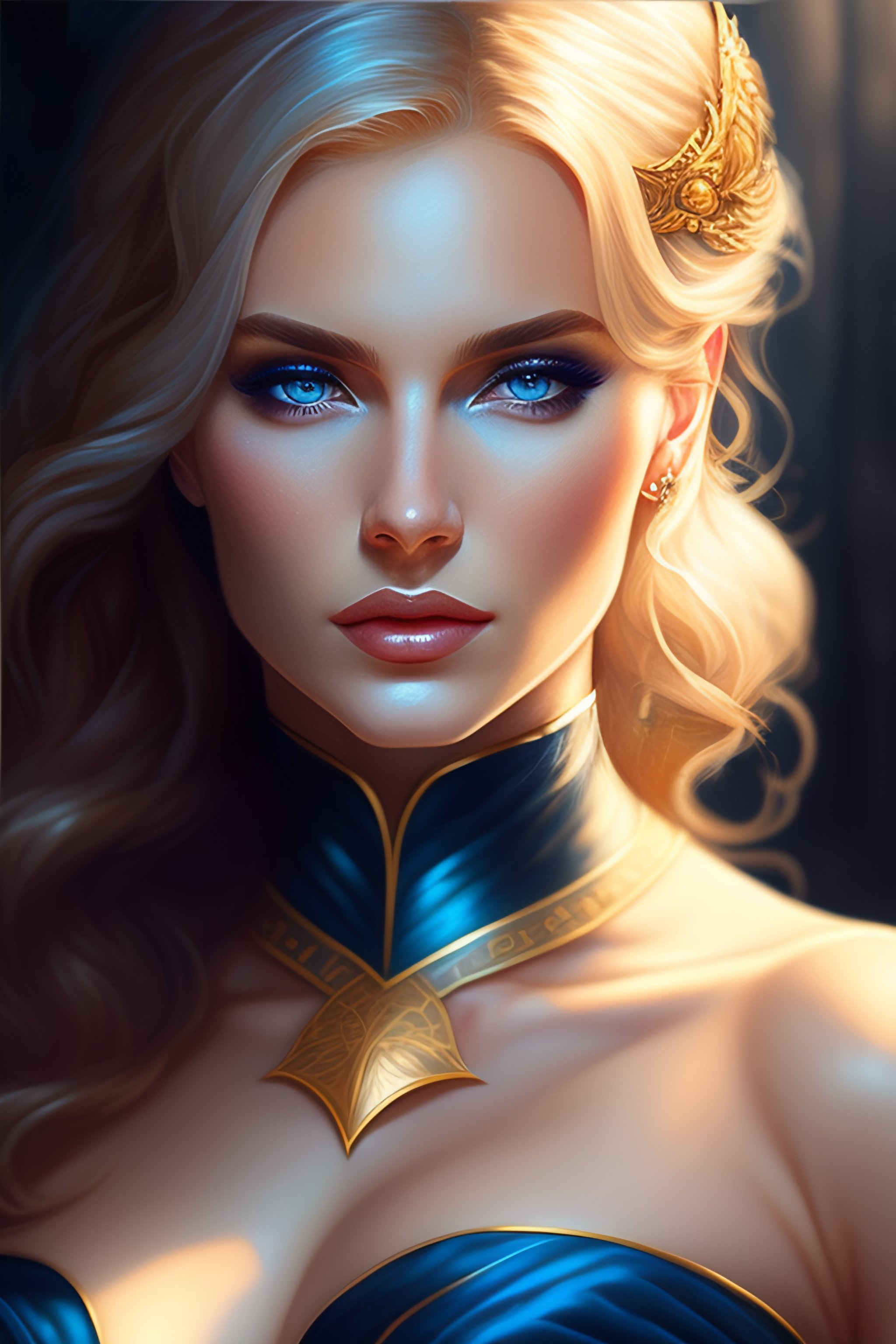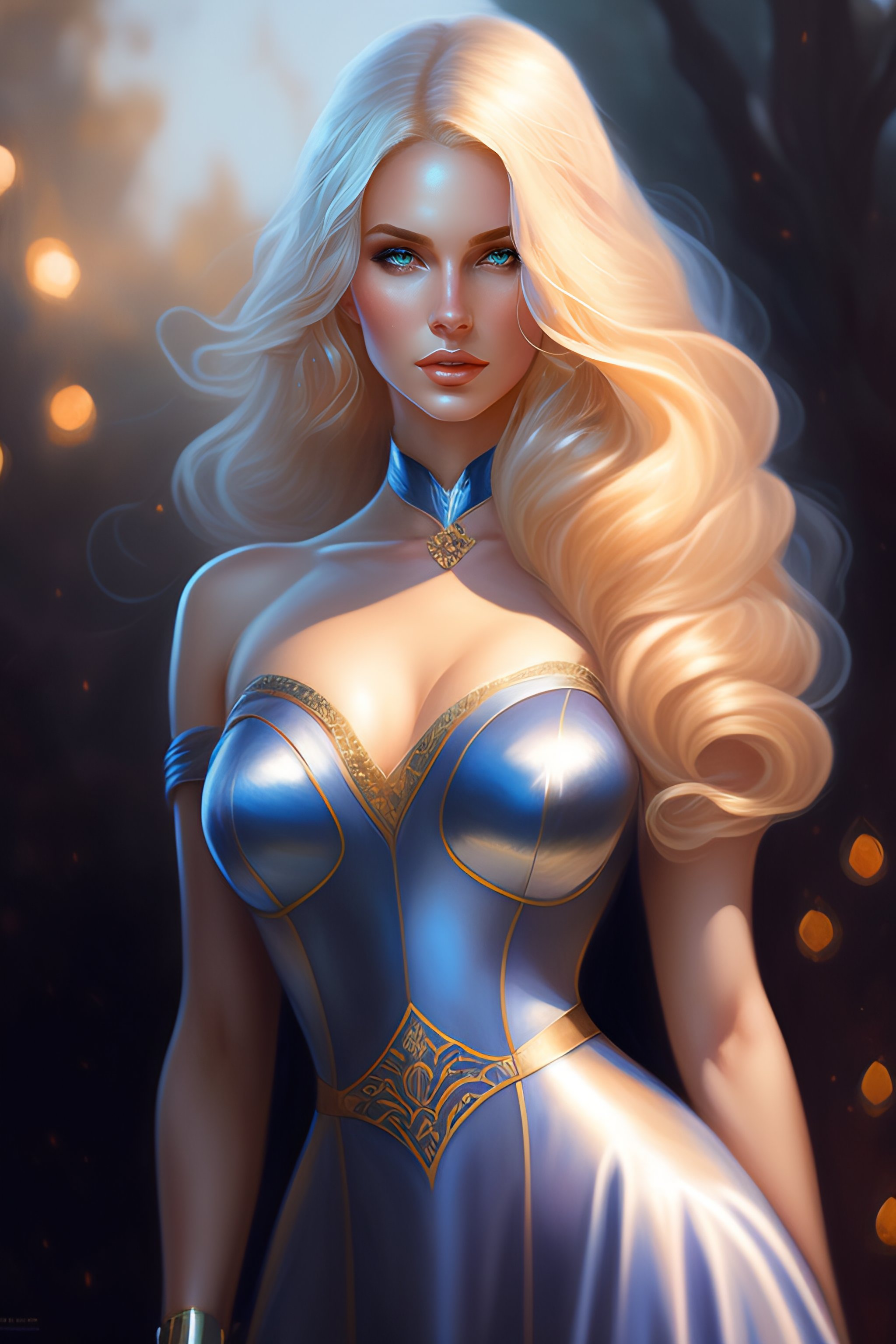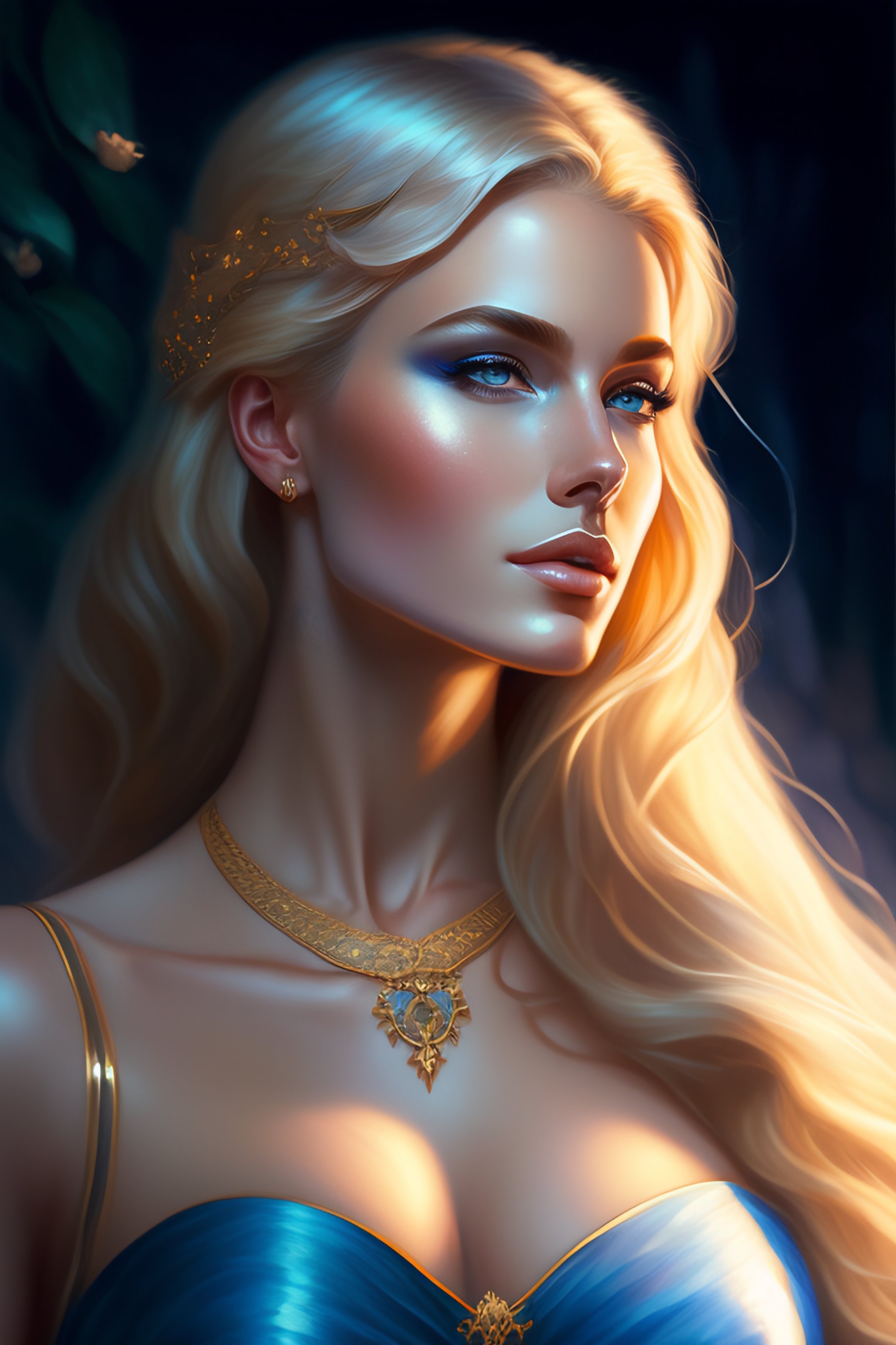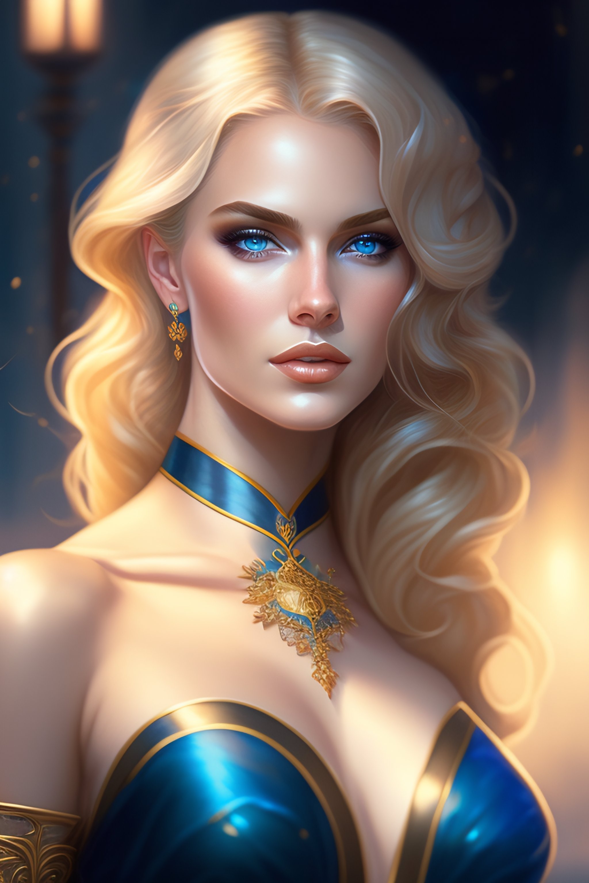 Blond woman wearing a blue dress, hazel eyes, fantasy magic, dark pin-up style hair, dark light night, intricate, elegant, sharp focus, illustration, highly detailed, digital painting, concept art, matte, art by wlop and artgerm and greg rutkowski and alphonse mucha, masterpiece