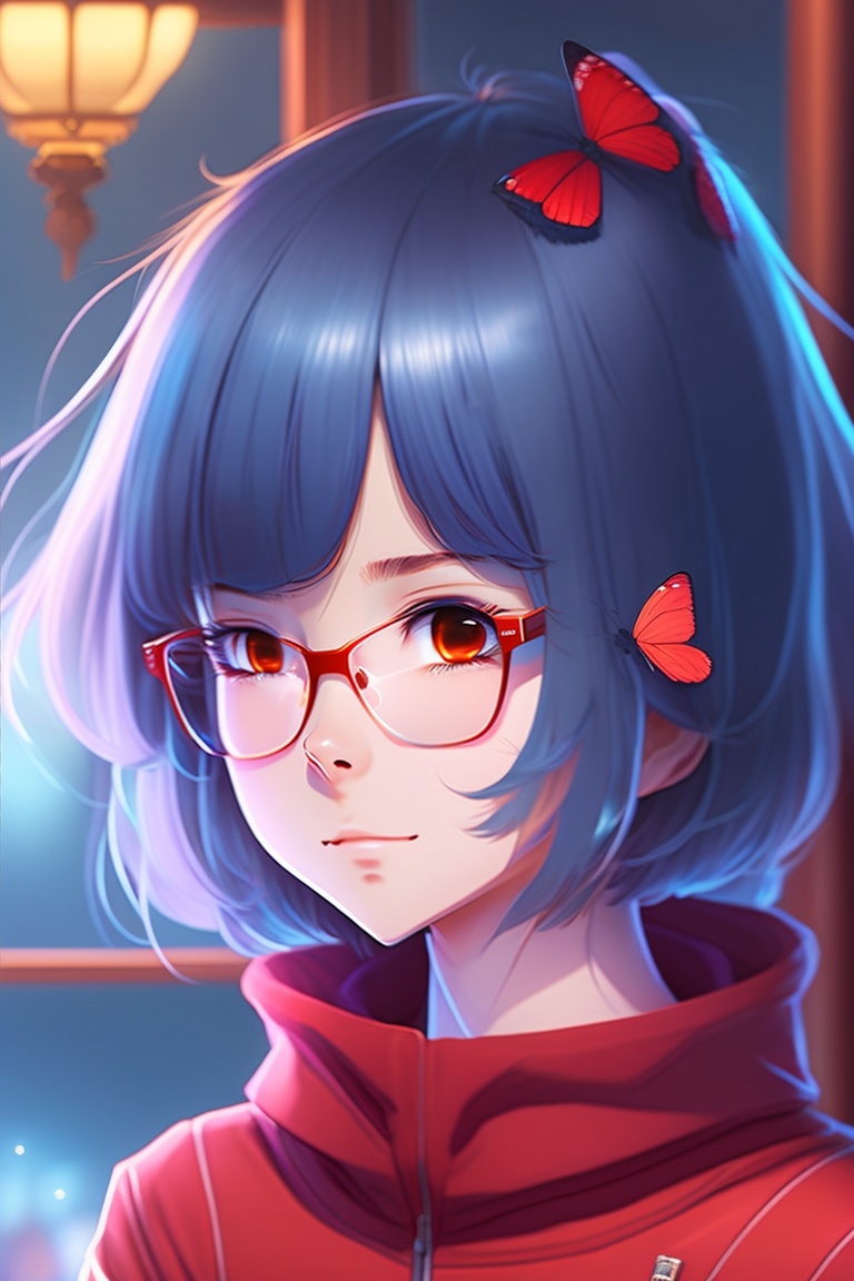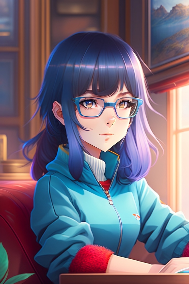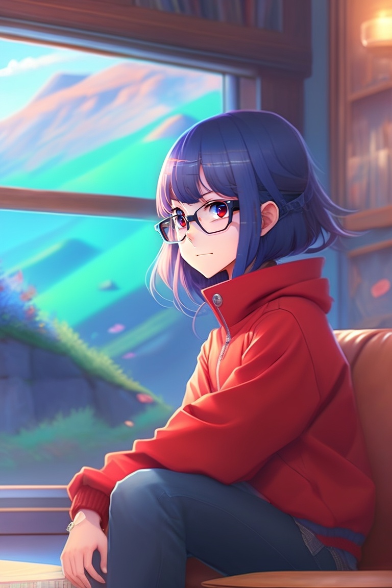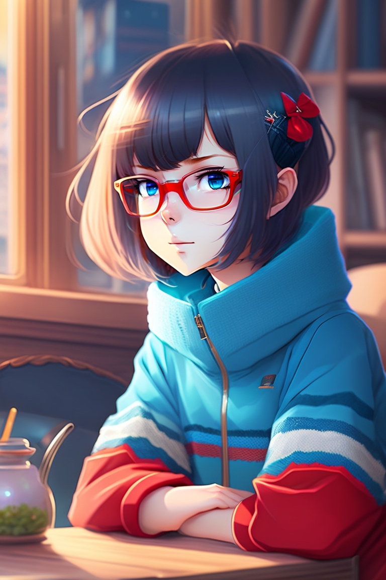 Cute girl in blue sweater black hair, semi rimless red glasses, sitting inside home, anime style, ghibli