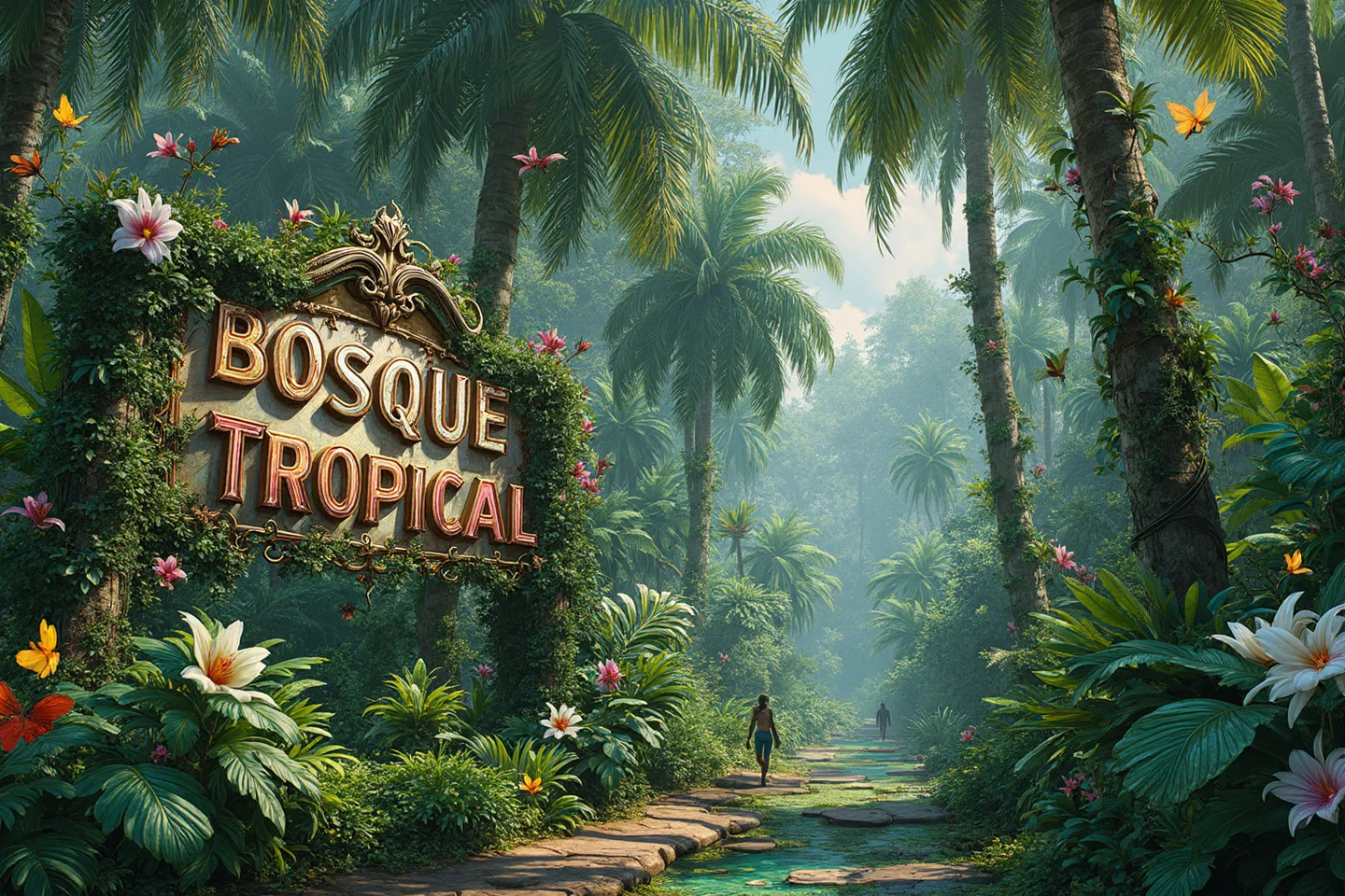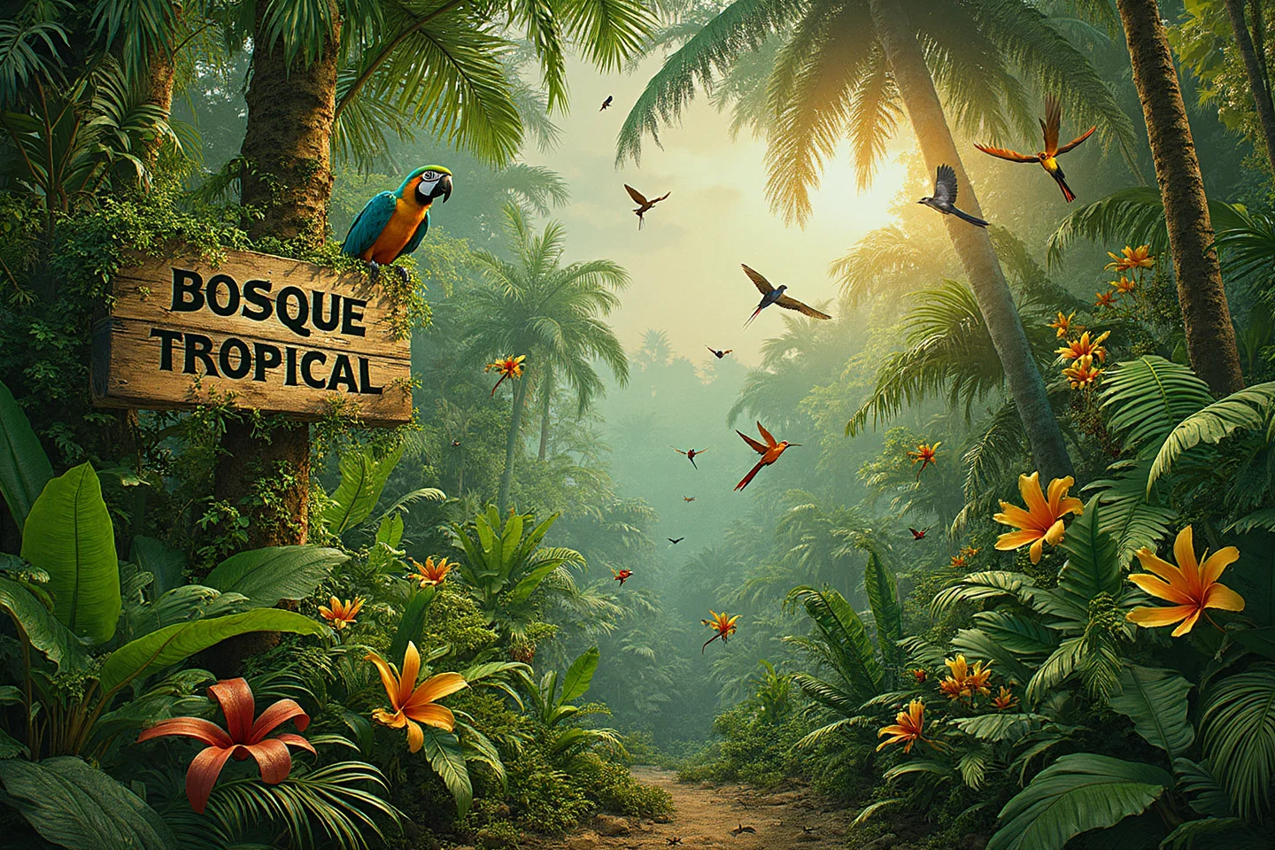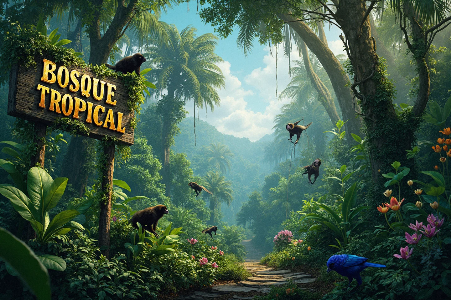 A tropical forest with lush flora and fauna, full of coorido. on the left side there is a sign that says in spanish "bosque tropical"