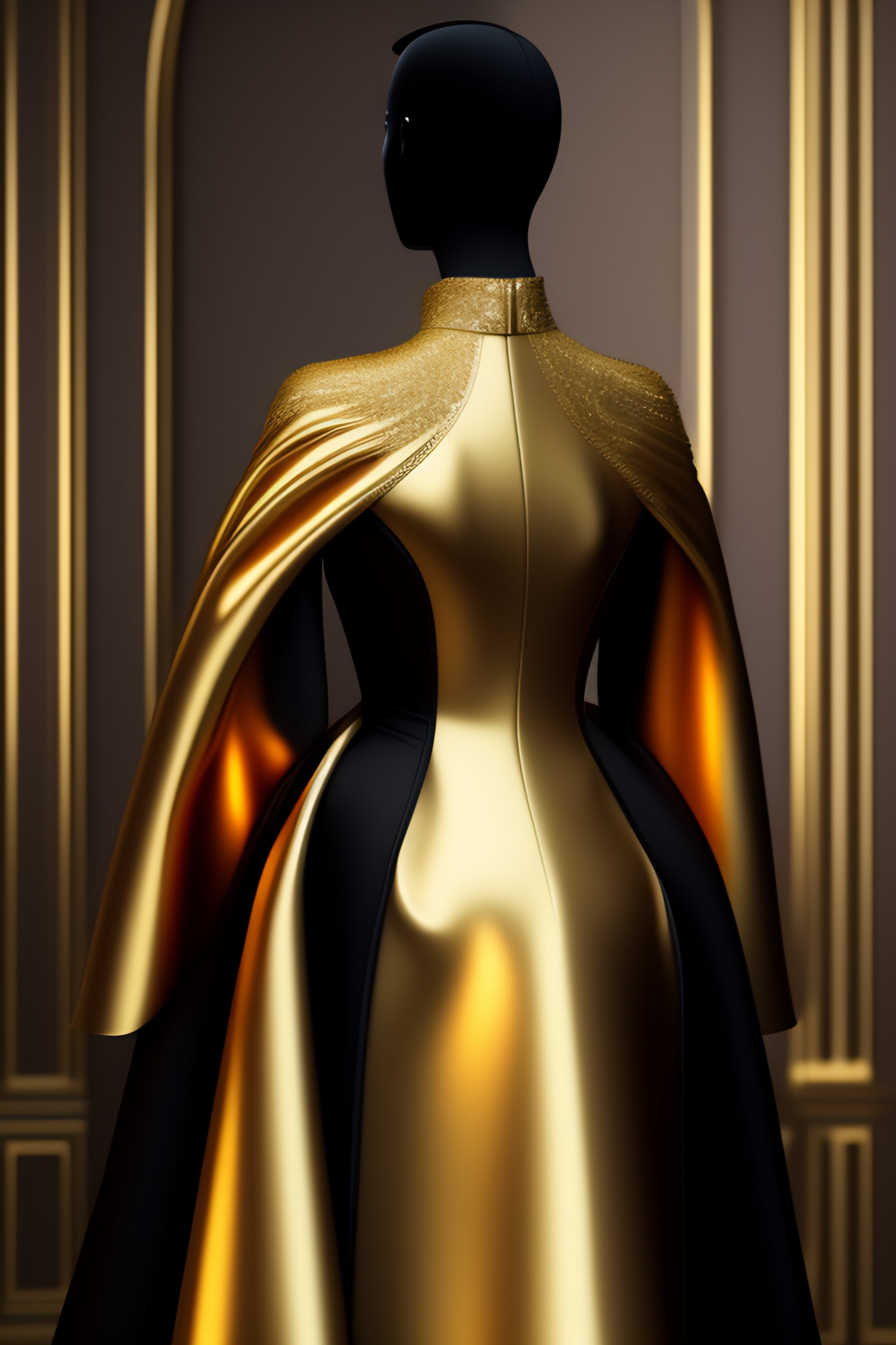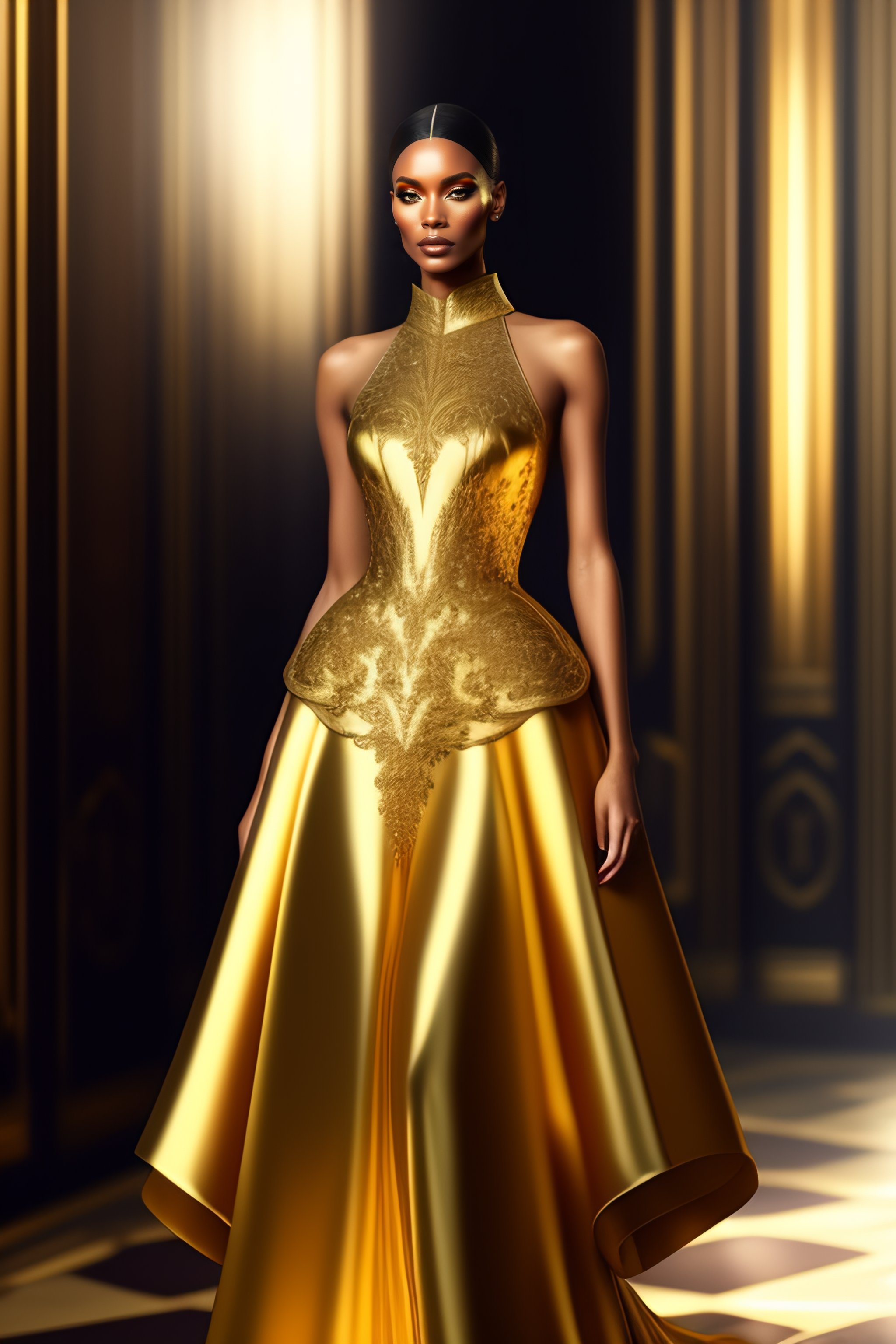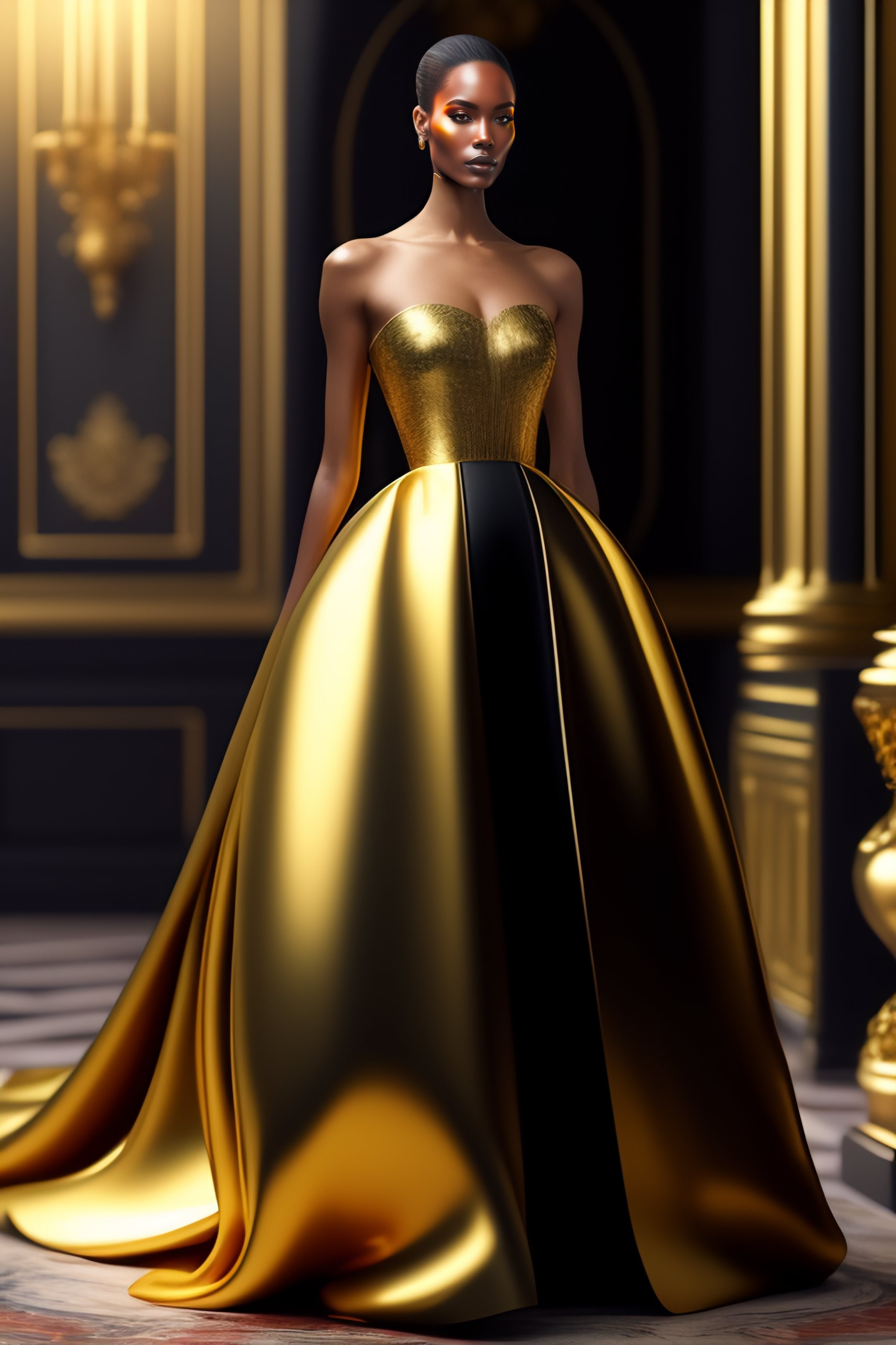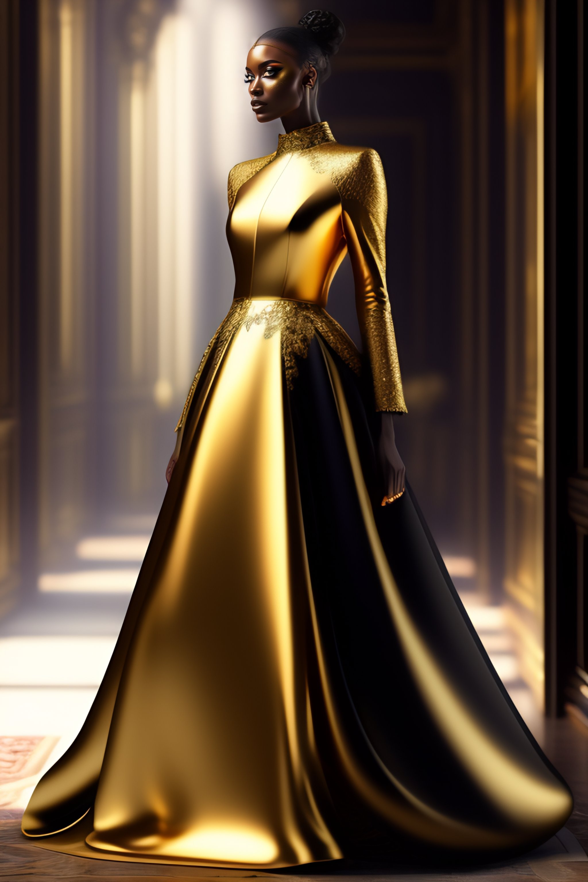 A haute couture dress gold whit insert in black satin, hyper realistic, ultra realistic, 8k, concept art, walking in historical building