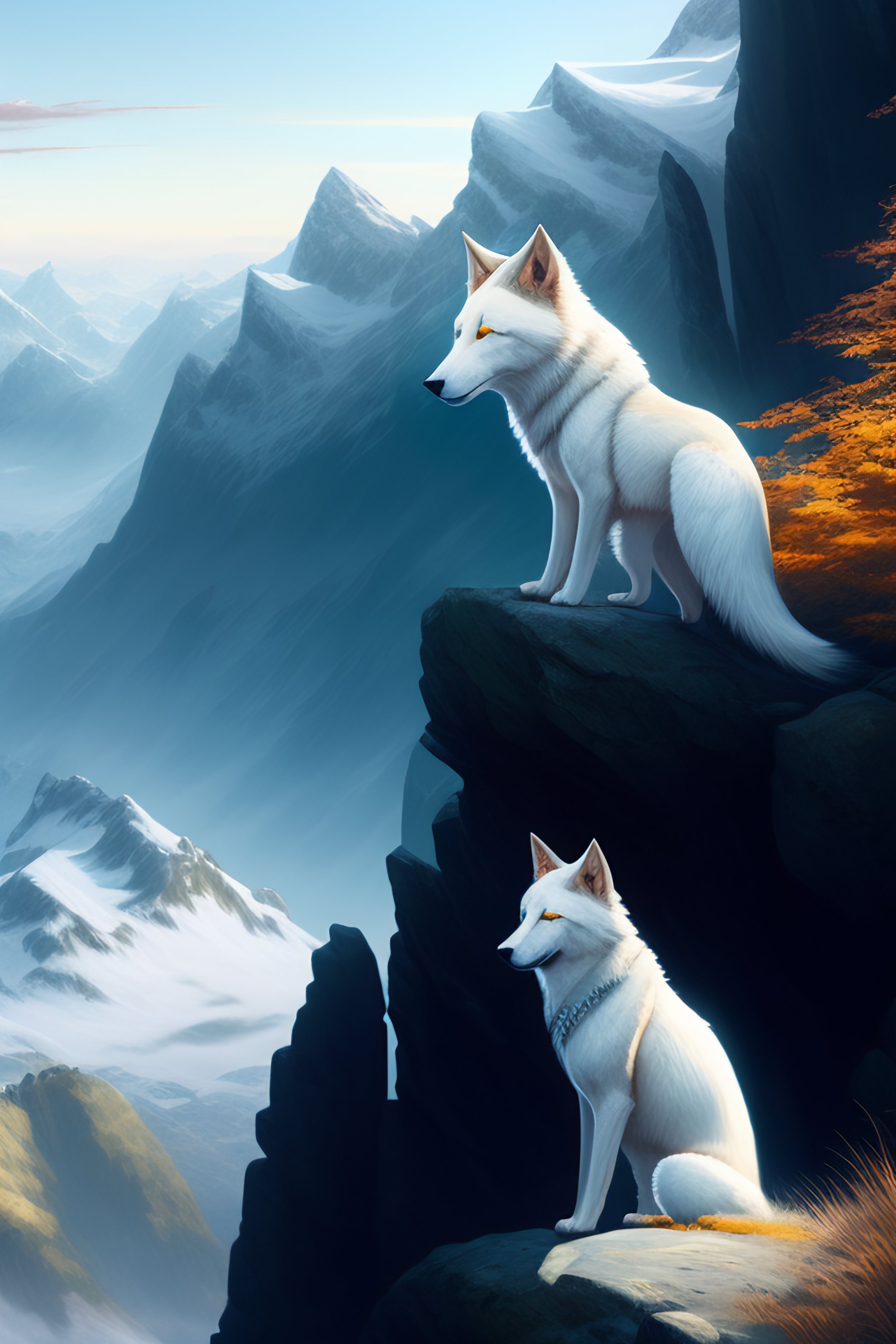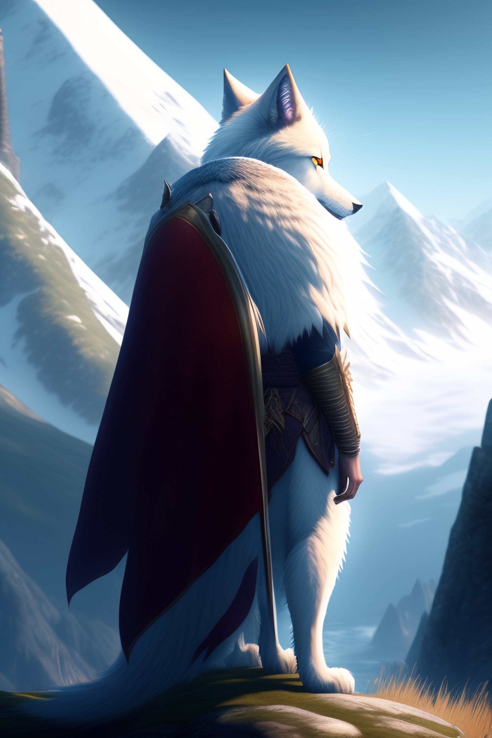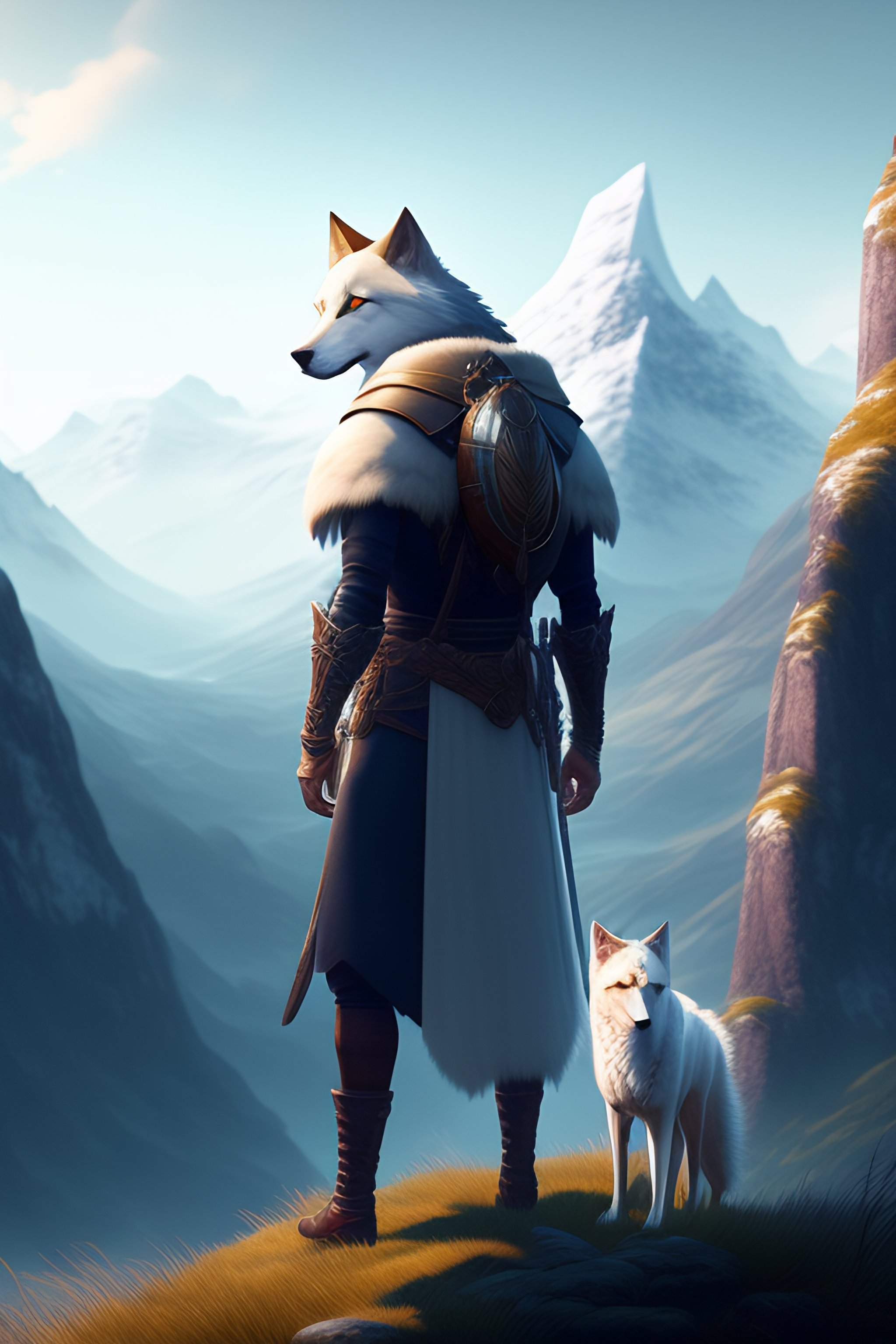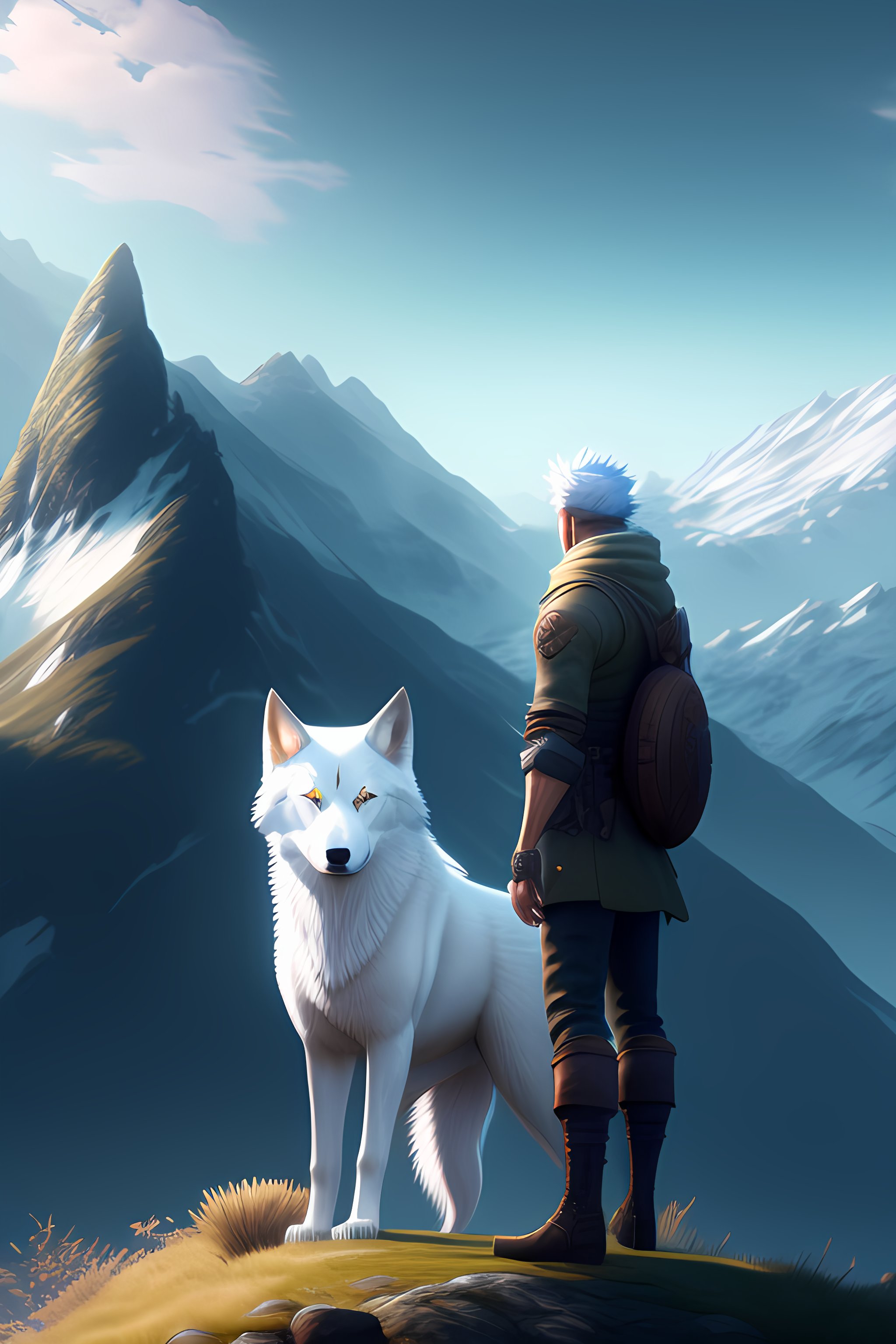 A man standing next to a white wolf on top of a mountain, poster art by miyazaki, cgsociety, fantasy art, official art, cryengine, anime