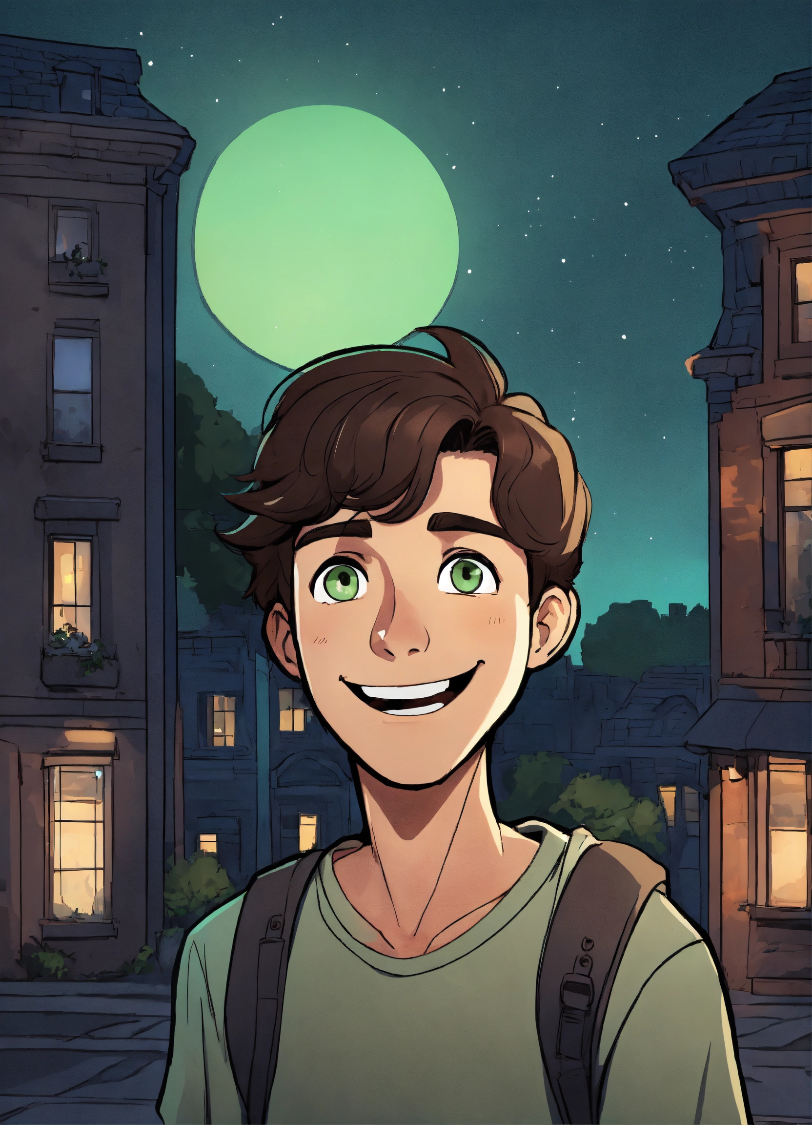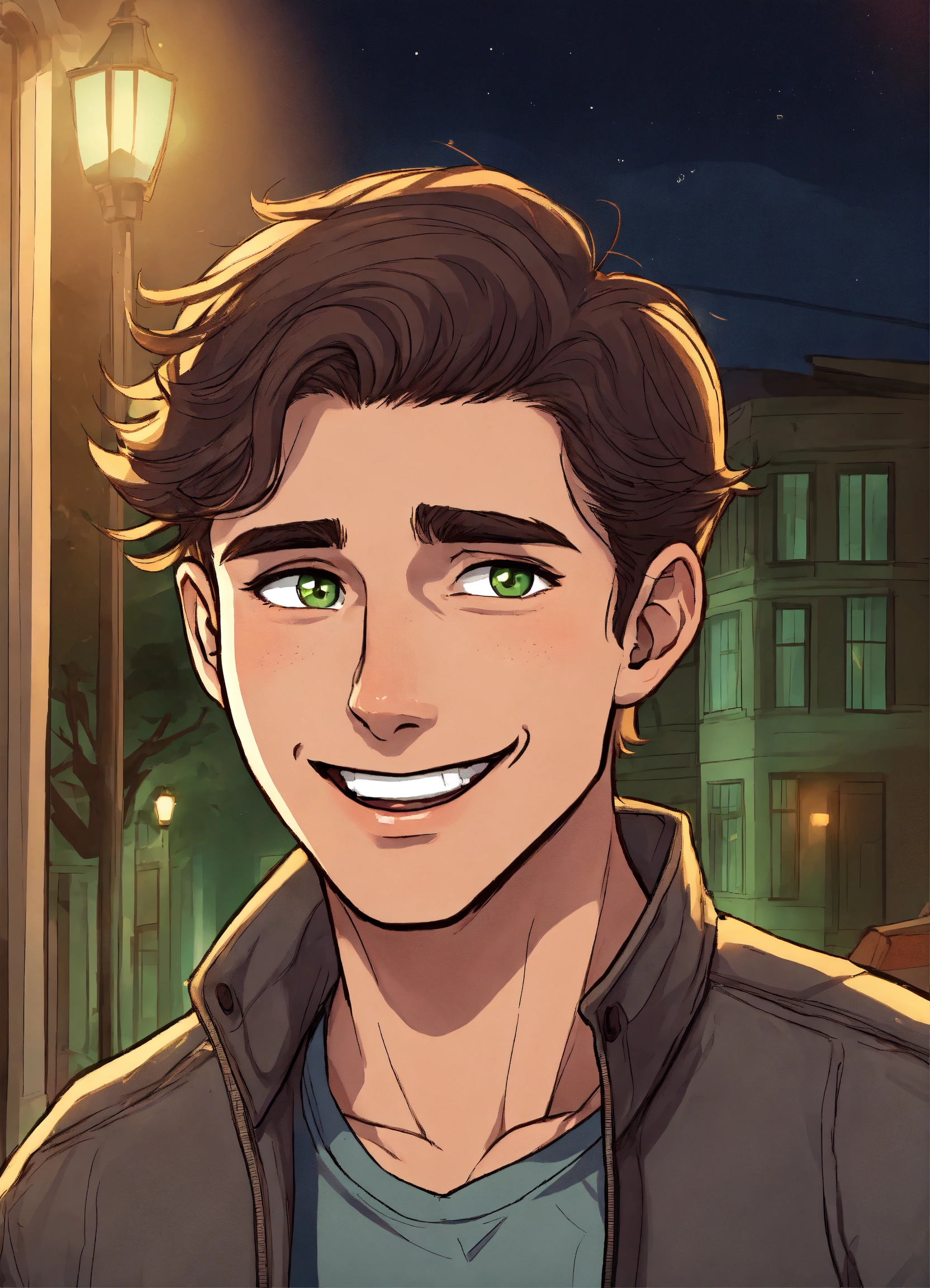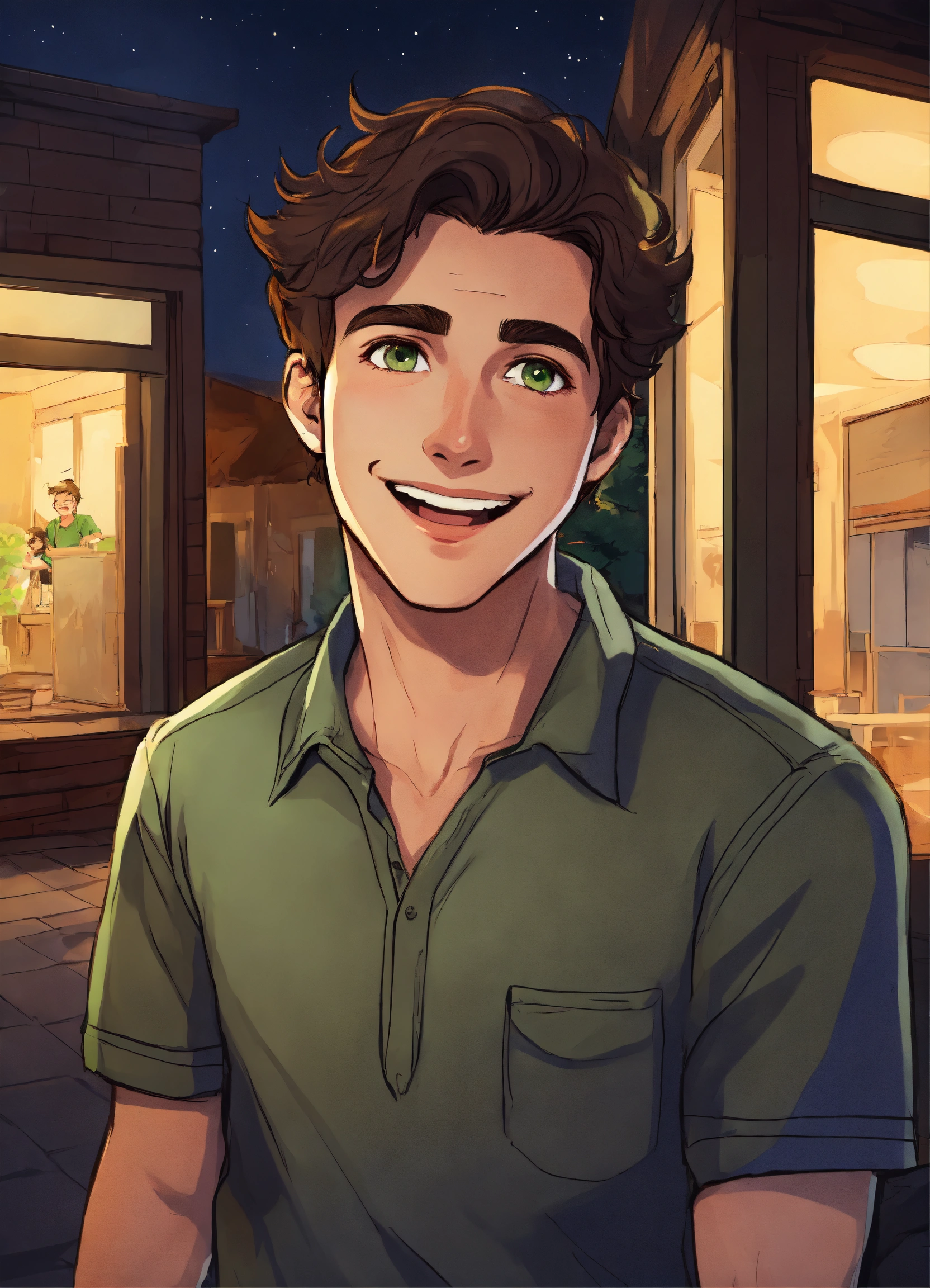 Young man with dark brown hair with a parting, gray green eyes, talking and laughing in cartoon style by night