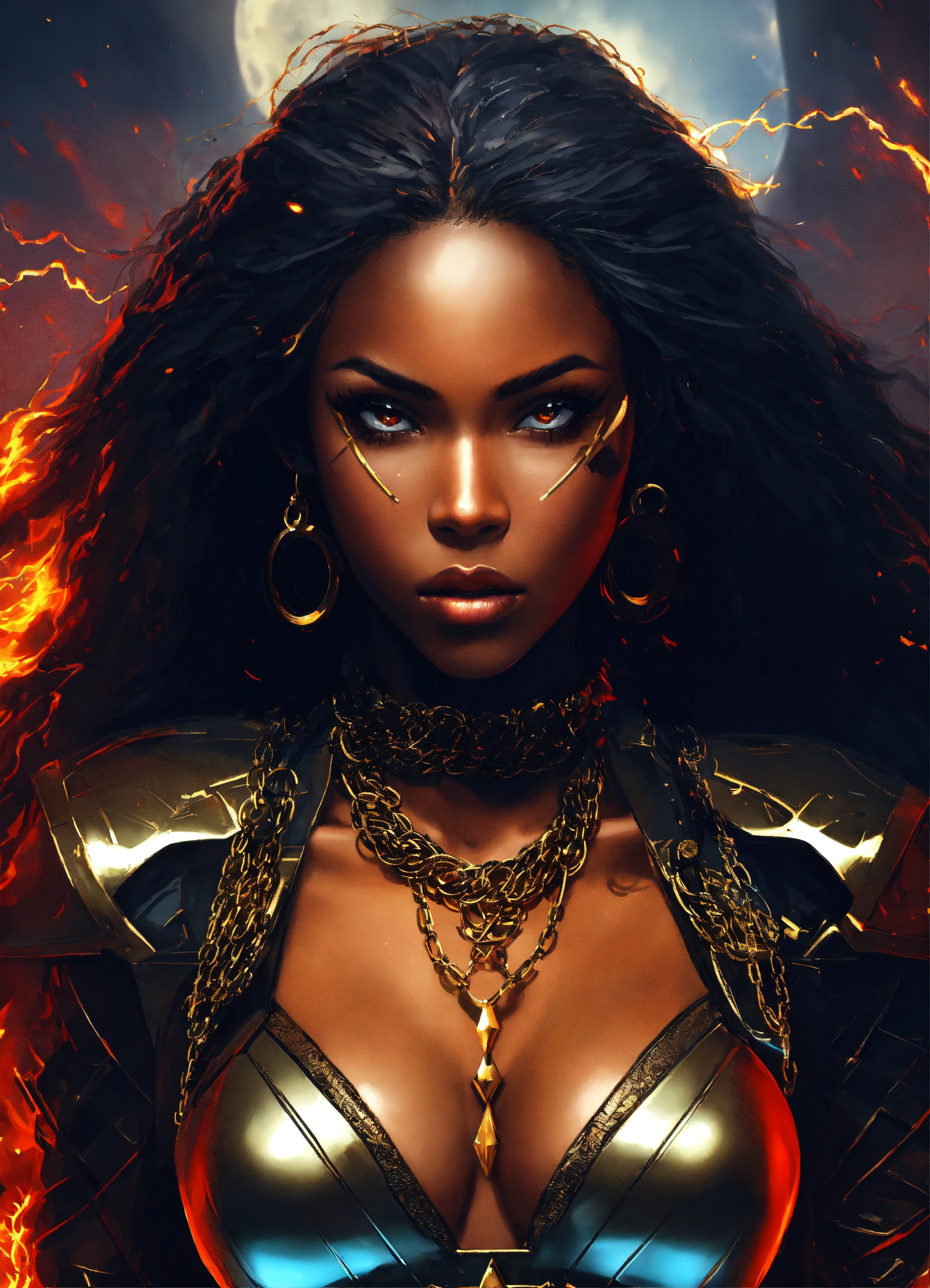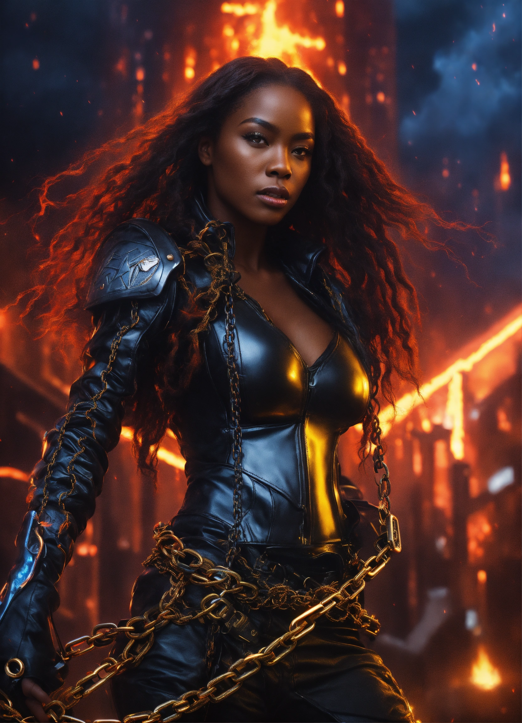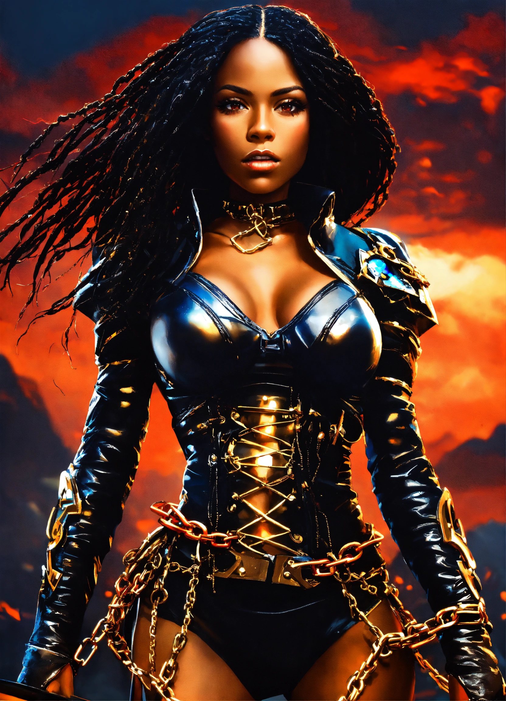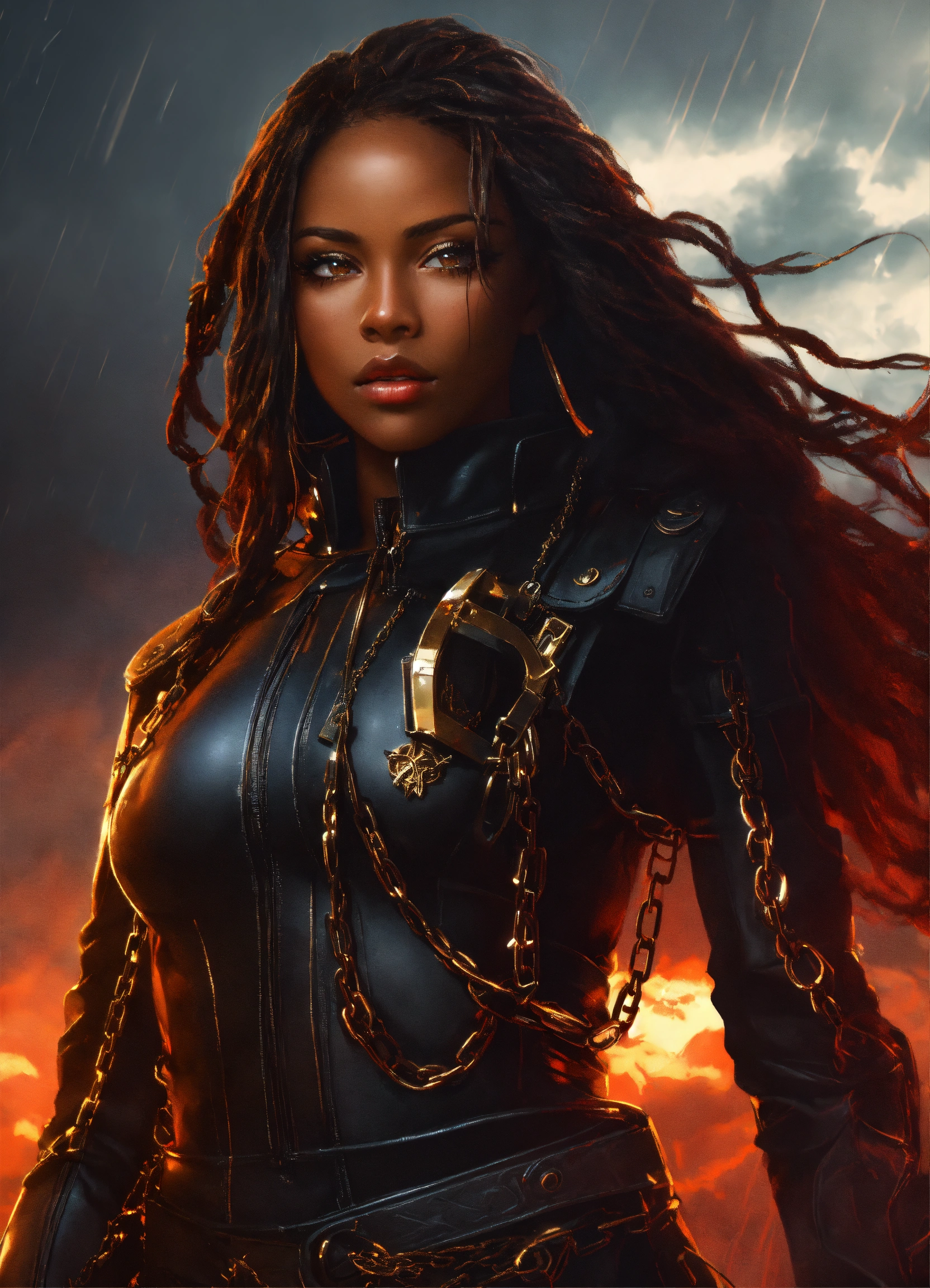 Black futuristic warrior, chained beautiful black futuristic warrior girl dark brown skin, beautiful perfect face, shapely hour-glass figure long flowing hair in fiery chains arms chained to her side, wearing a black super spy stealth outfit with a gold star on her chest bound in fiery chains, hands on her hips she's floating in the sky with dark clouds and red lightning behind her, fantasy, high detail, realistic photo, high detail, digital painting, cinematic, stunning, hyper-realistic, sharp focus, high resolution 8k, insanely detailed