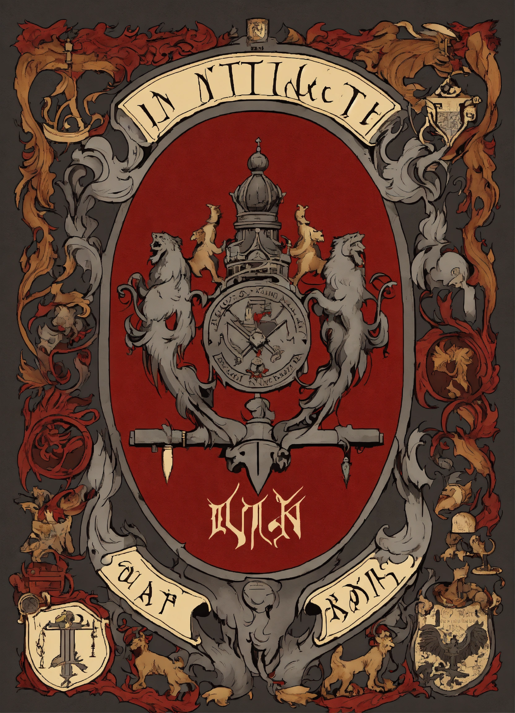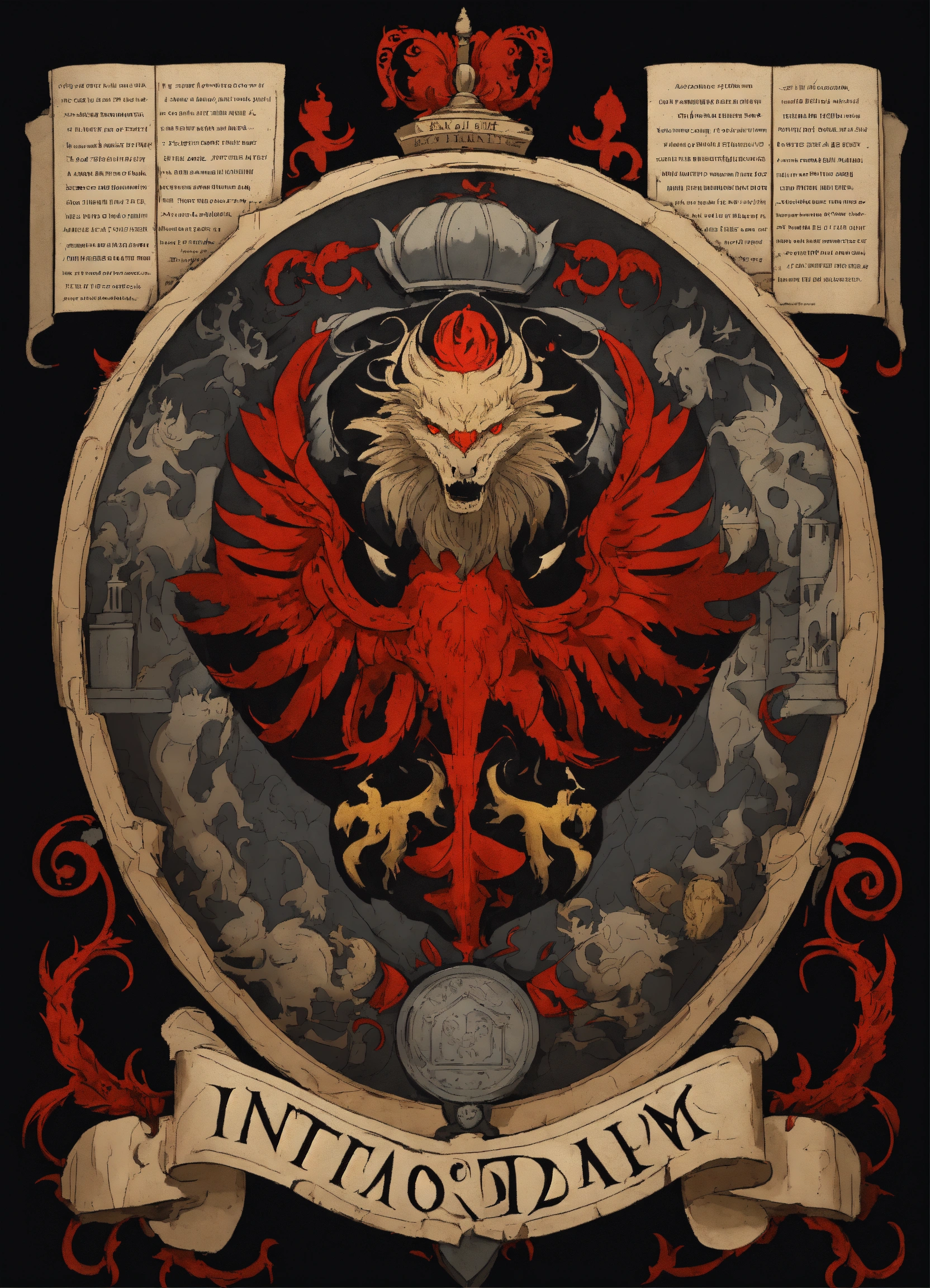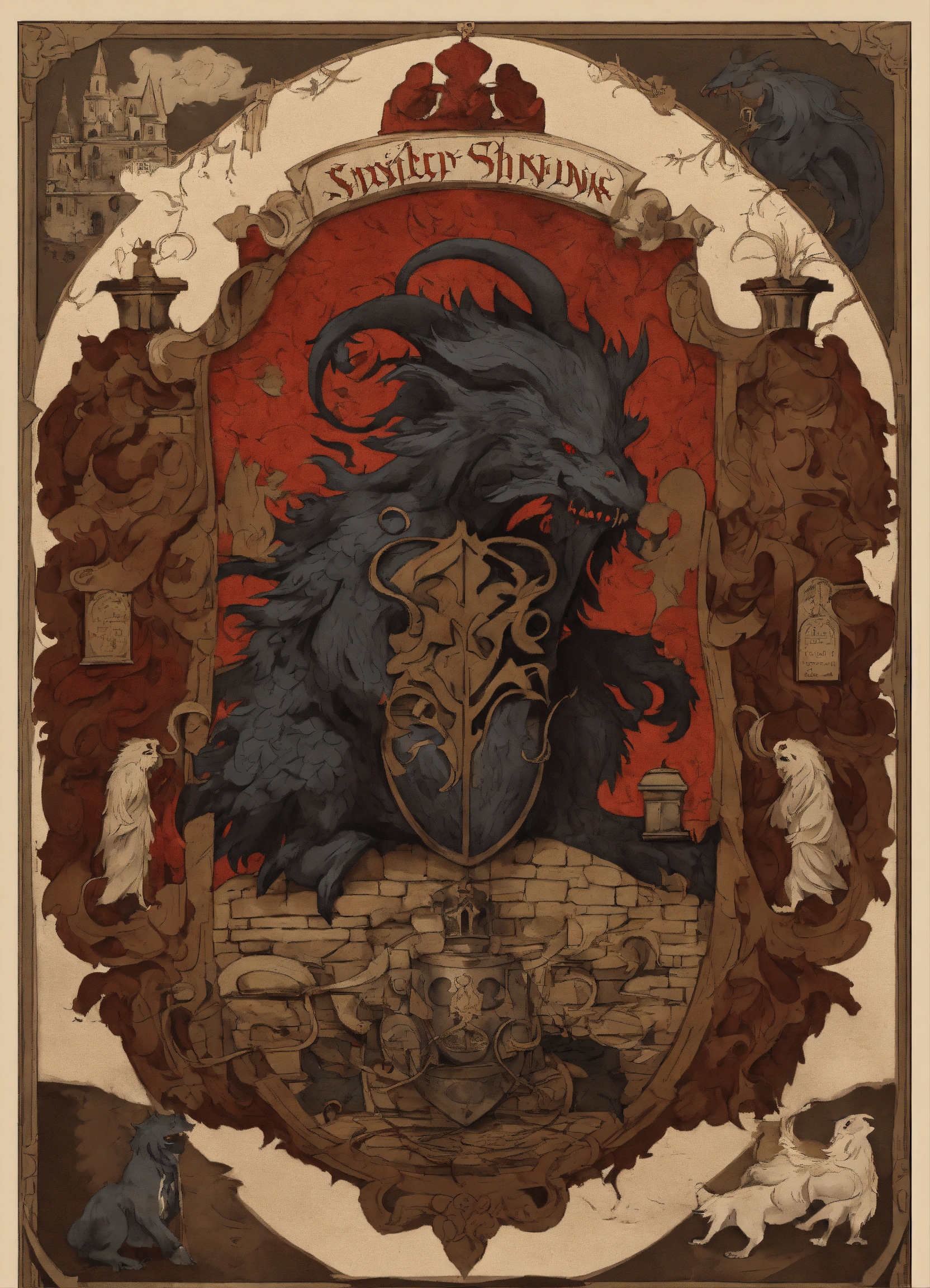 Coat of arms with a monster silhouette in the center with indistinct contours. around the figure there are stylized representations of sewers, cellars and dark places. lots of dark black, gray, brown and red shades. at the bottom of the coat of arms it is written "in the shadows, we watch", in gothic letters.