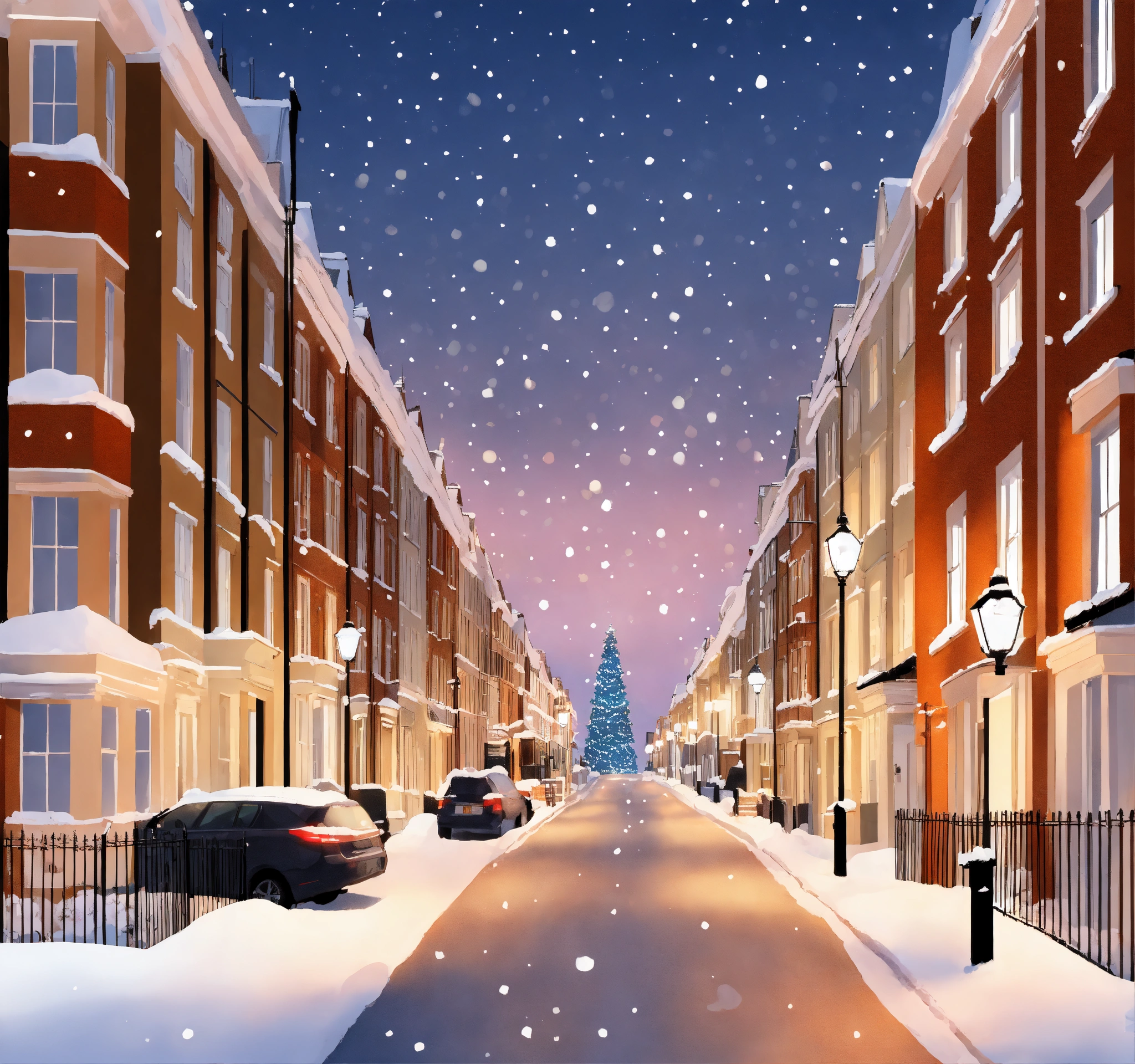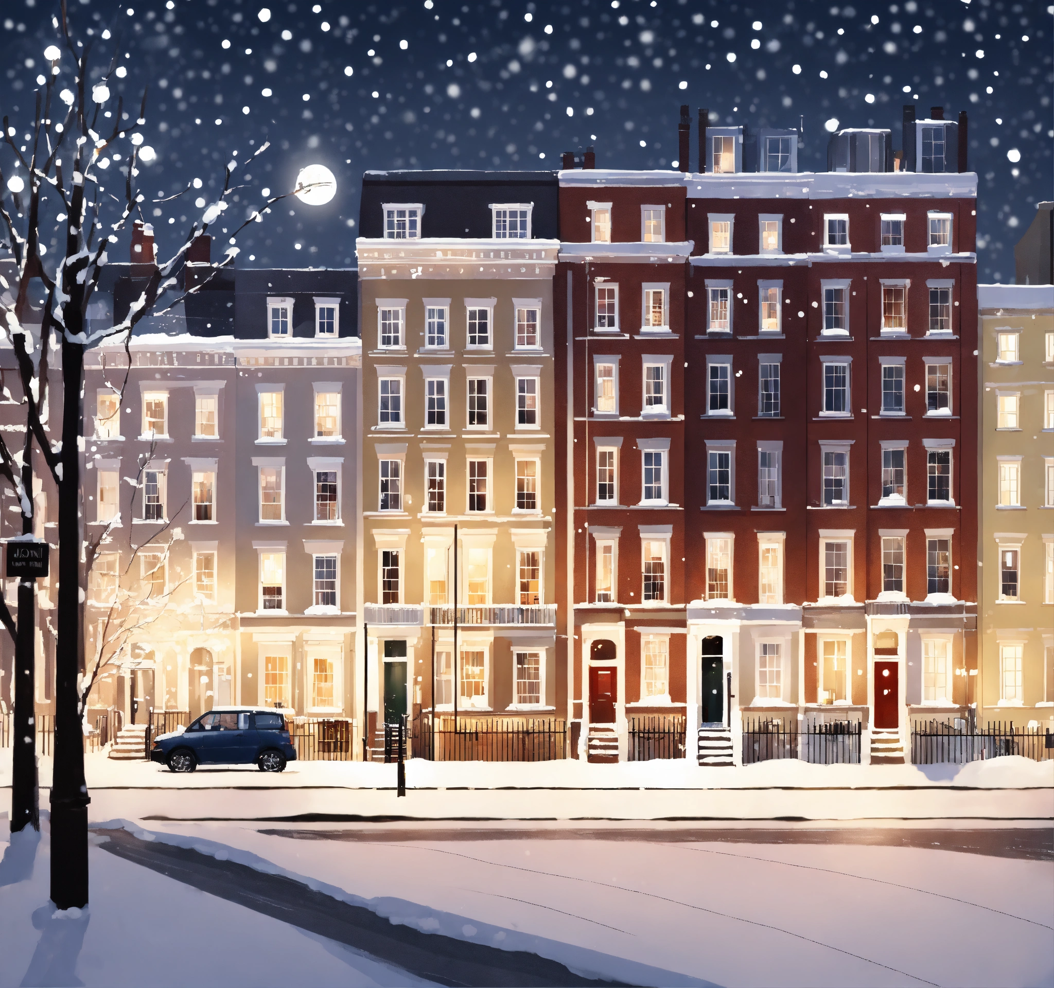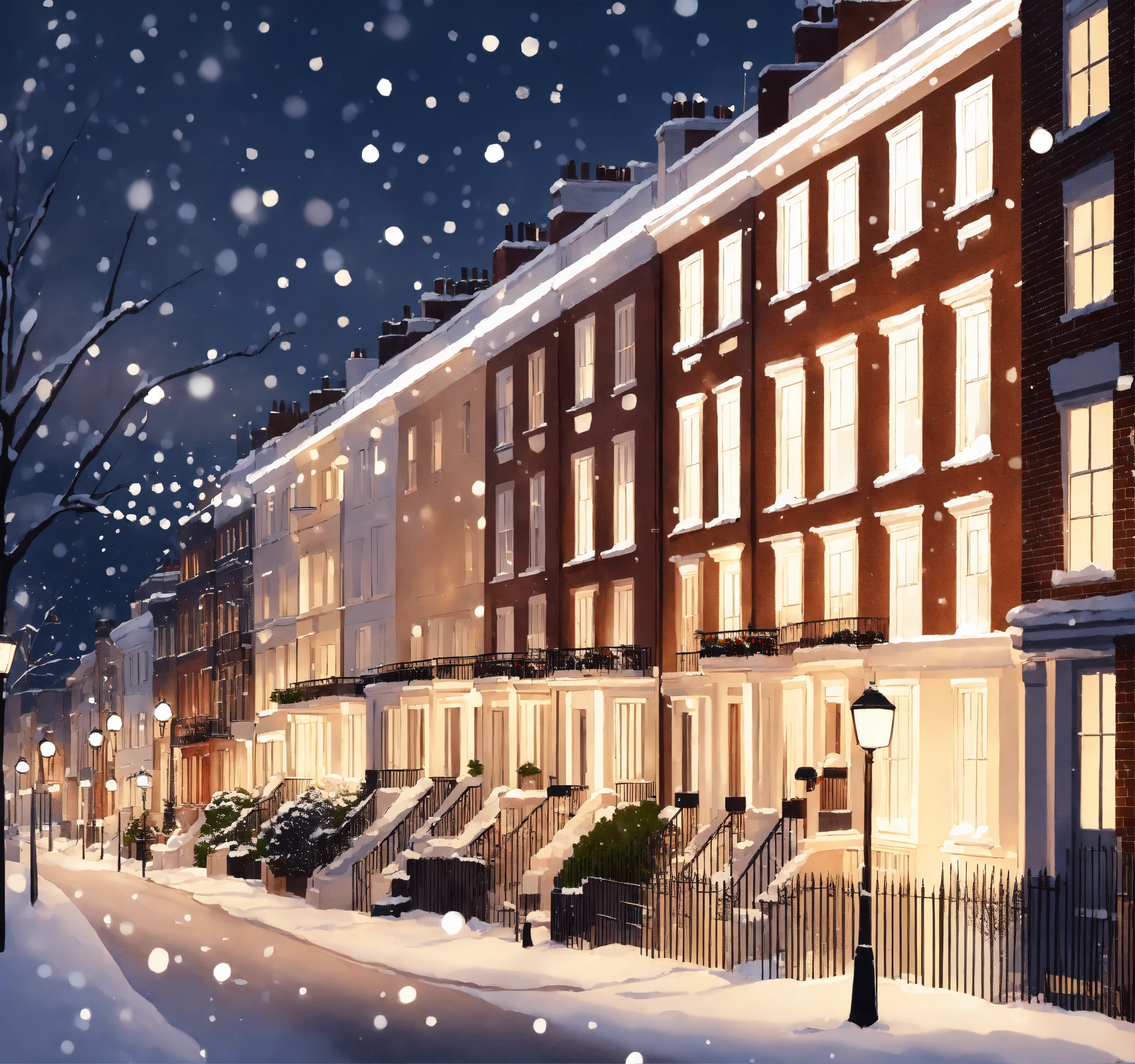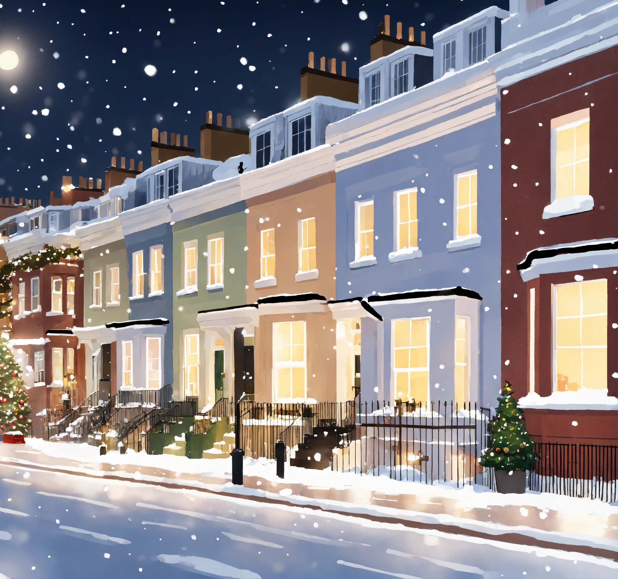 Realistic illustration of tall buildings on a notting hill type street in light colors on a snowy christmas night, houses have different architectural styles, no cars, there is bokeh