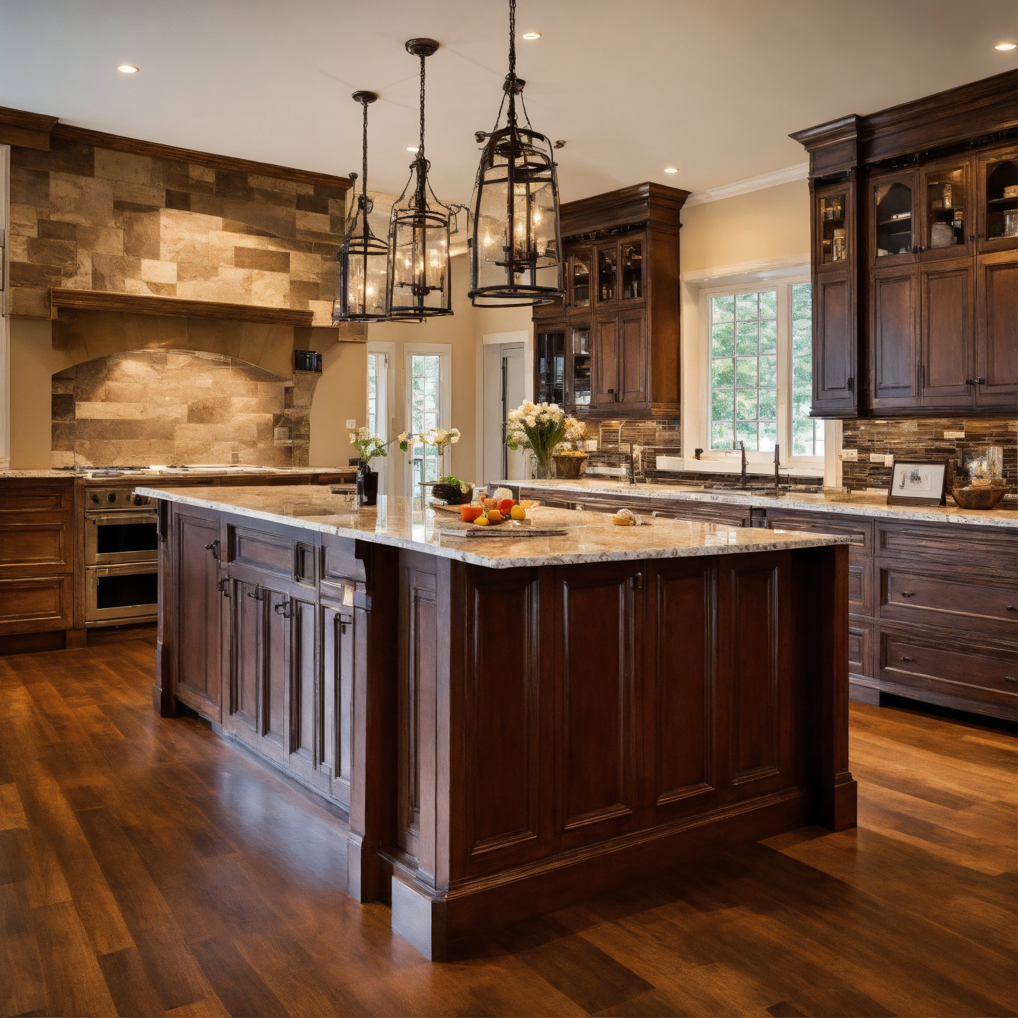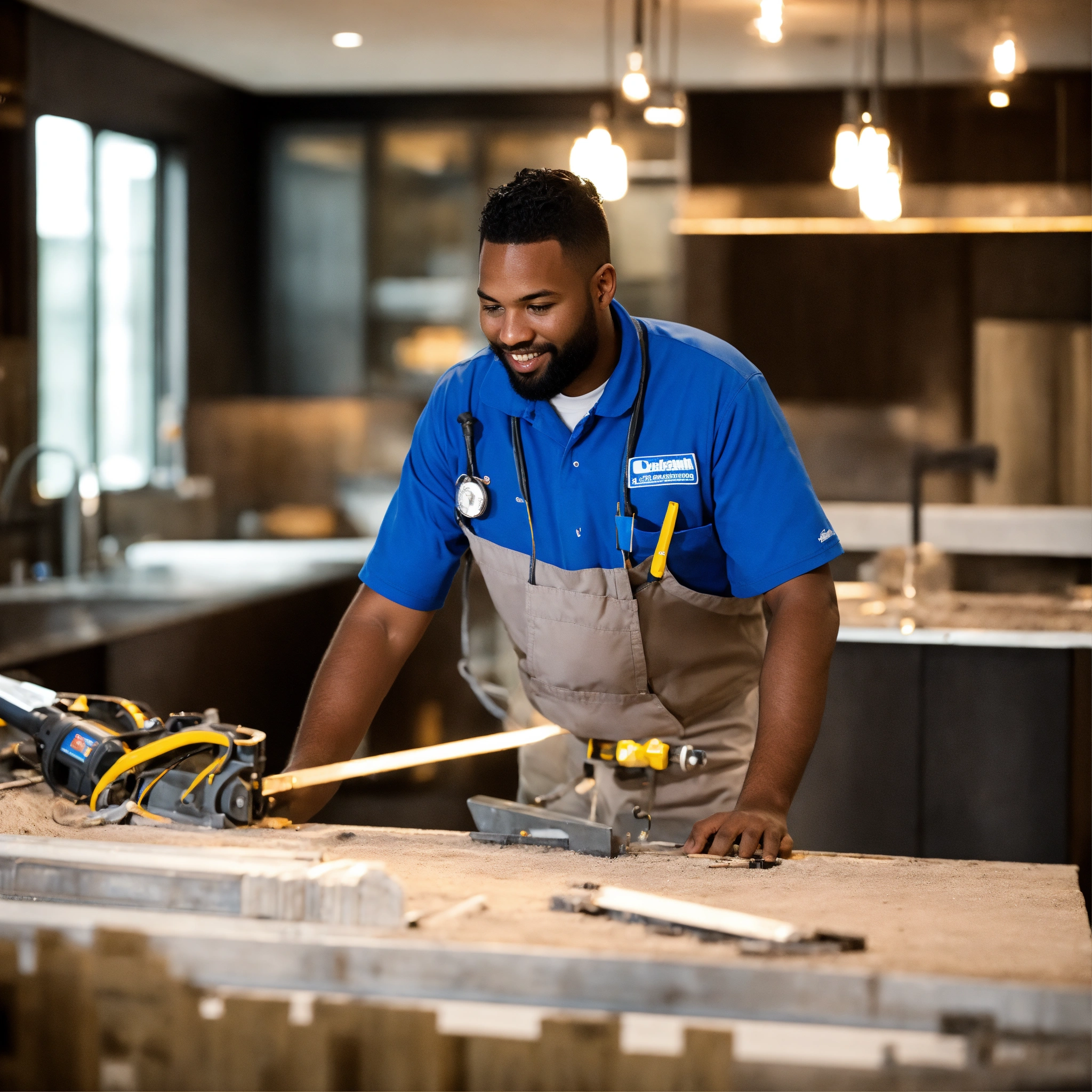 Create a image featuring a single team contractor. Display him in a well-lit and approachable manner, showcasing a kitchen remodel exuding their expertise. The background should convey a sense of professionalism, as it would appear in a older home setting.