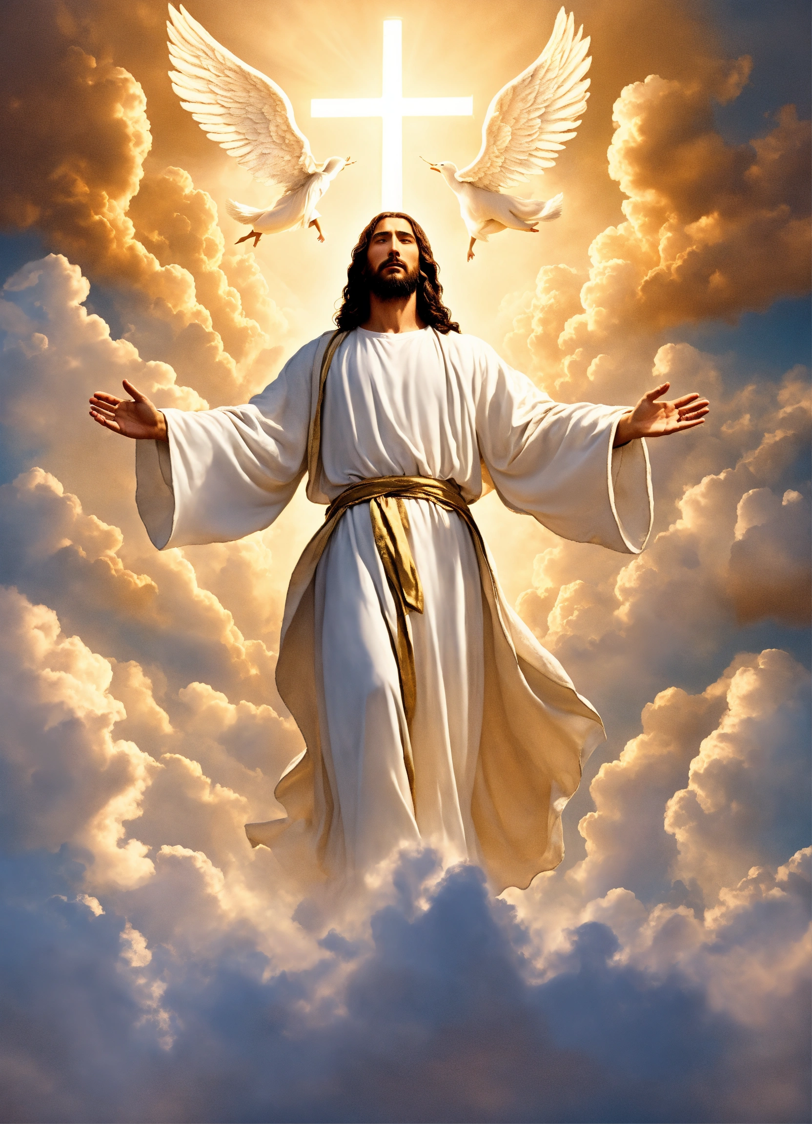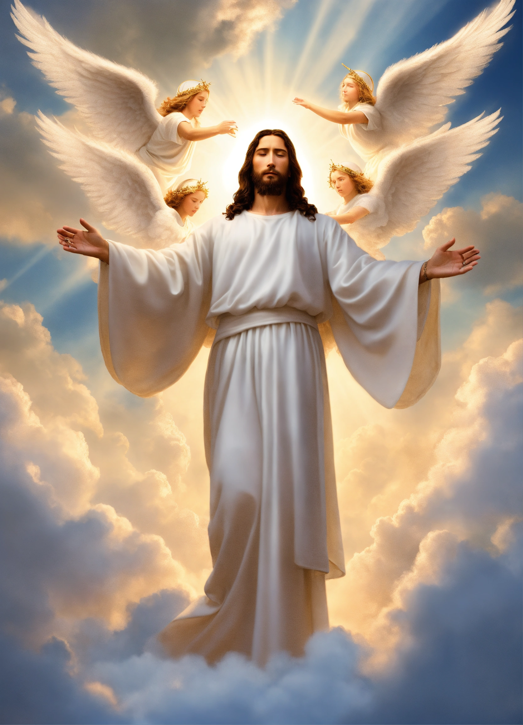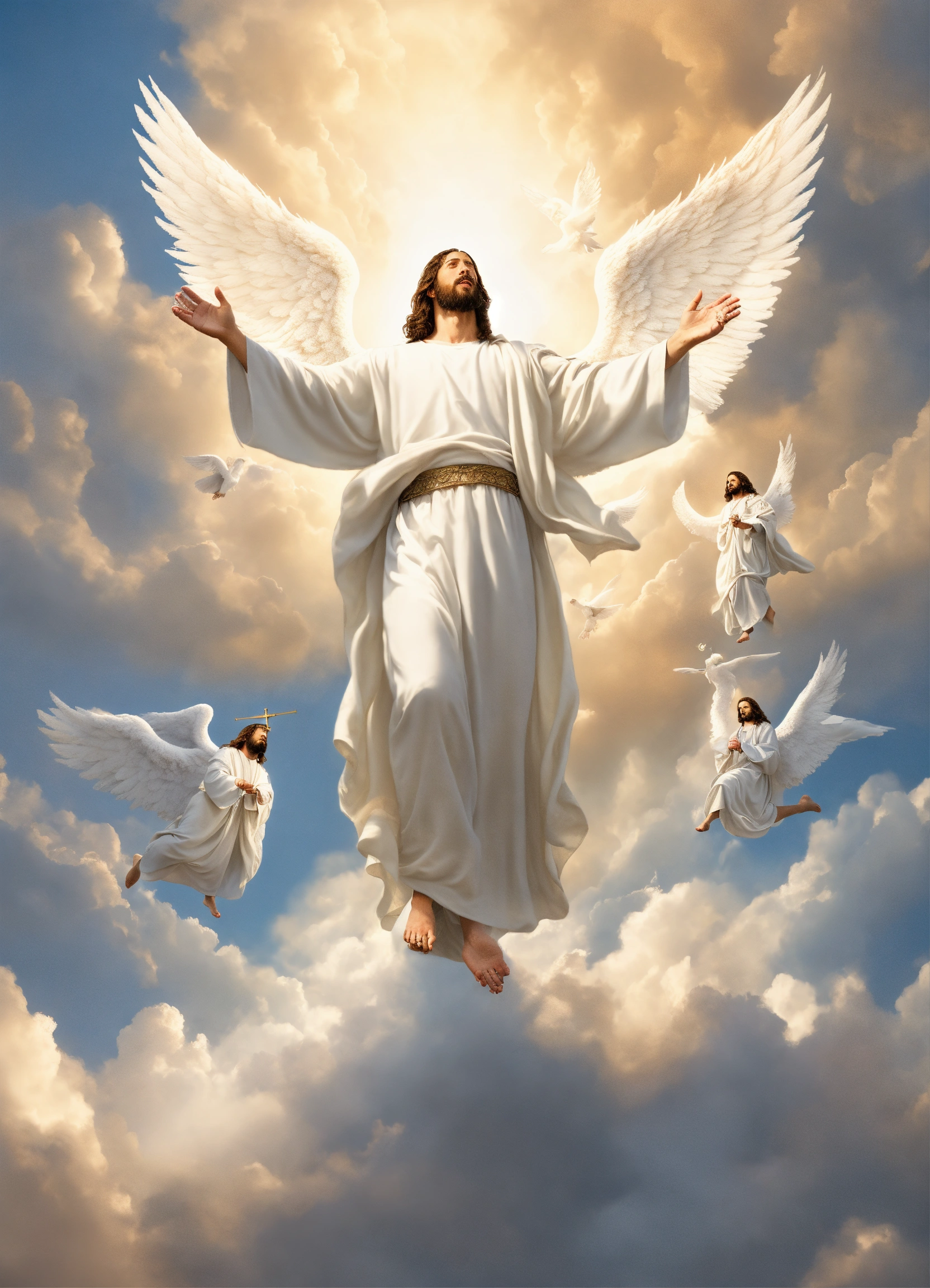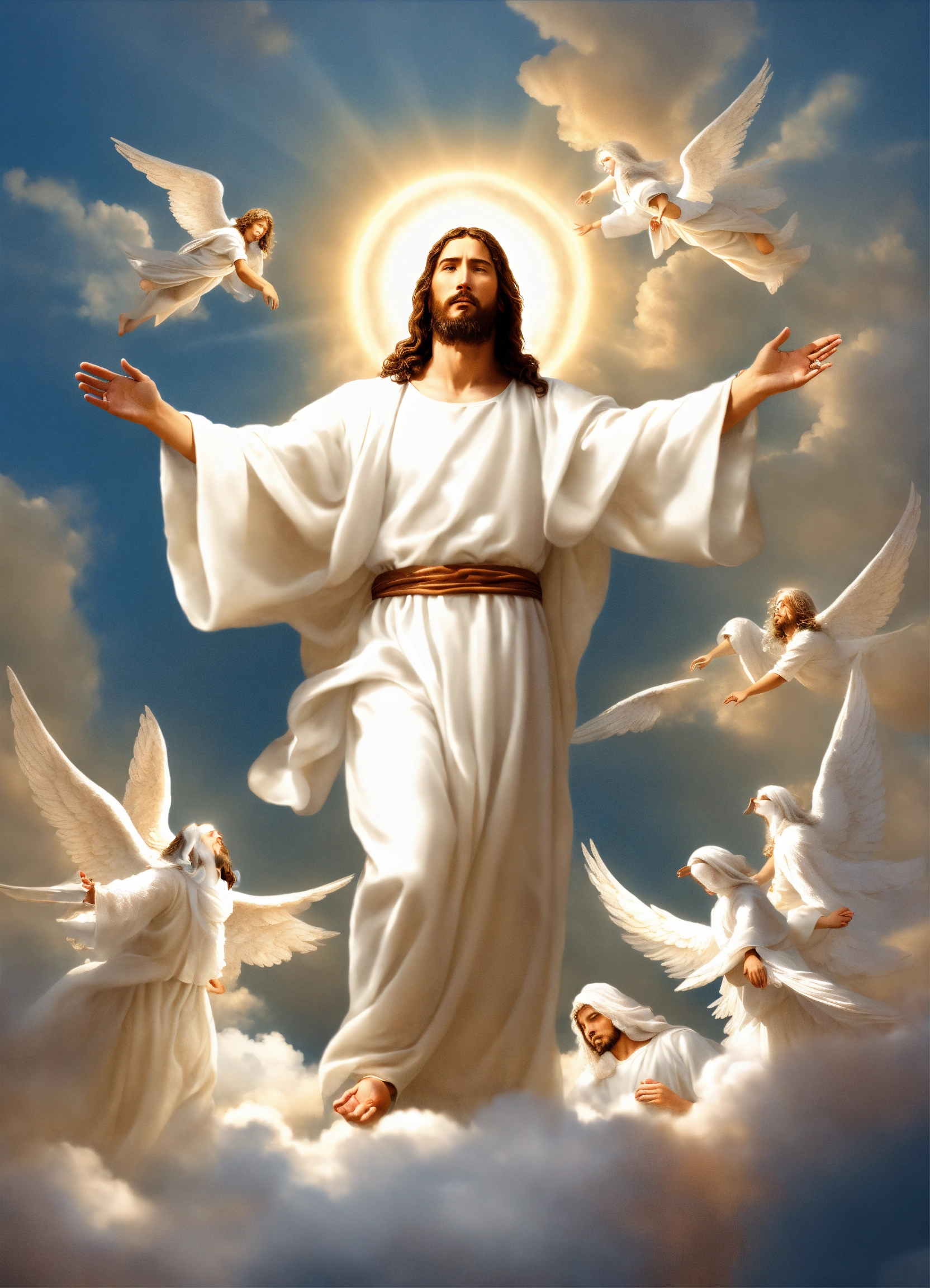 Jesus christ on the clouds wearing white garment with angels looking up on him