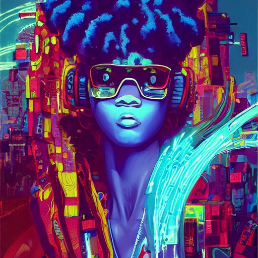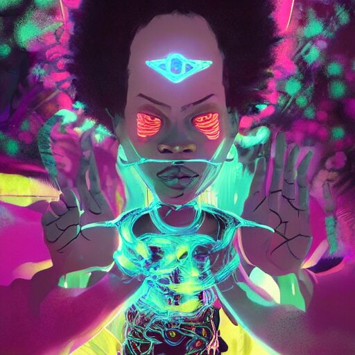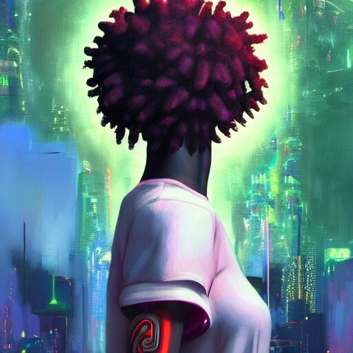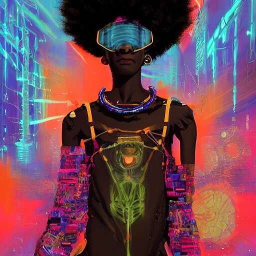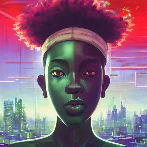 Afro - cyberpunk deities unseen amongst their creations, a society manifesting dreams with cosmic ancestral magic in a post - modern techno world | hyperrealistic oil painting | by makoto shinkai, ilya kuvshinov, lois van baarle, rossdraws, basquiat | afrofuturism, in the style of surrealism, trending on artstation, | red and black color palette