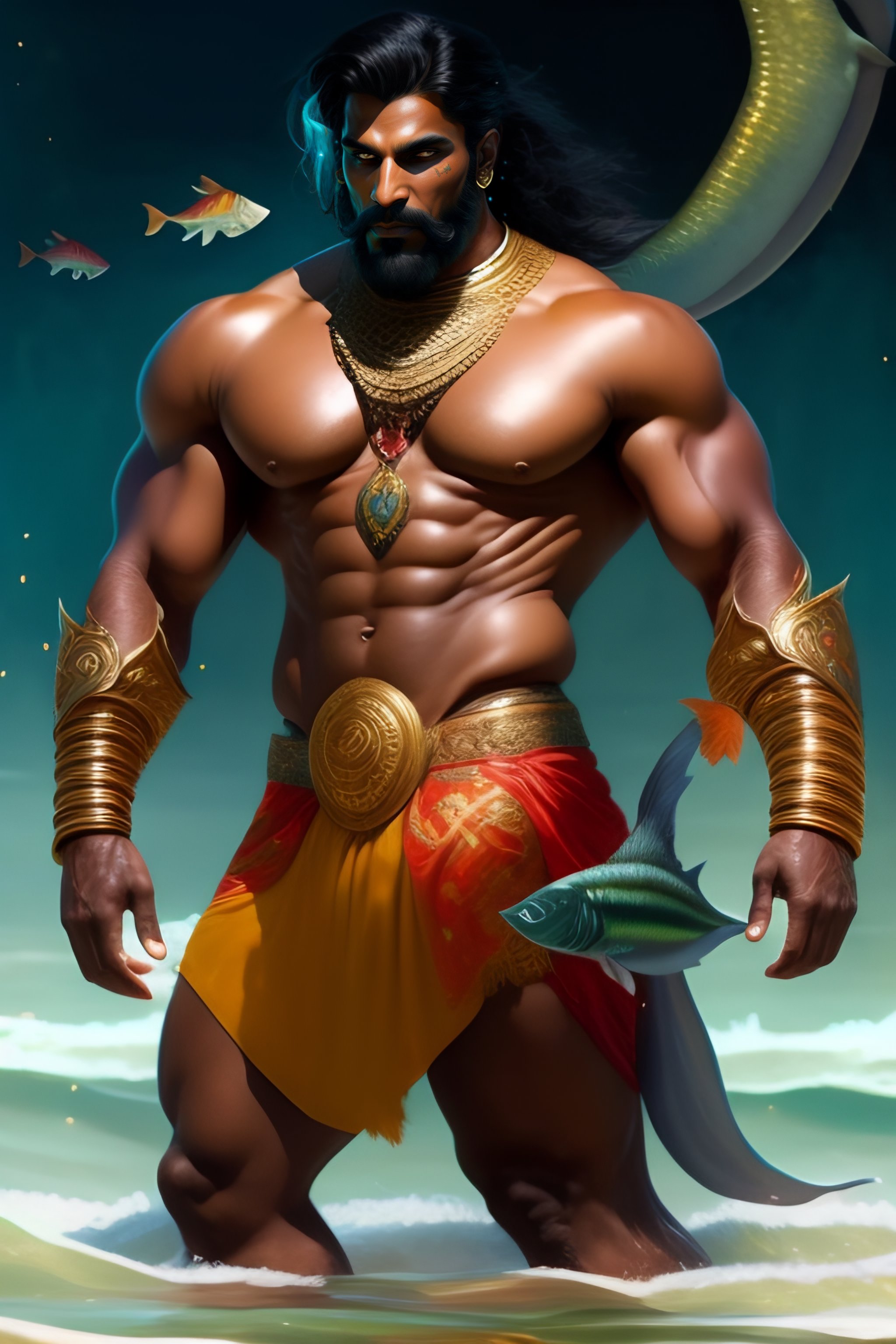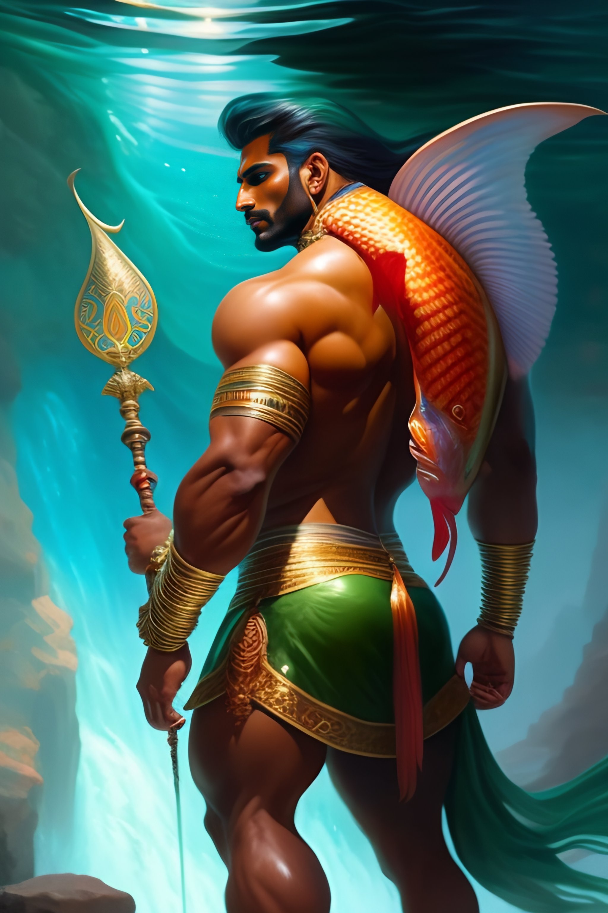 Desi man as mer-man with with fish tail emerging from water, half human half fish, handsome, creature, amazing, muscular, intricate, full figure, highly detailed, digital painting, artstation, concept art, illustration, art by greg rutkowski and alphonse mucha