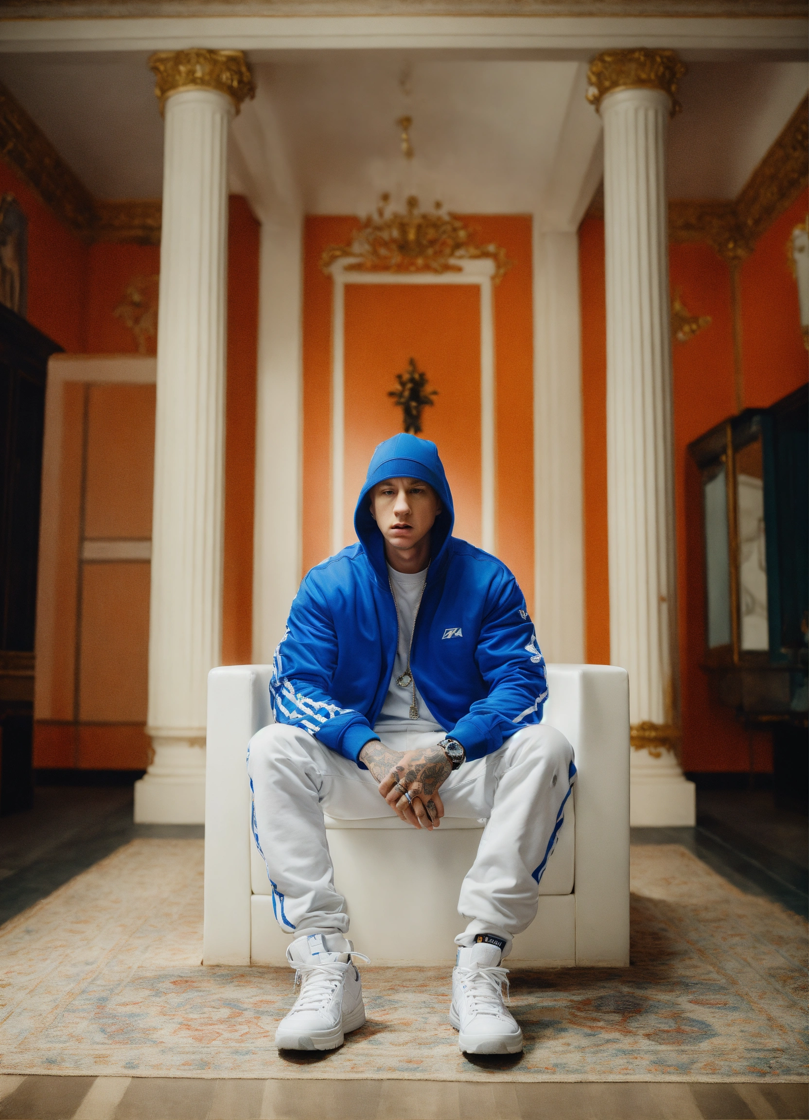 sitting on a white throne in bright room