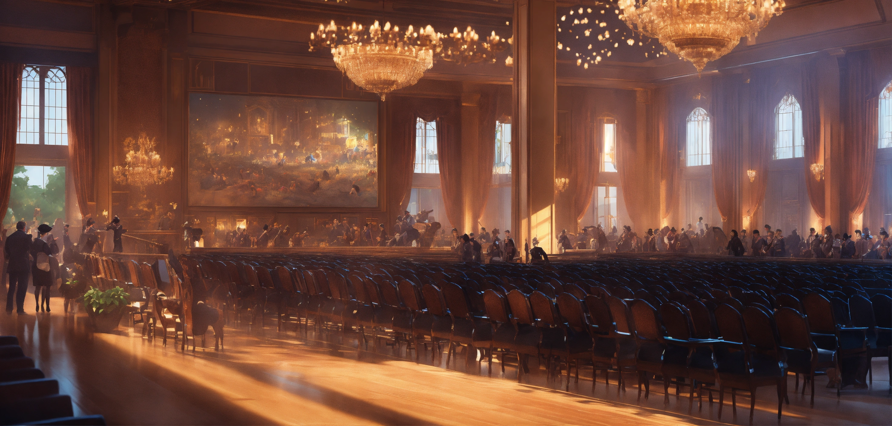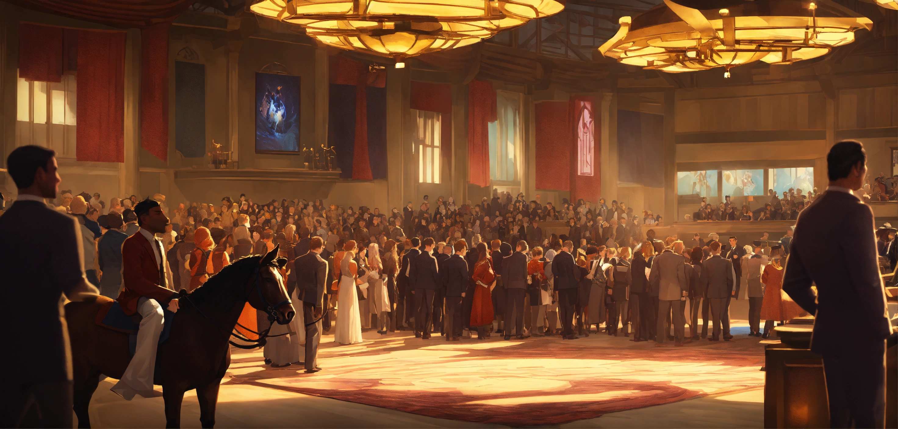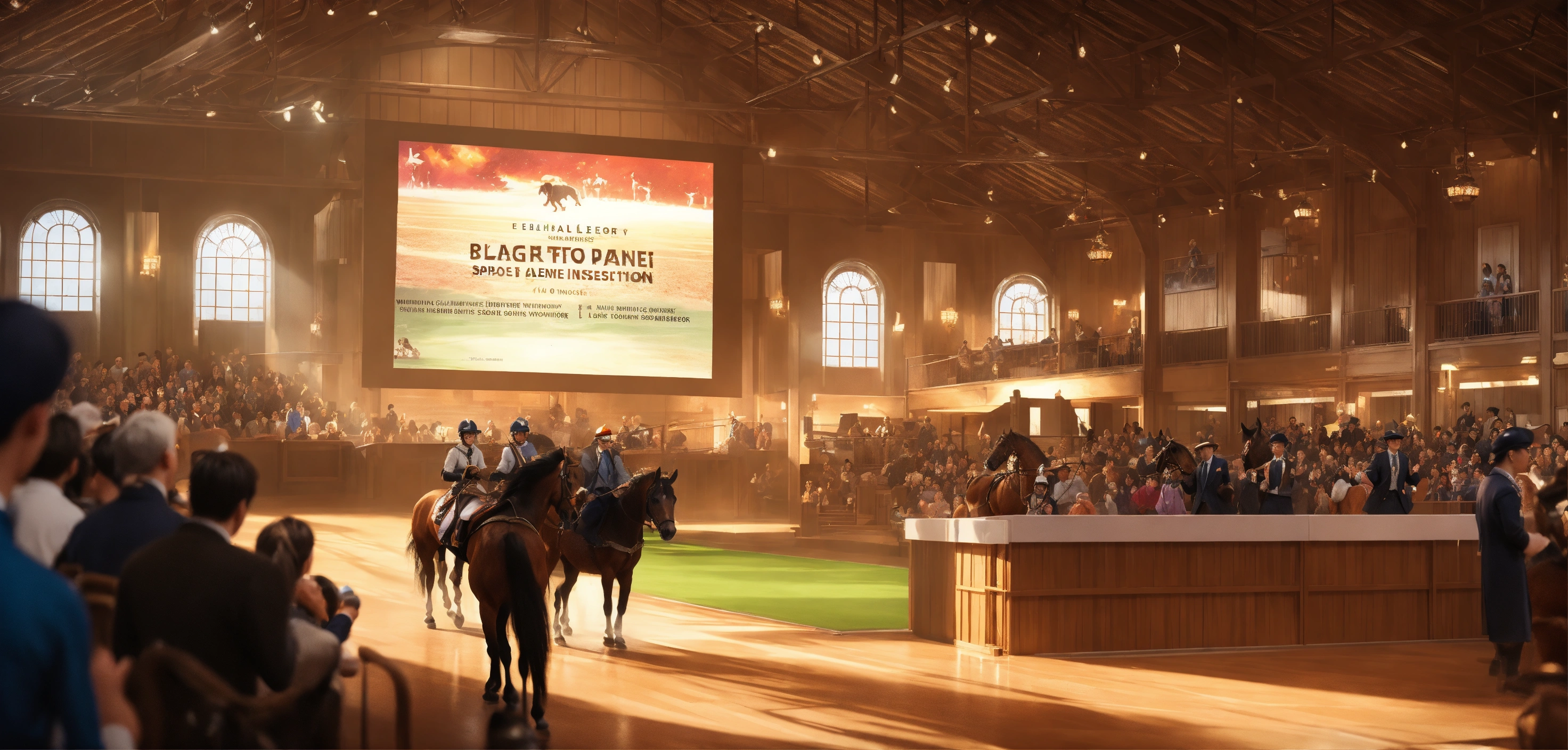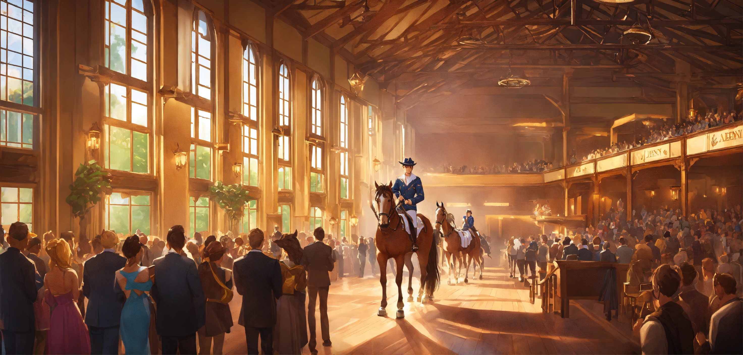 A highly detailed league of legend dynamic illustration of the horse auction in modern event hall by joshua raphael, by artgerm, by huyy nguyen, by cj xander, by jennifer wuestling, by diep duong van, by huyy nguyen, by grafit studio, volumetric lighting, 3d render, 4k resolution, trending on artstation, masterpiece, close up frame, cinematic shot, sport competition, epic, keeneland sales, inside hall with stands, lot of armchairs with people, one horse in centre only, evening, hall without windows