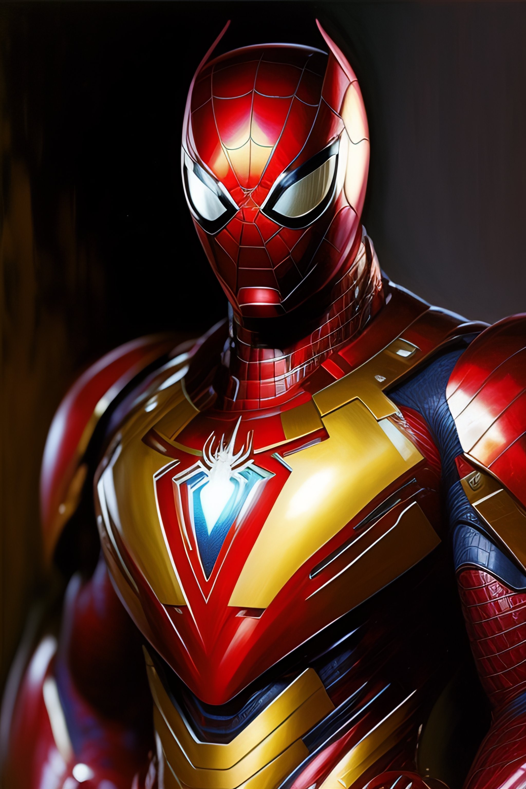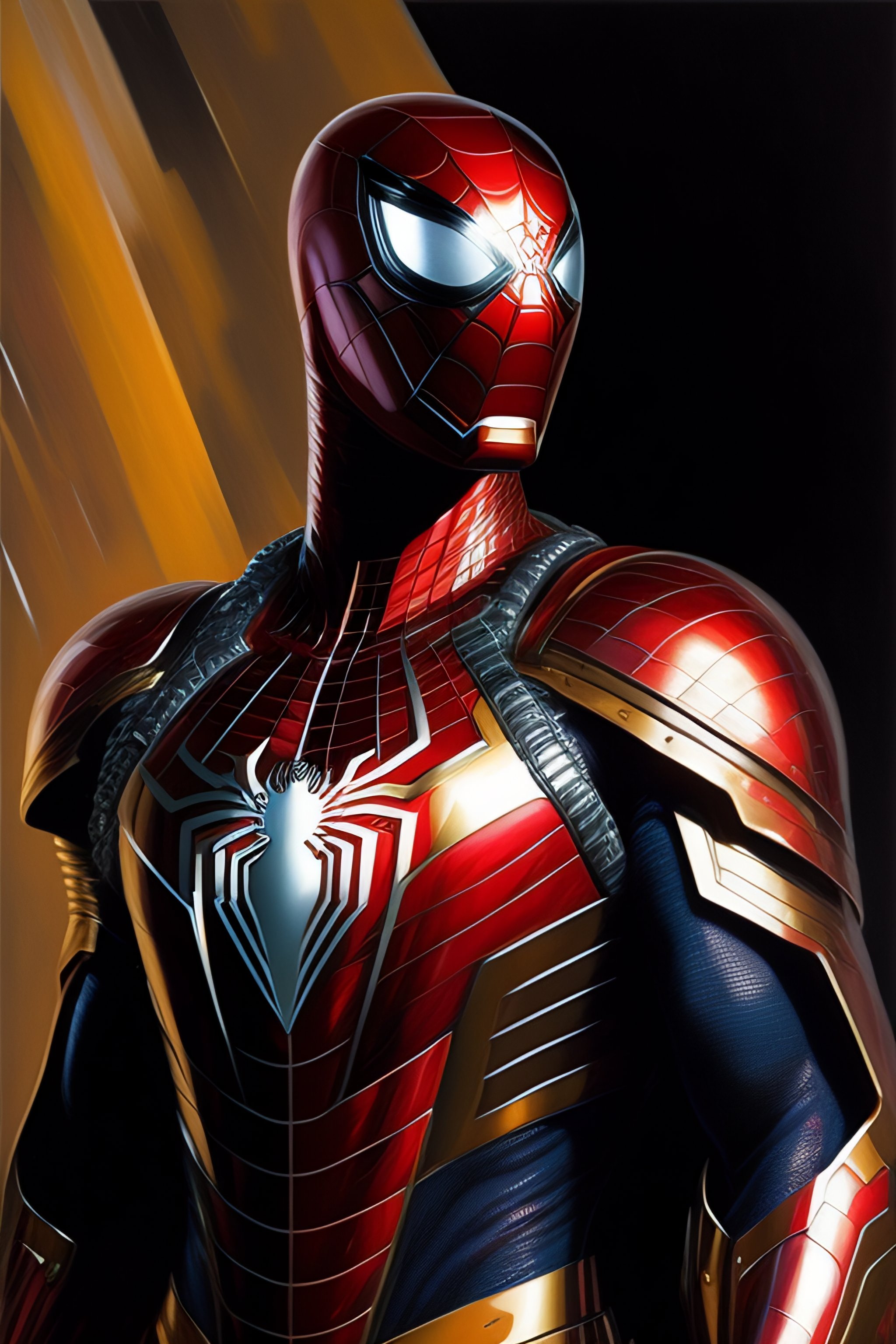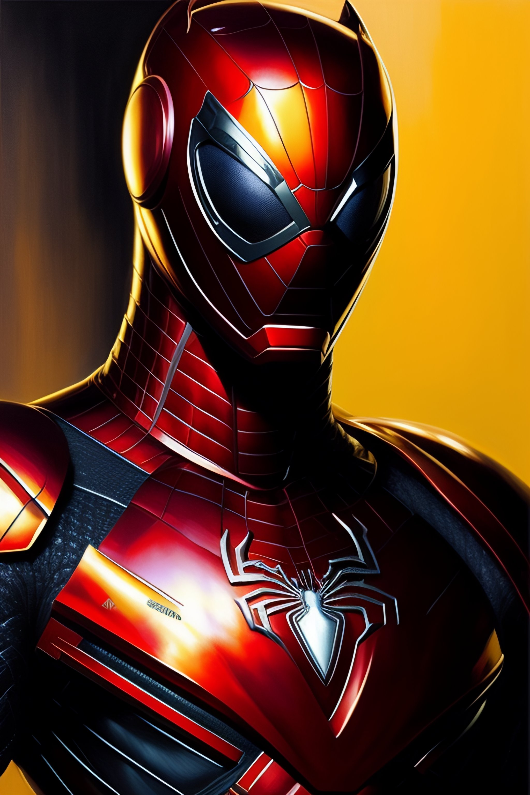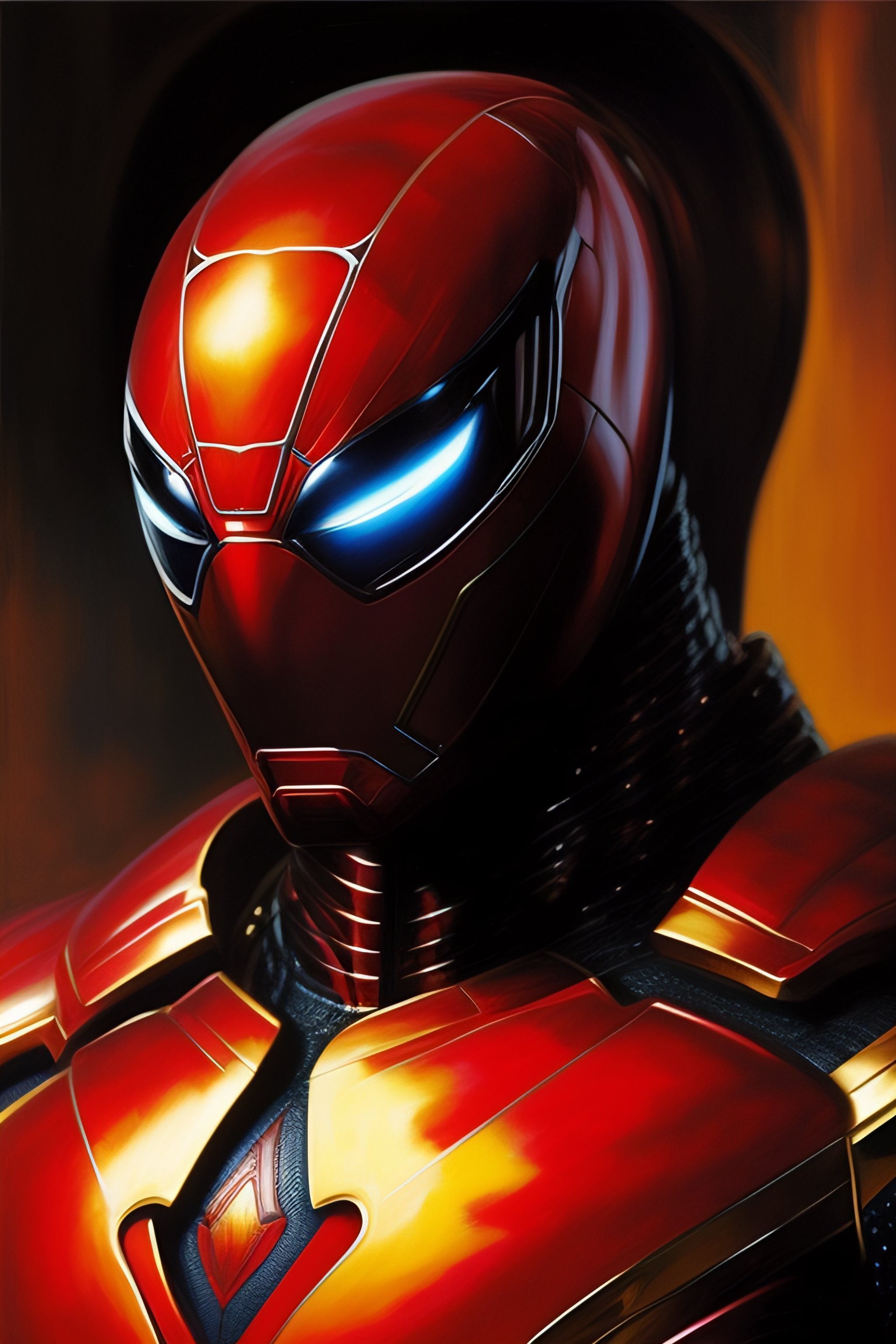Close on spiderman/ironman/robocop fusion, hyperdetailed wet golden armor, black gold dark-red, cinematic lighting, by donato giancola and nicolas de stael