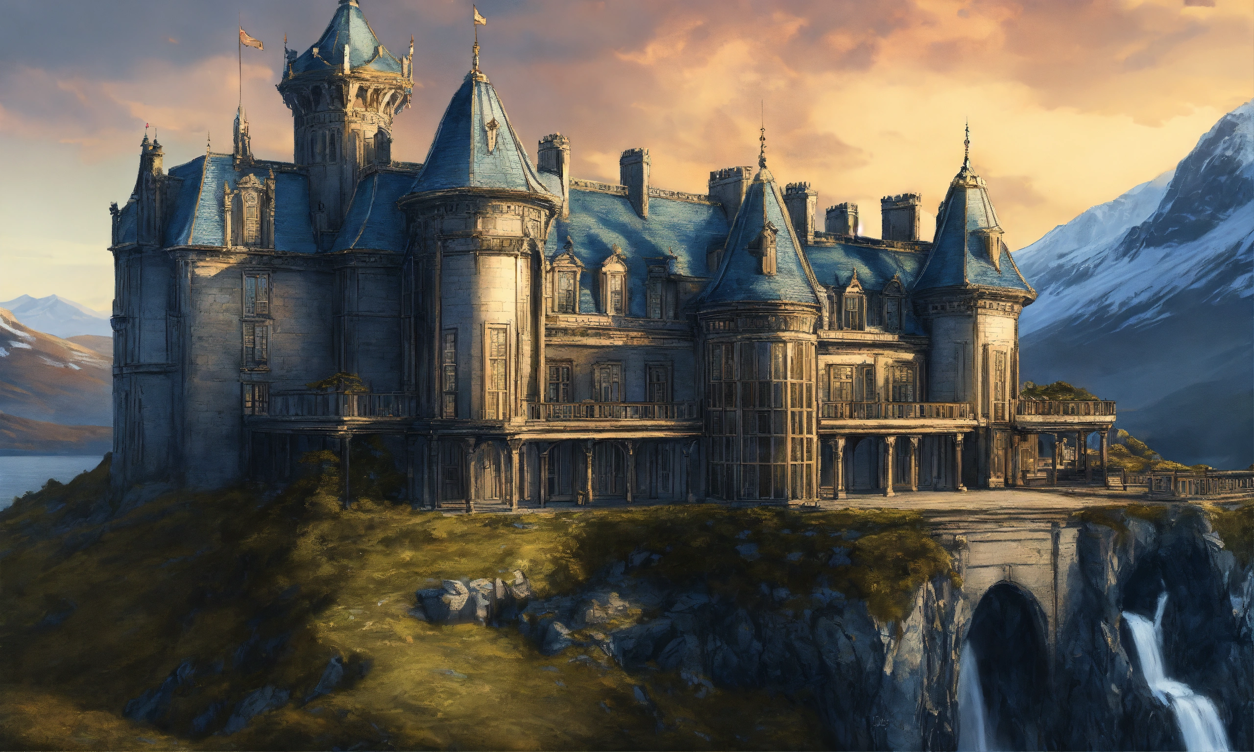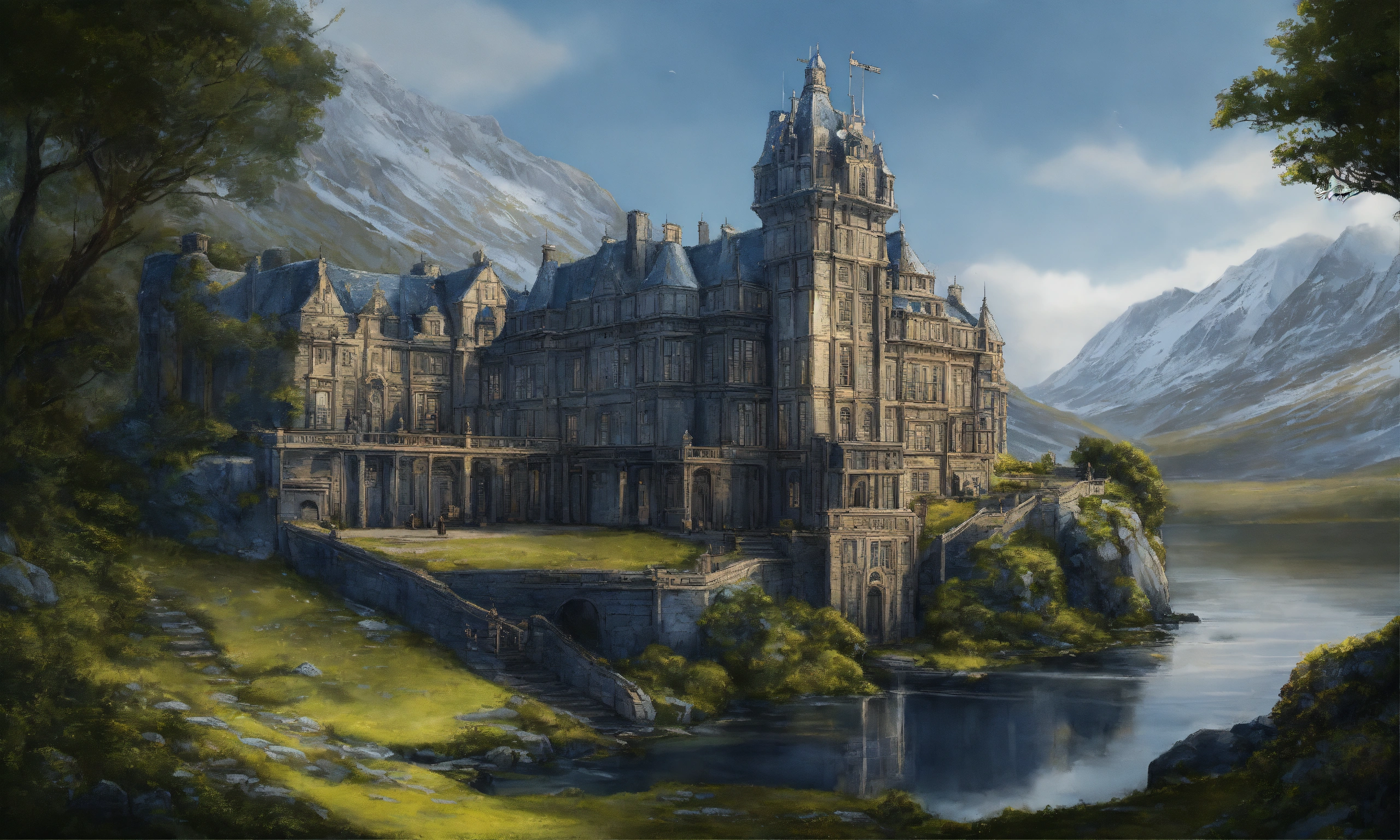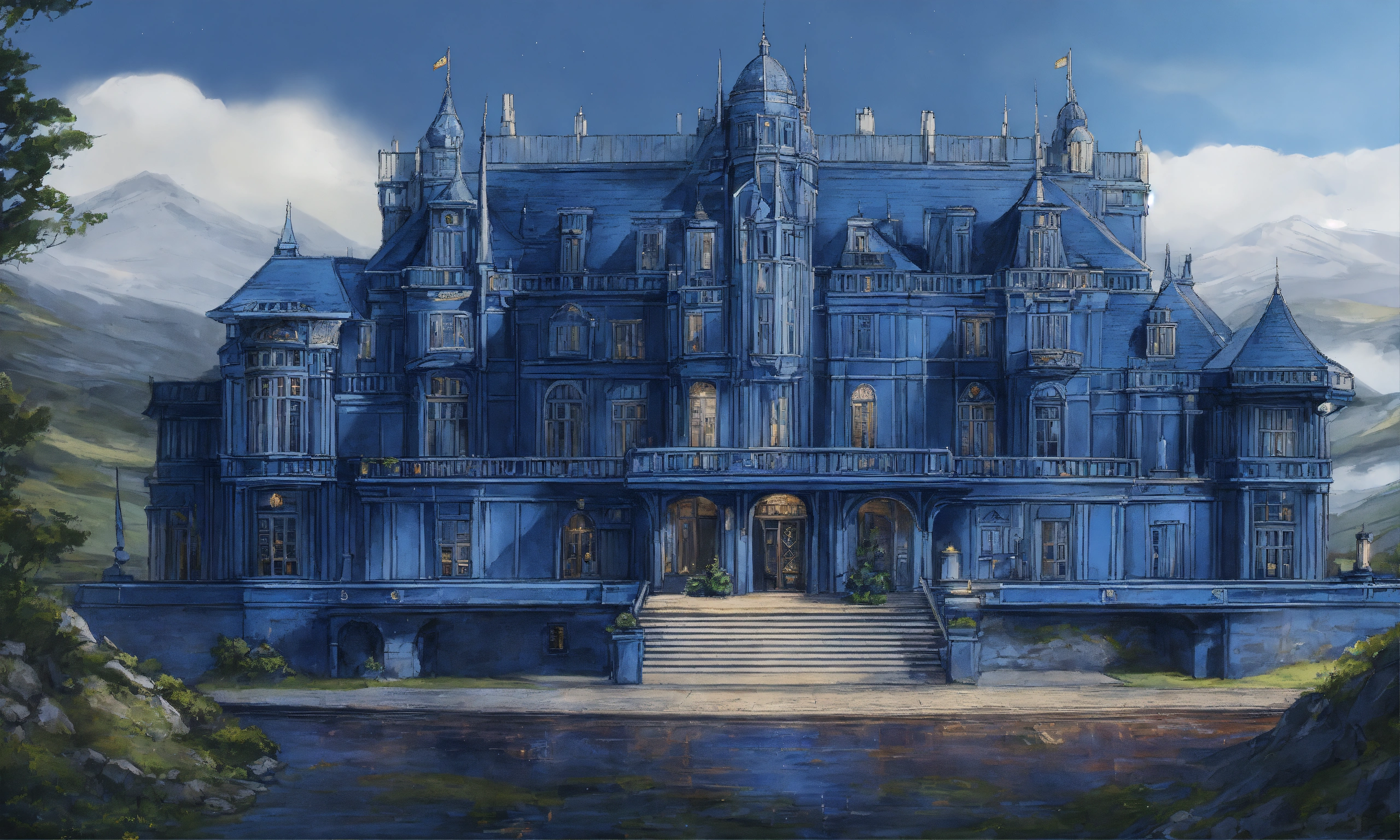 Drawing of the full image of an elegant high elf sci fi navy blue palace in the scottish highlands, elf architecture, immensely detailed