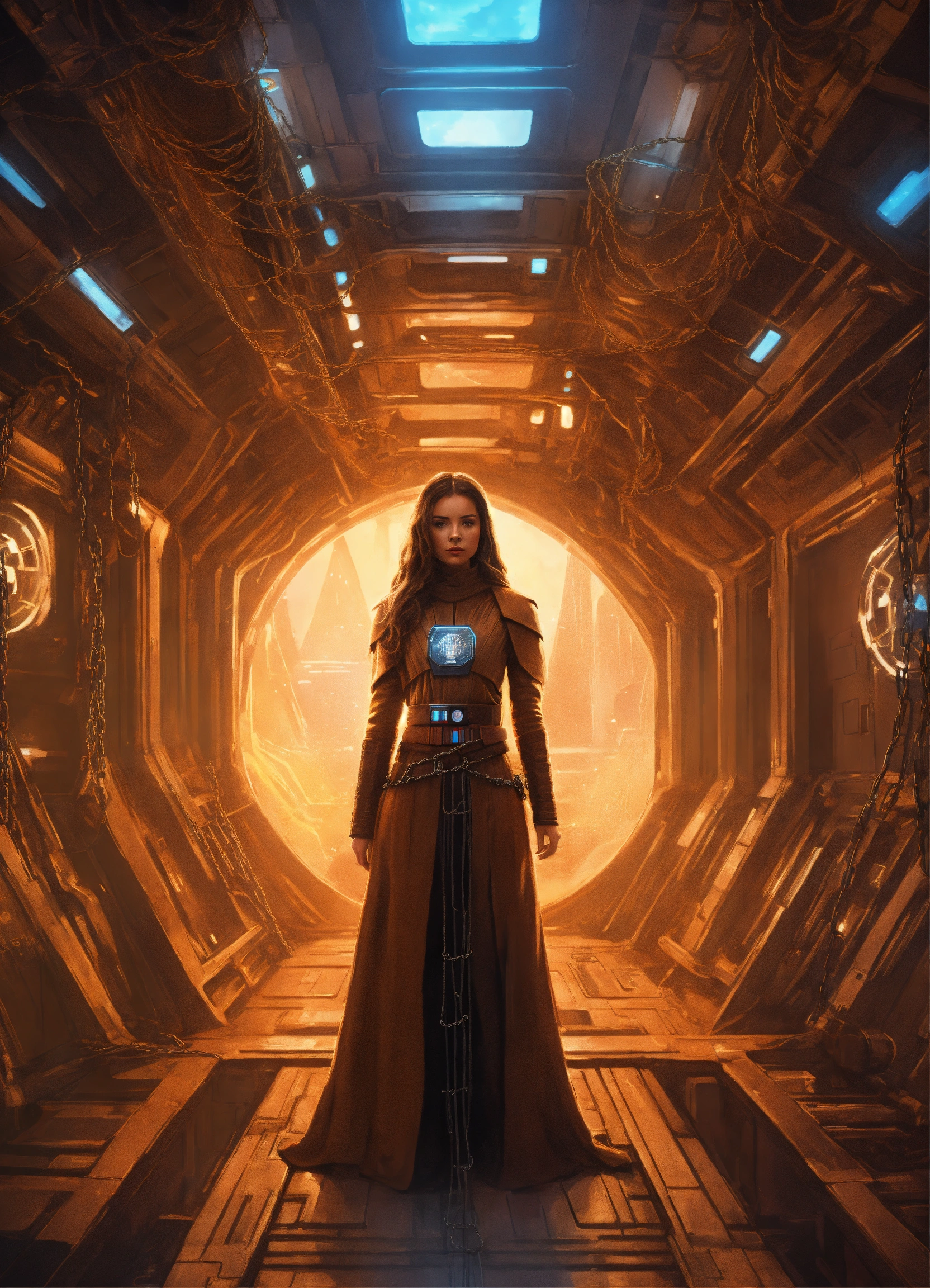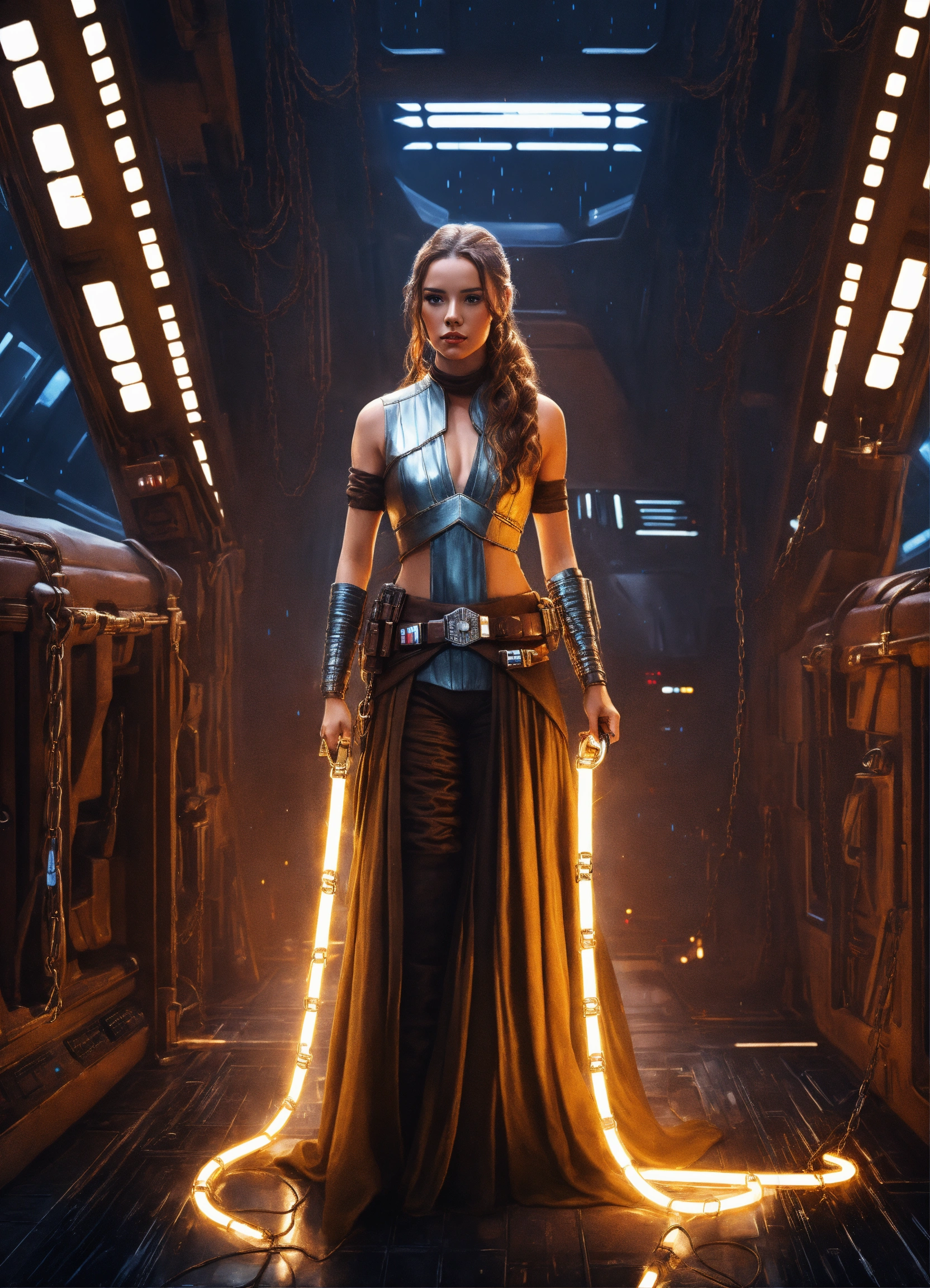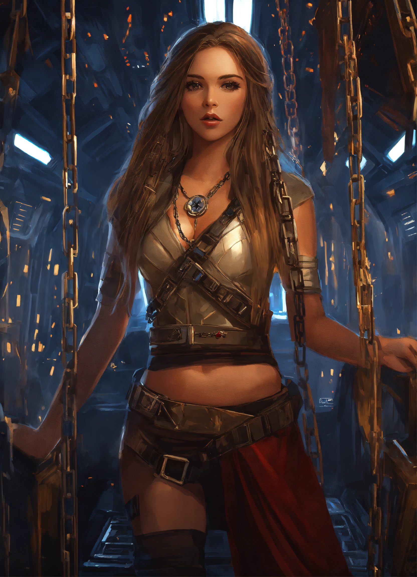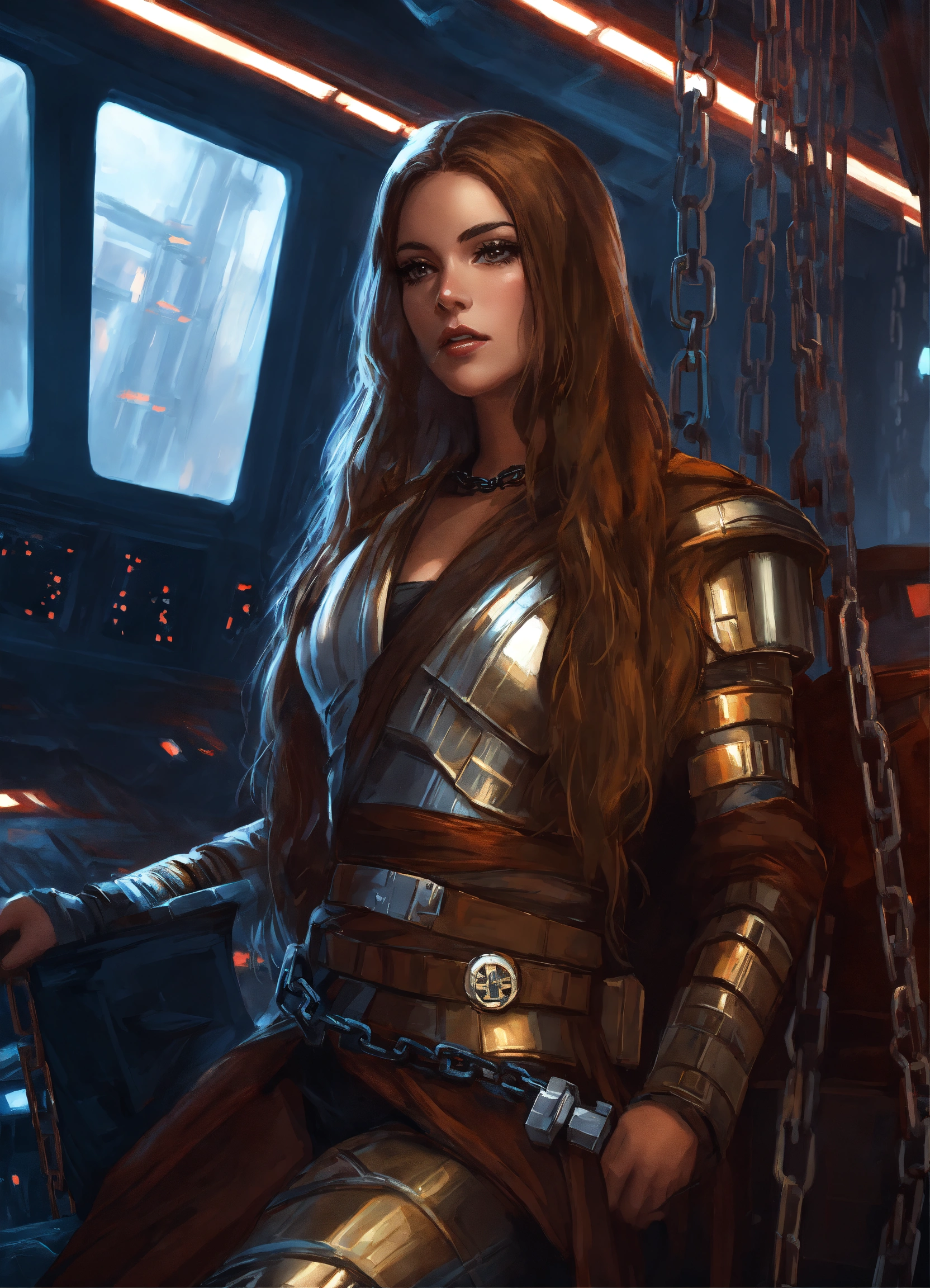Digital art of a beautiful star wars female in chains with long hair inside a star wars ship